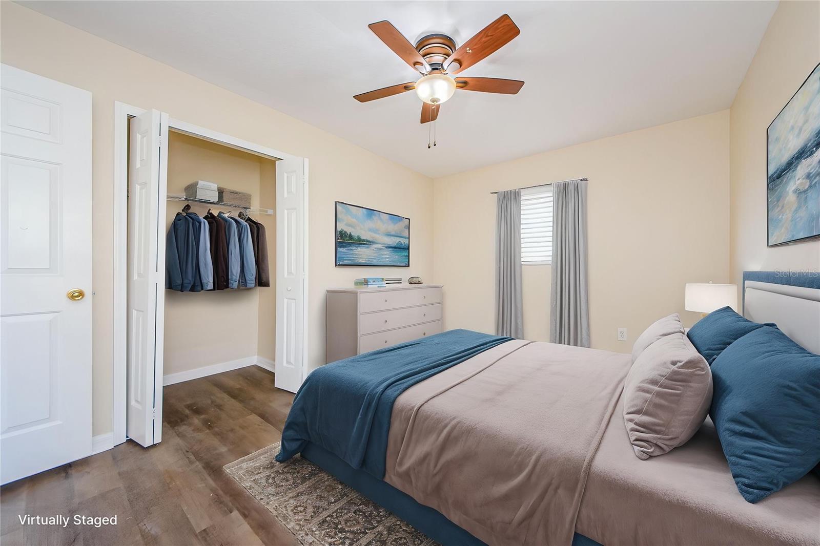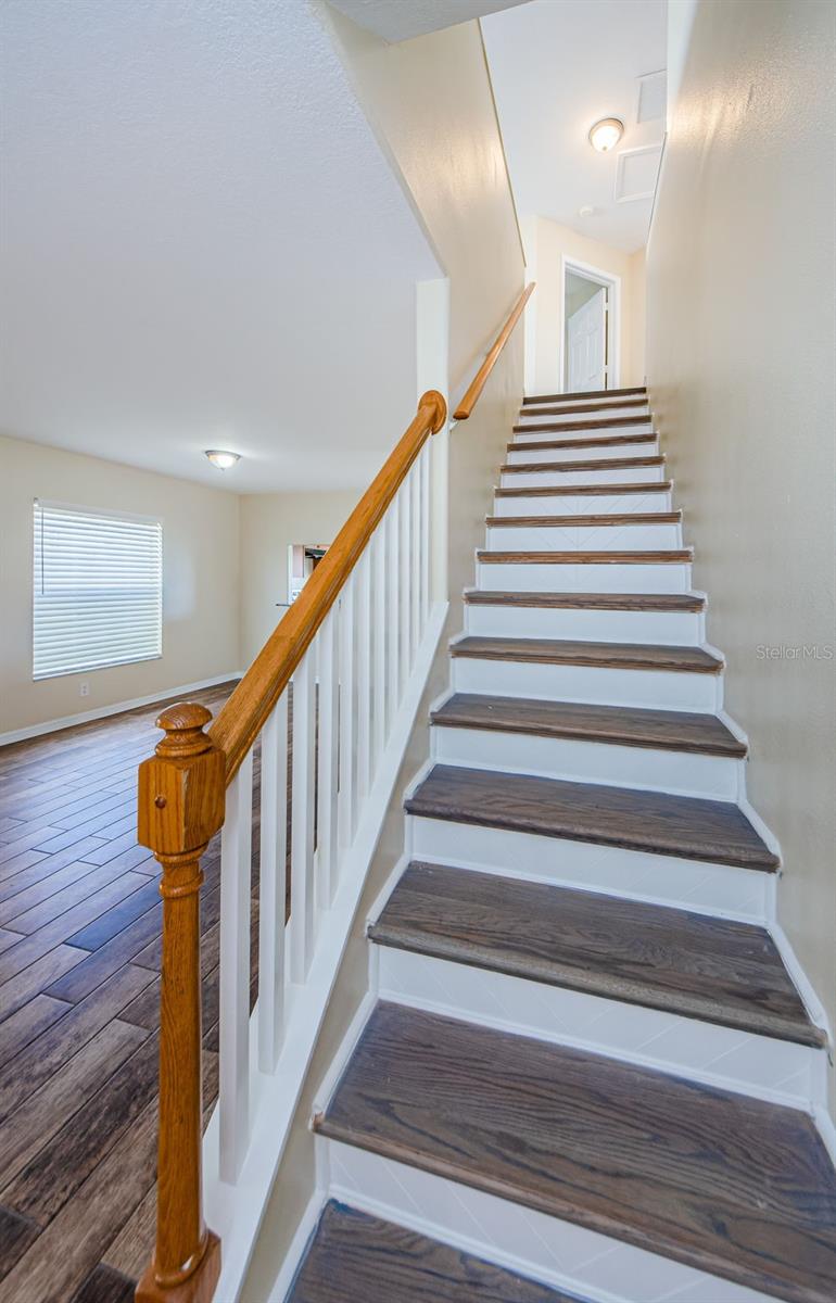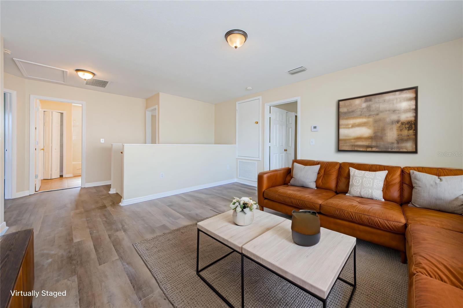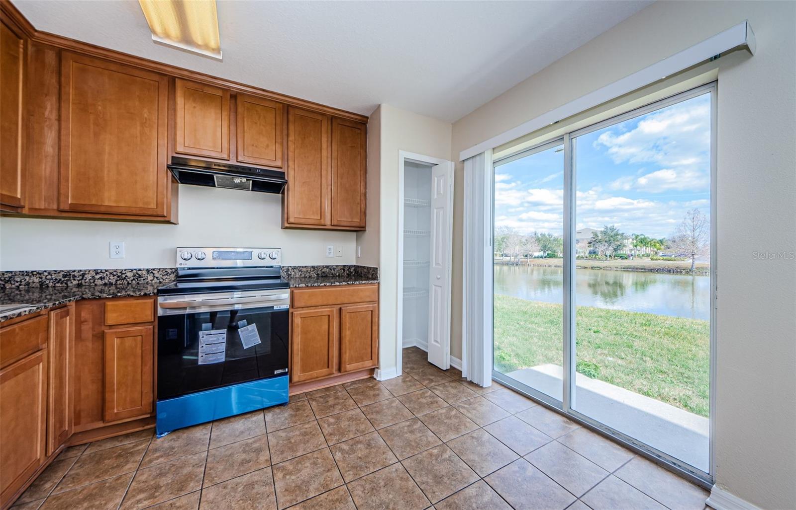 One or more photo(s) has been virtually staged. *Price Reduced* Beautiful, waterfront, updated large 5 bedroom, 2.5 bathroom home with a spacious loft located in the desirable Thousand Oaks East community in Trinity. Situated on a large pond lot you will have no rear neighbors while you are relaxing in your backyard. Brand new blinds on every window including the sliding glass doors that lead to the backyard. The brand new LVP (Luxury Vinyl Plank) flooring throughout the entire upstairs and wood-look ceramic tile downstairs flow seamlessly throughout this large 2187 SF home. Brand new roof as of 3/2024, new paint throughout the entire home and brand new kitchen appliances that have never been used! The eat-in kitchen has granite counter tops and a pass through window into the living/dining area. Lots of light throughout! Master bedroom has a huge walk in closet, view of the pond and an ensuite bathroom with shower/tub combo. Additional 4 generously sized bedrooms are upstairs along with an amazing loft that can have many uses. The upstairs bathroom is huge and has a shower/tub combo. There is also a well appointed half bath downstairs off of the family room. A large 2-car garage with wood shelves ensure you have plenty of storage space and a brick paver driveway with ample room for parking. This home is located in a prime location close to schools, shopping and dining options. No damage or leaking from either recent hurricanes and home is not in a flood zone. This house is a must see!