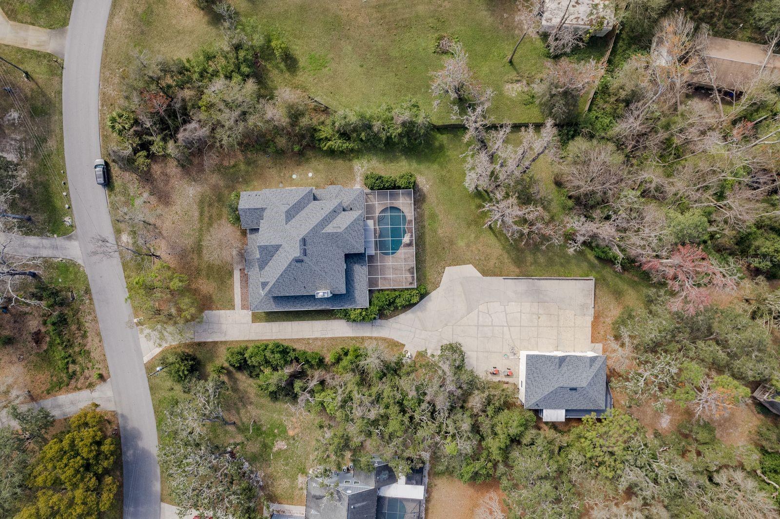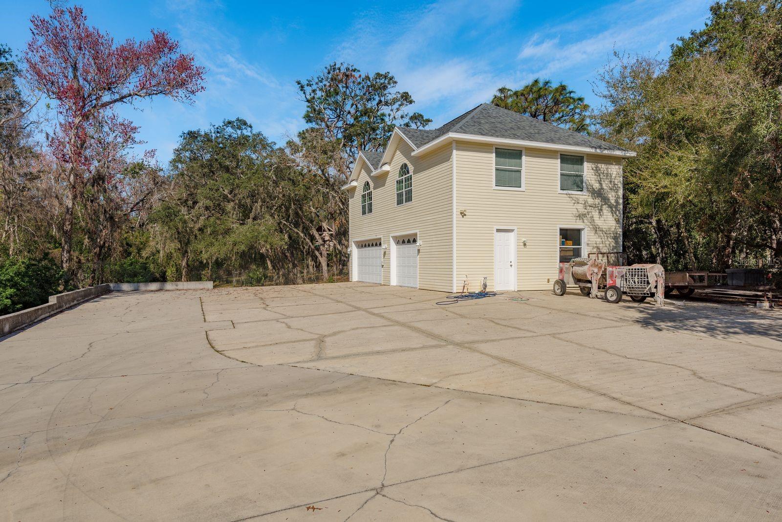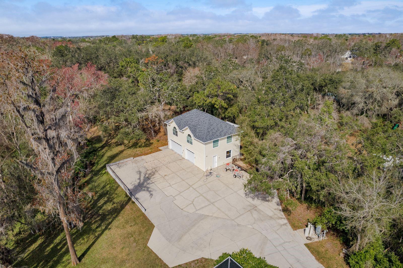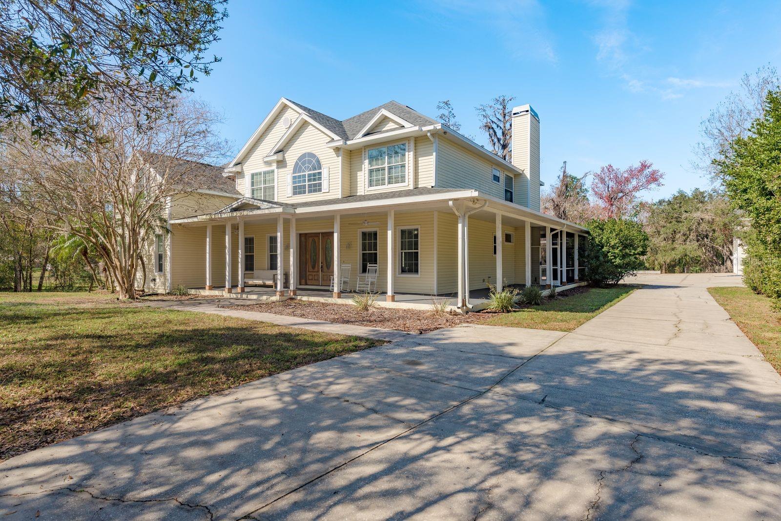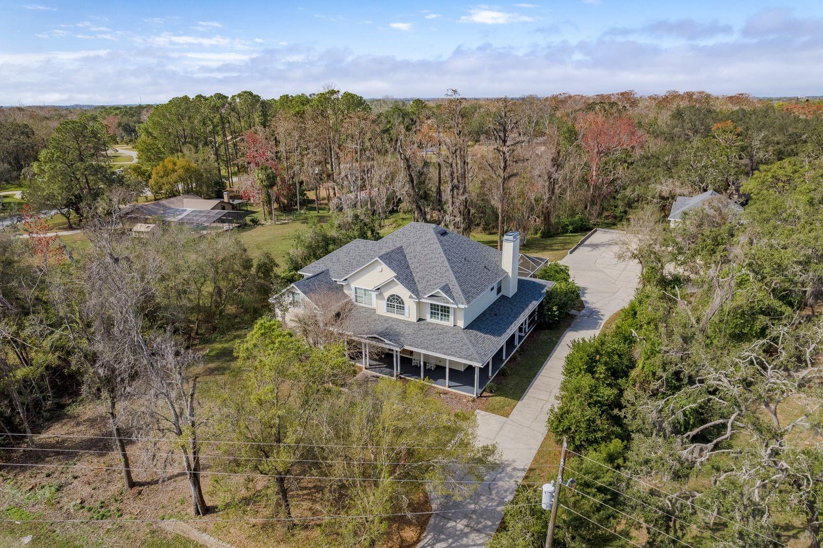 Welcome to Oak Ridge, where this remarkable estate sits on 1.69 acres in the much sought after Trinity area. Offering the perfect blend of peaceful country charm and modern convenience, the property provides room to spread out while still being just minutes from top-rated schools, shopping, dining, golf courses, medical centers, and Gulf beaches. Originally crafted as the private residence of a master builder, the home showcases exceptional quality and attention to detail throughout. With 5 bedrooms, 5 full bathrooms, and 2 half baths, it strikes an ideal balance of elegance and comfort. A long driveway and welcoming wraparound porch create a grand first impression. Just beyond the main residence, a detached 4-car garage includes a spacious studio apartment above, complete with kitchenette and bathroom—perfect for extended family, guests, a private office, game room, or rental opportunity. Inside, freshly stained double entry doors open to a soaring two-story foyer. Hardwood floors carry throughout the main living spaces, where a stone wood-burning fireplace creates a striking centerpiece in the family room. The open-concept layout flows seamlessly into the chef’s kitchen, featuring custom cabinetry with decorative glass accents, a large island, walk-in pantry, and a butler’s pantry that leads to the formal dining room. A casual dining area with French doors offers views of the pool and backyard. The main level also features a luxurious primary suite with French doors opening directly to the pool and hot tub, dual oversized walk-in closets, and a spa-like en-suite bath. An additional bedroom (ideal as an office) and a half bath complete the first floor. Upstairs, another large primary suite includes its own private bath. Two more bedrooms, one with an en-suite, plus a spacious gym (easily converted to another bedroom), private office space, and a loft with laundry chute offer flexibility. A second staircase provides convenient access back to the kitchen. Outdoor living is a highlight, featuring an expansive paver deck, resort-style pool with waterfall, and spa, all surrounded by mature trees and abundant wildlife. A custom-built treehouse, crafted with the same quality as the main home, creates a special retreat for children. At the back of the property, a freshwater creek offers bass fishing and peaceful scenery. With plenty of space for boats, RVs, and recreational toys, this estate combines luxury, leisure, and convenience. Recent improvements ensure peace of mind, including a brand-new roof (2023), newer A/C units (installed within the last three years), a 30kW Generac generator with a 500-gallon underground tank, a water treatment system, plus complete electrical and septic inspections in 2024. Don’t miss the opportunity to experience this extraordinary property—schedule your private showing today!