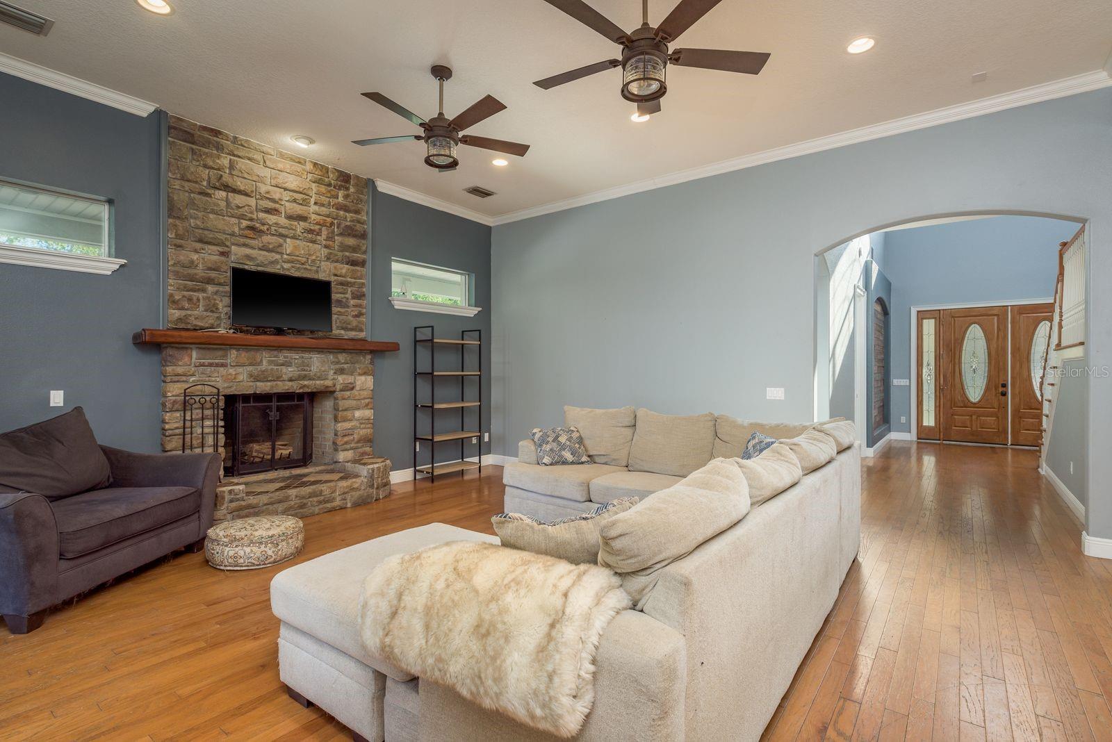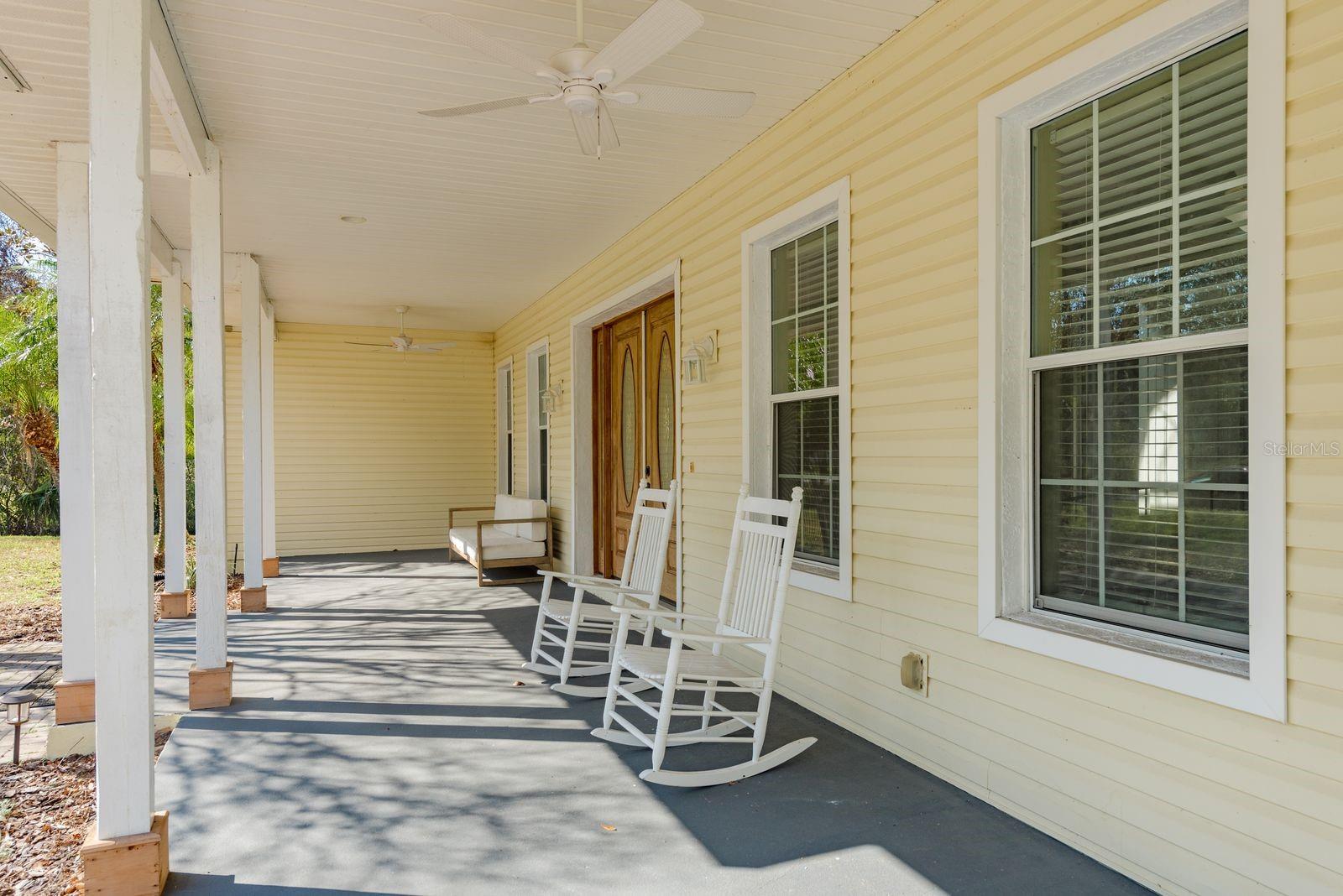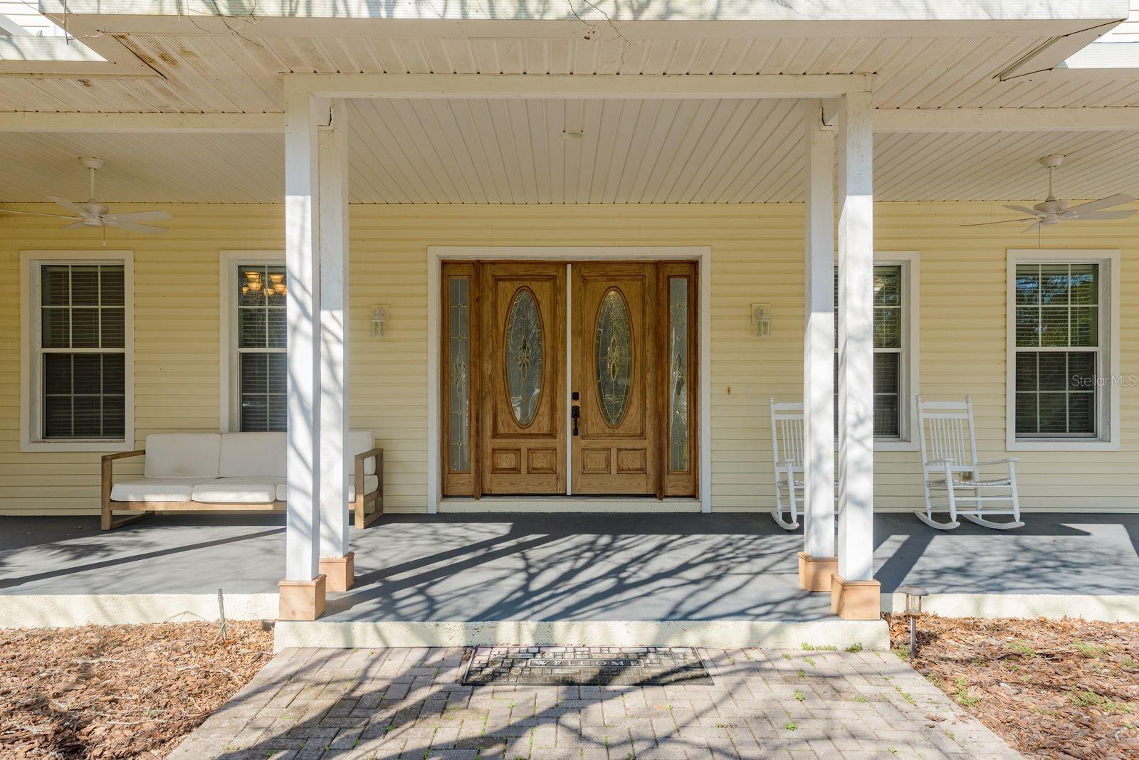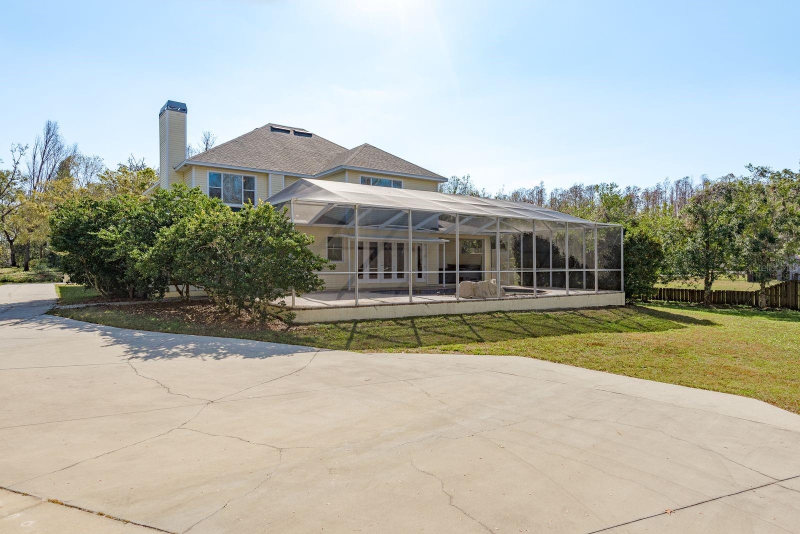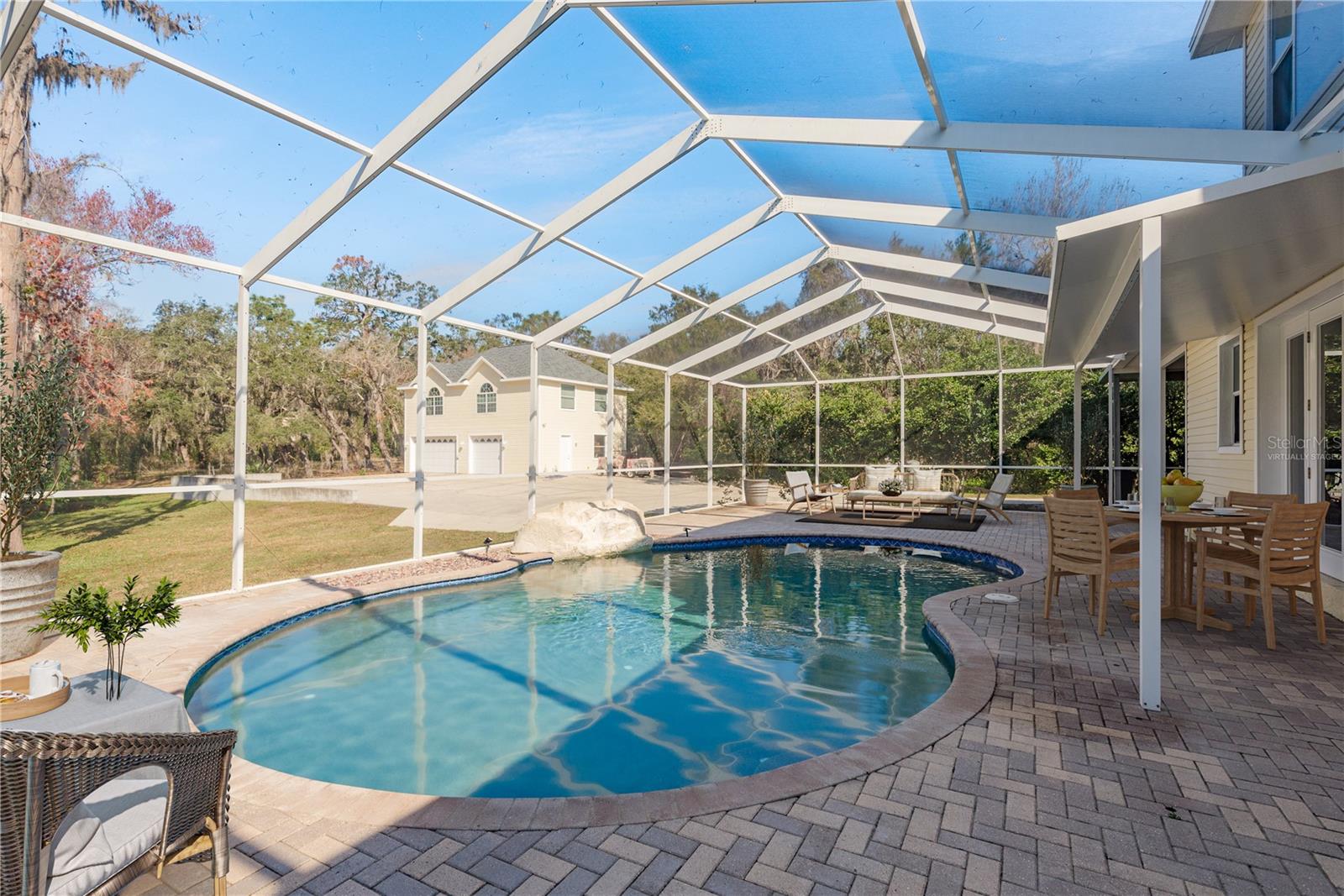 Welcome to Oak Ridge, where this remarkable estate sits on 1.69 acres in the much sought after Trinity area. Offering the perfect blend of peaceful country charm and modern convenience, the property provides room to spread out while still being just minutes from top-rated schools, shopping, dining, golf courses, medical centers, and Gulf beaches. Originally crafted as the private residence of a master builder, the home showcases exceptional quality and attention to detail throughout. With 5 bedrooms, 5 full bathrooms, and 2 half baths, it strikes an ideal balance of elegance and comfort. A long driveway and welcoming wraparound porch create a grand first impression. Just beyond the main residence, a detached 4-car garage includes a spacious studio apartment above, complete with kitchenette and bathroom—perfect for extended family, guests, a private office, game room, or rental opportunity. Inside, freshly stained double entry doors open to a soaring two-story foyer. Hardwood floors carry throughout the main living spaces, where a stone wood-burning fireplace creates a striking centerpiece in the family room. The open-concept layout flows seamlessly into the chef’s kitchen, featuring custom cabinetry with decorative glass accents, a large island, walk-in pantry, and a butler’s pantry that leads to the formal dining room. A casual dining area with French doors offers views of the pool and backyard. The main level also features a luxurious primary suite with French doors opening directly to the pool and hot tub, dual oversized walk-in closets, and a spa-like en-suite bath. An additional bedroom (ideal as an office) and a half bath complete the first floor. Upstairs, another large primary suite includes its own private bath. Two more bedrooms, one with an en-suite, plus a spacious gym (easily converted to another bedroom), private office space, and a loft with laundry chute offer flexibility. A second staircase provides convenient access back to the kitchen. Outdoor living is a highlight, featuring an expansive paver deck, resort-style pool with waterfall, and spa, all surrounded by mature trees and abundant wildlife. A custom-built treehouse, crafted with the same quality as the main home, creates a special retreat for children. At the back of the property, a freshwater creek offers bass fishing and peaceful scenery. With plenty of space for boats, RVs, and recreational toys, this estate combines luxury, leisure, and convenience. Recent improvements ensure peace of mind, including a brand-new roof (2023), newer A/C units (installed within the last three years), a 30kW Generac generator with a 500-gallon underground tank, a water treatment system, plus complete electrical and septic inspections in 2024. Don’t miss the opportunity to experience this extraordinary property—schedule your private showing today!