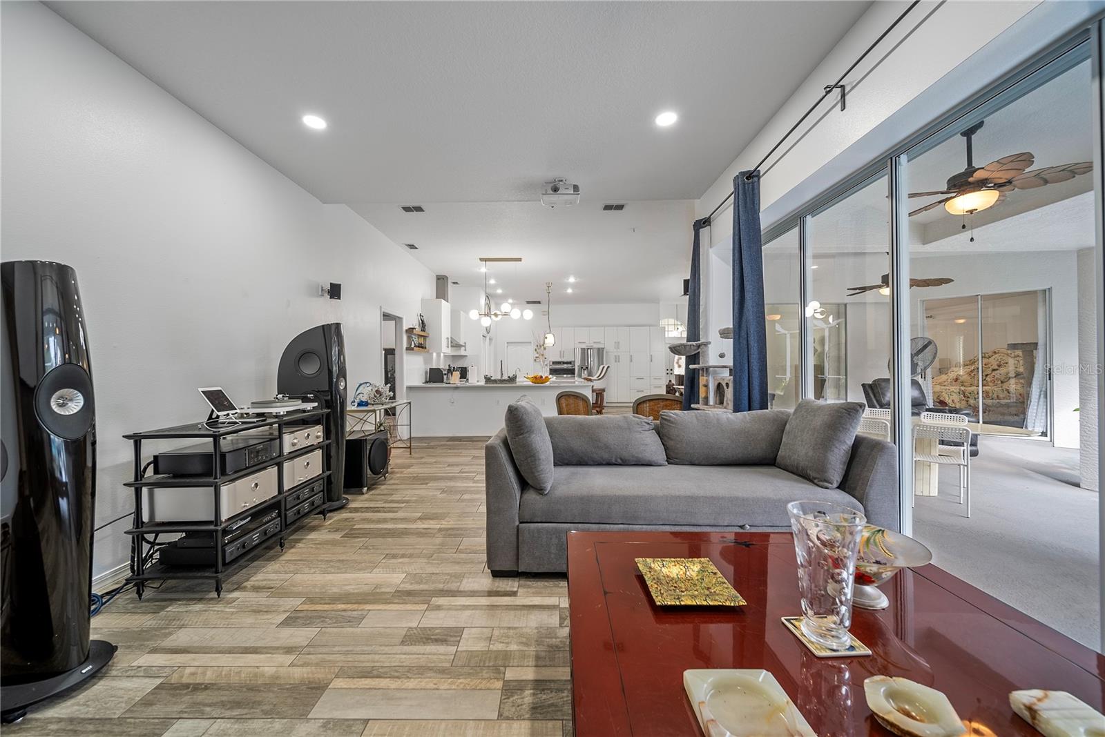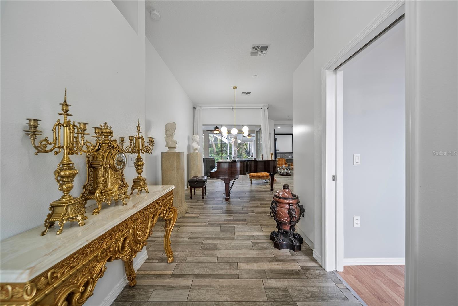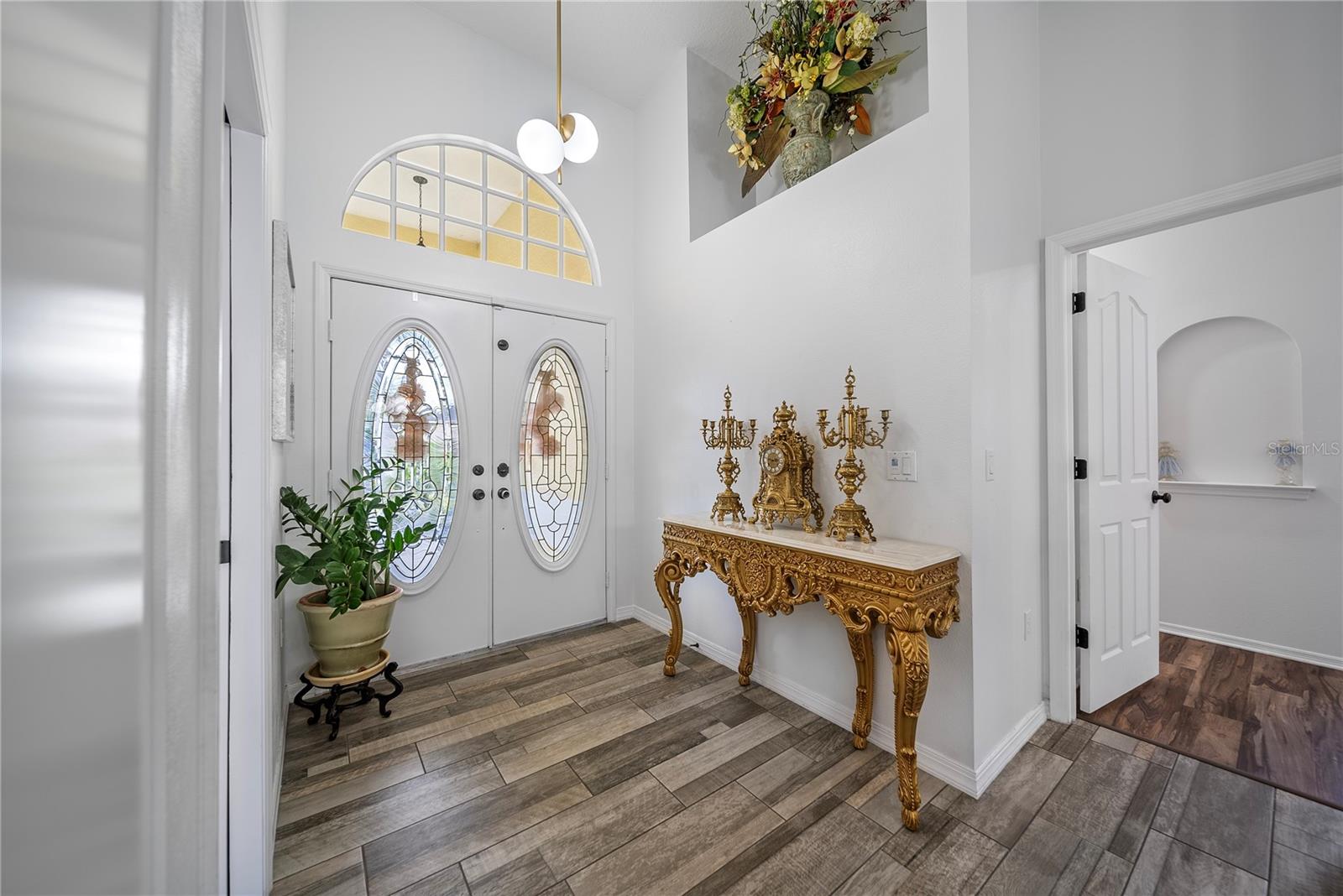 Discover this beautifully maintained 4-bedroom, 3-bath residence with a flexible den and expansive upstairs bonus room, nestled in the gated community of The Villages at Fox Hollow West (Bellerive)—where pride of ownership is evident at every turn. As you enter, you’re welcomed by a warm and stylish foyer. To the left, the private owner’s suite offers a peaceful escape, featuring a luxurious bathroom with a soaking tub, separate walk-in shower, dual vanities, and two oversized walk-in closets. To the right of the foyer is a versatile den—ideal for a home office, playroom, or cozy reading nook. Designed with entertaining in mind, the home’s open-concept layout seamlessly connects the living room to a gourmet kitchen. This impressive space boasts rich wood cabinetry, stunning upgraded granite countertops, stainless steel appliances, a striking backsplash, large central island, and abundant storage. The spacious living area offers plenty of room for gathering with friends and family, while the thoughtful split-bedroom layout ensures privacy for all. Down one hallway are two well-sized bedrooms and an updated full bath; down another, a guest bedroom and full bath that also serves the outdoor living space. Upstairs, a sizable bonus room provides endless possibilities—media room, game room, or additional guest space. Step outside to your private backyard oasis! Two sets of triple sliding glass pocket doors bring the outdoors in, leading to a covered lanai complete with a built-in outdoor kitchen and grill. Relax beside the sparkling pool with waterfall feature or gather around the fire pit in the beautifully landscaped, fully fenced yard—offering total seclusion with no rear neighbors. Additional highlights include updated custom lighting, roof (2018), A/C (2016), hot water heater (2015), and pool pump (2018). Located in an excellent school zone, just minutes from shopping, dining, and beaches. Low HOA fees and no CDD! This home combines upscale features with everyday comfort—schedule your private tour today!