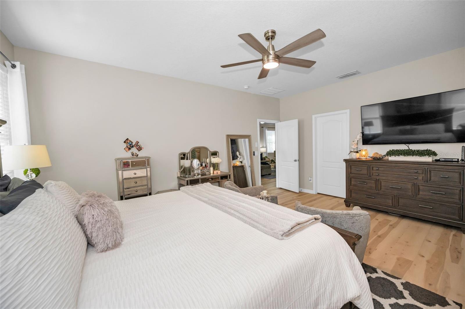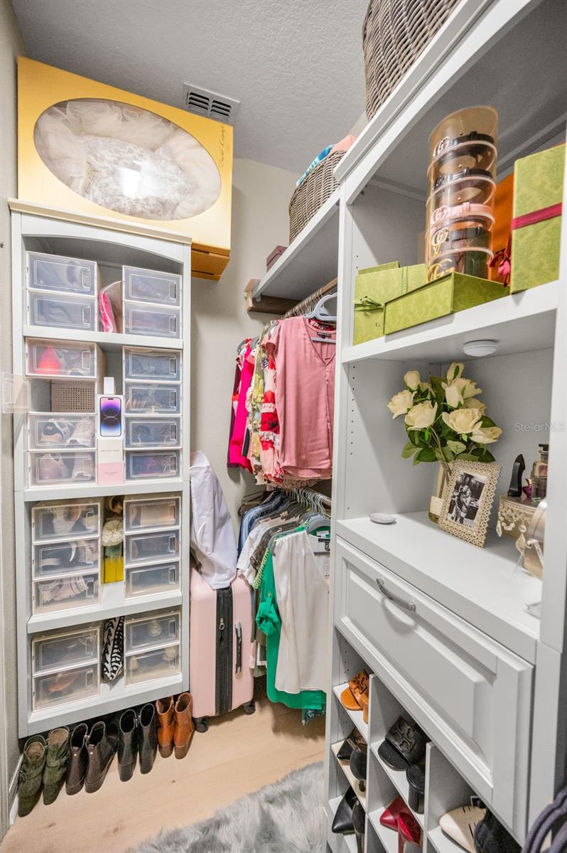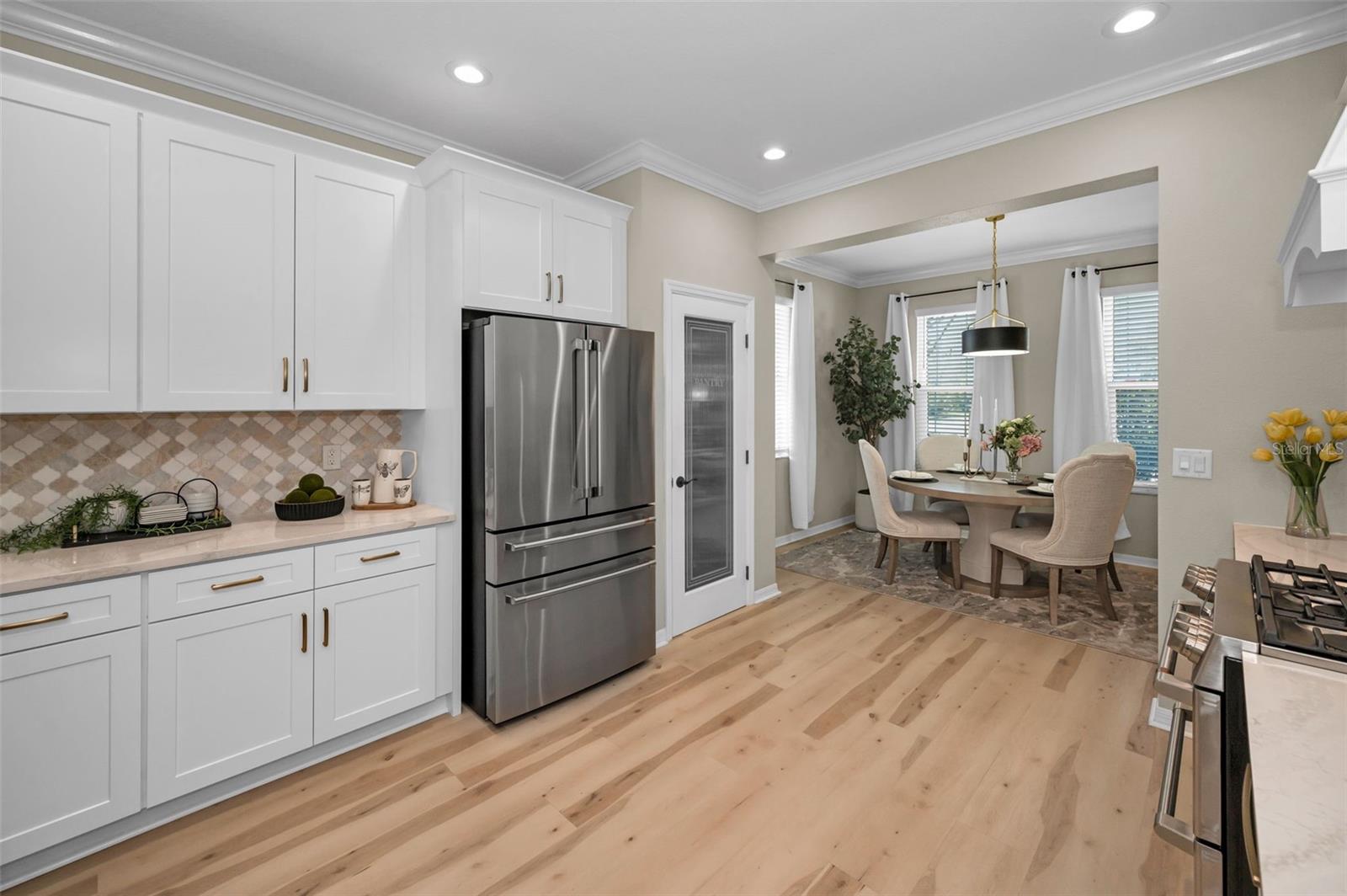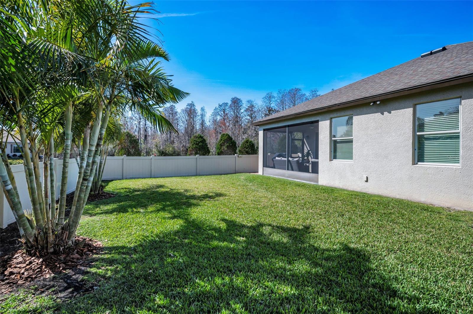 Welcome to this absolutely exquisite 3 bedroom/2 bath home in Trinity East. From the spacious corner lot dressed in lovely landscaping to the tranquil screened lanai, this stunning residence has not only been very well cared for but has been treated to all manner of HIGH-END UPGRADES AND CUSTOMIZATION. In 2024: NEW water softener, NEW hurricane rated windows at front of home, NEW ceiling fans. In 2023: NEW water heater, NEW luxury vinyl plank flooring throughout. In 2020, a new 3000-ton HVAC system was installed. The striking leaded glass entry door reveals the clean, modern aesthetic of the foyer and spacious living room with views straight through to the verdant yard. Sleek CUSTOM built-ins set the ideal spot for treasured photos and mementoes with shelving that frames the home entertainment niche. Adjacent to this beautiful space is the open and inviting FULLY RENOVATED KITCHEN. Recessed lighting shines down over the casual dining bar and separate breakfast room illuminated by three large windows. Boasting 42-inch cabinets and GE Café appliances, the Arabesque marble backsplash and quartz countertops gleam. Along with a gas stove, contrasting cabinetry, storage, and tons of counter space, the perfect pantry keeps all the party platters at your fingertips! As for the master suite, it is wonderfully expansive with abundant room for all your furniture and to accommodate a couple lounging areas. The en suite bath is a retreat with a classic soaking tub, dual sinks, brilliant features and finishes, along with a generous shower room. The CUSTOM MASTER BEDROOM CLOSET is just the one you’ve been looking for…ample shelving, shoe niches, keepsake drawers, and a variety of racks for every outfit category. The other two bedrooms feature newer vinyl plank flooring, while the HALL BATH REMODEL is simply gorgeous. Even the laundry room is well appointed with a graphite Samsung washer and dryer (will convey) surrounded by plenty of storage, a handy utility sink, and shelving. This little slice of heaven is encircled by PVC fencing and overlooking water views from the superbly pavered lanai and back patio. Although surrounded by Florida’s natural beauty, the eclectic mix of restaurants and retail are just minutes away. Only half an hour from both a wide selection of beaches as well as the cultural centers and international airport of Tampa, this home is perfectly situated and move-in ready.