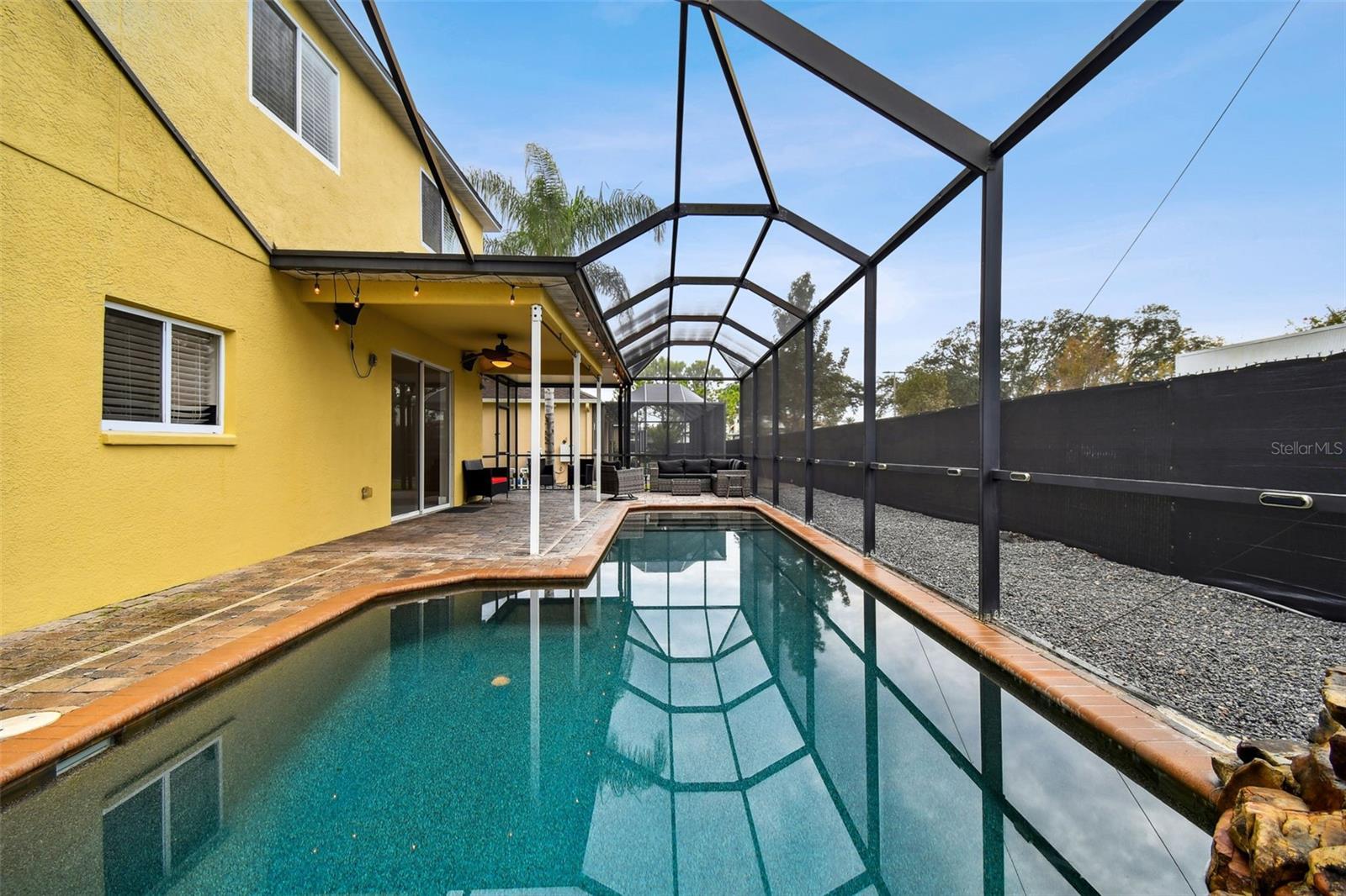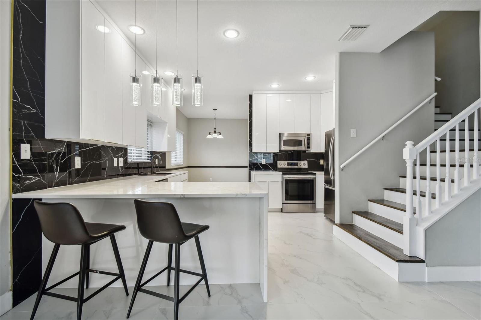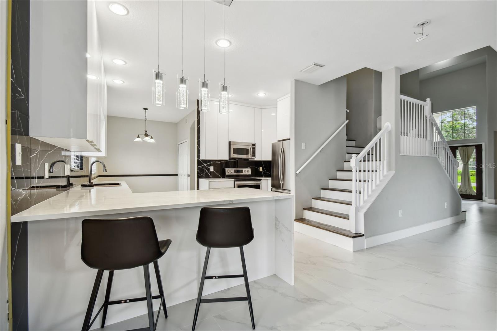 Stunning 4-Bedroom with office, 3-Bathroom, Pool Home in Thousand Oaks East located in the heart of Trinity. COMPLETELY RENOVATED and MOVE-IN ready! NEW ROOF 2022. Gourmet Kitchen: The heart of the home features a RENOVATED MODERN KITCHEN with QUARTZ countertops, an elegant Marble backsplash, a new PEHOHE WATERFALL SINK with digital readout and glass washer, a convenient pass-through window, pendant lighting, and a breakfast bar. Offers Top-of-the-line stainless steel appliances and a separate breakfast area adds extra dining space. Flooring: Upgrades include the seamless flow of porcelain tile throughout the downstairs and luxurious vinyl flooring upstairs. Updated Bathrooms: ALL bathrooms have been stylishly updated with new cabinets, granite countertops, modern lighting, and brand-new toilets. Elegant Staircase: The DUAL-ENTRY STAIRCASE was completed in wood planks and freshly painted railings and is a great focal point of the home. Spacious Bedrooms: All bedrooms are thoughtfully located upstairs. The Primary Bedroom is a true retreat, featuring a newly RENOVATED EN-SUITE bathroom with a larger shower enclosure including double rain shower heads, and a walk-in closet. Outdoor Entertaining: Step outside to a HEATED POOL complete with a ROCK WATERFALL. The pool area is screen-enclosed and complemented by a covered paver deck and sitting area. A NEW POOL PUMP was installed in July 2024, and blackout panels along the back fence allow additional privacy. Other additions include: 2021 A/C unit, fresh interior and exterior paint (2024), camera system, and water softener. The home is being offered FURNISHED with the furniture shown in the photographs. Centrally located with easy access to beaches, restaurants, and the airport. Situated in a NO FLOOD ZONE with low HOA fees and NO CDD!