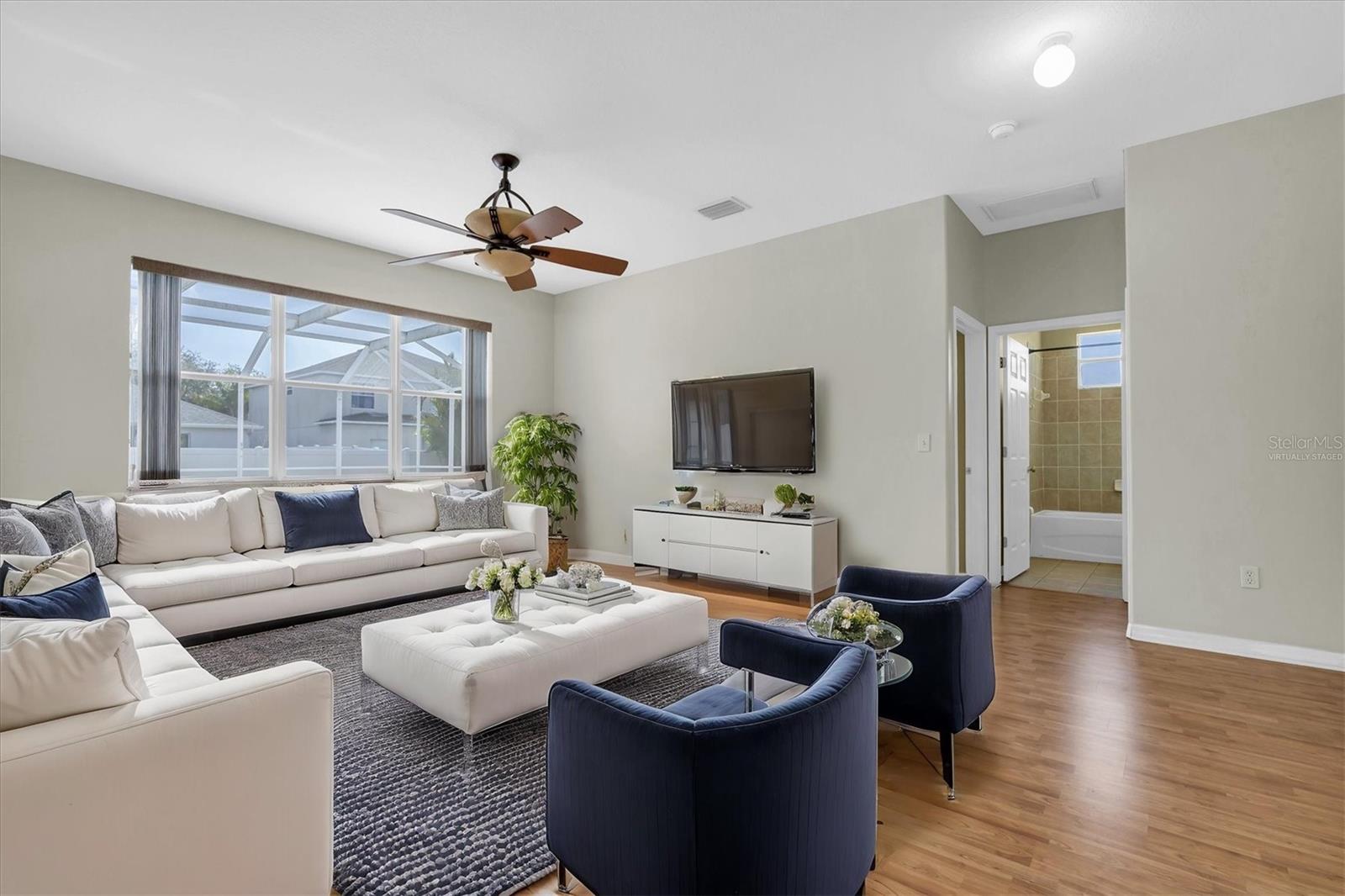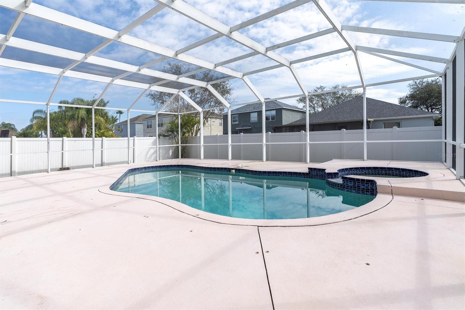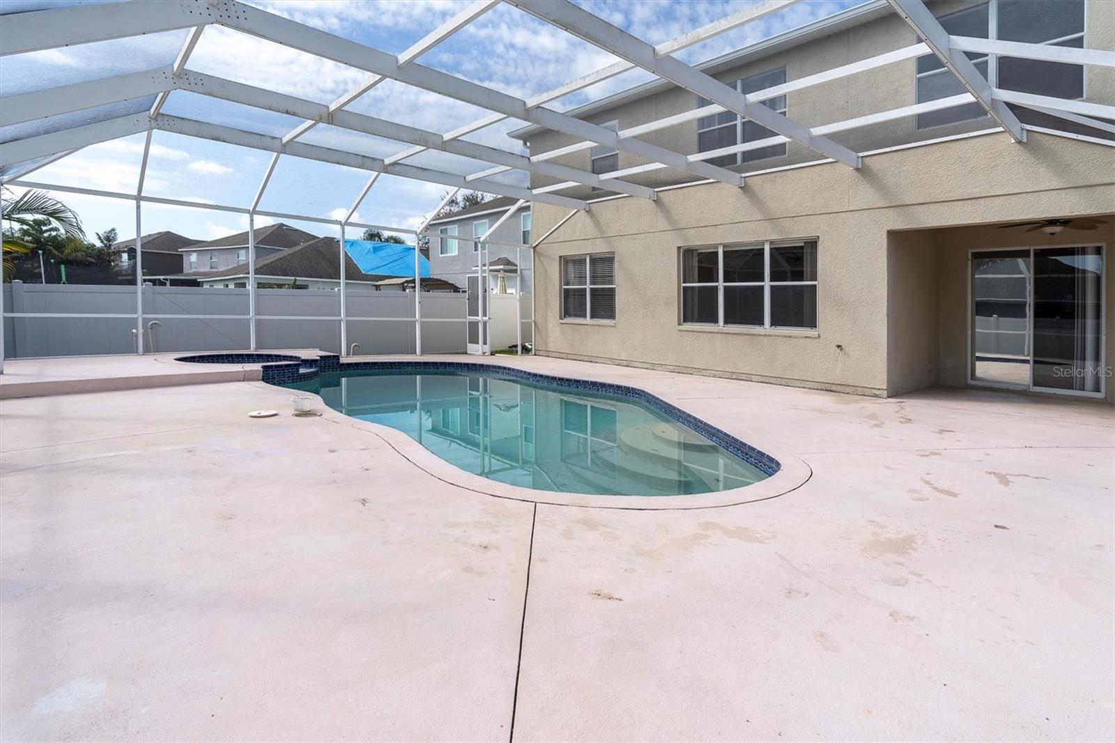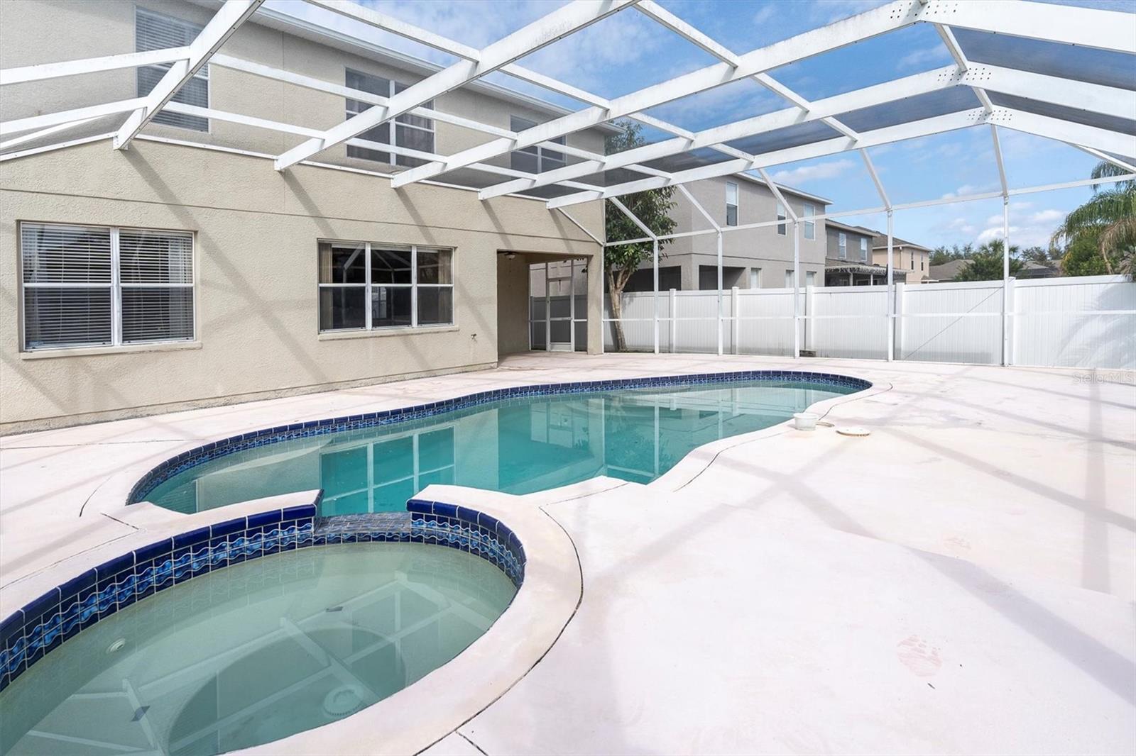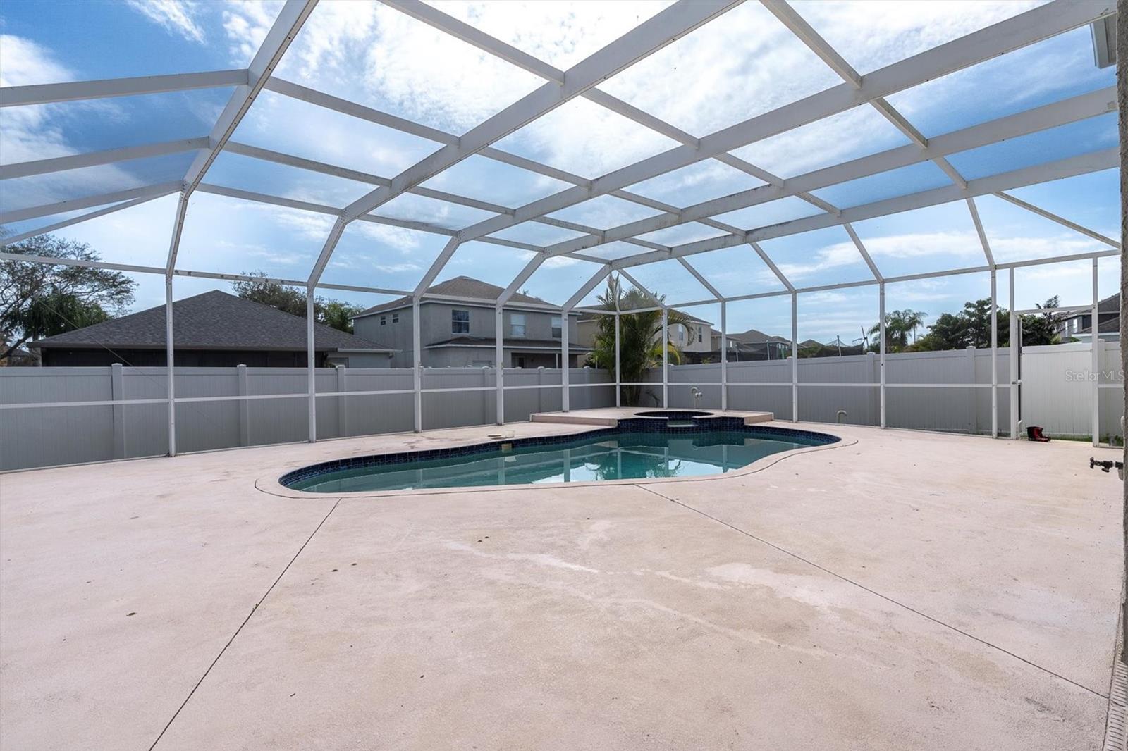 One or more photo(s) has been virtually staged. Don’t miss this spacious Trinity POOL home offering nearly 3,200 square feet of living space in the highly desirable Thousand Oaks East community. With 5 bedrooms, a bonus/media room, and 3 bathrooms, this home provides the perfect blend of space, comfort, and convenience. The main floor features a flexible 5th bedroom, ideal as a home office, guest suite, or in-law suite to suit your lifestyle. The heart of the home is the spacious kitchen, complete with granite countertops, a large island/breakfast bar, stainless steel appliances, and a closet pantry. Sliding glass doors open to a screened-in lanai with a sparkling pool and spa, creating an ideal space for relaxation and entertaining. The kitchen seamlessly flows into the family room, while the formal living and dining areas provide elegant spaces for hosting. Arched doorways throughout the home add a touch of architectural charm. Upstairs, the primary suite offers a luxurious ensuite bath with dual sinks, a soaking tub, a walk-in glass shower, and generous space for unwinding. Additional spacious guest rooms ensure comfort for family or visitors. The open staircase leads to a versatile loft area, perfect as a second living space or home office. Outside, the fenced yard is beautifully landscaped with concrete curbing, and the pavered driveway leads to an oversized 3 car garage with ample storage. A newer roof (2020) provides added peace of mind. Situated near top-rated schools, shopping, dining, medical facilities, and a golf course, this home offers prime location and lifestyle. Schedule your private tour today—this home is a must-see!