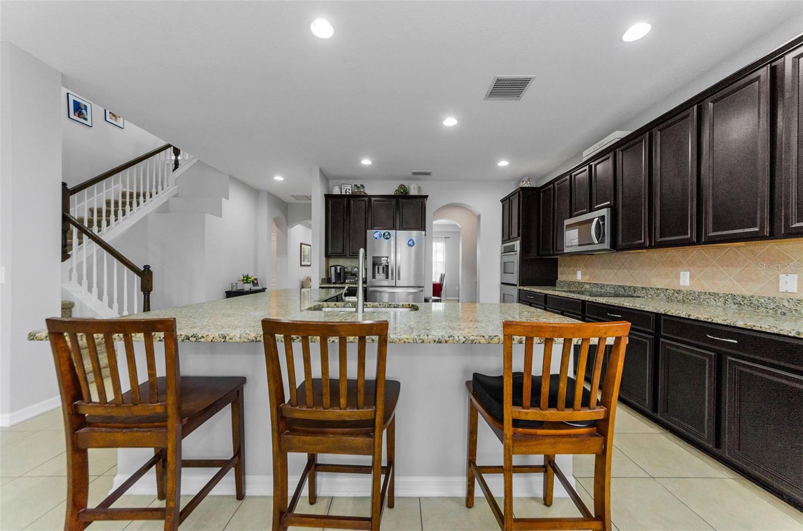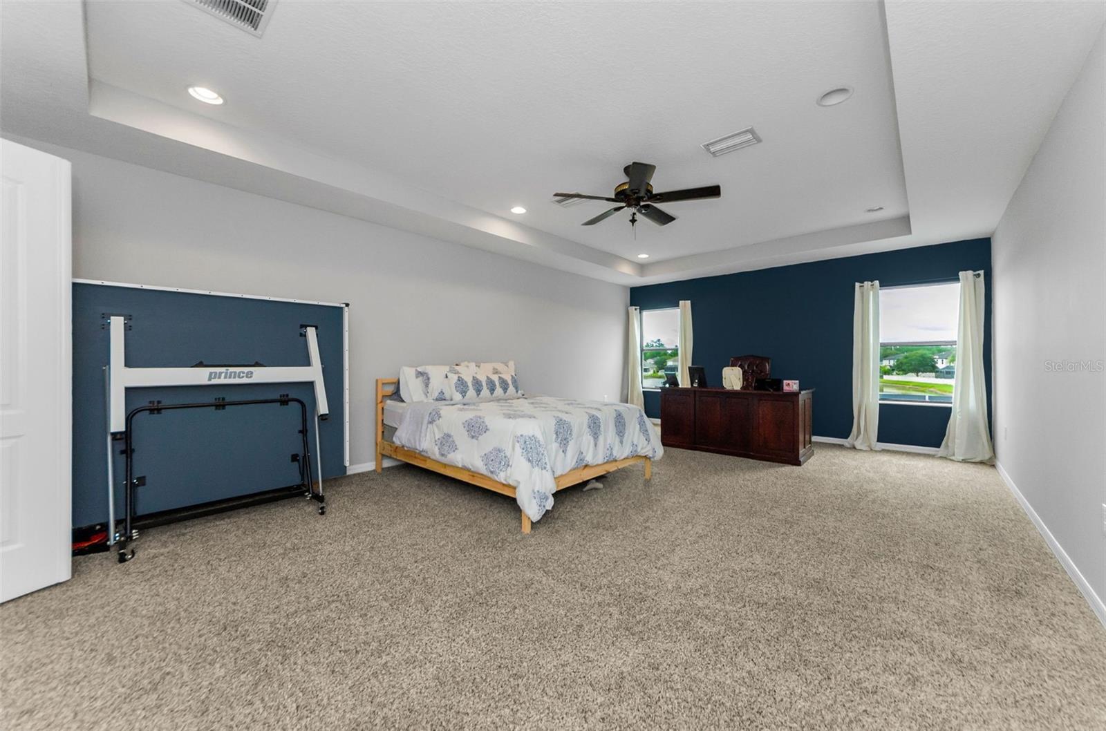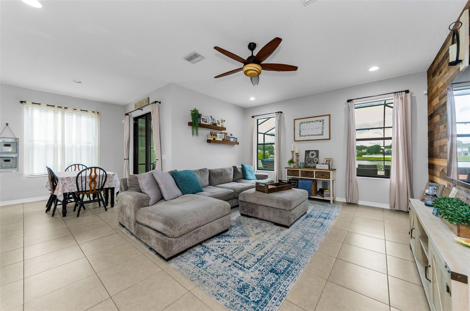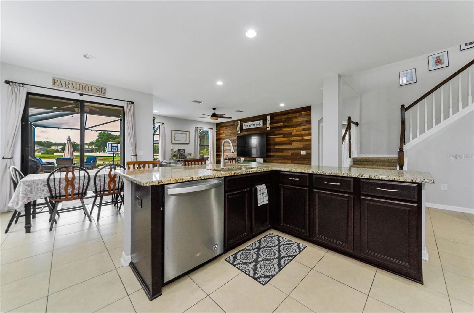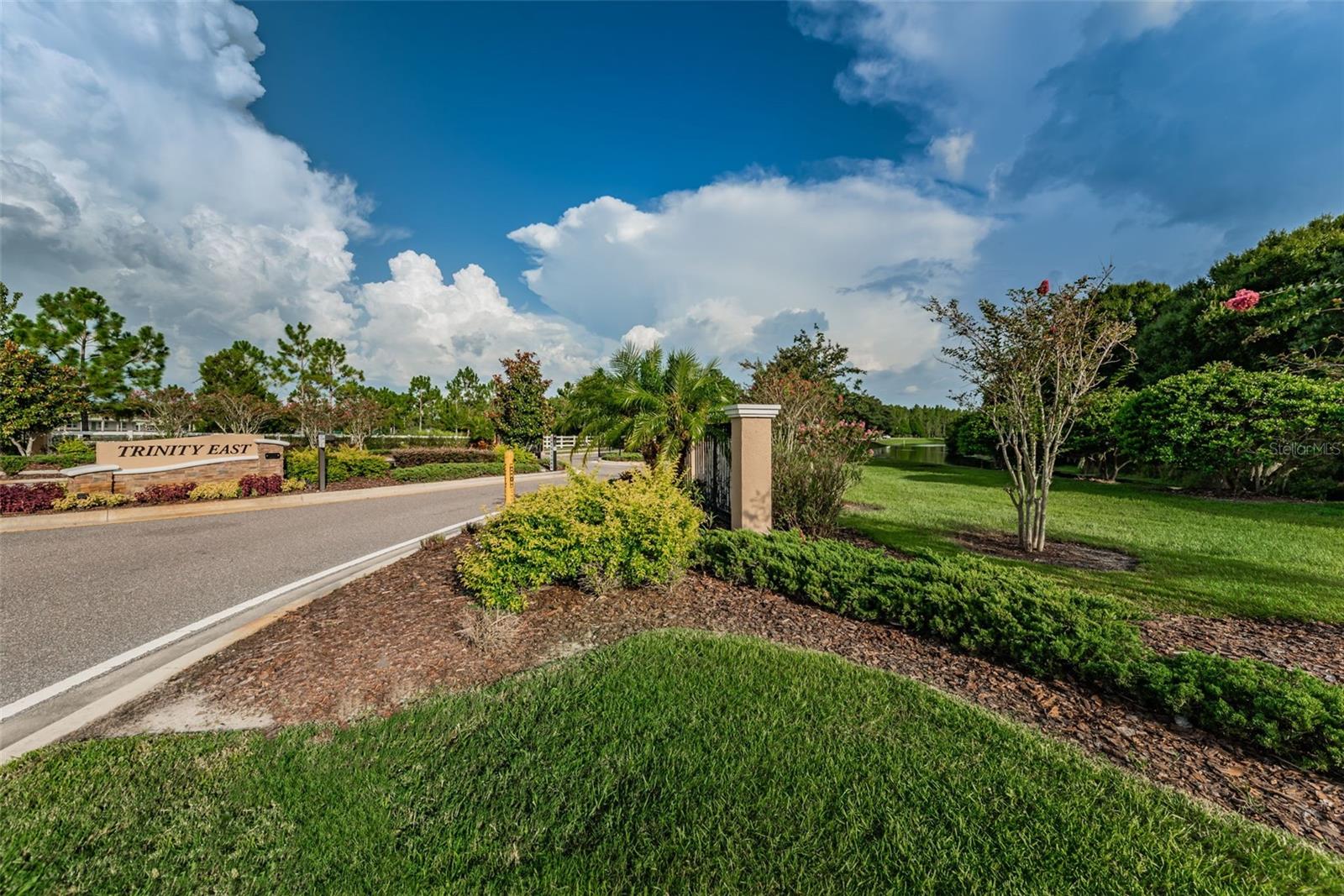 AMAZING PRICE for this expansive 5-bedroom, 2.5-bath home offering over 3,200 sq. ft. of living space in the desirable gated community of Trinity East. This established neighborhood features walking trails, a playground, and peaceful pond views—all within close proximity to top-rated schools, shopping, dining, and medical facilities. The home features a welcoming front porch, stacked stone trim, and a 2-car garage. Inside, you'll find soaring ceilings, arched doorways, and an open-concept layout designed for comfortable everyday living and entertaining. The great room is accented with a custom wood feature wall, and a formal dining room connects to the kitchen through a convenient butler’s pantry. The kitchen is well-appointed with granite countertops, stainless steel appliances, built-in double oven, a breakfast bar, tile backsplash, and a casual dining area with sliding doors that open to the screened lanai. Step outside to your private backyard retreat with a pavered pool area, fenced yard, and tranquil pond views. The spacious primary suite is located on the main floor and features a tray ceiling, walk-in closet, and an ensuite bath complete with granite countertops, dual sinks, a soaking tub, tiled shower, and separate water closet. Upstairs, you’ll find additional generously sized bedrooms, a full bathroom, and a large bonus room perfect for a playroom, media space, or home office. Don’t miss your opportunity to own this stunning home in one of Trinity’s most sought-after gated communities.