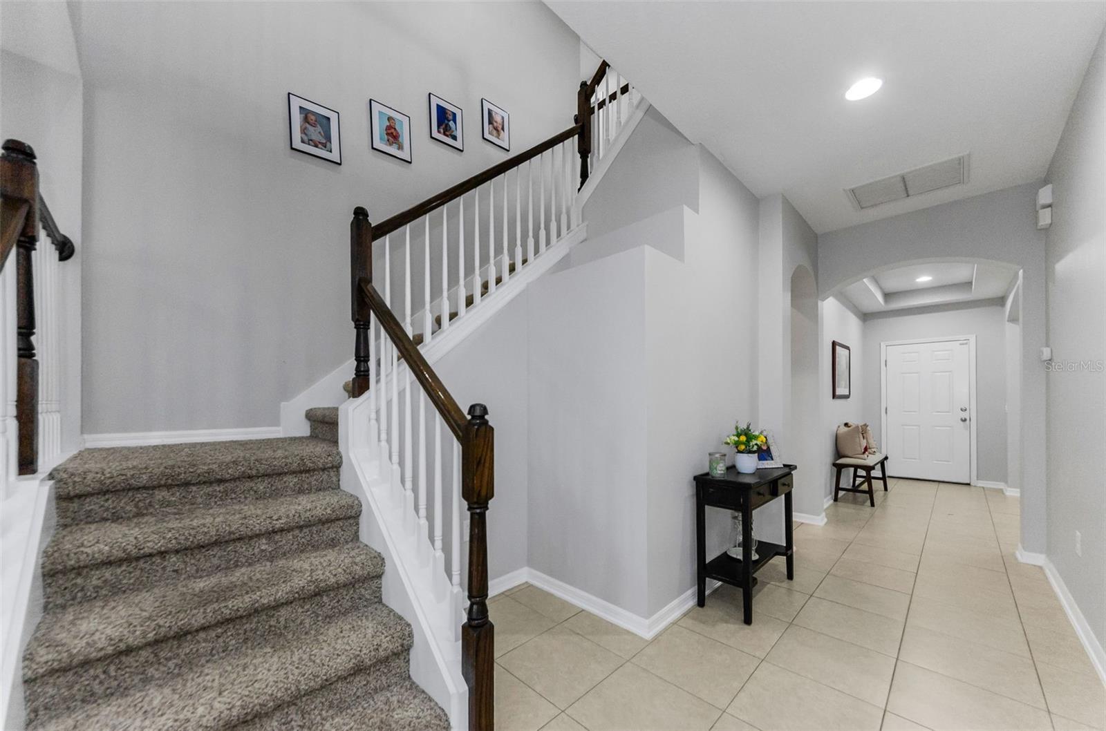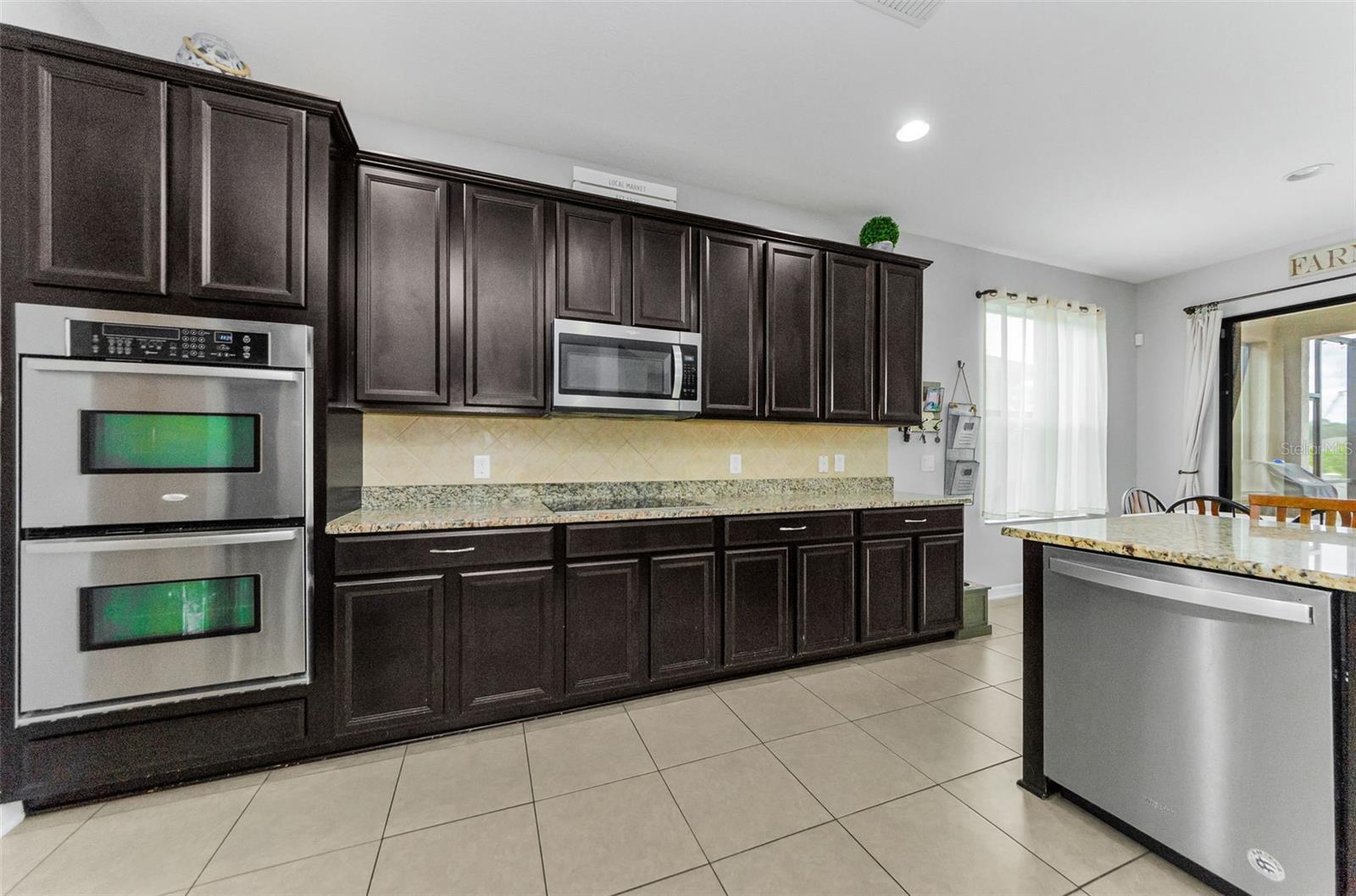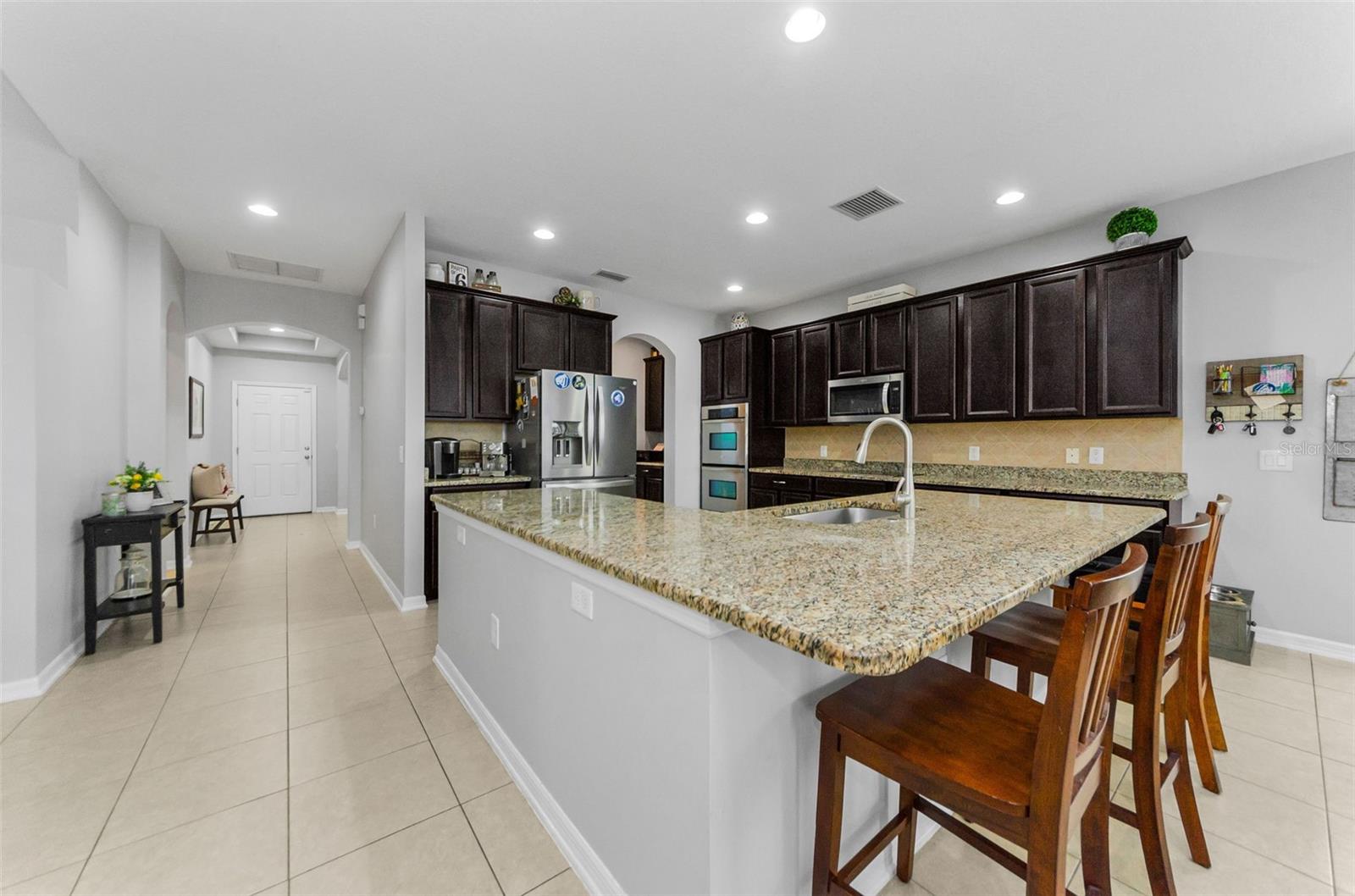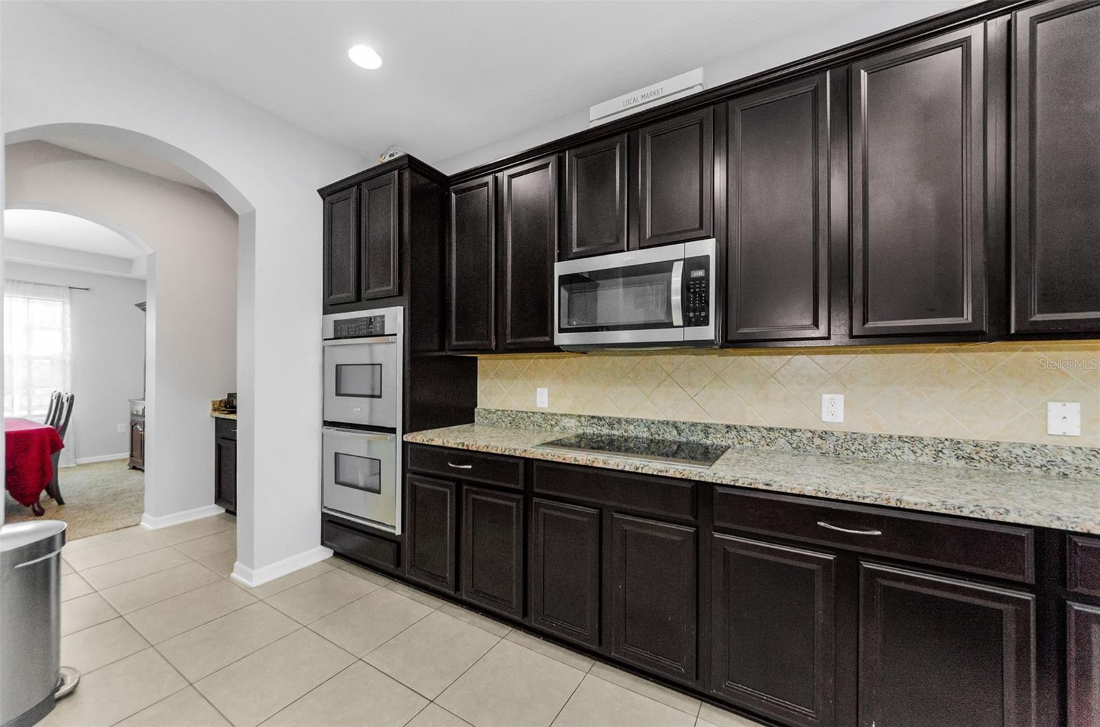 AMAZING PRICE for this expansive 5-bedroom, 2.5-bath home offering over 3,200 sq. ft. of living space in the desirable gated community of Trinity East. This established neighborhood features walking trails, a playground, and peaceful pond views—all within close proximity to top-rated schools, shopping, dining, and medical facilities. The home features a welcoming front porch, stacked stone trim, and a 2-car garage. Inside, you'll find soaring ceilings, arched doorways, and an open-concept layout designed for comfortable everyday living and entertaining. The great room is accented with a custom wood feature wall, and a formal dining room connects to the kitchen through a convenient butler’s pantry. The kitchen is well-appointed with granite countertops, stainless steel appliances, built-in double oven, a breakfast bar, tile backsplash, and a casual dining area with sliding doors that open to the screened lanai. Step outside to your private backyard retreat with a pavered pool area, fenced yard, and tranquil pond views. The spacious primary suite is located on the main floor and features a tray ceiling, walk-in closet, and an ensuite bath complete with granite countertops, dual sinks, a soaking tub, tiled shower, and separate water closet. Upstairs, you’ll find additional generously sized bedrooms, a full bathroom, and a large bonus room perfect for a playroom, media space, or home office. Don’t miss your opportunity to own this stunning home in one of Trinity’s most sought-after gated communities.