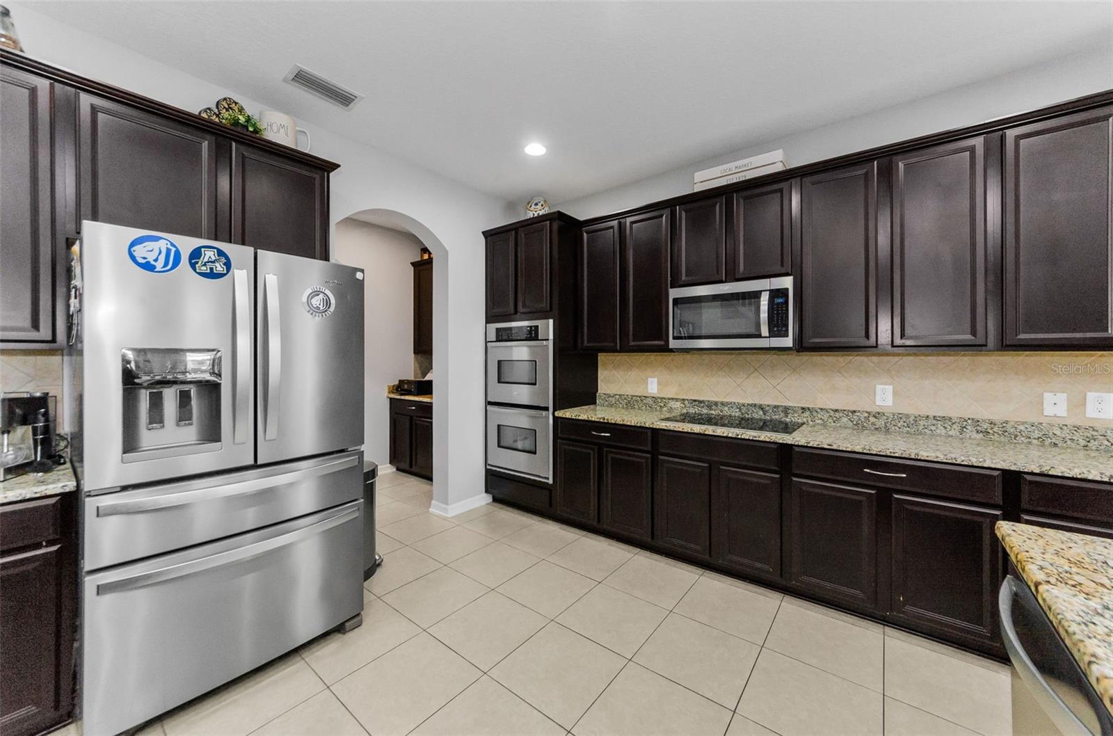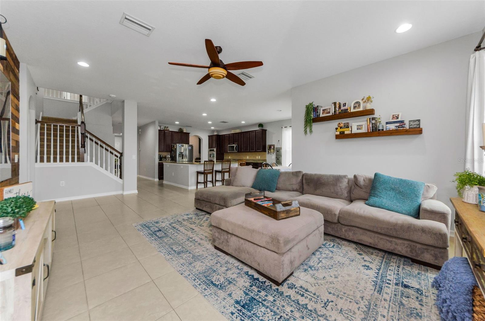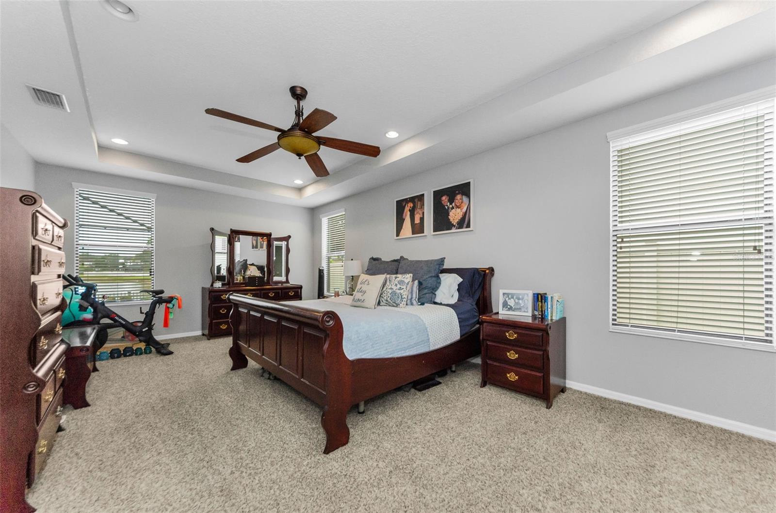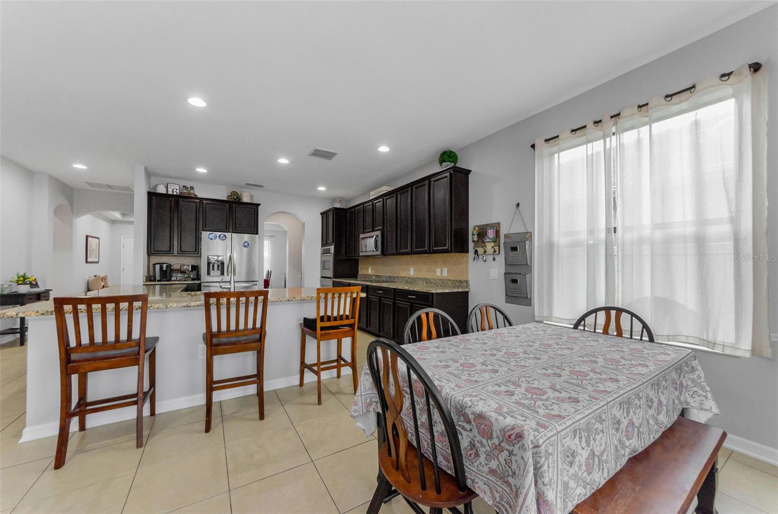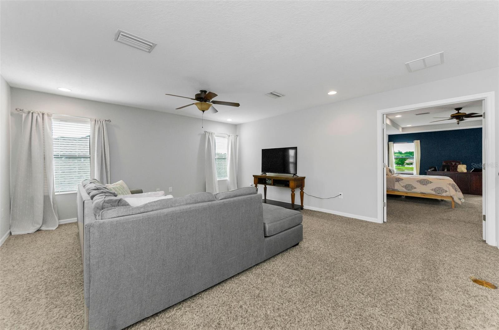 AMAZING PRICE for this expansive 5-bedroom, 2.5-bath home offering over 3,200 sq. ft. of living space in the desirable gated community of Trinity East. This established neighborhood features walking trails, a playground, and peaceful pond views—all within close proximity to top-rated schools, shopping, dining, and medical facilities. The home features a welcoming front porch, stacked stone trim, and a 2-car garage. Inside, you'll find soaring ceilings, arched doorways, and an open-concept layout designed for comfortable everyday living and entertaining. The great room is accented with a custom wood feature wall, and a formal dining room connects to the kitchen through a convenient butler’s pantry. The kitchen is well-appointed with granite countertops, stainless steel appliances, built-in double oven, a breakfast bar, tile backsplash, and a casual dining area with sliding doors that open to the screened lanai. Step outside to your private backyard retreat with a pavered pool area, fenced yard, and tranquil pond views. The spacious primary suite is located on the main floor and features a tray ceiling, walk-in closet, and an ensuite bath complete with granite countertops, dual sinks, a soaking tub, tiled shower, and separate water closet. Upstairs, you’ll find additional generously sized bedrooms, a full bathroom, and a large bonus room perfect for a playroom, media space, or home office. Don’t miss your opportunity to own this stunning home in one of Trinity’s most sought-after gated communities.