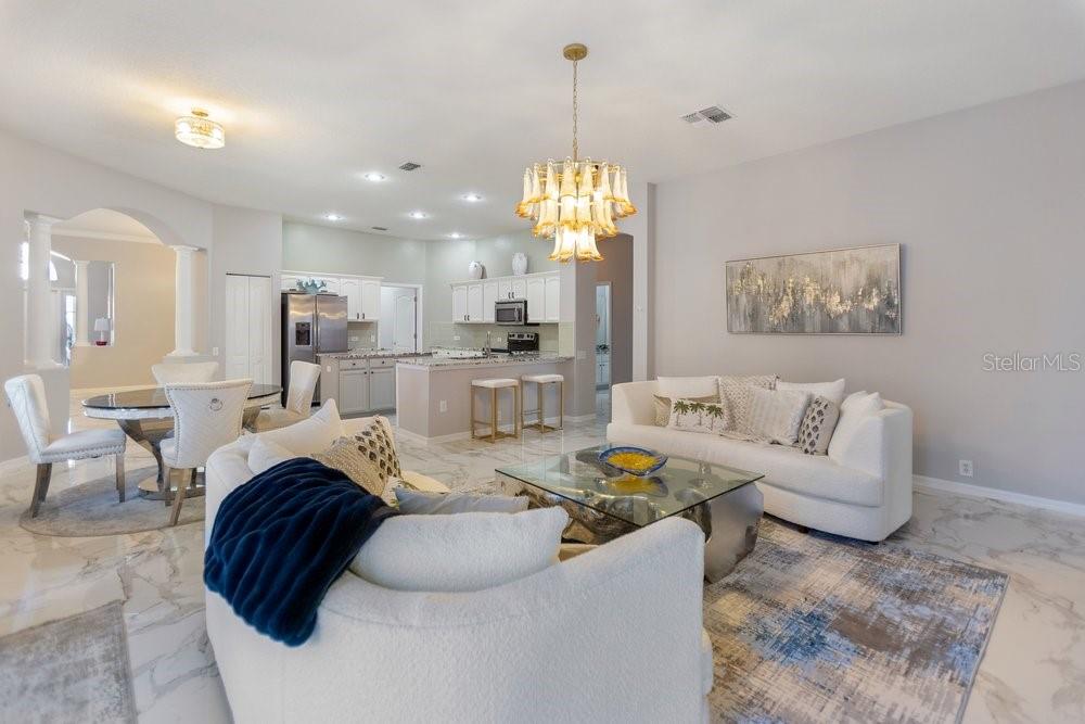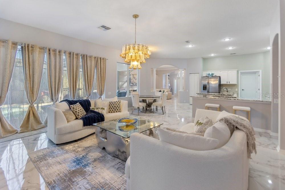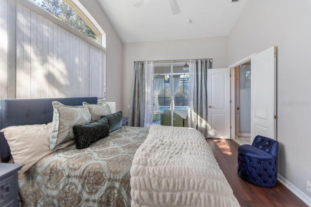 Welcome to 9050 Callaway Drive, located in the highly sought-after Bellerive Villages of Fox Hollow community, within the desirable Champions Club. This beautifully maintained, turn-key pool home offers 2,584 square feet, 4 bedrooms, and 3 full bathrooms, thoughtfully designed for comfort, entertaining, and multi-generational living. From the moment you enter, a grand entry foyer opens to a spacious flex area ideal for entertaining or gathering, with stunning pool views visible throughout the home. The unique split floor plan provides privacy and functionality, with the primary suite privately situated on one side of the home. This expansive retreat features dual walk-in closets, dual vanities, a luxury soaking garden tub, and a separate walk-in shower, along with direct access to the pool for effortless indoor-outdoor living. The heart of the home is the centrally located kitchen, designed for connection and hosting. It offers abundant space for family and friends, a charming bay window breakfast area, bar seating, and seamless flow into the living areas. The living room showcases a full wall of sliding glass doors, opening to the newly refinished patio and resort-style pool, creating the ideal Florida lifestyle experience. The home features porcelain tile throughout all common areas with no carpet, offering both style and low-maintenance living. Additional bedrooms are thoughtfully tucked away past the kitchen, including a private rear bedroom with pool access, making it ideal for multi-generational living or guests. Outdoors, enjoy a saltwater, heated pool equipped with a Jandy pool system, new pavers, new pool tile, and a new pool finish, all completed within the last two years. Fire features add an elegant, resort-inspired touch, while two covered patio areas provide ample space for entertaining, relaxing, or swimming laps. Situated on a nicely sized lot backing to conservation, this home offers privacy and tranquility — and no flood zone. Major updates include a new roof installed in 2021, providing peace of mind for years to come. Completing the property is a 3-car garage with an extended driveway, enhancing both convenience and curb appeal. Ideally located near several championship golf courses, as well as shopping, dining, Tampa International Airport, and award-winning Gulf Coast beaches. This is Florida living at its finest — beautifully updated, thoughtfully designed, and truly move-in ready