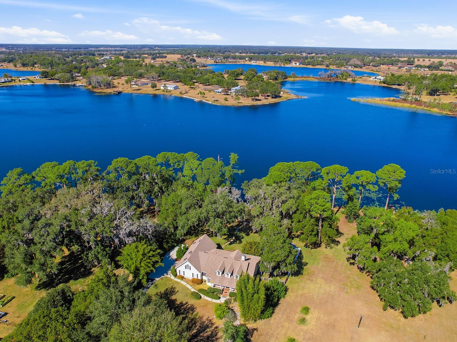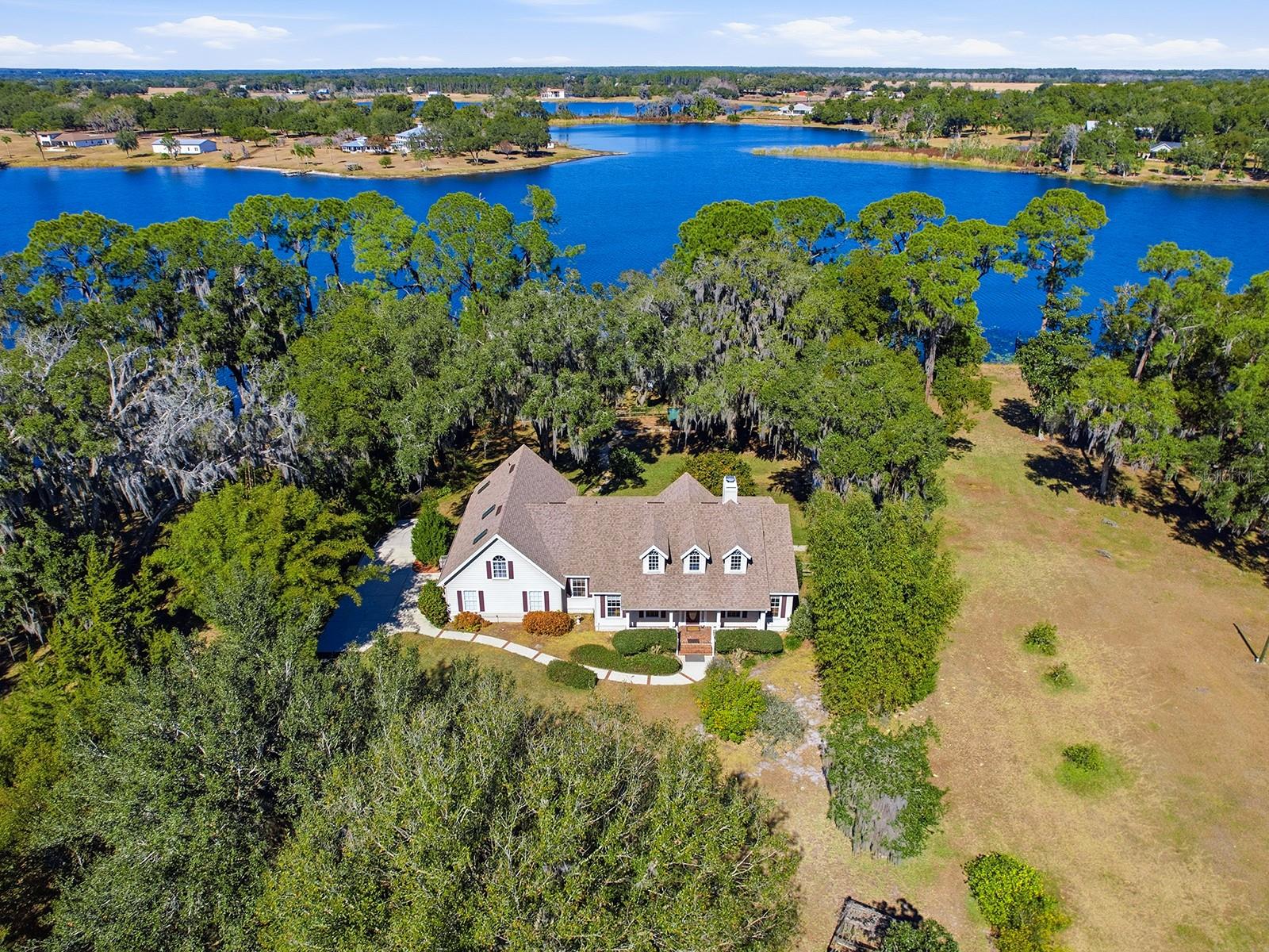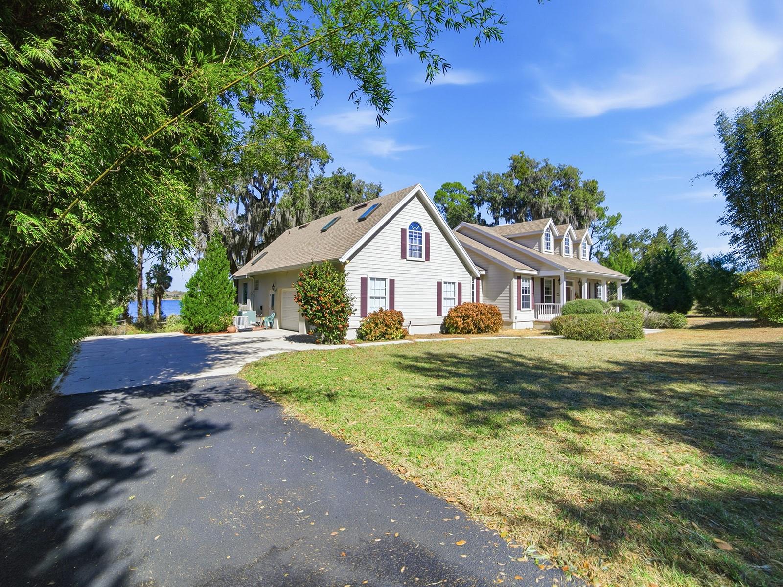 This custom lakefront residence, built in 1997 by Jett Riley, features a New Roof and offers 2,645 square feet of air-conditioned living space and just over 4,000 sq. ft. under roof. The country-style block home is finished with Hardie Board siding and features a split bedroom plan with 3 bedrooms, 2.5 bathrooms, a bonus room, indoor laundry room and an oversized two-car side-entry garage. Thoughtfully set back from the road, the home is positioned to maximize panoramic lakefront views. An enclosed, air-conditioned sunroom spans the rear of the home, providing exceptional views of the lake year-round. The country kitchen is appointed with granite countertops, solid wood cabinets, a convection oven, breakfast bar, built-in desk, dinette area, and closet pantry. All stainless steel kitchen appliances convey. The open floor plan is ideal for entertaining, with a wood-burning brick fireplace serving as the focal point of the family room. The formal dining room showcases a tray ceiling, crown molding, and tasteful wallpaper. Main living areas feature solid wood flooring, with ceramic tile in the foyer, kitchen, bathrooms, and laundry room; bedrooms are carpeted. The second-floor bonus room is perfect for guests or a home office and includes built-in desks. Additional designer details include built-ins, 5-inch baseboards, plant shelves, and architectural niches throughout. Located within the city limits of Umatilla, the property is on city water and septic and there is NO HOA. Lake Crescent is a spring-fed lake, ideal for fishing, swimming, and non-motorized boating, all accessible from the private dock. Situated on 1.5 acres, the property is enhanced by lush, mature landscaping with numerous fruit and flowering trees. Schedule your private showing today to experience this exceptional lakefront home.