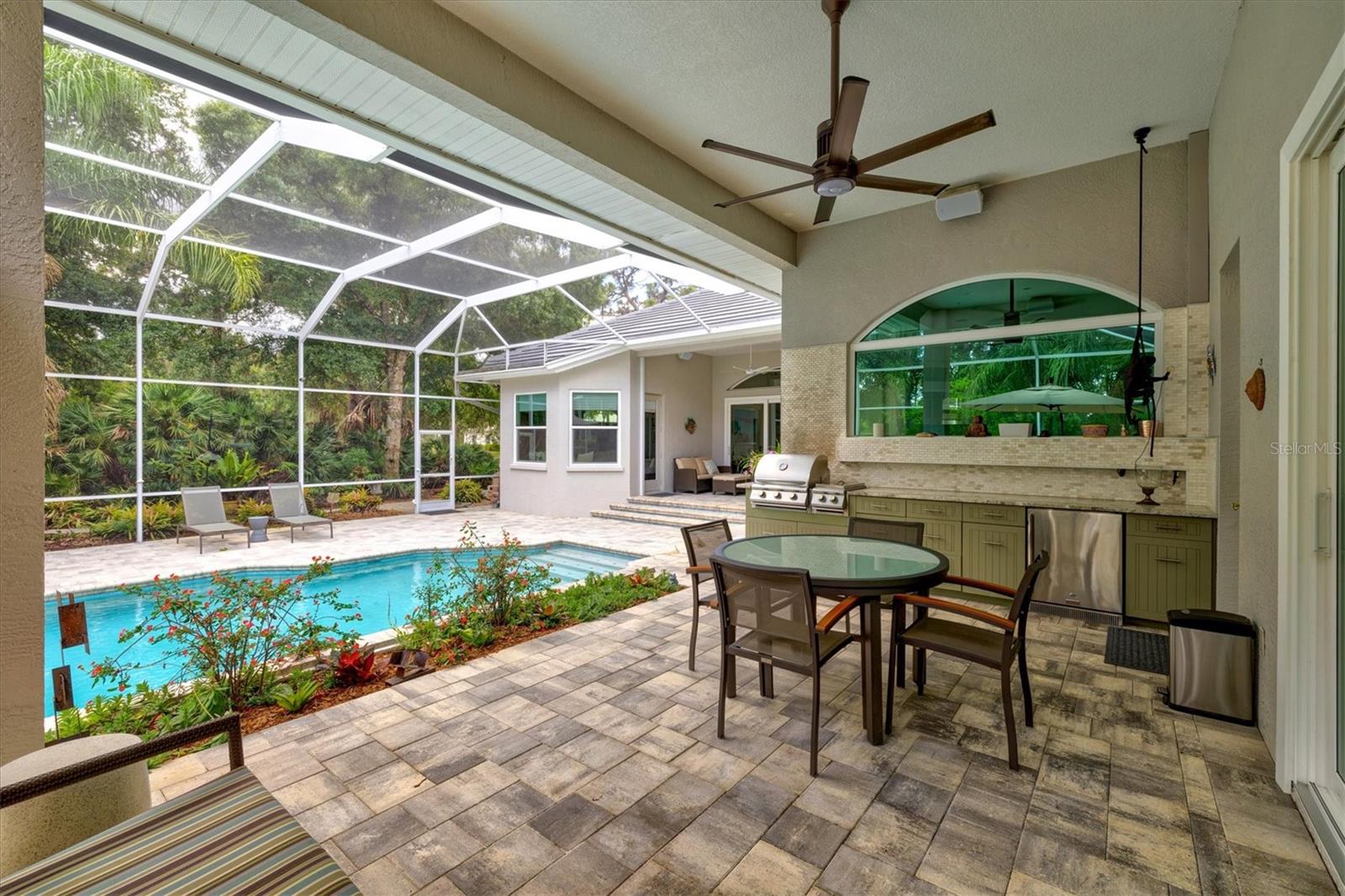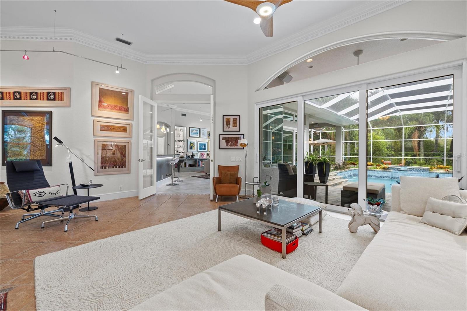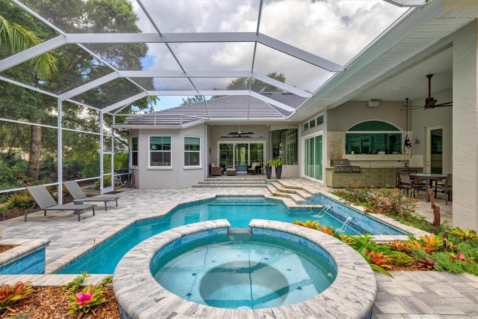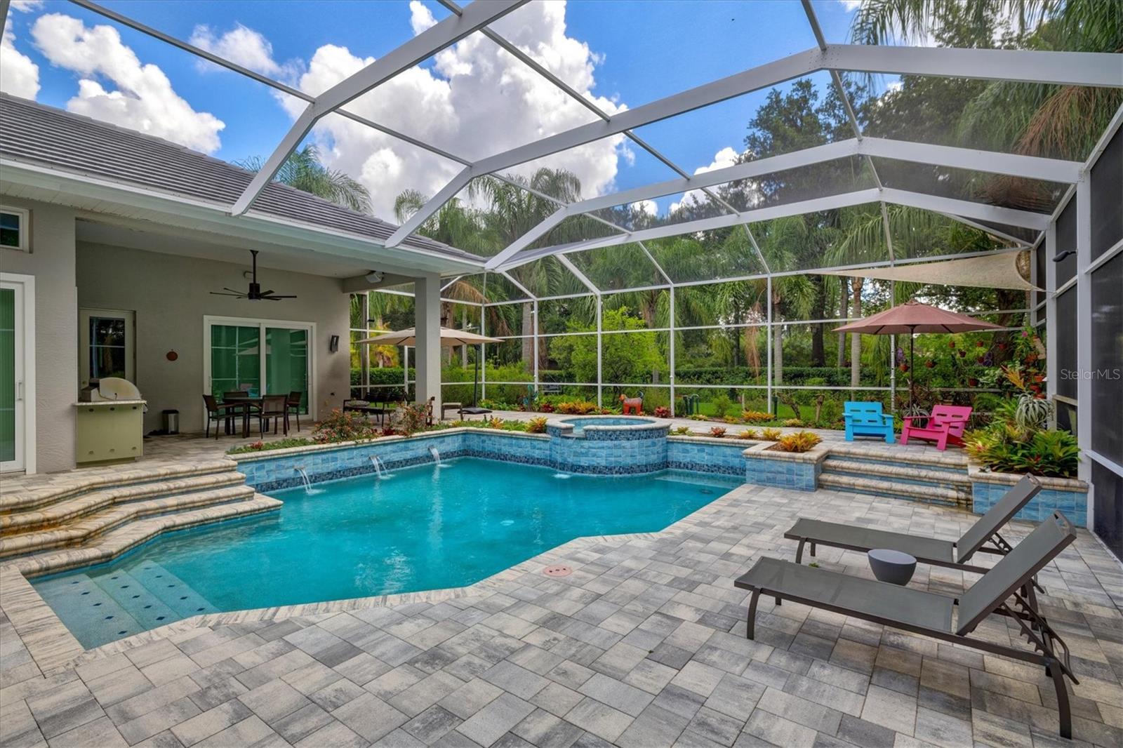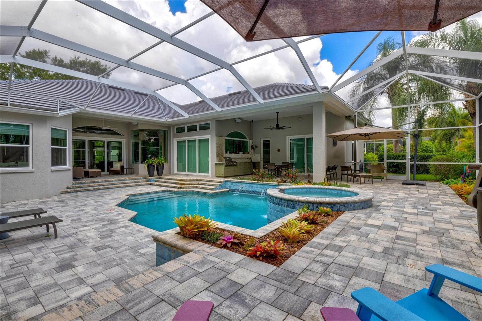 Welcome to your dream home, a stunning Pat Neal residence that offers an exceptional lifestyle in the sought-after University Park Country Club community. This exquisite 4-bedroom, 3-bath home is perfect for the discerning collector of art and memorabilia, with thoughtfully designed spaces that combine elegance and functionality. As you step through the beautifully etched glass front door, you're greeted by an impressive living room and dining room combination. High ceilings, intricate crown molding, and lighted built-ins showcase the refined details of this home. A triple sliding glass door opens to the inviting pool and lanai, seamlessly blending indoor and outdoor living. The split floor plan ensures privacy and tranquility in the primary suite, which features a spacious windowed sitting area, perfect for relaxation or enjoying a good book. Admire your collections on the gallery wall, and benefit from two large walk-in closets offering ample storage. The luxurious primary bathroom boasts double sinks, a soaking tub, and a large zero-entry walk-in shower, creating a spa-like retreat. On the opposite side of the house, you'll find three additional bedrooms and two sleek, updated bathrooms, providing comfort and convenience for family or guests. The heart of the home is the large chef’s kitchen, complete with an island featuring storage and a raised bar, an eat-in dining area, and stunning aquarium windows. The kitchen flows into the family room, where triple glass sliders lead to the expansive lanai. The outdoor space is truly exceptional. The large pavered lanai offers various seating areas, an outdoor kitchen with a refrigerator, grill, and side burners, all overlooking the beautifully resurfaced and tiled heated salt-water pool and hot tub. The yard is fenced with an almost-invisible green chain-link fence adorned with lush plantings, ensuring privacy. The entire yard and lanai are landscaped with Florida native flowering plants, shrubs, and large trees, creating a serene oasis and a haven for birds, butterflies and pollinators. A charming fountain graces the front entrance, adding to the home's curb appeal. This home features numerous upgrades, including a new tile roof installed in 2023. Crown molding, tray ceilings, designer ceiling fans, custom built-ins, Hunter Douglas window treatments, home theater/surround sound system, ample storage, and LED lighting are found throughout. Additionally, the home is equipped with hurricane impact-resistant windows, doors, and shutters for your peace of mind. Don't miss this opportunity to own this showcase of design and craftsmanship with modern upgrades in a prime location. Schedule your private showing today and experience the luxurious lifestyle this home has to offer.