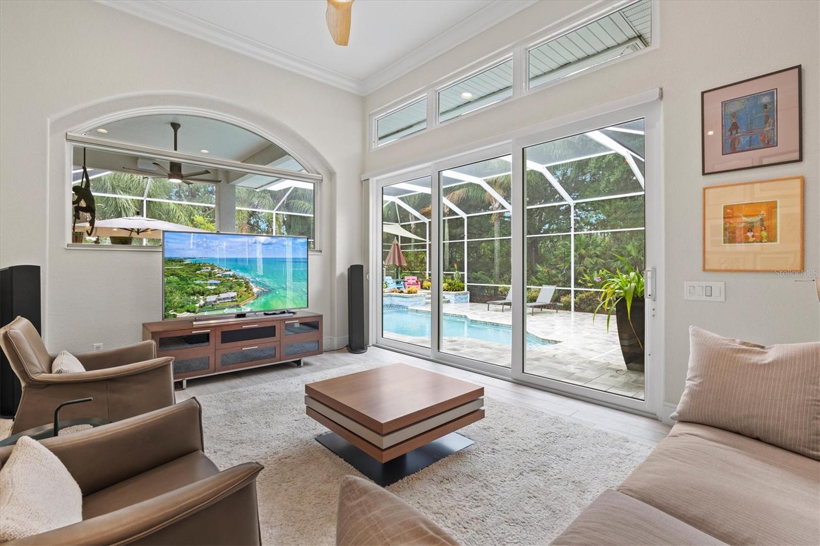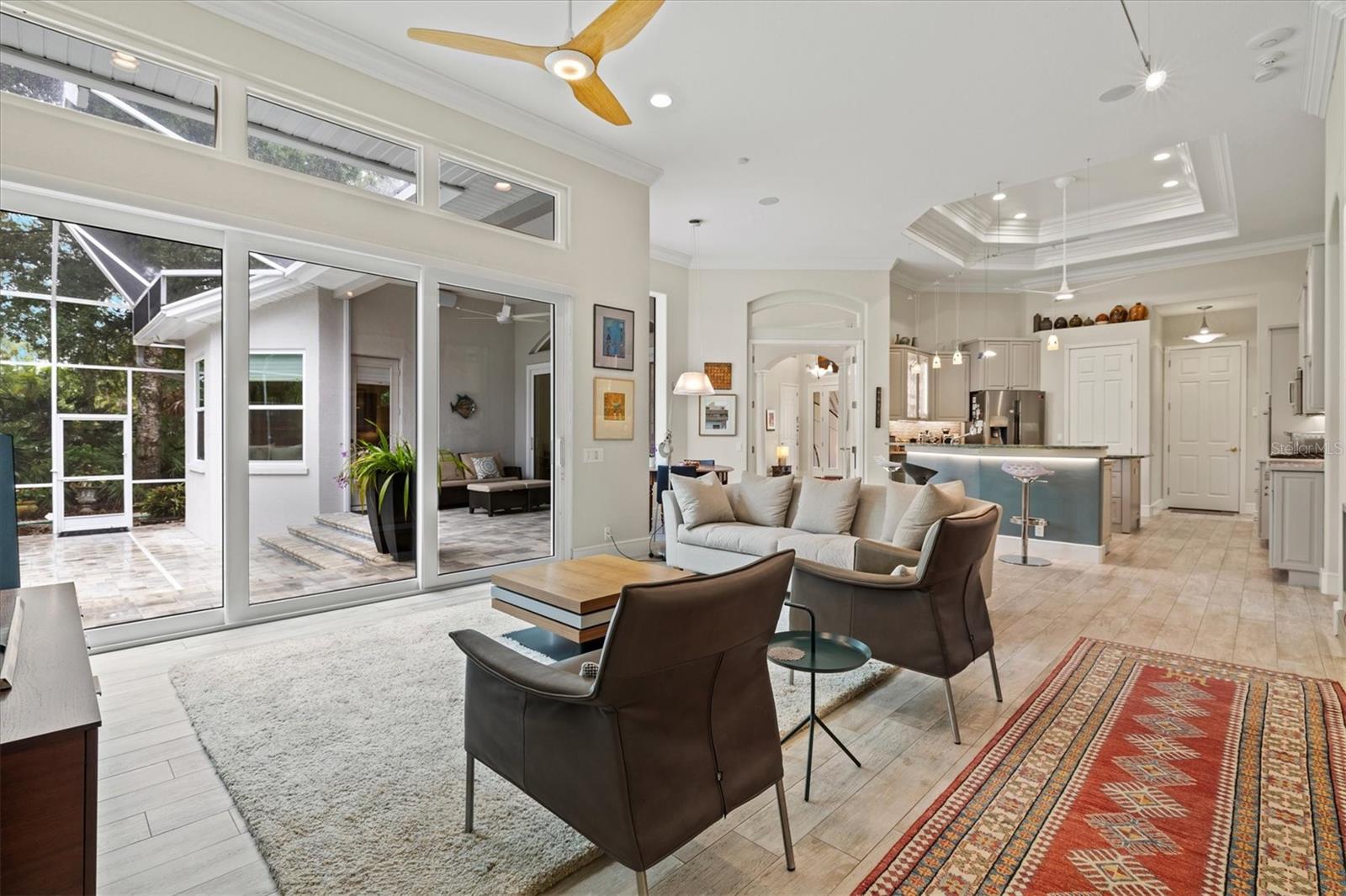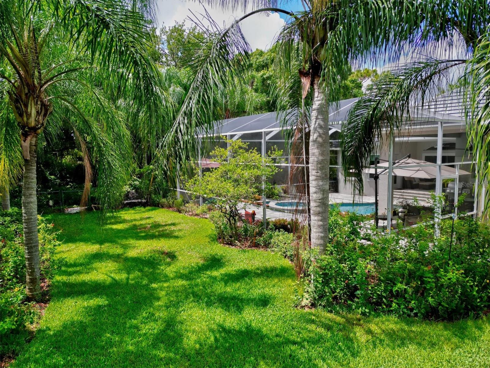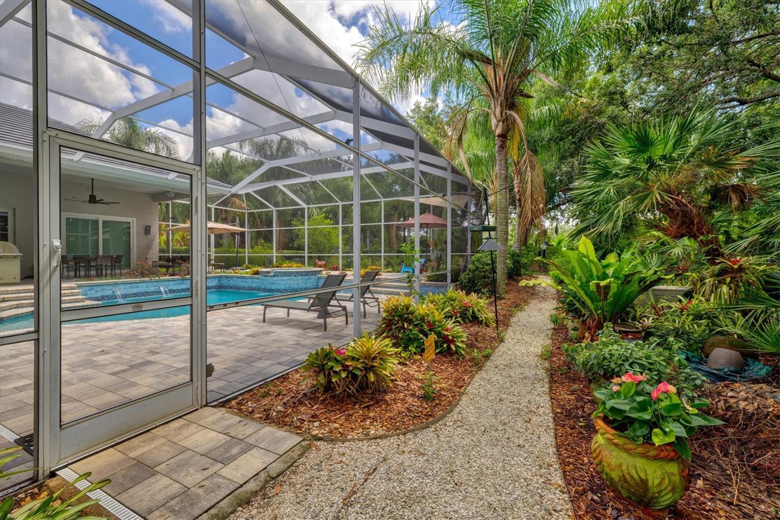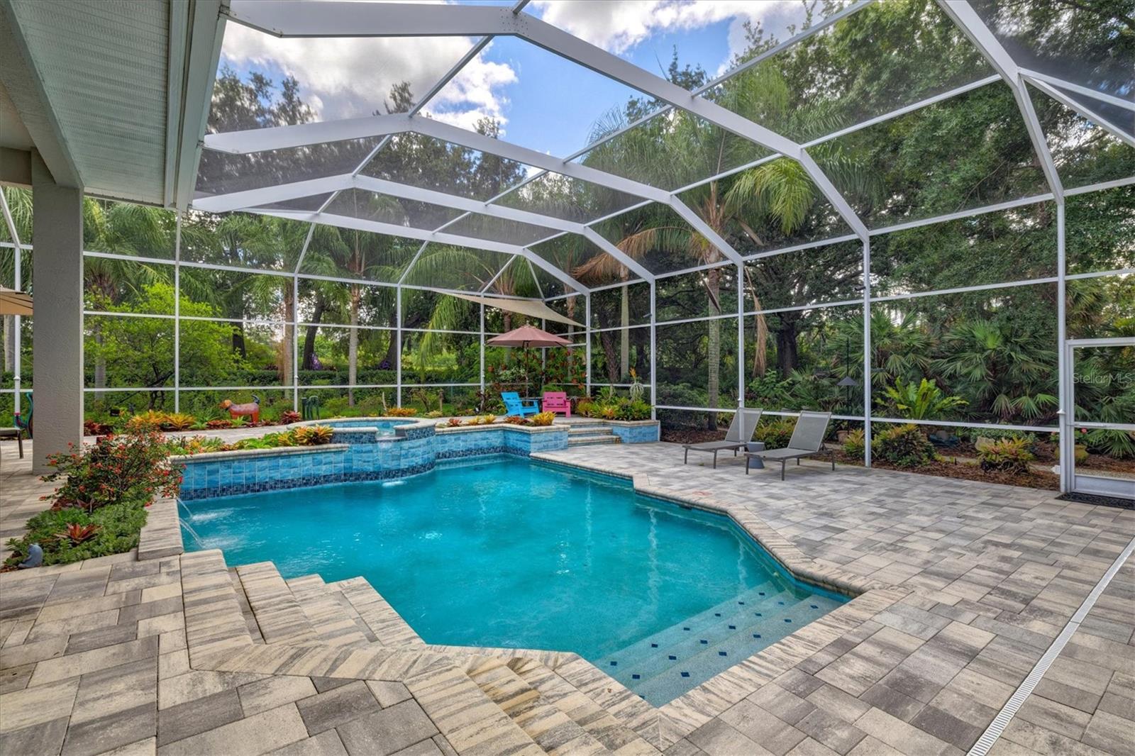 Welcome to your dream home, a stunning Pat Neal residence that offers an exceptional lifestyle in the sought-after University Park Country Club community. This exquisite 4-bedroom, 3-bath home is perfect for the discerning collector of art and memorabilia, with thoughtfully designed spaces that combine elegance and functionality. As you step through the beautifully etched glass front door, you're greeted by an impressive living room and dining room combination. High ceilings, intricate crown molding, and lighted built-ins showcase the refined details of this home. A triple sliding glass door opens to the inviting pool and lanai, seamlessly blending indoor and outdoor living. The split floor plan ensures privacy and tranquility in the primary suite, which features a spacious windowed sitting area, perfect for relaxation or enjoying a good book. Admire your collections on the gallery wall, and benefit from two large walk-in closets offering ample storage. The luxurious primary bathroom boasts double sinks, a soaking tub, and a large zero-entry walk-in shower, creating a spa-like retreat. On the opposite side of the house, you'll find three additional bedrooms and two sleek, updated bathrooms, providing comfort and convenience for family or guests. The heart of the home is the large chef’s kitchen, complete with an island featuring storage and a raised bar, an eat-in dining area, and stunning aquarium windows. The kitchen flows into the family room, where triple glass sliders lead to the expansive lanai. The outdoor space is truly exceptional. The large pavered lanai offers various seating areas, an outdoor kitchen with a refrigerator, grill, and side burners, all overlooking the beautifully resurfaced and tiled heated salt-water pool and hot tub. The yard is fenced with an almost-invisible green chain-link fence adorned with lush plantings, ensuring privacy. The entire yard and lanai are landscaped with Florida native flowering plants, shrubs, and large trees, creating a serene oasis and a haven for birds, butterflies and pollinators. A charming fountain graces the front entrance, adding to the home's curb appeal. This home features numerous upgrades, including a new tile roof installed in 2023. Crown molding, tray ceilings, designer ceiling fans, custom built-ins, Hunter Douglas window treatments, home theater/surround sound system, ample storage, and LED lighting are found throughout. Additionally, the home is equipped with hurricane impact-resistant windows, doors, and shutters for your peace of mind. Don't miss this opportunity to own this showcase of design and craftsmanship with modern upgrades in a prime location. Schedule your private showing today and experience the luxurious lifestyle this home has to offer.