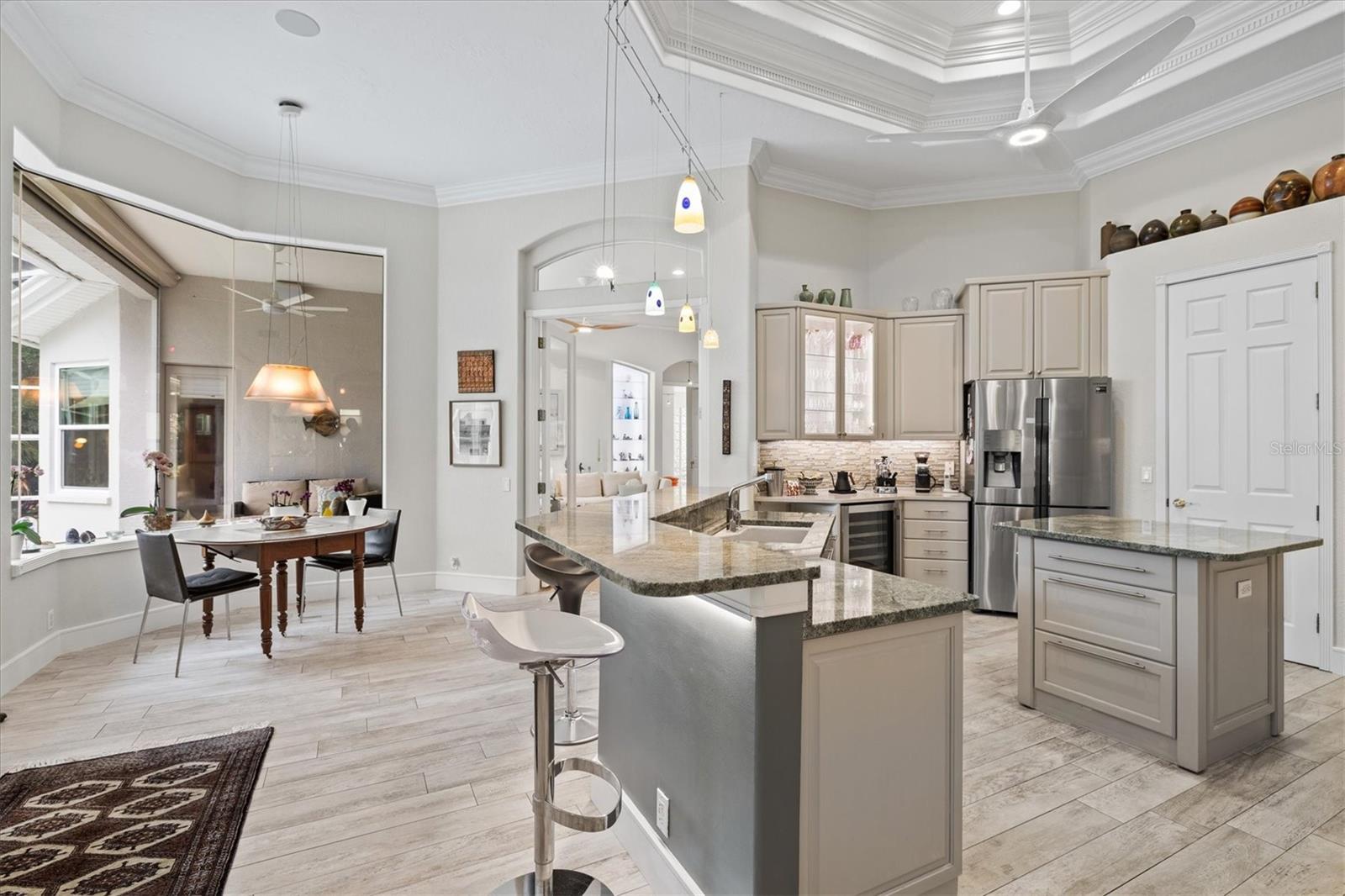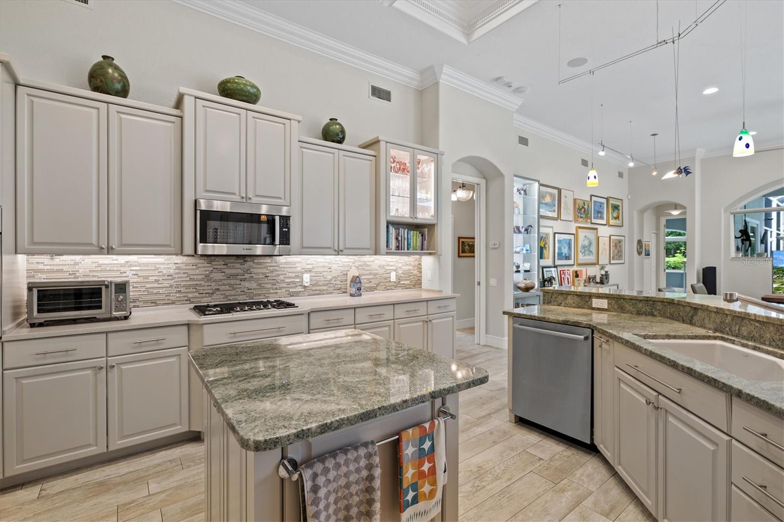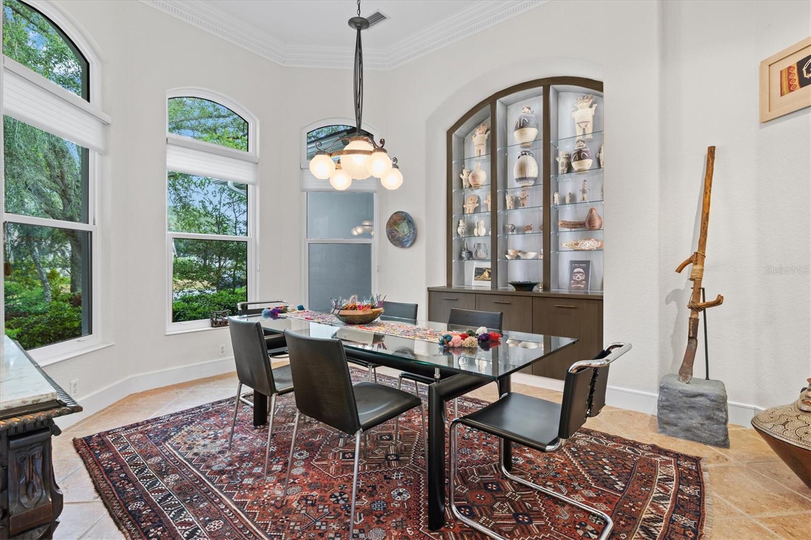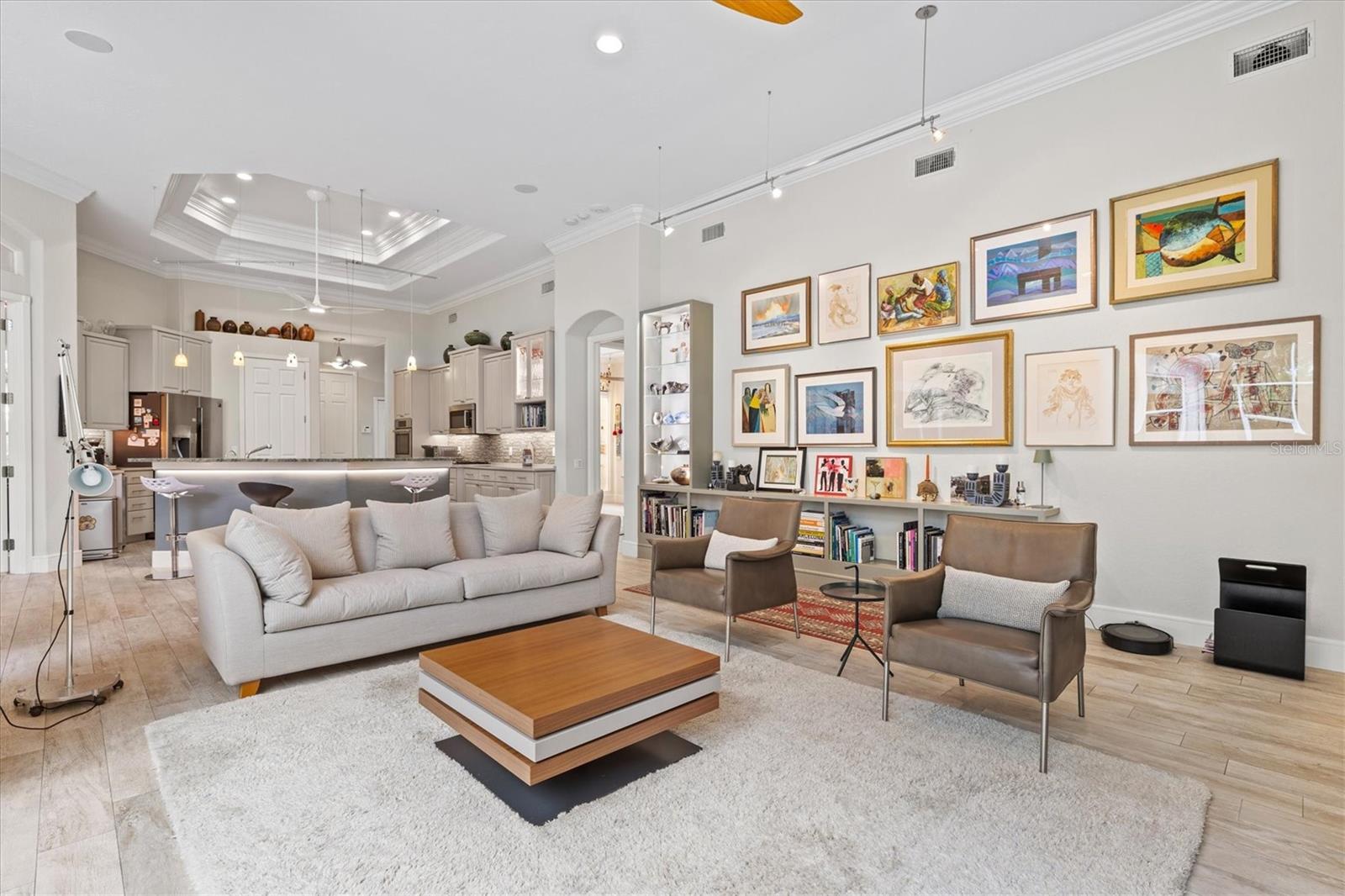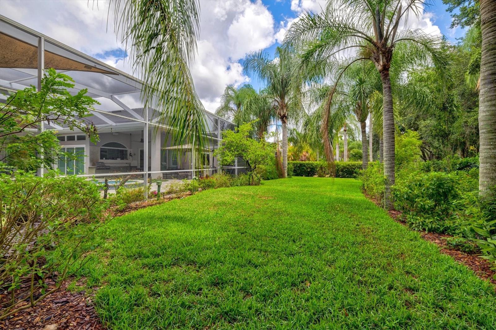 Welcome to your dream home, a stunning Pat Neal residence that offers an exceptional lifestyle in the sought-after University Park Country Club community. This exquisite 4-bedroom, 3-bath home is perfect for the discerning collector of art and memorabilia, with thoughtfully designed spaces that combine elegance and functionality. As you step through the beautifully etched glass front door, you're greeted by an impressive living room and dining room combination. High ceilings, intricate crown molding, and lighted built-ins showcase the refined details of this home. A triple sliding glass door opens to the inviting pool and lanai, seamlessly blending indoor and outdoor living. The split floor plan ensures privacy and tranquility in the primary suite, which features a spacious windowed sitting area, perfect for relaxation or enjoying a good book. Admire your collections on the gallery wall, and benefit from two large walk-in closets offering ample storage. The luxurious primary bathroom boasts double sinks, a soaking tub, and a large zero-entry walk-in shower, creating a spa-like retreat. On the opposite side of the house, you'll find three additional bedrooms and two sleek, updated bathrooms, providing comfort and convenience for family or guests. The heart of the home is the large chef’s kitchen, complete with an island featuring storage and a raised bar, an eat-in dining area, and stunning aquarium windows. The kitchen flows into the family room, where triple glass sliders lead to the expansive lanai. The outdoor space is truly exceptional. The large pavered lanai offers various seating areas, an outdoor kitchen with a refrigerator, grill, and side burners, all overlooking the beautifully resurfaced and tiled heated salt-water pool and hot tub. The yard is fenced with an almost-invisible green chain-link fence adorned with lush plantings, ensuring privacy. The entire yard and lanai are landscaped with Florida native flowering plants, shrubs, and large trees, creating a serene oasis and a haven for birds, butterflies and pollinators. A charming fountain graces the front entrance, adding to the home's curb appeal. This home features numerous upgrades, including a new tile roof installed in 2023. Crown molding, tray ceilings, designer ceiling fans, custom built-ins, Hunter Douglas window treatments, home theater/surround sound system, ample storage, and LED lighting are found throughout. Additionally, the home is equipped with hurricane impact-resistant windows, doors, and shutters for your peace of mind. Don't miss this opportunity to own this showcase of design and craftsmanship with modern upgrades in a prime location. Schedule your private showing today and experience the luxurious lifestyle this home has to offer.
