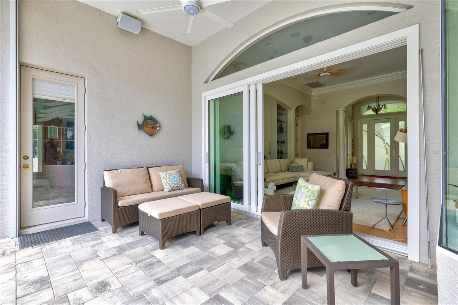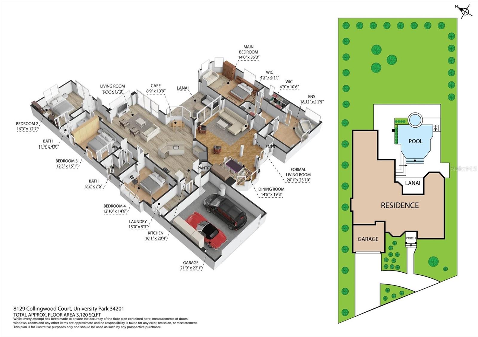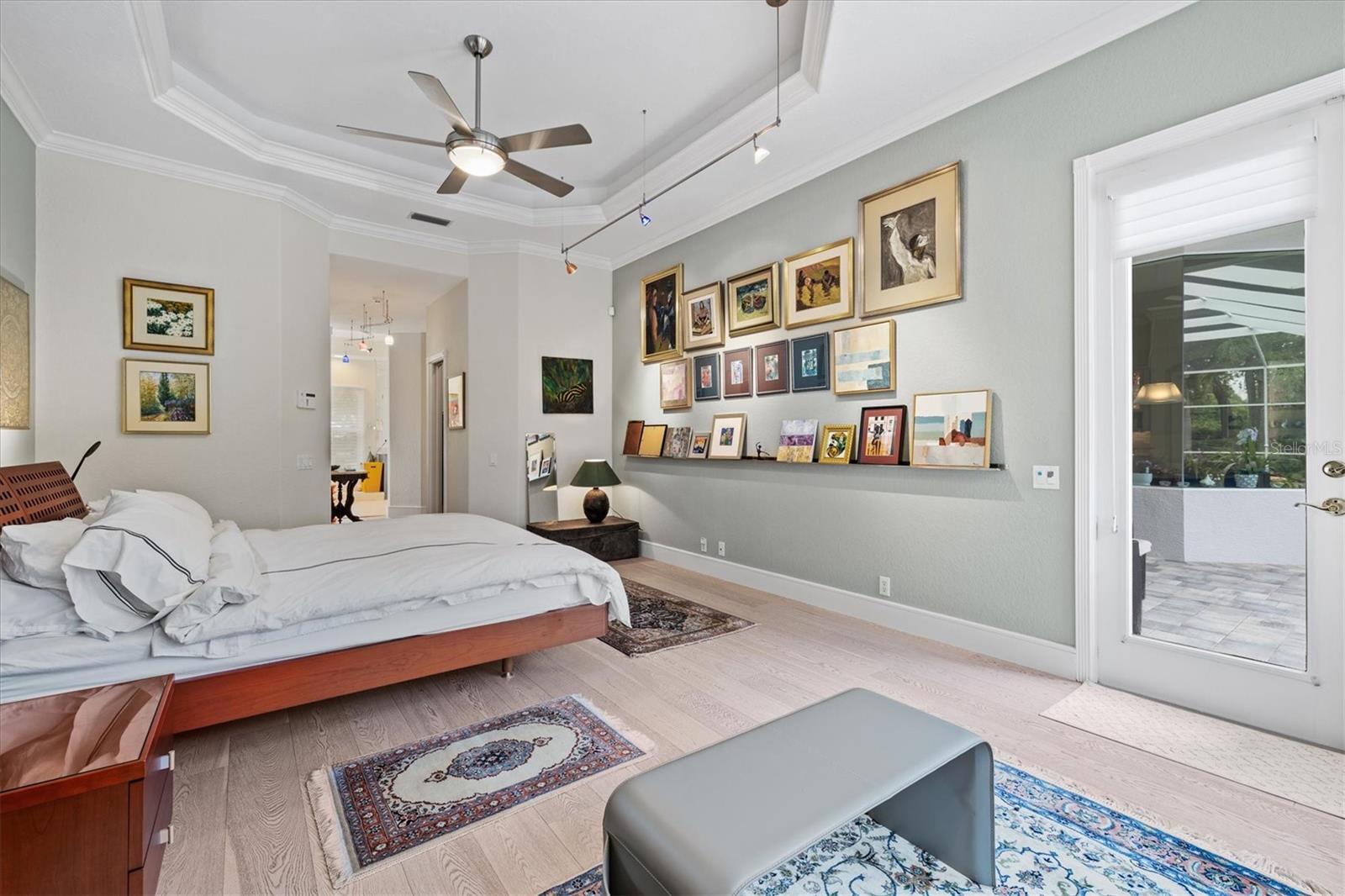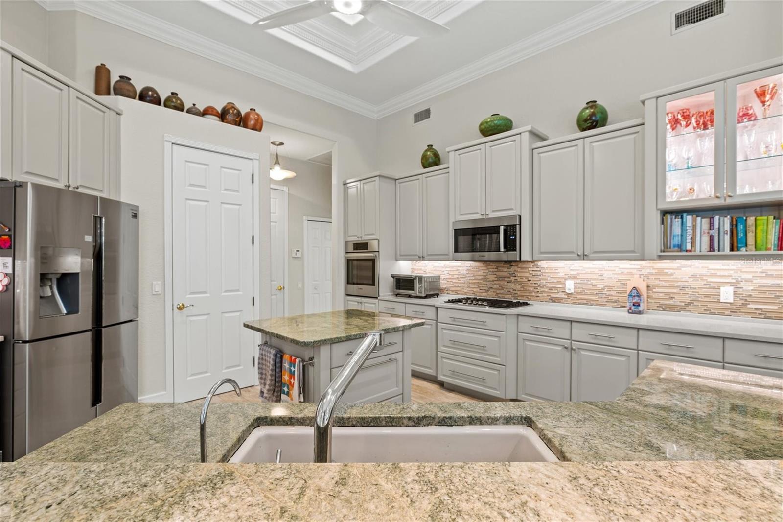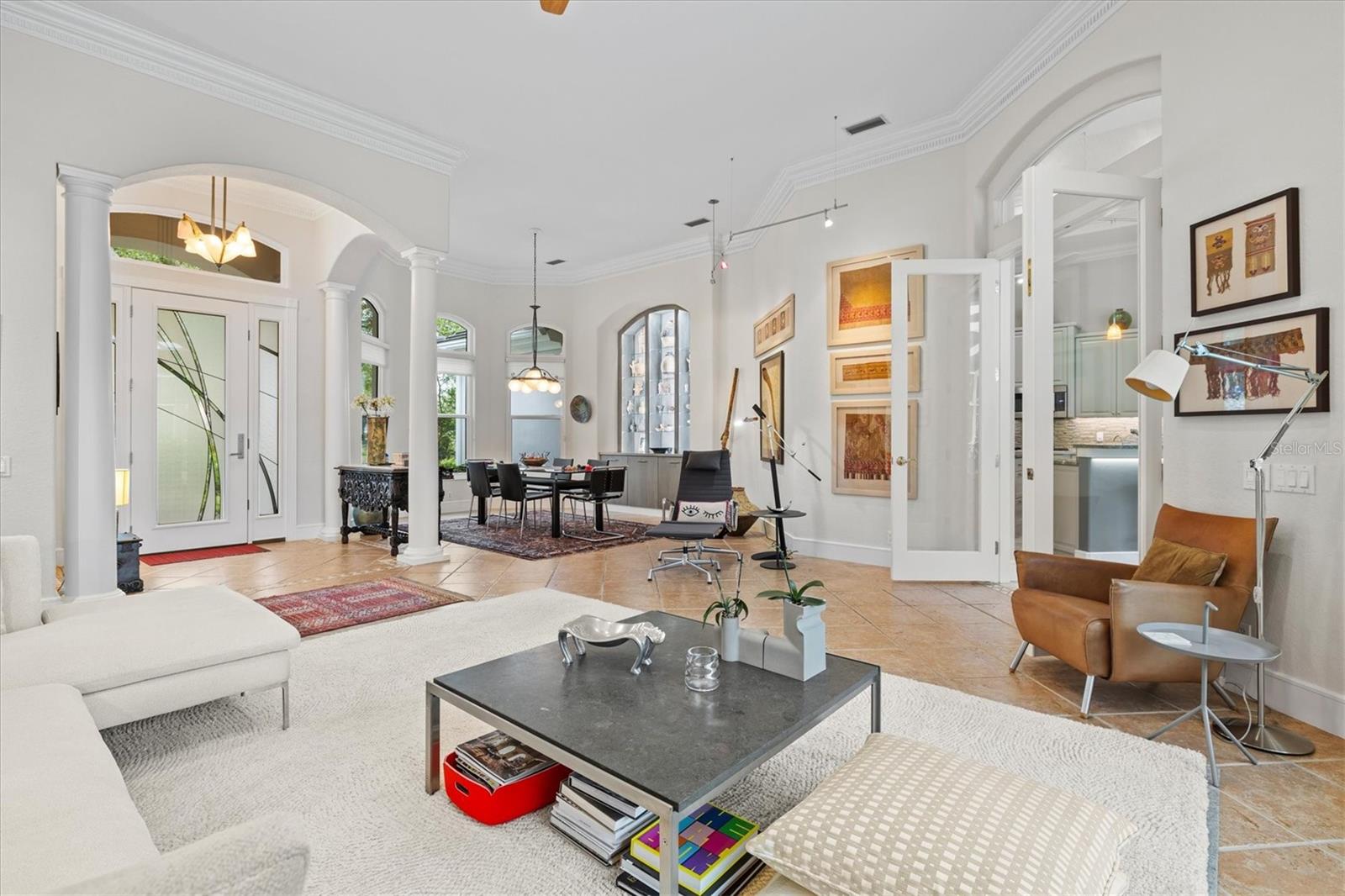 Welcome to your dream home, a stunning Pat Neal residence that offers an exceptional lifestyle in the sought-after University Park Country Club community. This exquisite 4-bedroom, 3-bath home is perfect for the discerning collector of art and memorabilia, with thoughtfully designed spaces that combine elegance and functionality. As you step through the beautifully etched glass front door, you're greeted by an impressive living room and dining room combination. High ceilings, intricate crown molding, and lighted built-ins showcase the refined details of this home. A triple sliding glass door opens to the inviting pool and lanai, seamlessly blending indoor and outdoor living. The split floor plan ensures privacy and tranquility in the primary suite, which features a spacious windowed sitting area, perfect for relaxation or enjoying a good book. Admire your collections on the gallery wall, and benefit from two large walk-in closets offering ample storage. The luxurious primary bathroom boasts double sinks, a soaking tub, and a large zero-entry walk-in shower, creating a spa-like retreat. On the opposite side of the house, you'll find three additional bedrooms and two sleek, updated bathrooms, providing comfort and convenience for family or guests. The heart of the home is the large chef’s kitchen, complete with an island featuring storage and a raised bar, an eat-in dining area, and stunning aquarium windows. The kitchen flows into the family room, where triple glass sliders lead to the expansive lanai. The outdoor space is truly exceptional. The large pavered lanai offers various seating areas, an outdoor kitchen with a refrigerator, grill, and side burners, all overlooking the beautifully resurfaced and tiled heated salt-water pool and hot tub. The yard is fenced with an almost-invisible green chain-link fence adorned with lush plantings, ensuring privacy. The entire yard and lanai are landscaped with Florida native flowering plants, shrubs, and large trees, creating a serene oasis and a haven for birds, butterflies and pollinators. A charming fountain graces the front entrance, adding to the home's curb appeal. This home features numerous upgrades, including a new tile roof installed in 2023. Crown molding, tray ceilings, designer ceiling fans, custom built-ins, Hunter Douglas window treatments, home theater/surround sound system, ample storage, and LED lighting are found throughout. Additionally, the home is equipped with hurricane impact-resistant windows, doors, and shutters for your peace of mind. Don't miss this opportunity to own this showcase of design and craftsmanship with modern upgrades in a prime location. Schedule your private showing today and experience the luxurious lifestyle this home has to offer.