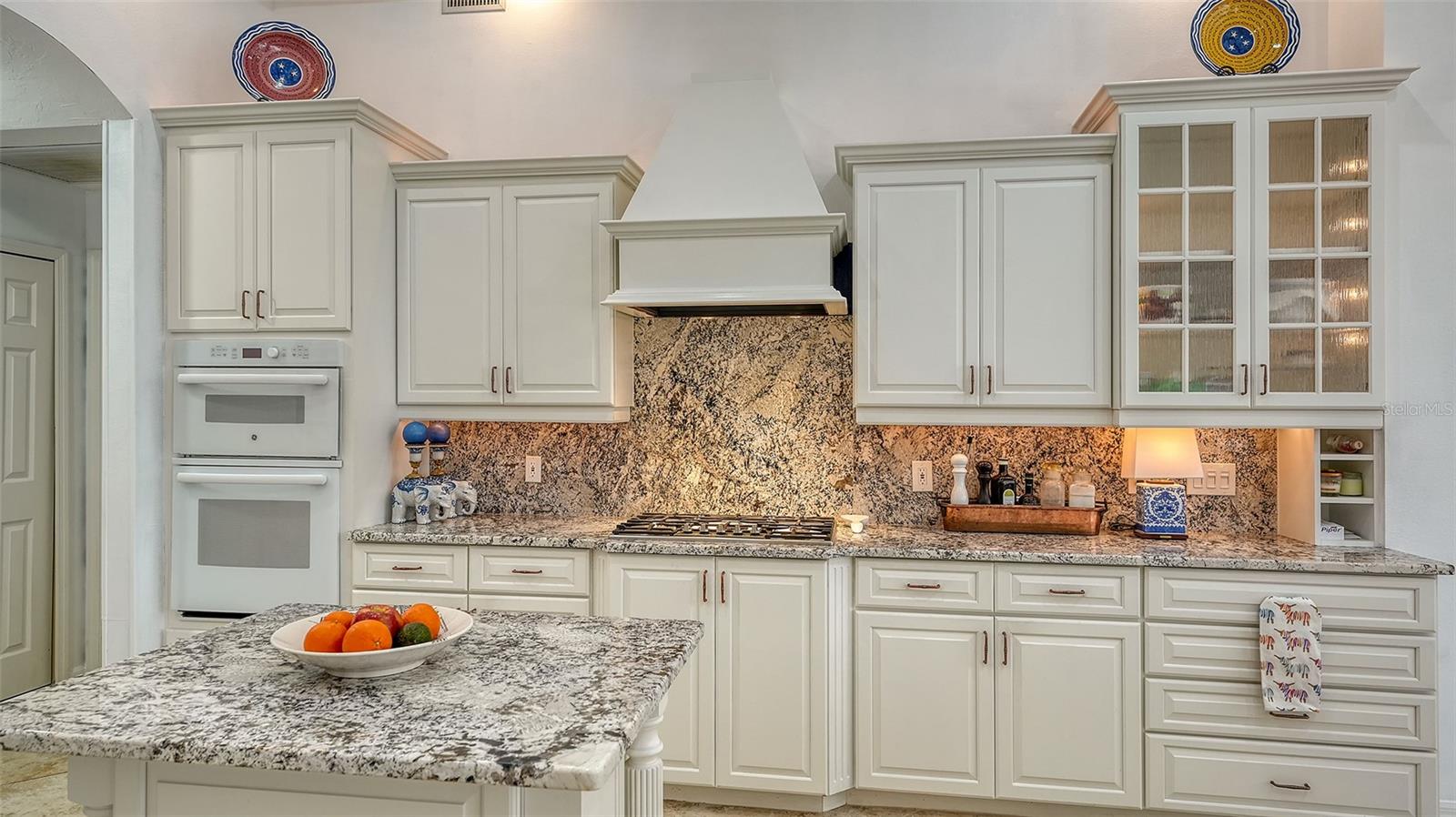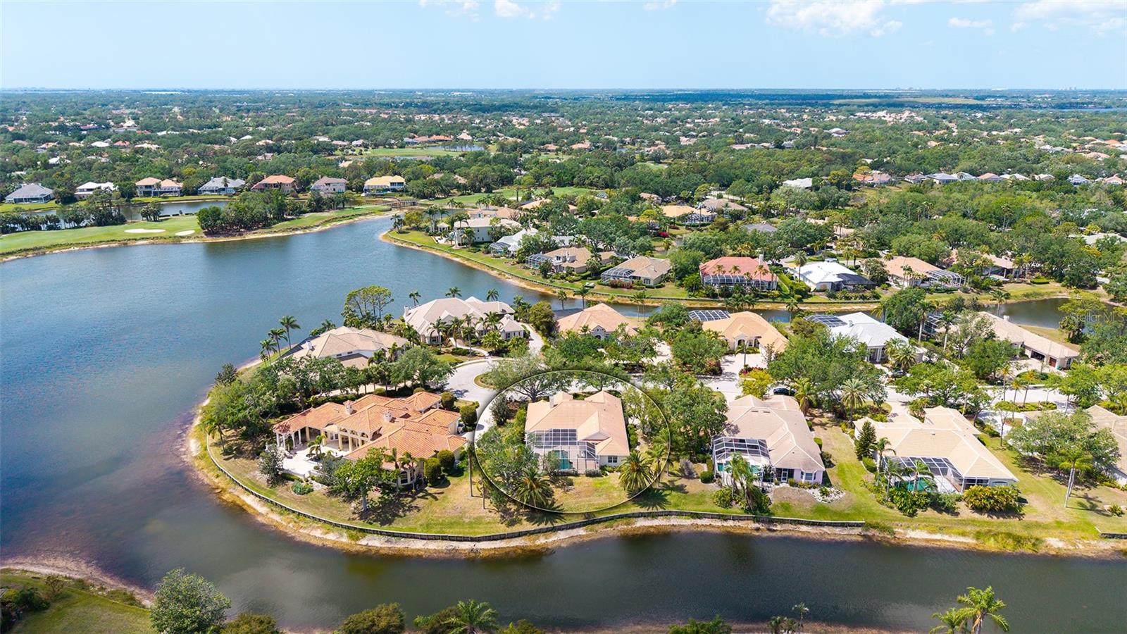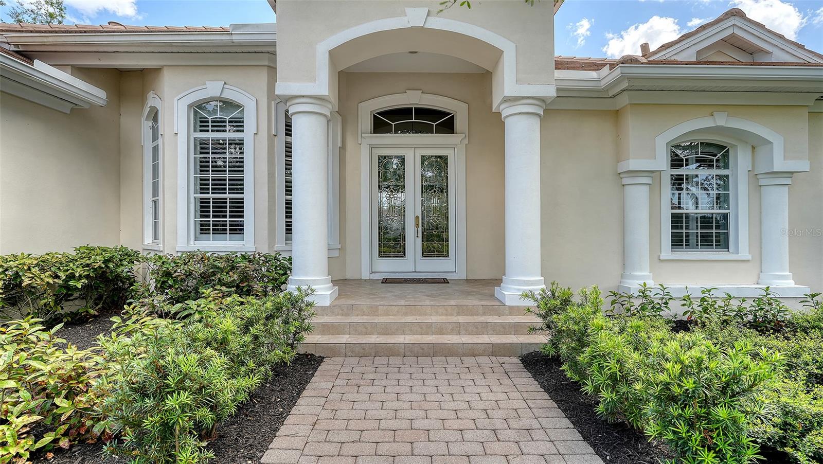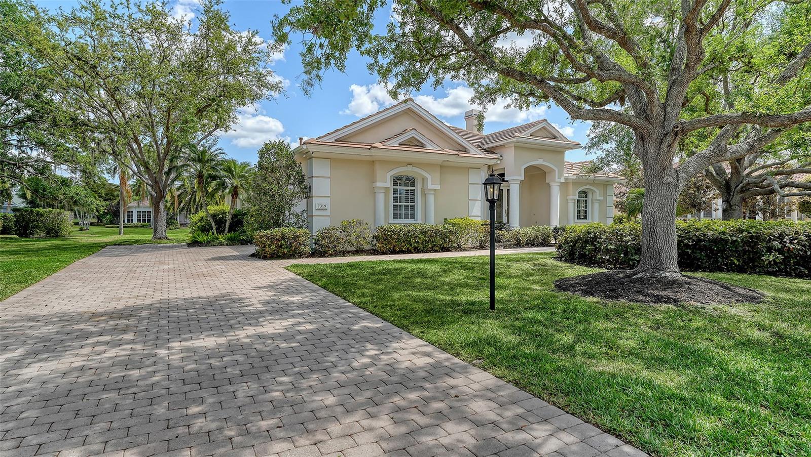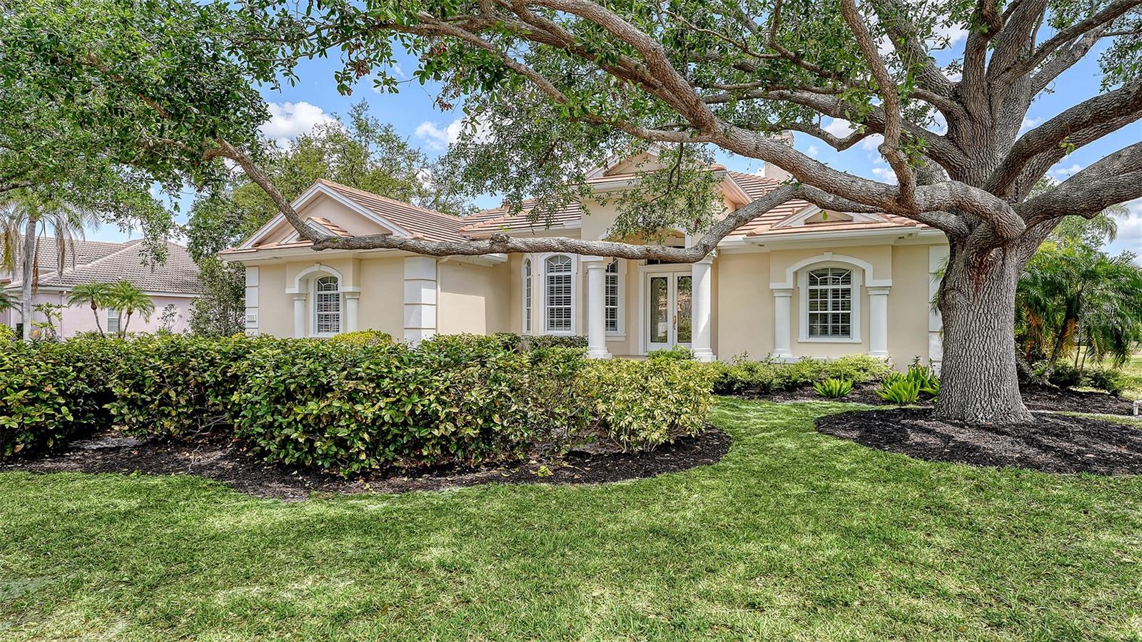 Hyde Park, an enclave of only 12 homes inside the gates of University Park Country Club where home sizes vary from 3,000-5,600 sq ft. PRICED BELOW RECENT 2025 APPRAISAL. Beautiful details inside and out. This home sits on a serene HALF-ACRE and on the water. Slow down and enjoy the drive and lush landscaping throughout the community and arrive in this scenic and charming neighborhood. This home is graced with a beautiful entry of leaded glass doors and custom details throughout. A classic floorplan with an open family room/kitchen that has been updated with timeless finishes. Side entry garage, paver driveway and paved walkway to the entry. (TILE ROOF REPLACED: 2015). Foyer opens to the living and dining room and this home is saturated in natural light with tall windows and sliding glass doors to the pool area. Flooring is 18” diagonal tile; soaring ceilings and crown moldings. A feature that sets this welcoming home apart is a floor-to-ceiling striking wall of bookcases enhanced by accent lighting. Fully equipped and well-appointed kitchen; a wet bar and a walk-in pantry. A charming breakfast nook overlooks the pool with an aquarium glass window. Split bedroom plan includes a spacious primary suite with two custom closets, a stunning renovated bathroom with dual granite vanities, walk-in shower, marble flooring, and a private water closet. Two additional bedrooms plus a versatile fourth bedroom with direct pool access can serve as an office, study or additional living space. The backyard and pool area features an expansive paver lanai, two covered seating areas and room for an outdoor kitchen (natural gas hook-up). The pool overlooks the water and the natural beauty surrounding this home is simply relaxing. Residents of University Park Country Club have access to 27 holes of championship golf, tennis and pickleball courts, state-of-the-art fitness center, walking trails, and a wide variety of social activities, all within a secure, gated community. Located just minutes from downtown Sarasota, UTC Mall, world-class shopping, dining, beaches, and SRQ International Airport, this home offers the ultimate lifestyle in one of Sarasota's most desirable communities.