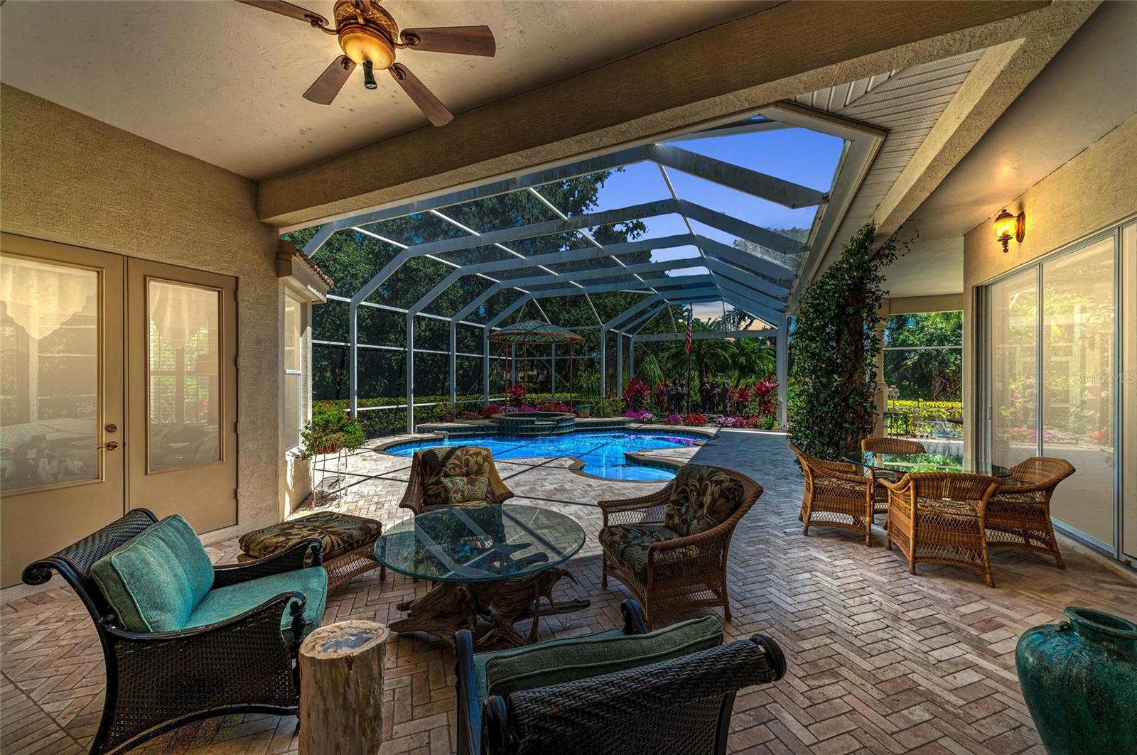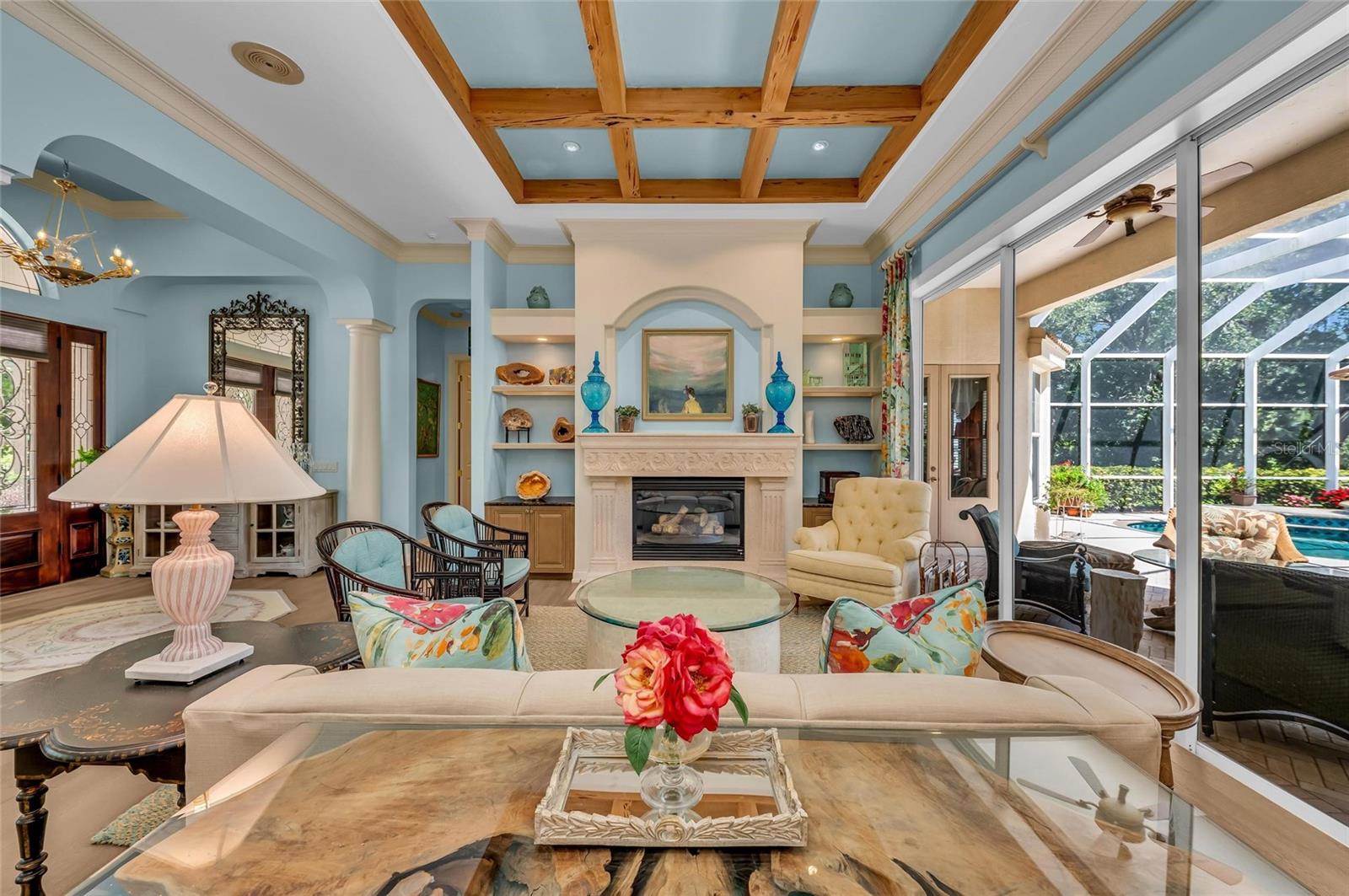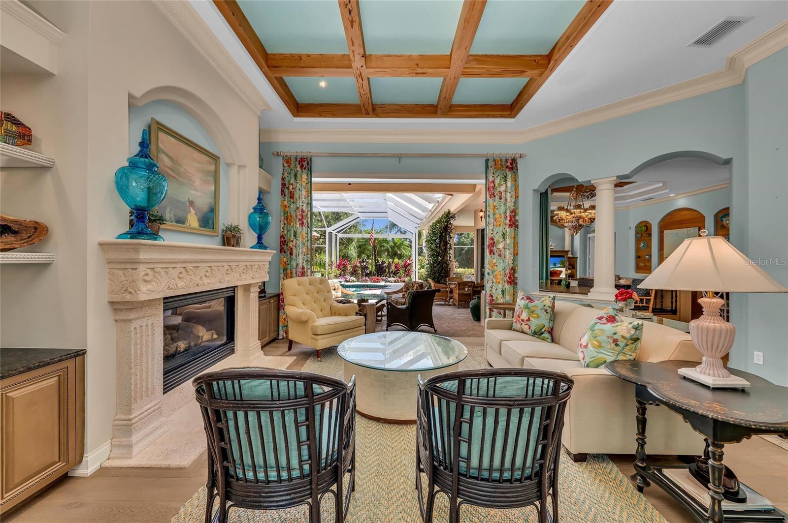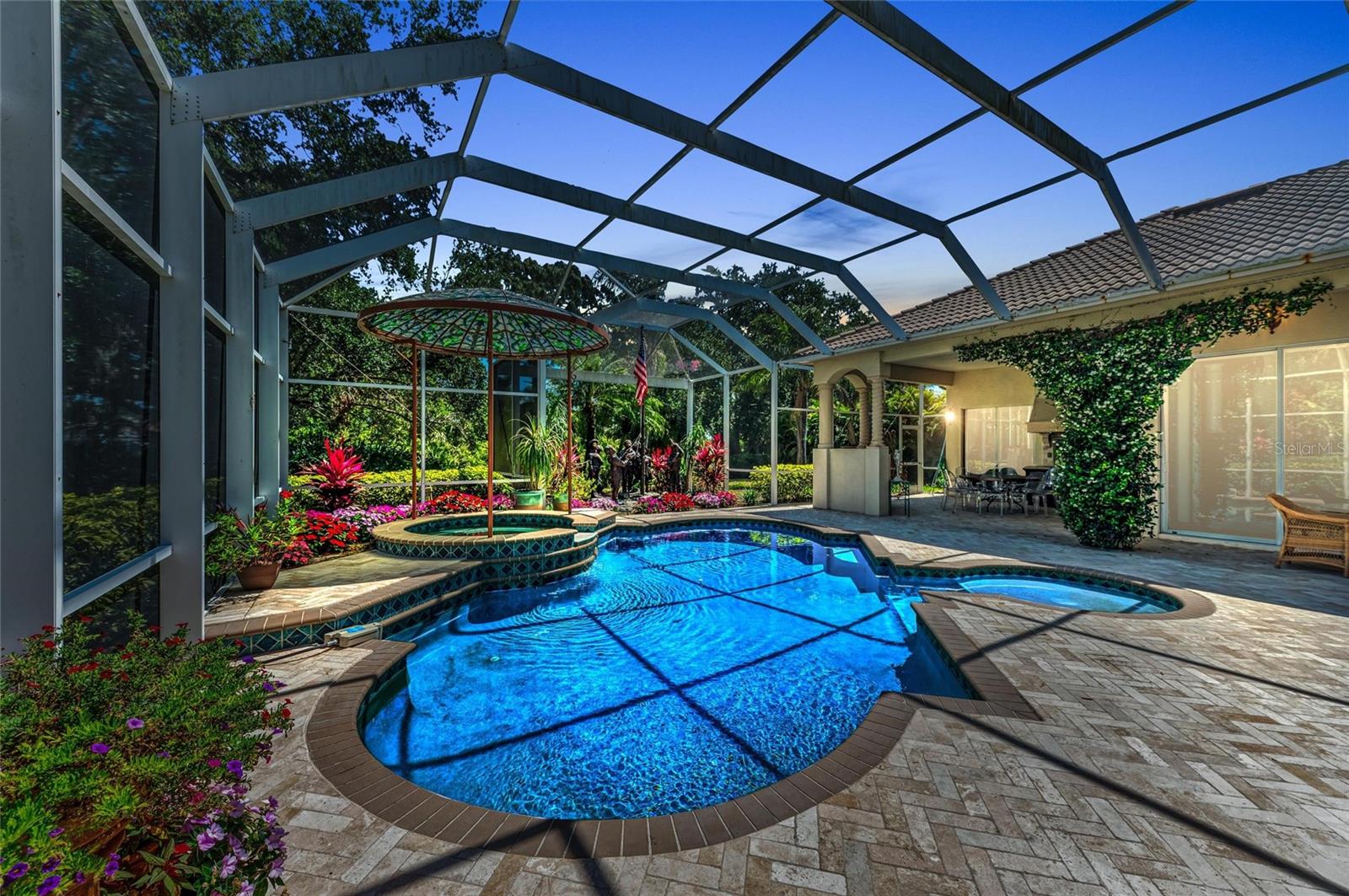 Experience the pinnacle of refined Florida living in this exquisite residence in University Park Country Club. Poised on an expansive corner lot embraced by majestic oak and jacaranda trees, this home is a masterpiece in elegance and sophistication. Every detail has been meticulously curated, from the bespoke wood-paneled ceilings and handcrafted stone fireplaces to the rich built-in cabinetry that elevates every space. The chef’s kitchen is a work of art, featuring a professional-grade six-burner gas cooktop, sleek stainless steel appliances and stunning custom-designed counters. An adjacent bar area with a built-in wine refrigerator adds a touch of indulgence, ideal for entertaining in style. Each generously sized bedroom offers a private en-suite bath and impressive closet space, ensuring comfort and privacy throughout. A grand bonus room with its balcony provides flexibility to serve as a fifth bedroom, game room or executive office. Go outside to your private resort, complete with a sparkling pool and spa, a cozy outdoor fireplace and a full gourmet summer kitchen. The property also features fully owned solar panels, dramatically reducing energy costs without compromising on luxury. Residents of University Park Country Club enjoy access to world-class amenities including championship golf and tennis facilities, state-of-the-art fitness centers, swimming pools and fine dining. Ideally minutes from the UTC Mall, award-winning beaches, upscale dining and premier medical facilities in Lakewood Ranch, Bradenton and Sarasota. This extraordinary home must be seen to be fully appreciated.