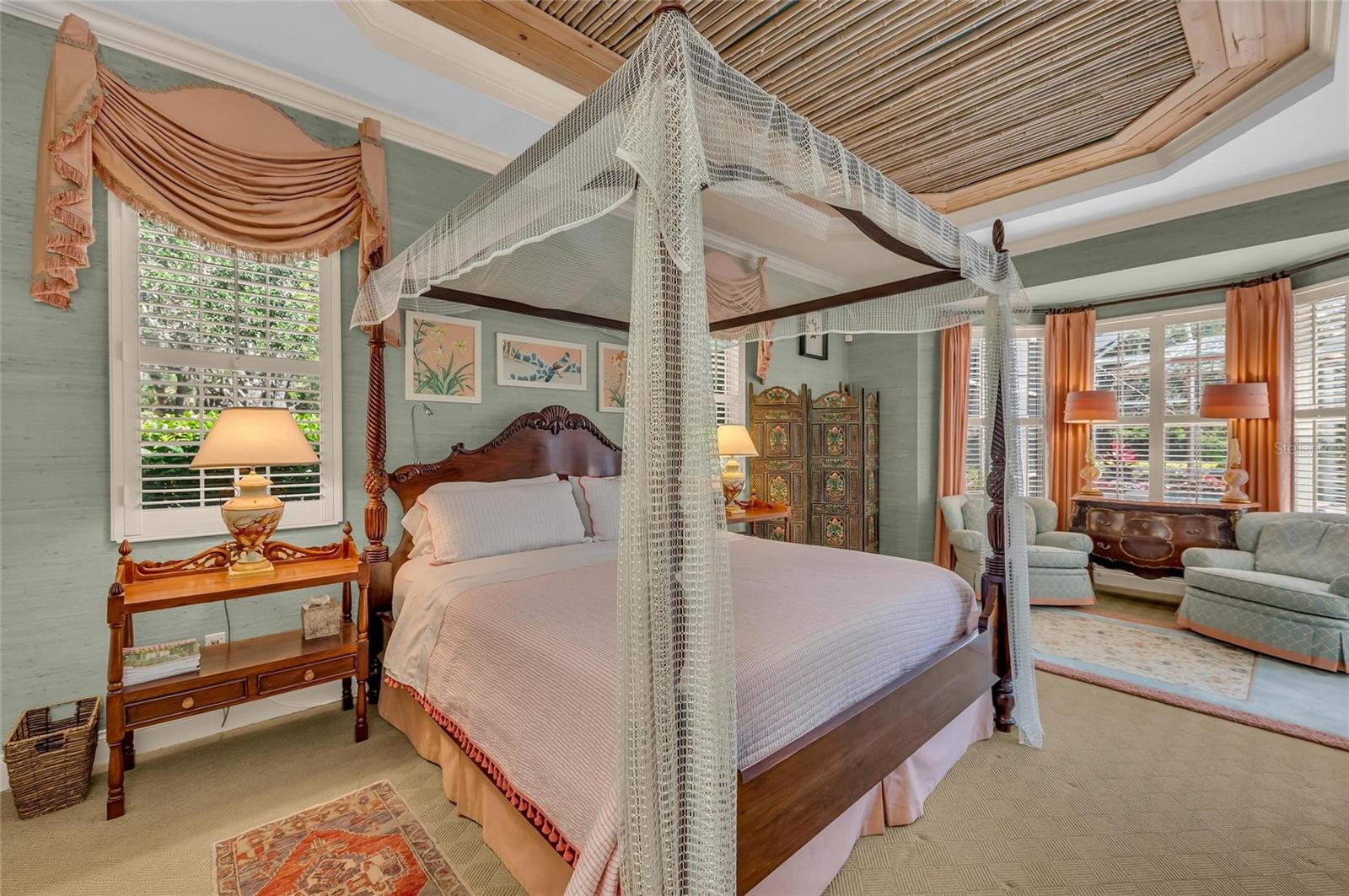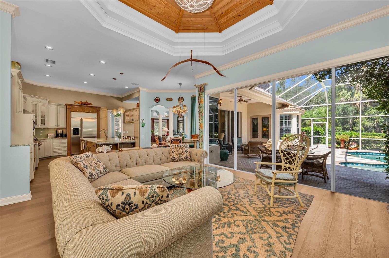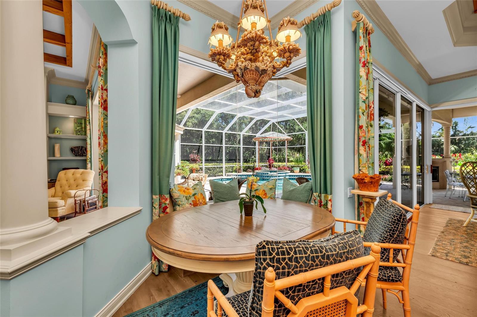 Experience the pinnacle of refined Florida living in this exquisite residence in University Park Country Club. Poised on an expansive corner lot embraced by majestic oak and jacaranda trees, this home is a masterpiece in elegance and sophistication. Every detail has been meticulously curated, from the bespoke wood-paneled ceilings and handcrafted stone fireplaces to the rich built-in cabinetry that elevates every space. The chef’s kitchen is a work of art, featuring a professional-grade six-burner gas cooktop, sleek stainless steel appliances and stunning custom-designed counters. An adjacent bar area with a built-in wine refrigerator adds a touch of indulgence, ideal for entertaining in style. Each generously sized bedroom offers a private en-suite bath and impressive closet space, ensuring comfort and privacy throughout. A grand bonus room with its balcony provides flexibility to serve as a fifth bedroom, game room or executive office. Go outside to your private resort, complete with a sparkling pool and spa, a cozy outdoor fireplace and a full gourmet summer kitchen. The property also features fully owned solar panels, dramatically reducing energy costs without compromising on luxury. Residents of University Park Country Club enjoy access to world-class amenities including championship golf and tennis facilities, state-of-the-art fitness centers, swimming pools and fine dining. Ideally minutes from the UTC Mall, award-winning beaches, upscale dining and premier medical facilities in Lakewood Ranch, Bradenton and Sarasota. This extraordinary home must be seen to be fully appreciated.