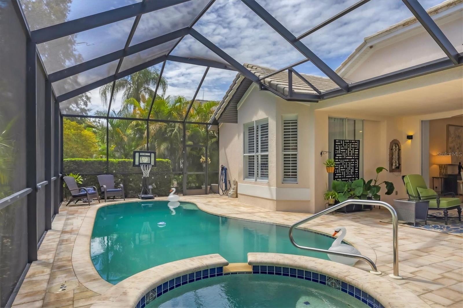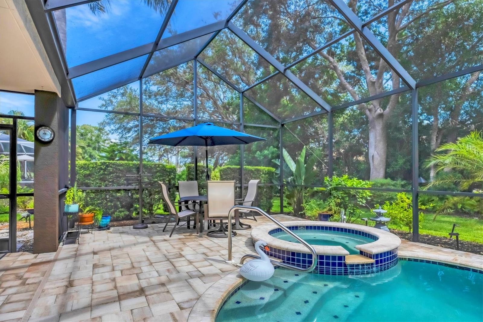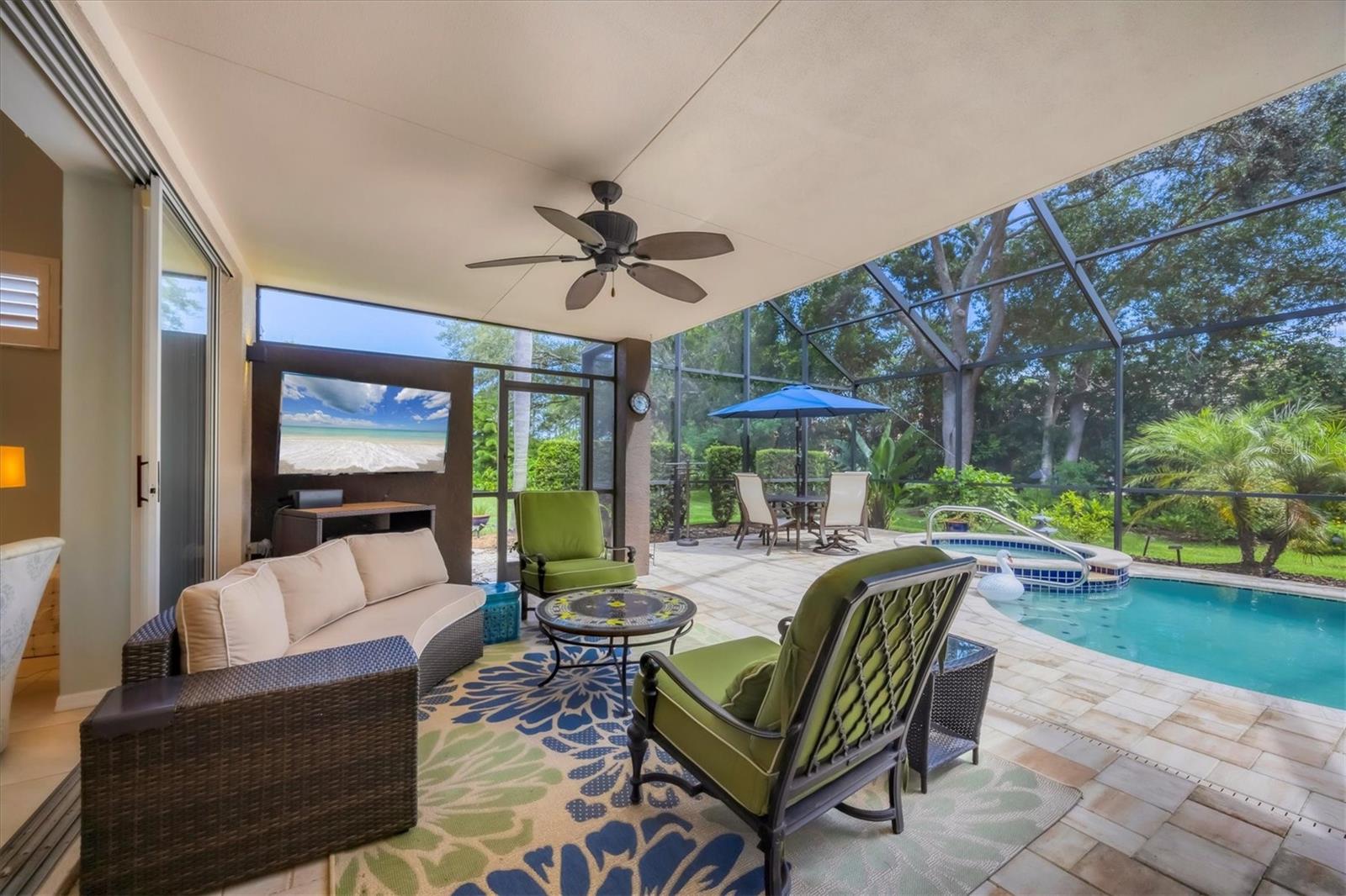 Welcome to this exquisite residence, perfectly nestled on a quiet cul-de-sac in the prestigious University Park. Designed for the buyer seeking a private, resort-style retreat, this home offers a seamless blend of sophistication, comfort, and maintenance-free living. This beautifully maintained home features an open-concept floor plan with a desirable split-bedroom layout that ensures privacy and spacious living. The grand open great room flows effortlessly onto the expansive screened lanai, creating an ideal space for both entertaining and peaceful outdoor relaxation. Step outside to your private caged, heated pool and spa, beautifully finished with Pebble Tec, offering a serene, resort-inspired experience. The outdoor retreat provides ample space for lounging, dining, and enjoying the Florida lifestyle. The chef’s kitchen is thoughtfully designed with granite countertops, under-cabinet LED lighting, and a bright breakfast nook surrounded by garden views. Recent updates include a new stove, refrigerator, and dishwasher, combining style and modern convenience. The owner’s suite is a true sanctuary, featuring oak flooring, a large custom walk-in closet, and a fully renovated bath with a new soaking tub, glass-enclosed shower, dual vanities, and tasteful designer finishes. The second bedroom, accented by French doors, is currently used as a light-filled office with two generous closets, offering versatility for a variety of needs. The additional guest suites are equally welcoming, with a renovated bath that features modern vanities and soft under-cabinet lighting. A dedicated utility room with a built-in sink and an adjacent oversized storage area provides excellent functionality and organization. Surrounded by lush, maintenance-free landscaping, this home offers a truly effortless lifestyle. A short walk leads to the exclusive Hampton Green community pool, where residents can relax or socialize in a tranquil setting. This exceptional property offers a rare opportunity to enjoy timeless elegance, complete privacy, and a relaxed, resort-inspired lifestyle. Location: University Park Country Club With its mature landscape and sprawling natural beauty, University Park is the premier master-planned community in the Sarasota area. Behind the secured, staffed entrance is an award-winning, resident-owned community featuring 27 holes of four-star rated golf, eleven lighted Har-Tru tennis courts, four pickleball courts, a fitness center, croquet, miles of tree-lined streets for walking or biking, and first-class dining. The community also offers numerous social activities and clubs designed to fit a variety of interests. Located just four miles from downtown Sarasota and its vibrant arts scene, museums, shopping, dining, and first-class healthcare, University Park provides an oasis from the city while keeping all its amenities within easy reach. A short 15-minute drive to the international airport and a 30-minute drive to some of America’s finest beaches, superb outdoor recreation areas—including the internationally renowned Nathan Benderson Park—the famed Ringling Museum, various boating options, and the acclaimed St. Armands Circle. Less than five minutes away from UTC luxury shopping and dining, University Park’s breathtaking beauty is unmatched by any other, offering a rare opportunity to own a home in one of Sarasota’s most coveted communities