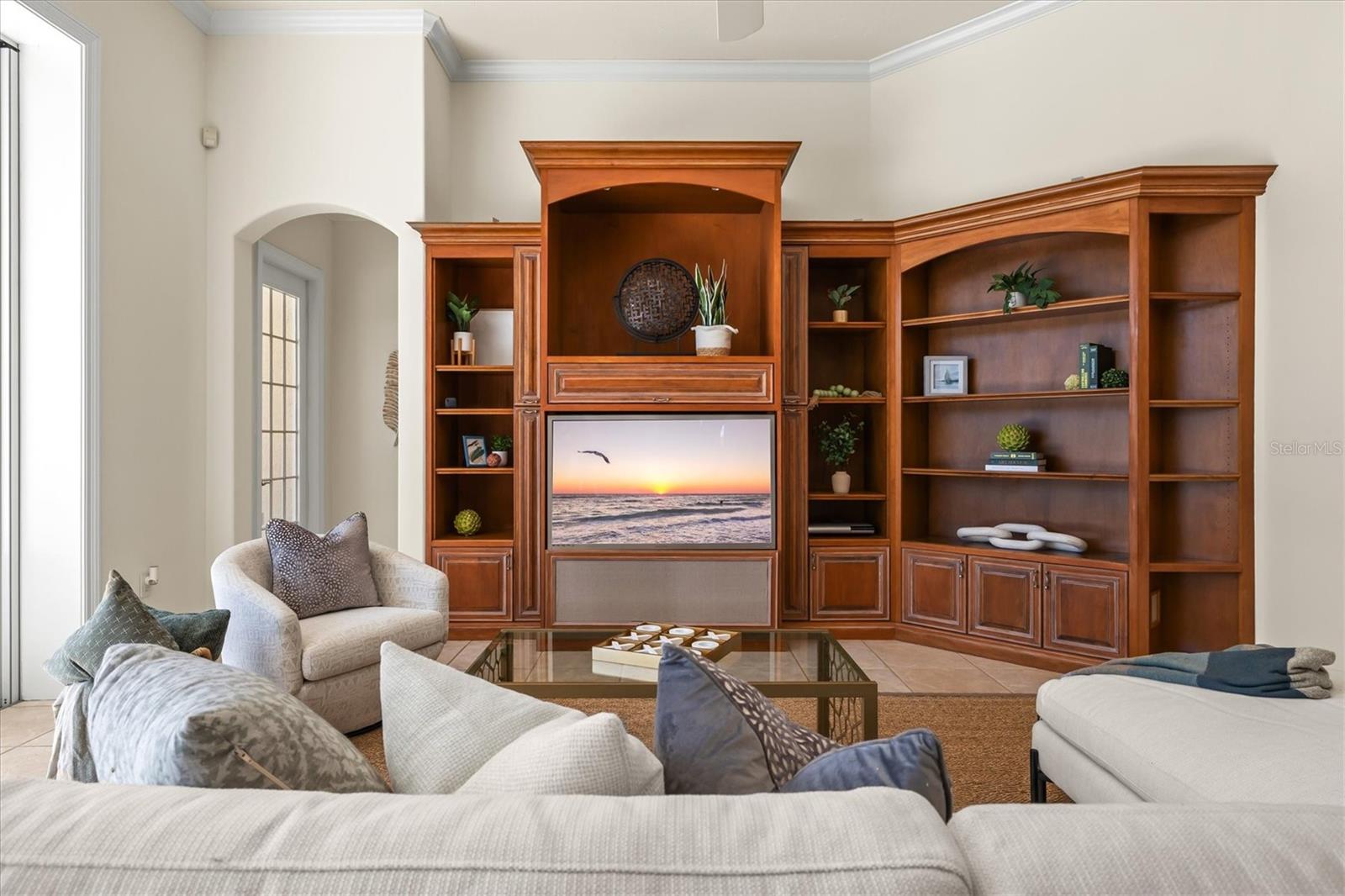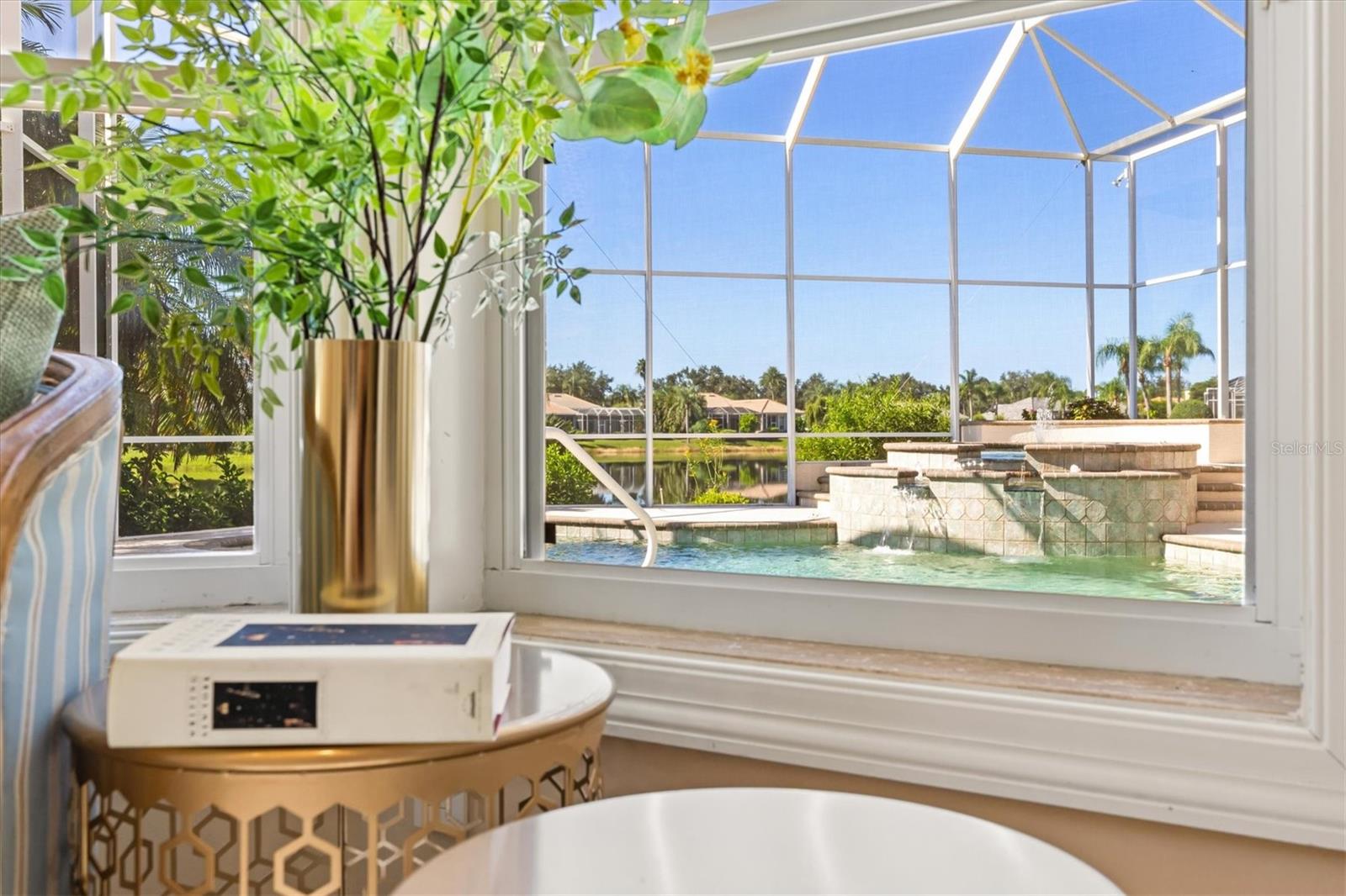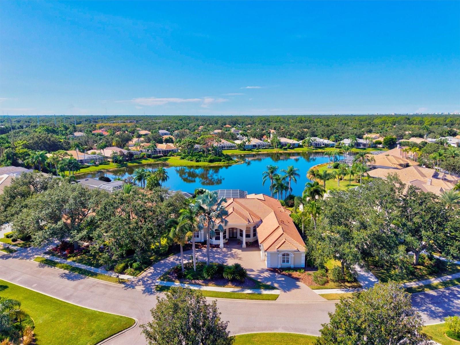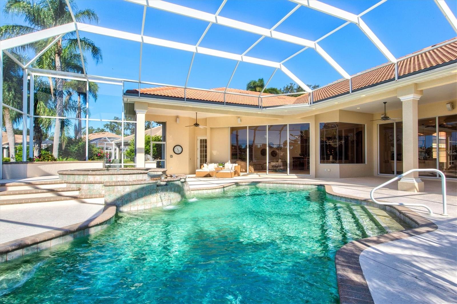 This meticulously maintained, custom-built Dan Najjar Sterling Manor home offers timeless elegance and exceptional craftsmanship in the sought-after Richmond Park neighborhood of award-winning University Park Country Club. With 3,732 square feet of living space on a .36-acre lot, this one-story, split-floorplan home features 3 bedrooms, 3 bathrooms, a study, and a 3-car garage. A circular driveway with landscape lighting welcomes you to the home, where the front entry provides a brilliant direct view of the sparkling pool and spa and serene pond beyond. Expansive living areas open seamlessly to the outdoors through three sets of sliding glass doors, leading to the screened lanai with a large pool featuring automatic popups, spa with gas heating, and a full outdoor kitchen complete with Corian counters, sink, and built-in gas grill. Inside, the home is richly appointed with granite and marble surfaces, trayed and beam ceilings, and custom details throughout. The chef’s kitchen is both functional and refined, offering a Sub-Zero refrigerator, Thermador gas range and double oven, Bosch extra-quiet dishwasher, walk-in hidden pantry with built-in safe, refrigerated wine cabinet, instant hot water tap, and center island. The family room showcases a striking custom wood built-in with shelving, TV display, and hidden storage, while the study impresses with handsome wood cabinetry, Bermuda shutters, and built-ins designed for both beauty and functionality. The luxurious primary suite features a custom walk-in closet with two entrances, abundant built-in shelving and storage, and a spa-like bathroom with dual vanities, dual showers, Jacuzzi tub, and elegant cabinetry. Two additional guest bedrooms and baths provide comfort and privacy for visitors. This home also offers significant updates and conveniences, including a NEW TILE ROOF (2024) with transferrable warranty, NEW TWO-ZONE CARRIER HVAC SYSTEM (2025), NEW Rheem 55-gallon GAS WATER HEATER with expansion bladder and circulation system (2024), three Bose surround sound systems, eight Casablanca fans with Inteli-Touch controls, recessed lighting, and four unique chandeliers. Blending elegance, comfort, and thoughtful design, this Sterling Manor home presents a rare opportunity to enjoy resort-style living in one of Sarasota’s premier communities. University Park Country Club is consistently ranked one of the top courses in Florida featuring 27 holes of championship golf; tennis and pickleball; fitness center, croquet – as well as an array of social and group activities. Just a short drive outside this peaceful enclave is downtown Sarasota, with shopping, arts & theatres, museums, dining and entertainment, top-ranked healthcare, beaches and SRQ International Airport.