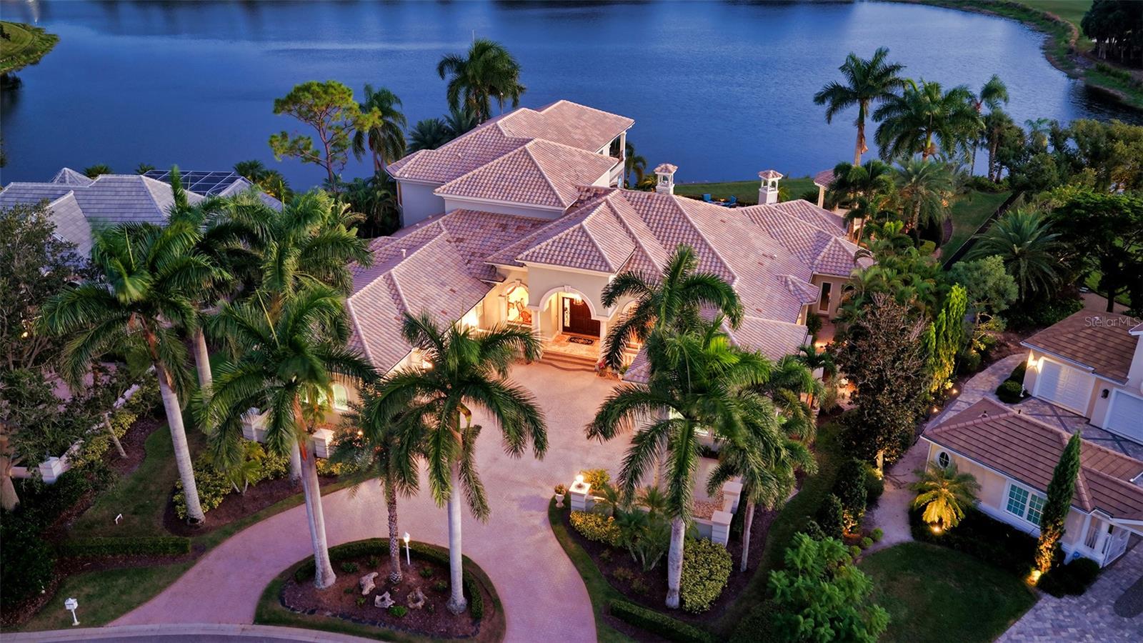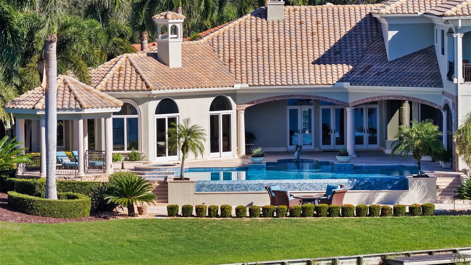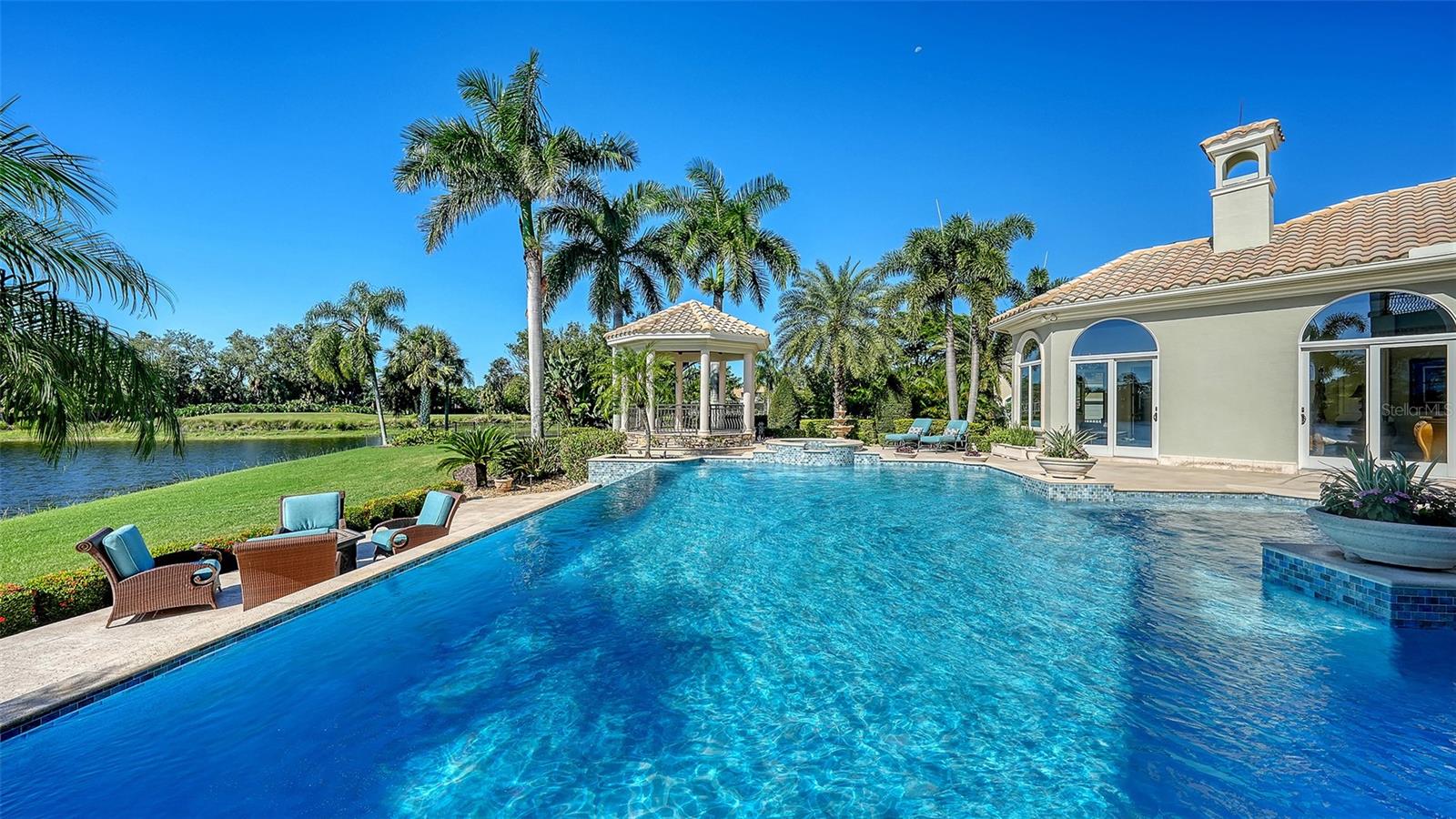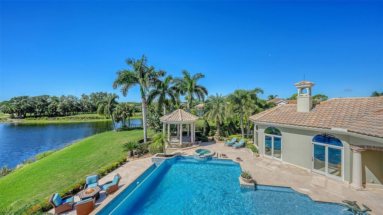 Inside the gates of University Park Country Club in the coveted enclave of Knightsbridge, this notable residence pairs timeless architecture with thoughtful modern UPDATES. Set on ¾ acre and the largest lakefront lot in the Park, the home enjoys complete privacy with sweeping water views and backdrop of the golf course in the distance. Built by one of Sarasota’s premier builders, the home is distinguished by an open-air infinity pool and spa (RE-SURFACED AND NEW TILE), fountains, a detached gazebo, and landscaping groomed to the hilt. The interior with travertine and walnut-plank flooring and custom millwork throughout is a testament of the finest craftsmanship. The everlasting finishes are enhanced with freshly painted walls, updated window treatments and other refinements throughout. The chef’s kitchen is a true centerpiece, recently enhanced with new quartz countertops. Custom cabinetry, a Butler’s Pantry and premium appliances include a six-burner Wolf range, separate wall oven, two Sub-Zero refrigerators, three dishwashers, and a built-in Miele coffee bar—ideal for entertaining on any scale. For those who pine for excellence in construction and everlasting elegance – the talent in this craft of fine carpentry has become more precious with time. The first-floor primary suite features custom closets, updated lighting and electronic shades, a dramatic fireplace, Anderson doors to the pool, and access to a private courtyard. Second level, accessed by ELEVATOR or a grand staircase, you’ll find a theater room for 8, a large bonus room with built-in media wall, full bar, sumptuous guest suite and a covered terrace. Additional highlights include a side entry 4-CAR AIR CONDITIONED GARAGE plus golf cart bay and a separate air-conditioned storage room. A whole house GENERATOR, water filtration and RO, smart lighting system, newer aluminum fencing to secure the entire rear side boundary lines, screened and full outdoor kitchen with stone fireplace, and updated audio system. This is resort-style living in one of Sarasota’s premier gated country club settings that continues to enjoy a reputation of the finest (optional) golf, tennis and racquet sports around. Social mixes and club dining is part of the lifestyle. Appreciate the unequivocal convenience to University Park’s shopping mecca nearby, fine dining, SRQ International Airport and downtown Sarasota just a short 20 minute drive.