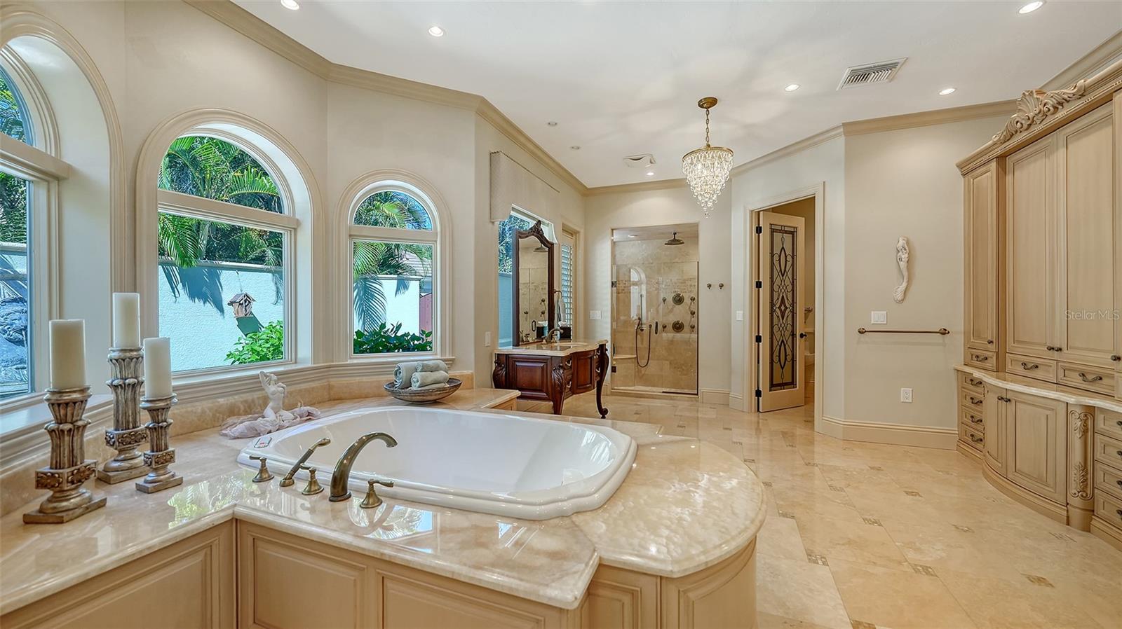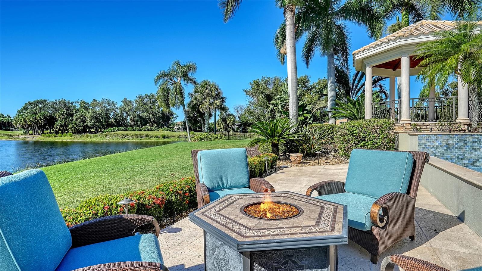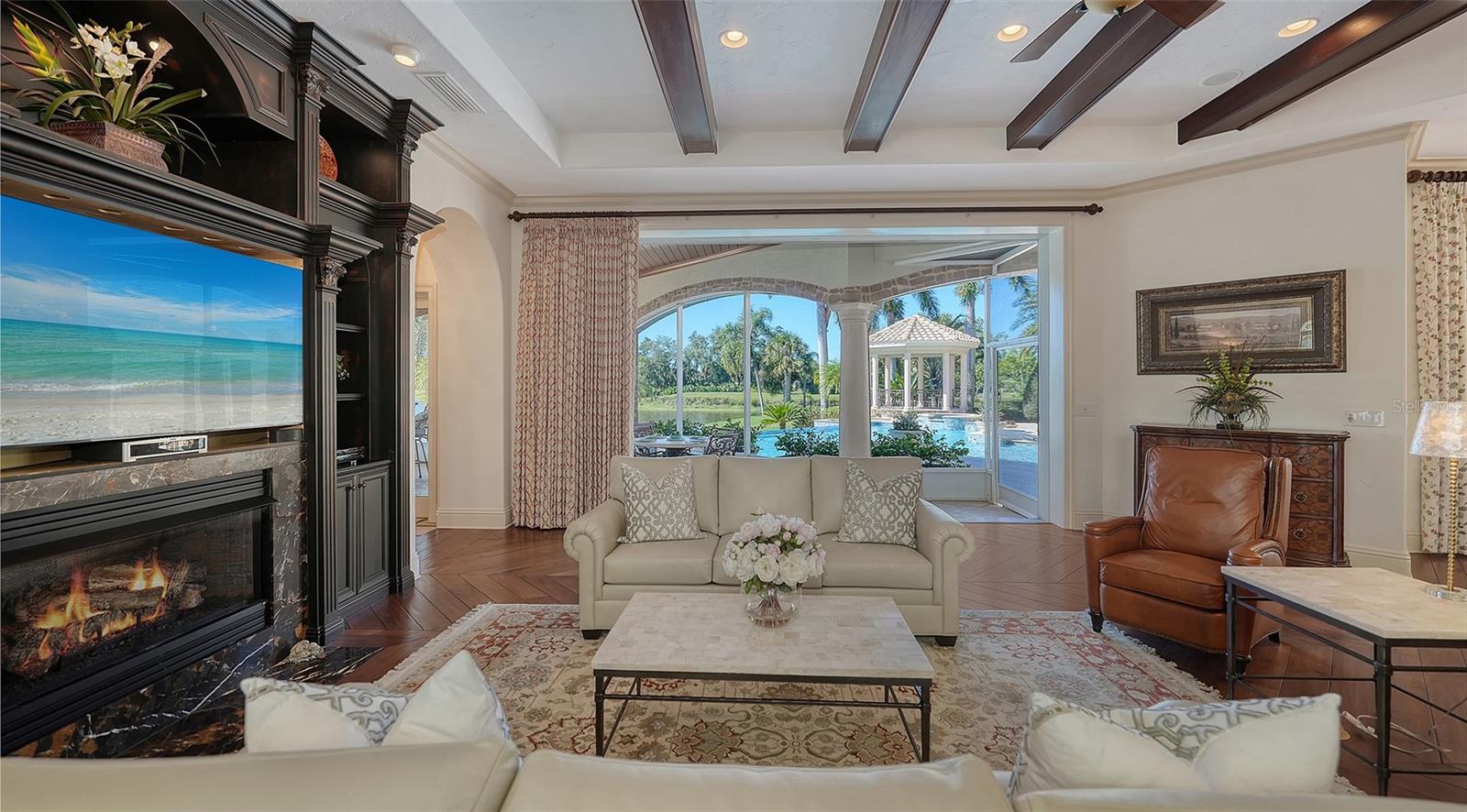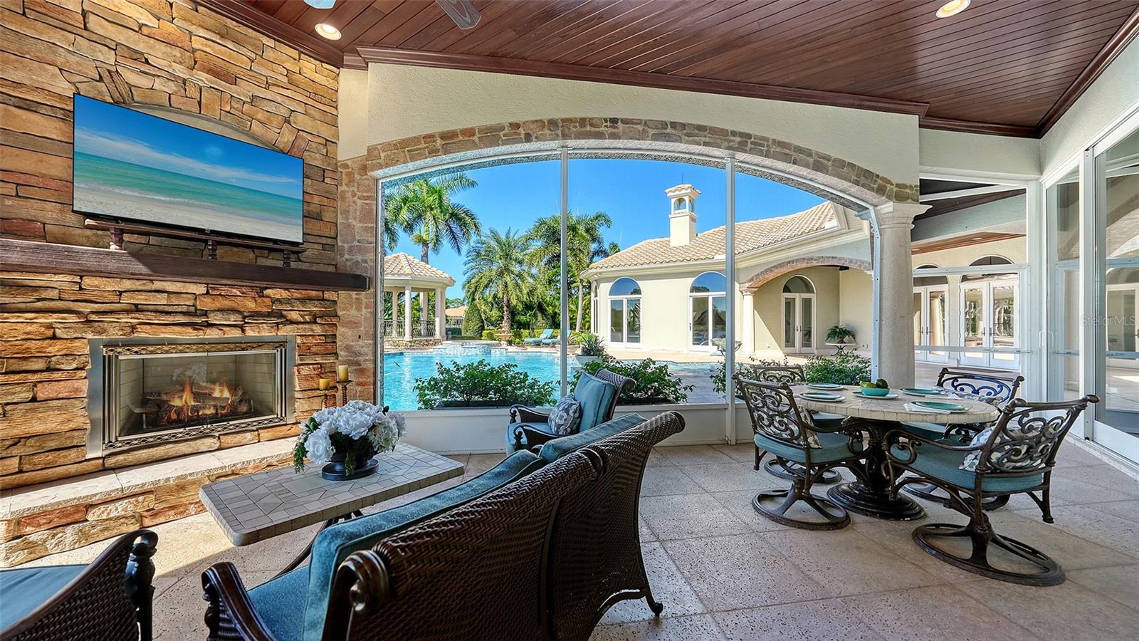 Inside the gates of University Park Country Club in the coveted enclave of Knightsbridge, this notable residence pairs timeless architecture with thoughtful modern UPDATES. Set on ¾ acre and the largest lakefront lot in the Park, the home enjoys complete privacy with sweeping water views and backdrop of the golf course in the distance. Built by one of Sarasota’s premier builders, the home is distinguished by an open-air infinity pool and spa (RE-SURFACED AND NEW TILE), fountains, a detached gazebo, and landscaping groomed to the hilt. The interior with travertine and walnut-plank flooring and custom millwork throughout is a testament of the finest craftsmanship. The everlasting finishes are enhanced with freshly painted walls, updated window treatments and other refinements throughout. The chef’s kitchen is a true centerpiece, recently enhanced with new quartz countertops. Custom cabinetry, a Butler’s Pantry and premium appliances include a six-burner Wolf range, separate wall oven, two Sub-Zero refrigerators, three dishwashers, and a built-in Miele coffee bar—ideal for entertaining on any scale. For those who pine for excellence in construction and everlasting elegance – the talent in this craft of fine carpentry has become more precious with time. The first-floor primary suite features custom closets, updated lighting and electronic shades, a dramatic fireplace, Anderson doors to the pool, and access to a private courtyard. Second level, accessed by ELEVATOR or a grand staircase, you’ll find a theater room for 8, a large bonus room with built-in media wall, full bar, sumptuous guest suite and a covered terrace. Additional highlights include a side entry 4-CAR AIR CONDITIONED GARAGE plus golf cart bay and a separate air-conditioned storage room. A whole house GENERATOR, water filtration and RO, smart lighting system, newer aluminum fencing to secure the entire rear side boundary lines, screened and full outdoor kitchen with stone fireplace, and updated audio system. This is resort-style living in one of Sarasota’s premier gated country club settings that continues to enjoy a reputation of the finest (optional) golf, tennis and racquet sports around. Social mixes and club dining is part of the lifestyle. Appreciate the unequivocal convenience to University Park’s shopping mecca nearby, fine dining, SRQ International Airport and downtown Sarasota just a short 20 minute drive.