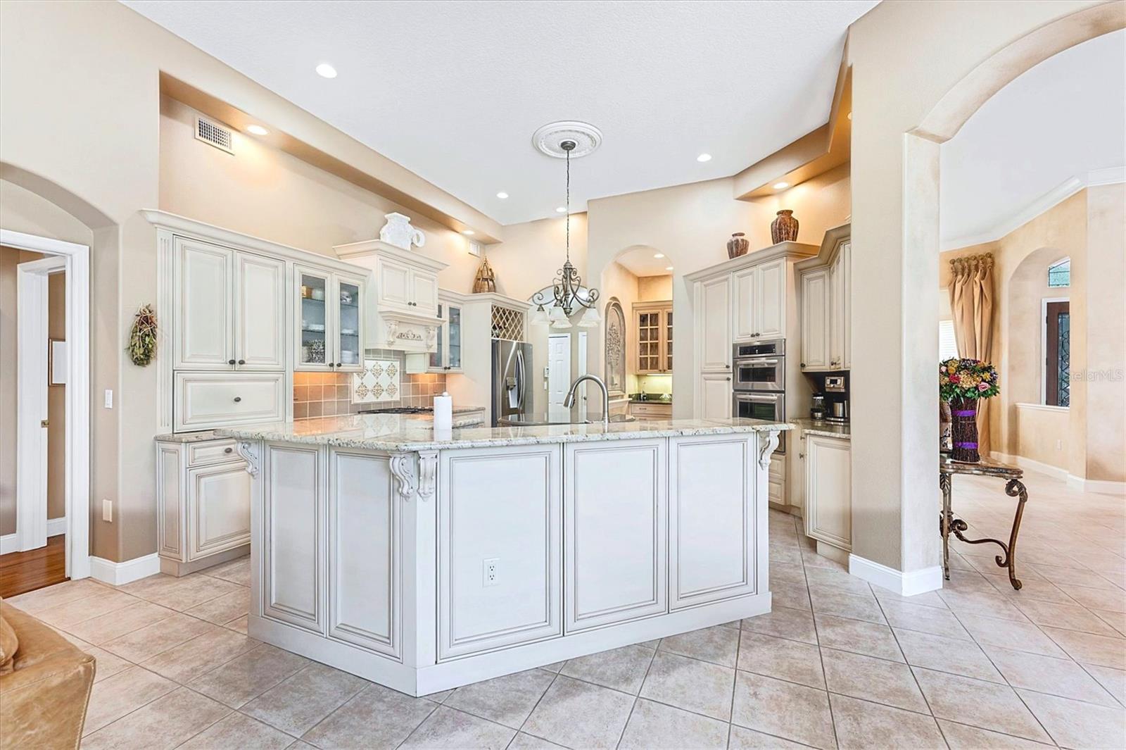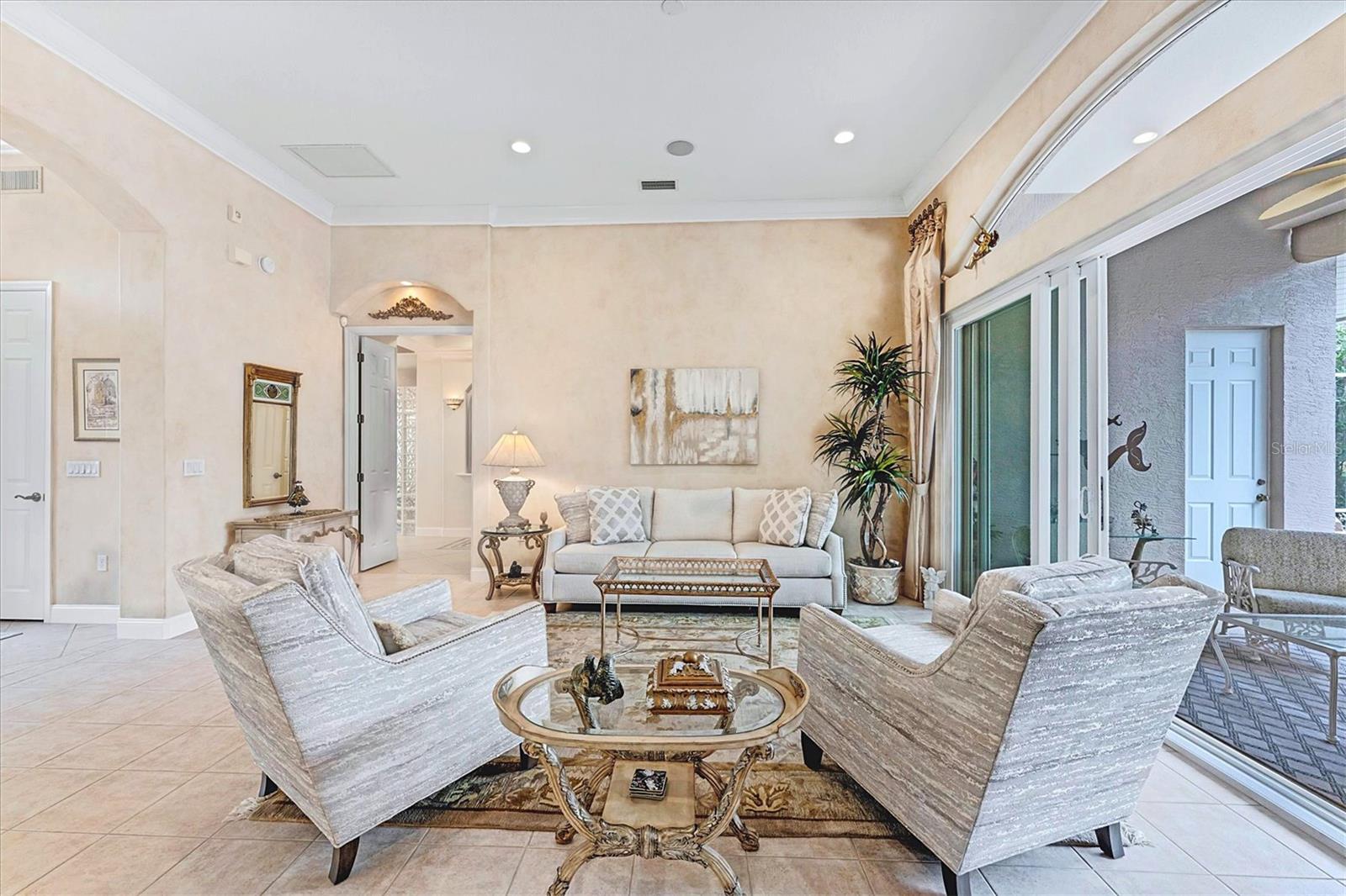 UPDATED ROOF, HURRICANE-IMPACT WINDOWS & DOORS, NEWER A/C, WATER HEATER, AND MORE! This architecturally elegant single-story residence is a true sanctuary of luxury, relaxation, and privacy, beautifully positioned amid lush, mature landscaping. A paver driveway leads to a gracious arched entry with warm wood double doors, immediately setting a refined and welcoming tone. The light stucco exterior, accented by tasteful architectural detailing and a gently contoured tile roof, creates a timeless and sophisticated presence. Framed by stately palm trees and manicured hedges, the home offers exceptional privacy and curb appeal. Thoughtfully placed exterior lighting enhances the architectural lines and landscape at dusk, while large, well-proportioned windows bring symmetry to the façade and fill the interior with natural light. This three-bedroom, three-bath residence with a den or office is designed to exceed expectations. Soaring ceilings, crown molding throughout, and meticulously curated finishes reflect thoughtful craftsmanship at every turn. Upon entering, your eye is immediately drawn to beautiful views of the private outdoor setting, where indoor and outdoor living blend seamlessly. The resort-style pool, framed by a privacy wall, invites peaceful relaxation, while the expansive lanai provides abundant space for sunbathing, lounging, and entertaining. An extended seating area, outdoor kitchen, and dedicated dining space create an ideal setting for gatherings with family and friends. Inside, the welcoming foyer opens to a gracious living room and formal dining room, perfect for entertaining and holiday celebrations. The heart of the home is the gourmet kitchen, featuring a spacious center island, high-end appliances, and abundant cabinetry and counter space, ideal for everyday living as well as hosting elegant dinners. The primary suite serves as a private retreat, offering a generously sized bedroom, two walk-in closets, and a spa-inspired bathroom with a whirlpool tub, walk-in shower, and dual vanities. Two private guest suites, each with its own bathroom, provide comfort and privacy for family and visitors. A cozy family room offers a comfortable space for relaxed evenings, while the office or library overlooks the pool and lush Florida landscaping, creating a peaceful work-from-home environment. The home is both beautiful and well maintained, featuring hurricane-resistant windows and doors, a newer roof, and updated mechanical systems. An oversized garage accommodates two cars and a golf cart. Blending timeless elegance with modern comfort, this residence offers privacy, effortless entertaining, and an exceptional indoor-outdoor lifestyle. With its mature landscaping and natural beauty, University Park is a premier master-planned community in the Sarasota area. Behind the secured, staffed entrance, residents enjoy 27 holes of four-star rated golf, eleven lighted Har-Tru tennis courts, four pickleball courts, a fitness center, croquet, miles of tree-lined streets for walking and biking, first-class dining, and a wide range of social activities and clubs. Located just four miles from downtown Sarasota, University Park offers convenient access to the arts, museums, shopping, dining, and top-tier healthcare. Some of the area’s finest beaches, Nathan Benderson Park, the Ringling Museum, boating, and St. Armands Circle are all within a short drive. University Park’s beauty and lifestyle are truly unmatched.