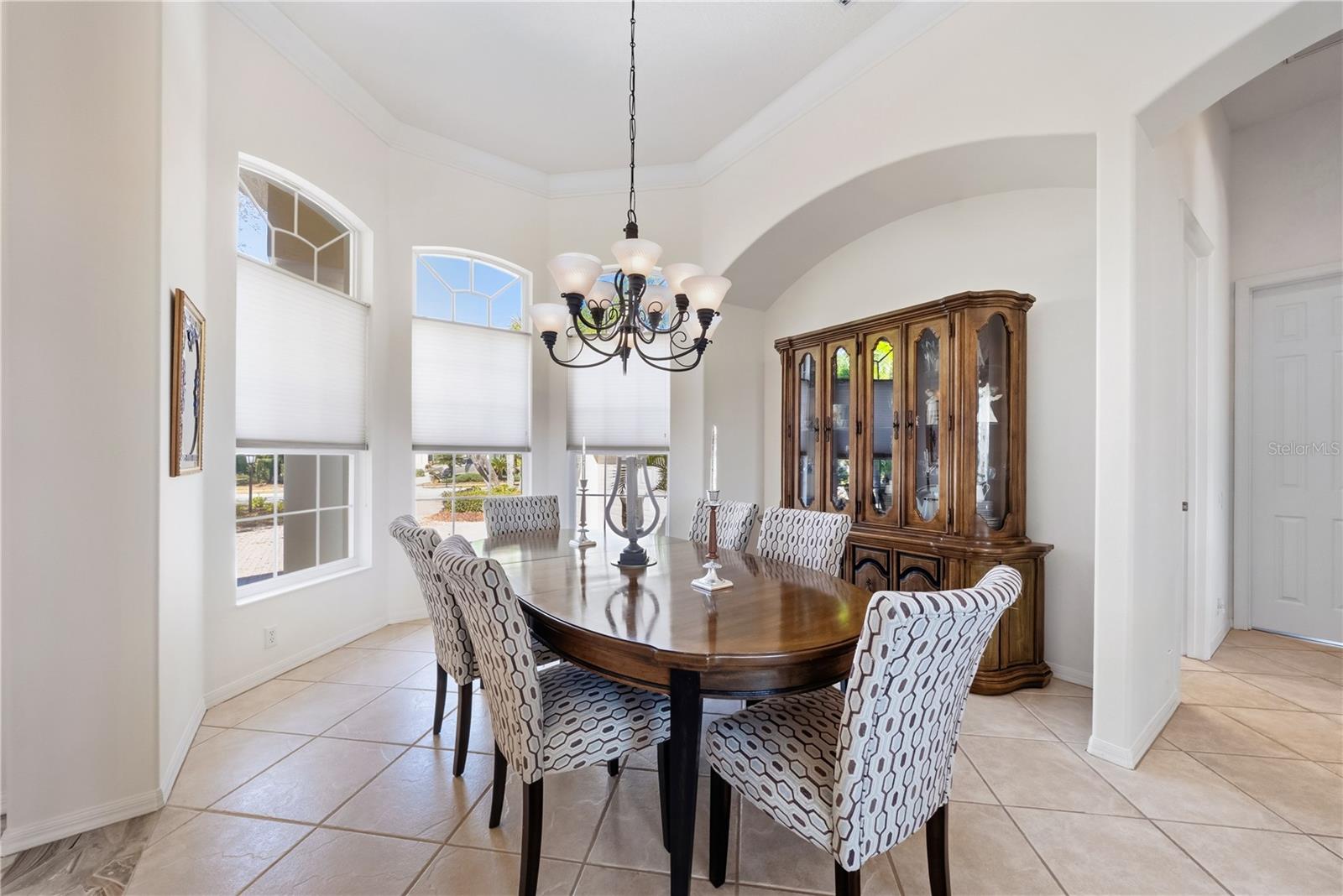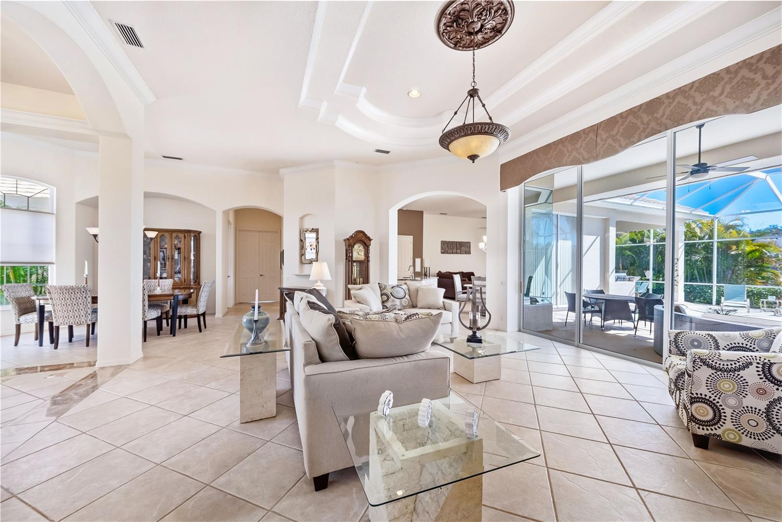 Welcome to this beautifully appointed Neal Custom Homes residence offering serene water views, exceptional architectural detail, and resort-style outdoor living. This 3-bedroom, 3-bath home with an oversized 3-car garage offers 3356 sf and is thoughtfully designed for both everyday comfort and elegant entertaining. A double designer leaded-glass front door opens to a striking foyer with marble inlay flooring, setting the tone for the refined interiors. High-end ceramic tile laid on the diagonal flows throughout the main living areas, complemented by tray and coffered ceiling details, crown molding, custom niches, and recessed lighting. The living room features a triple tray ceiling, an electric fireplace, and pocket sliders that open seamlessly to the lanai. The brand-new kitchen (2021) is the heart of the home, showcasing rich off-white wood cabinetry, exotic granite countertops, a quartz-topped center island, GE stainless steel appliances, subway tile backsplash, under-cabinet lighting, a spacious pantry, built-in oven with microwave, and an aquarium window in the breakfast area. Open to the family room and lanai, this space is ideal for entertaining. The primary suite is a private retreat featuring a sitting area with bay-style windows, coffered ceiling, dual customized closets, double-door entry, and private access to the lanai. The spa-inspired, wheelchair-accessible primary bath offers an oversized marble-detailed shower, Jacuzzi tub, marble flooring, expansive double vanity with makeup area, cultured marble countertops, triple mirrors, and new designer hardware. Bedroom two is a generously sized custom suite with a large closet and bath featuring a cultured marble vanity and tub/shower combination. Bedroom three is adjacent to a full hall bath with enclosed shower, linen closet, and updated brushed-silver fixtures. A large rear den with cathedral-style ceiling and sliders to the lanai can easily serve as a fourth bedroom with the addition of a closet. Step outside to your private oasis with a kidney-shaped heated pool and spa, lush updated landscaping with lighting, and a covered lanai offering space for a future outdoor kitchen (currently equipped with refrigerator and cabinetry). The oversized 3-car garage features higher ceilings, a painted floor, storage cabinetry, exterior access, and an electric hydraulic car lift, perfect for car enthusiasts. Additional highlights include central vacuum, exquisite lighting, select new fans, window treatments, brushed-silver hardware throughout, and a well-appointed laundry room with cabinetry, sink, and built-in ironing board. Available furnishings may be purchased separately.