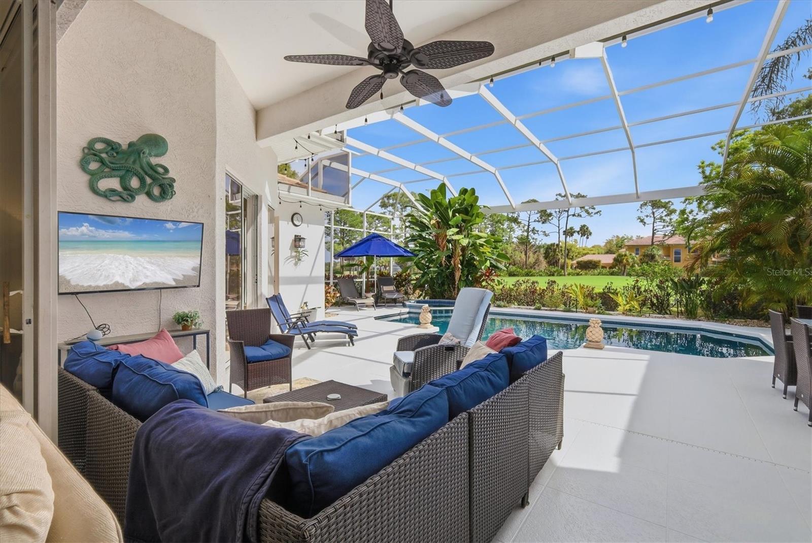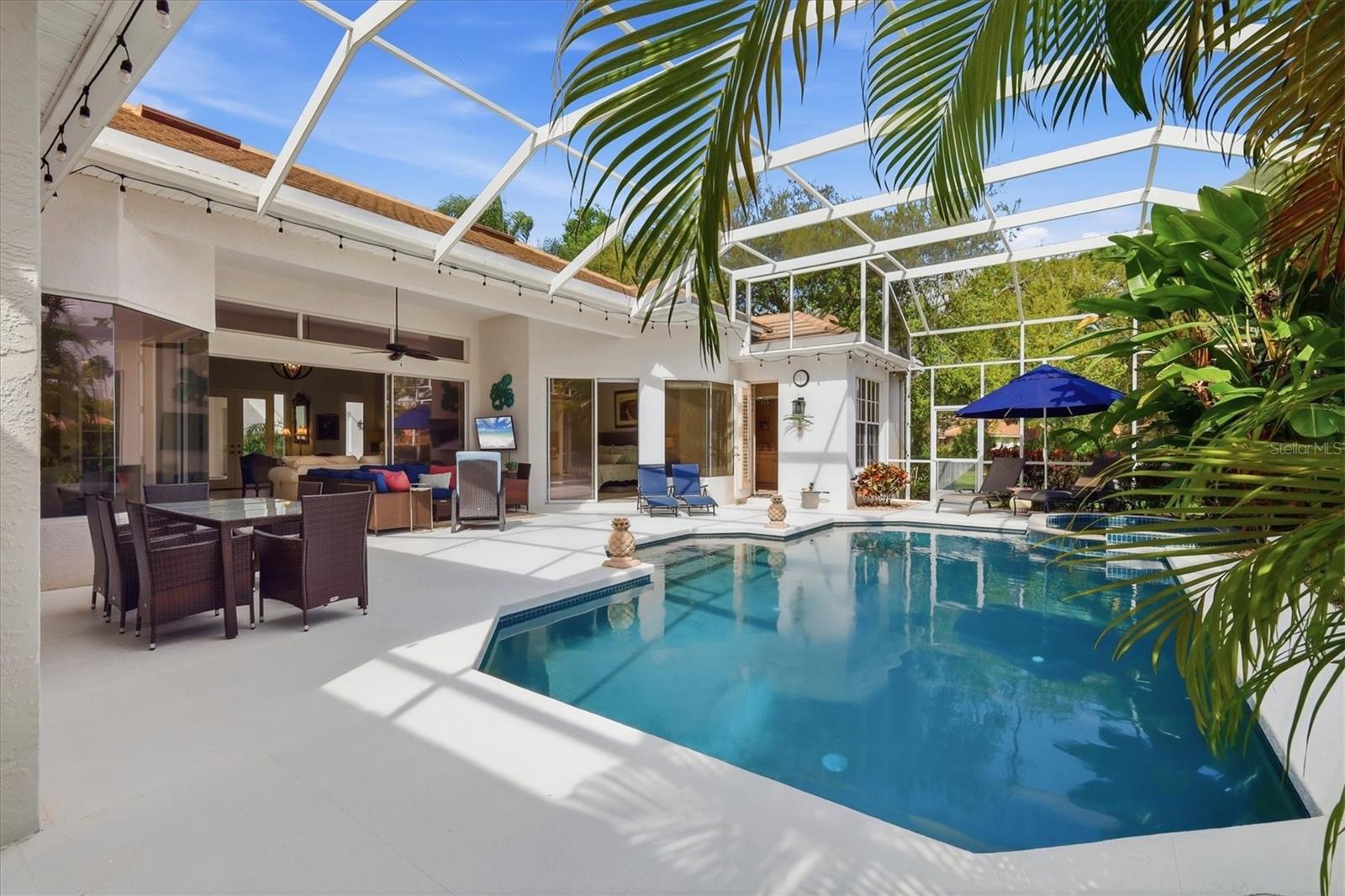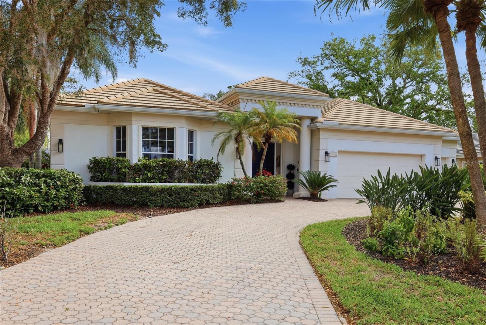 Eaton Place is one of the most sought-after neighborhoods of the award-winning University Park Country Club. This unique home features a one-of-a-kind entry courtyard with a fountain, beautifully landscaped with native Florida plants. The eat-in kitchen offers granite countertops and stainless-steel appliances, along with new hurricane-rated sliders and windows that fill the home with natural light and provide seamless access to the lanai and pool area overlooking the golf course and 13th hole. The rear lanai showcases a pool and spa with tranquil golf course and water views. Originally built by Morton Brothers as a model home, this 3,218-sf residence includes 3 bedrooms, 4 bathrooms, an office/den, and a versatile hobby room. The living & dinning room 12-foot ceilings and custom features enhance the home’s sense of scale and elegance. Recent improvements include a new tile roof (2021), outdoor kitchen (2021), updated interior kitchen (2021), new HVAC (2020), washer and dryer (2021), and new hurricane-rated sliding doors and windows (2026). The home offers exceptional privacy, with an undeveloped lot to the north that will never be built upon as it’s owned by the HOA. Guests enjoy a private suite with mini kitchen, en-suite bath, and French doors opening to the entry courtyard. A two-car garage plus golf cart garage complete the property. University Park is a premier private, gated golfing community celebrated for its natural beauty, mature landscape and planned design. Behind the secured, staffed entrance lies an award-winning, resident-owned community offering 27 holes of four-star rated golf, eleven lighted Har-Tru tennis courts, four pickleball courts, a fitness center, croquet, and miles of tree-lined streets ideal for recreation or biking. Residents also enjoy first-class dining, a variety of social activities, and numerous clubs tailored to diverse interests. Ideally near downtown Sarasota and Lakewood Ranch. University Park provides easy access to the vibrant arts community, world-class museums, fine dining, shopping and top-tier healthcare. Just a short drive are some of Florida’s best beaches, including the award-winning Siesta Key Beach, and Lido Beach. Endless dinner possibilities at UTC Mall, St. Armands Circle, and Lakewood Ranch. Combining elegance, amenities and convenience, University Park offers an exceptional lifestyle in a breathtaking setting with an abundance of wildlife
