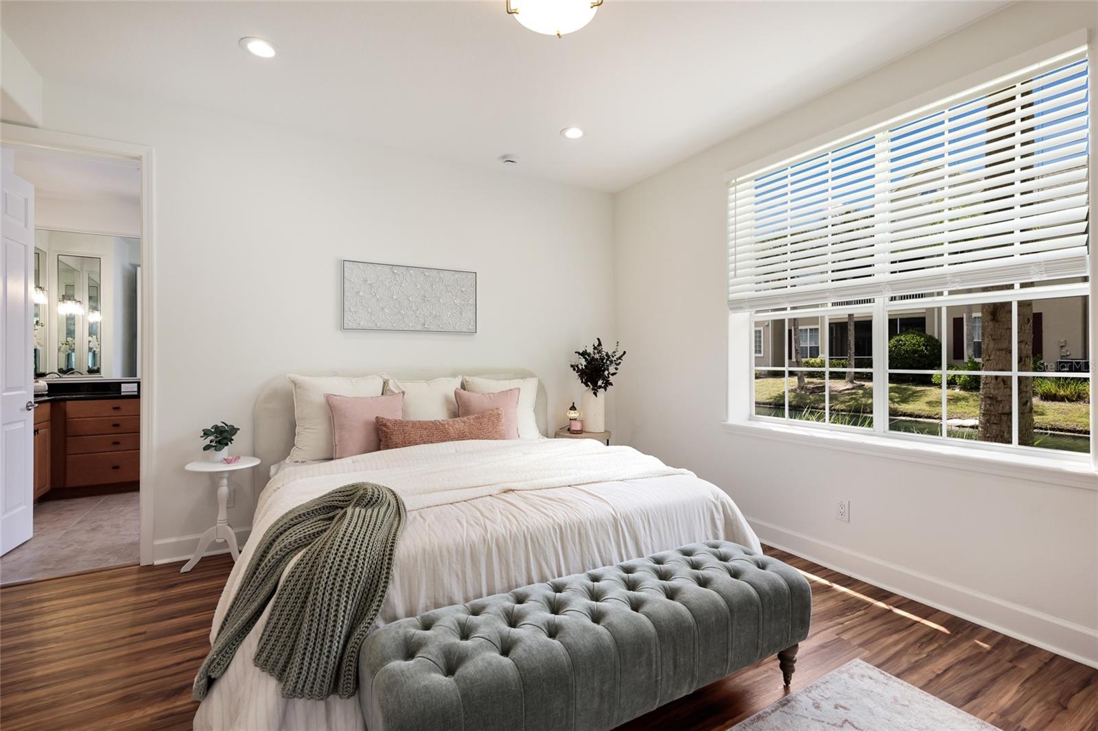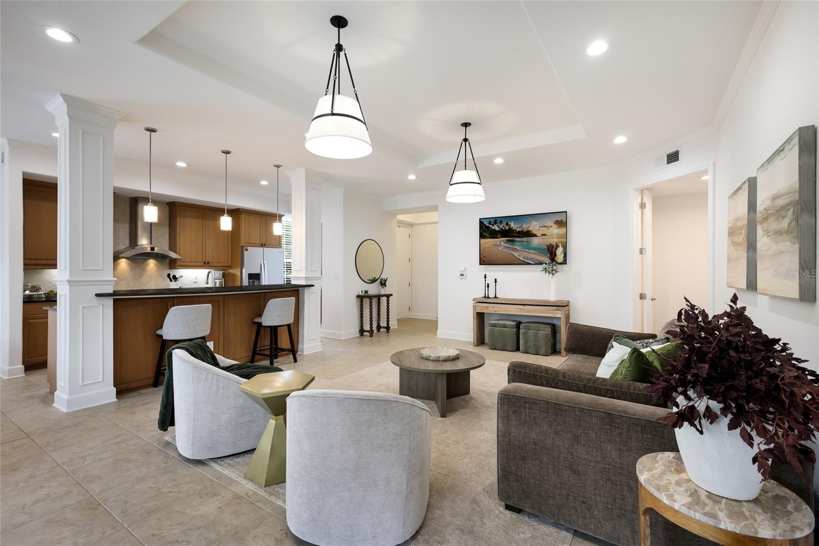 An exceptional opportunity to own a former model home with arguably the most picturesque setting in the neighborhood -- only available due to an unexpected job relocation. This light-filled, ground-floor end unit offers 2 bedrooms plus a bonus room, 2 full baths, an attached garage and two additional parking spaces. A thoughtfully designed open-concept layout that lives both spacious and refined from the moment you enter. Immediately you'll notice idyllic views and upscale finishes including 8-foot doors, elegant tray ceilings, and oversized 18-inch tile and laminate flooring throughout. This is a completely carpet-free home for a clean, modern feel. The contemporary kitchen is both stylish and functional, featuring a brand-new induction range, stainless appliances, neutral wood tone cabinetry, and stone countertops. Other costly updates that will provide peace of mind and a move in ready space for a new owner, include crisp white paint of all surfaces throughout the home in 2026 (ceilings, base, trim and walls), a 2020 AC system (under maintenance contract), and a 2022 hot water heater. But the real magic is in the location...Step outside on the lanai to relish in the unobstructed views and sounds of the tranquil, meandering waterfalls at the headwaters of the lagoon. There is truly nothing like it in our market. Savannah Preserve is a meticulously maintained gated neighborhood with new exterior painting, new roofs, fencing, and refreshed landscaping, creating a polished and cohesive environment. Don't wait to see this chic tucked away oasis just 2 minutes to all the shopping and dining your heart could desire.