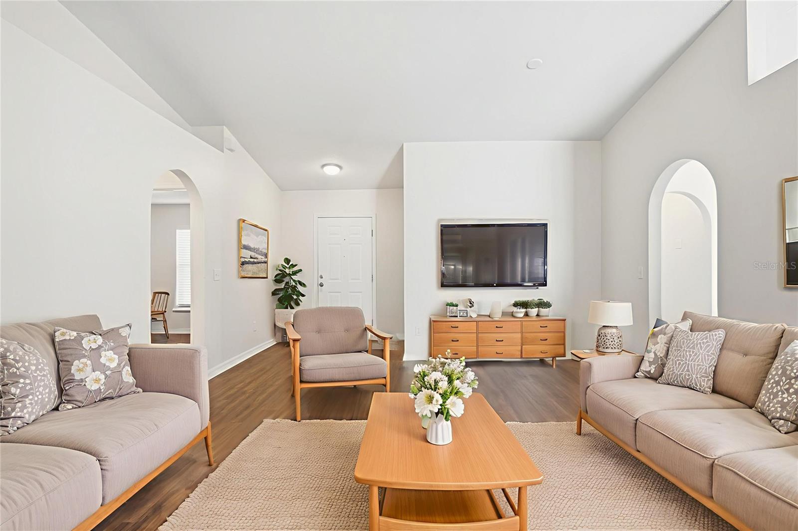 Situated in the Copper Ridge community, this single-family residence offers a functional split-bedroom layout designed for everyday comfort. The interior features an open living and dining area with high ceilings, creating a bright and welcoming atmosphere. The kitchen includes a breakfast bar, pantry storage, and an adjoining dinette space that flows easily into the main living areas. The primary suite is set apart for privacy and includes a spacious bath with garden tub and separate shower. Additional bedrooms provide flexibility for guests, home office, or additional living needs. Conveniently located near major roadways, shopping, dining, and neighborhood amenities, this home offers an ideal balance of comfort and accessibility.