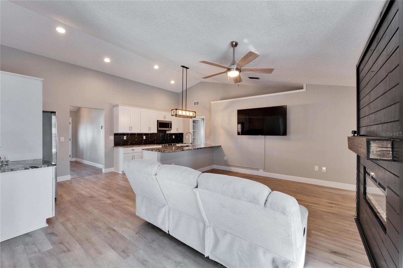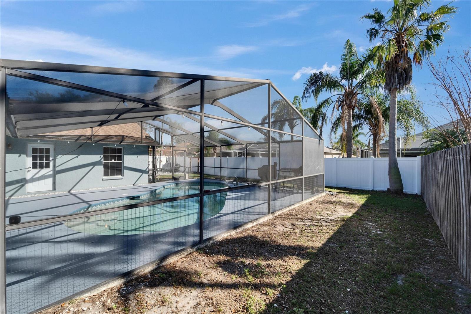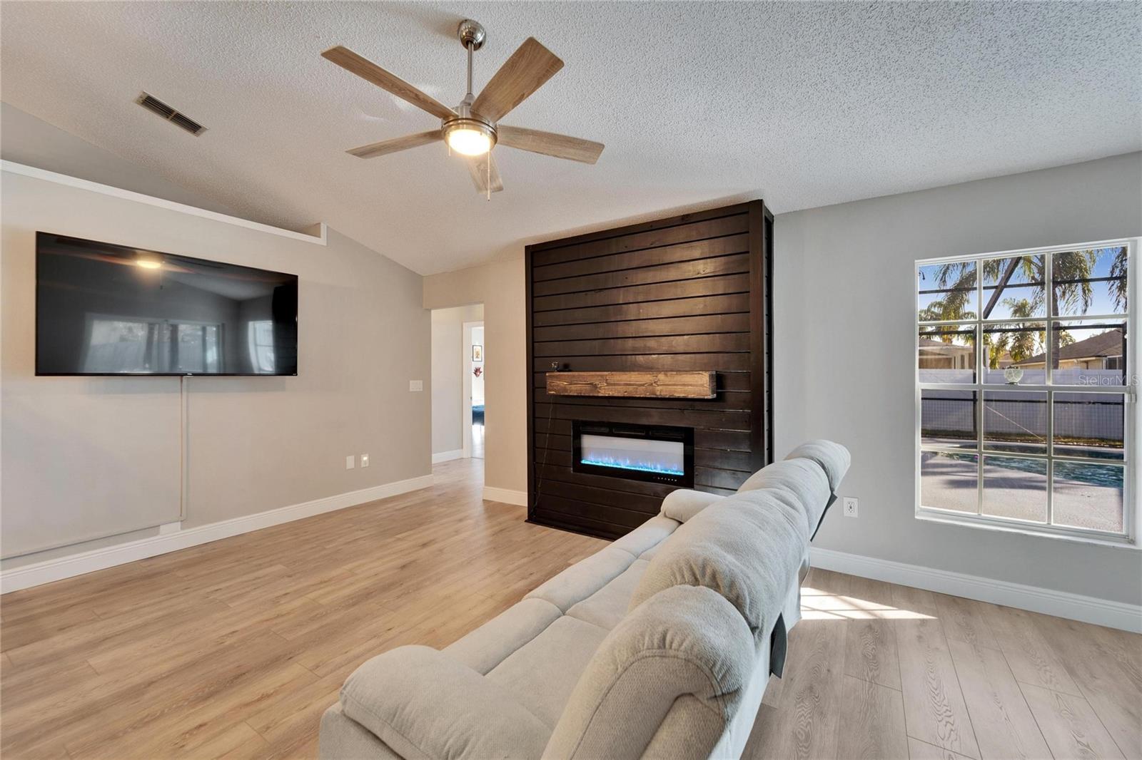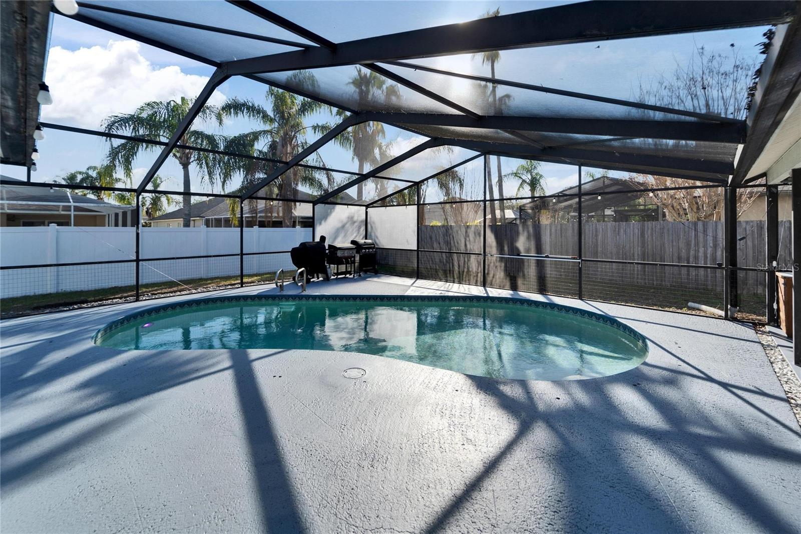 Welcome to this stunning 4-bedroom, 2-bathroom pool home in the heart of Bloomingdale! As you step inside, you'll be greeted by a spacious, open-concept living room and kitchen combo perfect for entertaining. The beautifully designed kitchen boasts crisp white cabinets, sleek granite countertops, a large island with bar seating, stainless steel appliances, and a modern backsplash. Throughout the home, enjoy brand-new laminate flooring and baseboards that add a fresh, contemporary touch to every room. The screened-in, covered saltwater pool is the perfect place to unwind, and the freshly painted pool deck includes a mini refrigerator and ample space for outdoor entertaining. All mounted TV's are included for the new owner. The oversized backyard is your private retreat, featuring a peaceful waterfall pond and a cozy sitting area ready for a fire pit. Inside, the home is freshly painted, and with a new AC system (2022) and a roof that's only 5 years old, you can move in with peace of mind. Located in an A-rated school zone, this home offers the convenience of an optional HOA and no CDD fees. Don’t miss your chance to own this beautiful property!