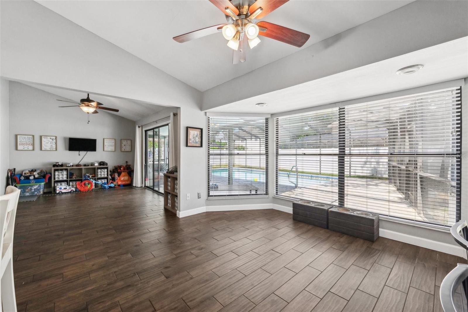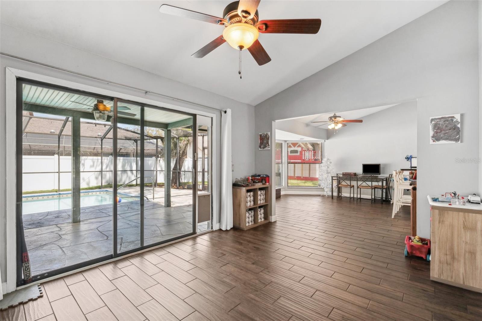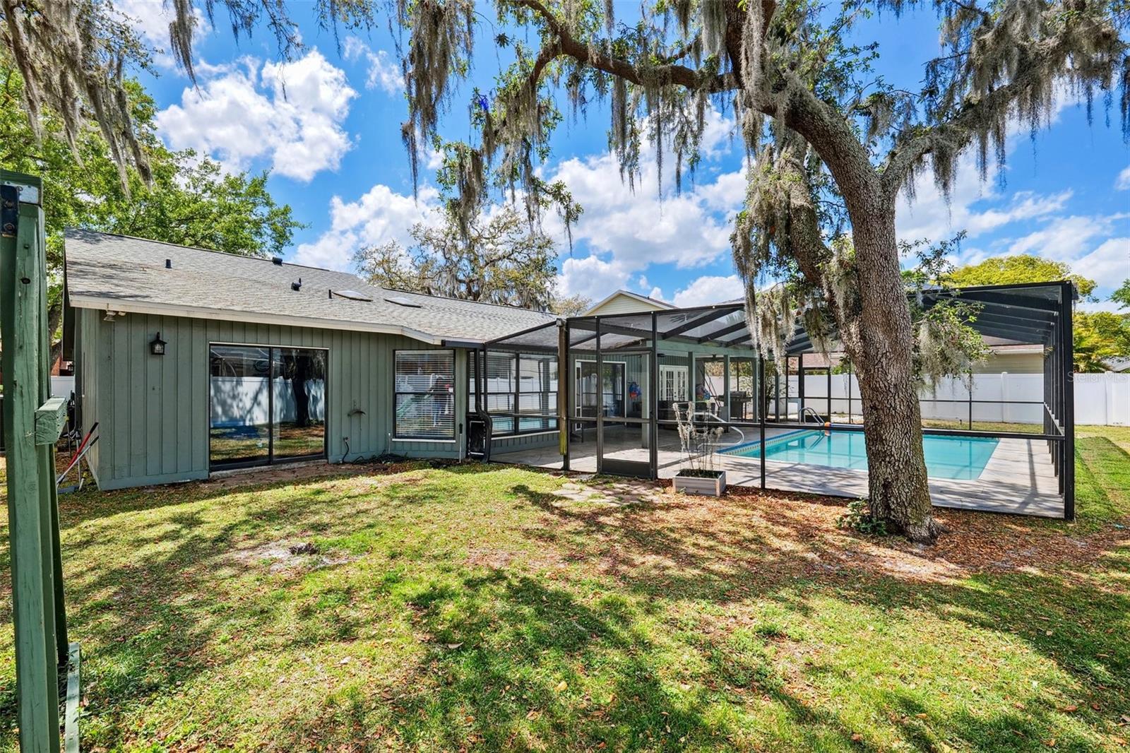 Your Dream Home Awaits in Bloomingdale East! This beautifully updated 3-bedroom, 2-bathroom home with an office and 2,396 sq. ft. of living space is a rare find in the highly desirable Bloomingdale East community! Nestled among mature oak trees on a large fenced lot, this home offers privacy, space, and modern upgrades throughout. Step inside to find vaulted ceilings and plank tile flooring, creating a bright and airy atmosphere. The remodeled primary bath is a true retreat, featuring a large walk-in shower and custom closet. Outside, the sparkling pool and spacious backyard provide the perfect setting for entertaining or relaxing. A new roof (2024) adds peace of mind, making this home move-in ready! Enjoy all the benefits of living in a well-established neighborhood with no HOA or CDD, including parks, tennis courts, and scenic walking trails. Conveniently located near top-rated schools, shopping, dining, and major roadways, this home truly has it all. Don't miss your chance—schedule your private showing today!