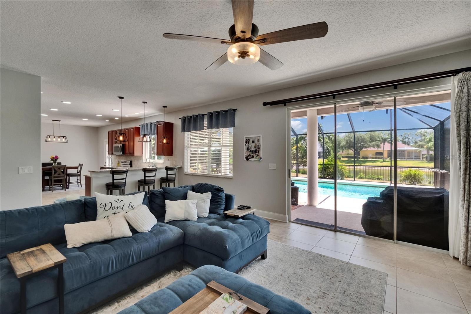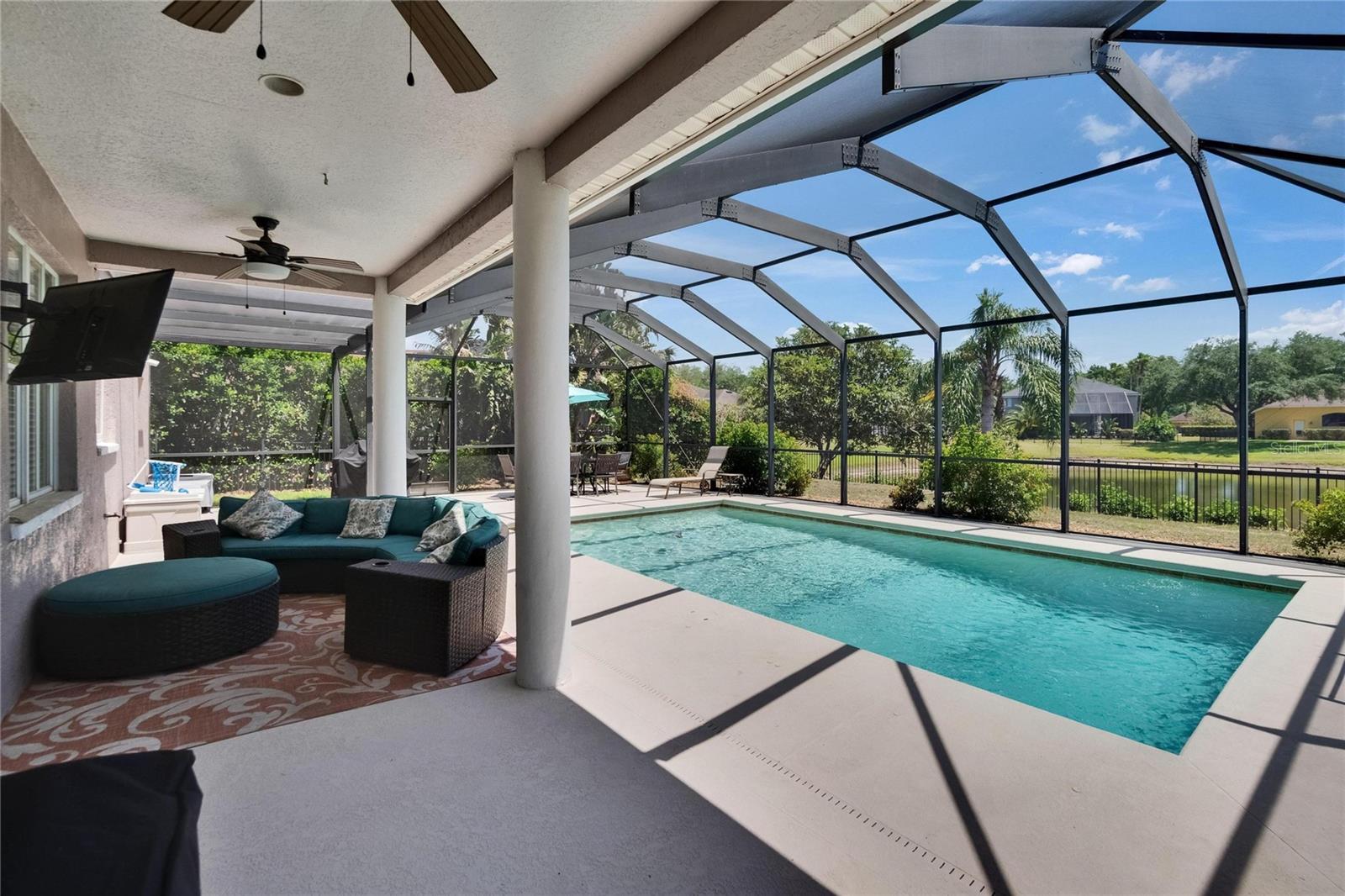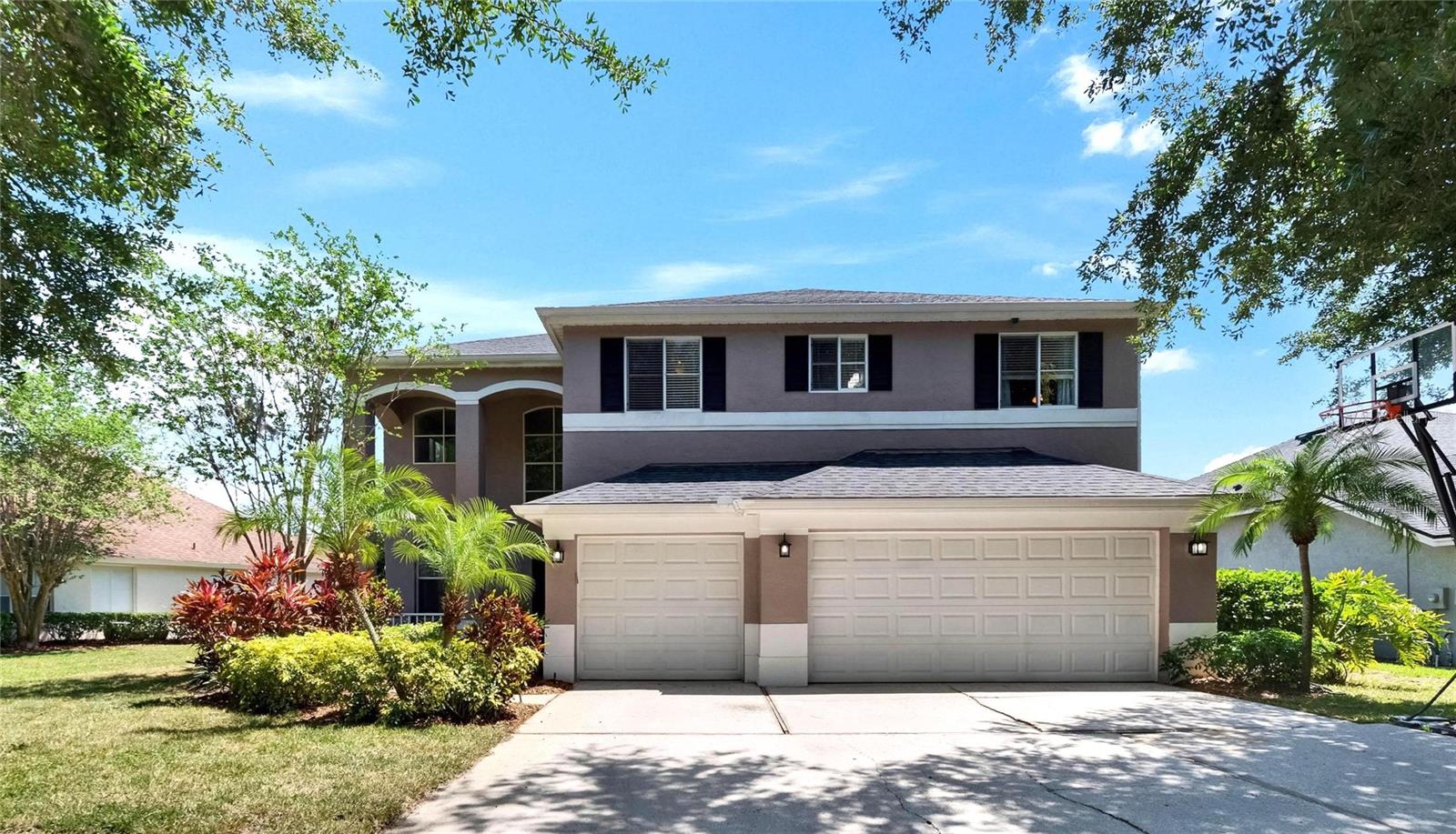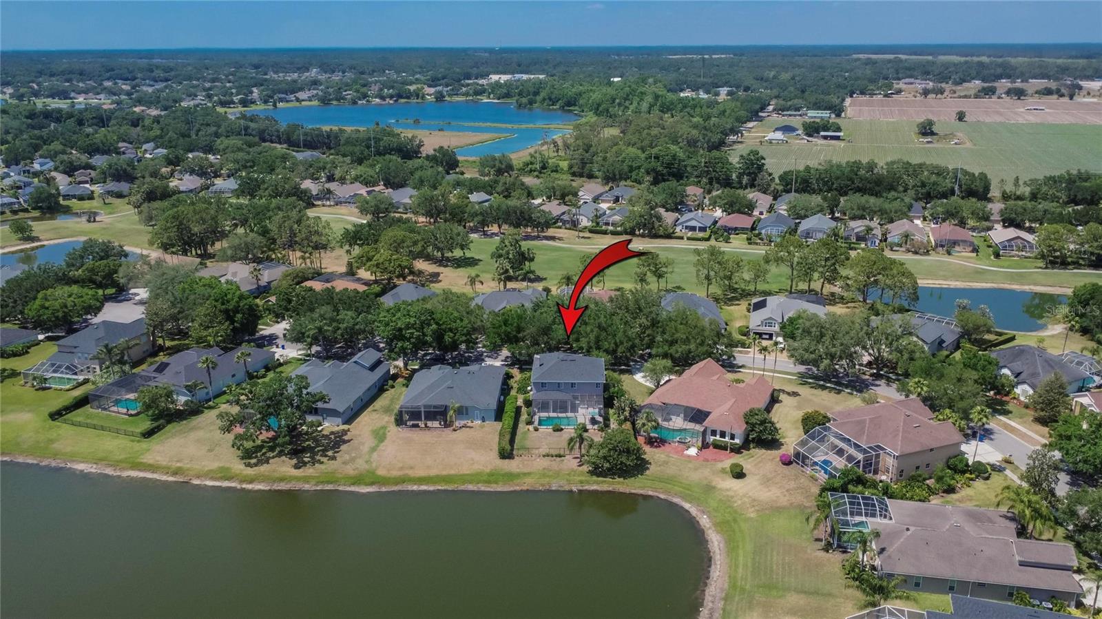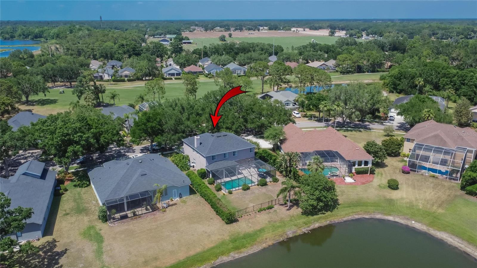 Absolutely gorgeous pool home overlooking a serene pond in the prestigious gated River Hills community. This exceptional property offers everything you could desire in a luxury residence. Upon entry, you'll be captivated by soaring two-story ceilings in both the living and dining areas. The gourmet kitchen features elegant 42" cabinets, recessed lighting, granite countertops, travertine backsplash, and stainless steel appliances, complemented by a breakfast bar with stylish pendant lighting. This open-concept space flows seamlessly into a comfortable family room with a wood-burning fireplace and picturesque views of the pool and pond beyond. A private first-floor bedroom with full bath access provides the perfect accommodations for guests or in-laws. The second floor showcases a luxurious master suite featuring a cozy sitting room with fireplace that could alternatively serve as an office or nursery. The master bathroom boasts a relaxing jetted garden tub, separate shower, and dual vanity with granite countertops. Three additional bedrooms complete the upper level: an en-suite with walk-in closet and private bath, a third bedroom currently functioning as an office with custom-built closet cabinetry, and a fourth bedroom also featuring a walk-in closet. All closets throughout the home include custom organization systems. The spacious three-car garage provides ample storage with built-in racks and premium coated flooring. Outdoor living is elevated with a stunning screened lanai and pool deck, where you can unwind while admiring views of your private yard and the tranquil pond. Perfect for entertaining and family gatherings, this home has been thoughtfully updated with a newer roof (2019), water heater (2025), gutters (2021), water filtration system (2021), garage doors (2016), air conditioning (2016), pool pump (2022), coated garage floor (2024), new carpet and freshly painted deck (2025). The River Hills community offers resort-style amenities including fitness center, basketball court, community pool and extensive walking trails. The River Hills Country Club offers residents membership access to the golf course, tennis courts, and pickleball facilities. Experience the pinnacle of luxurious Florida living – schedule your private showing today!