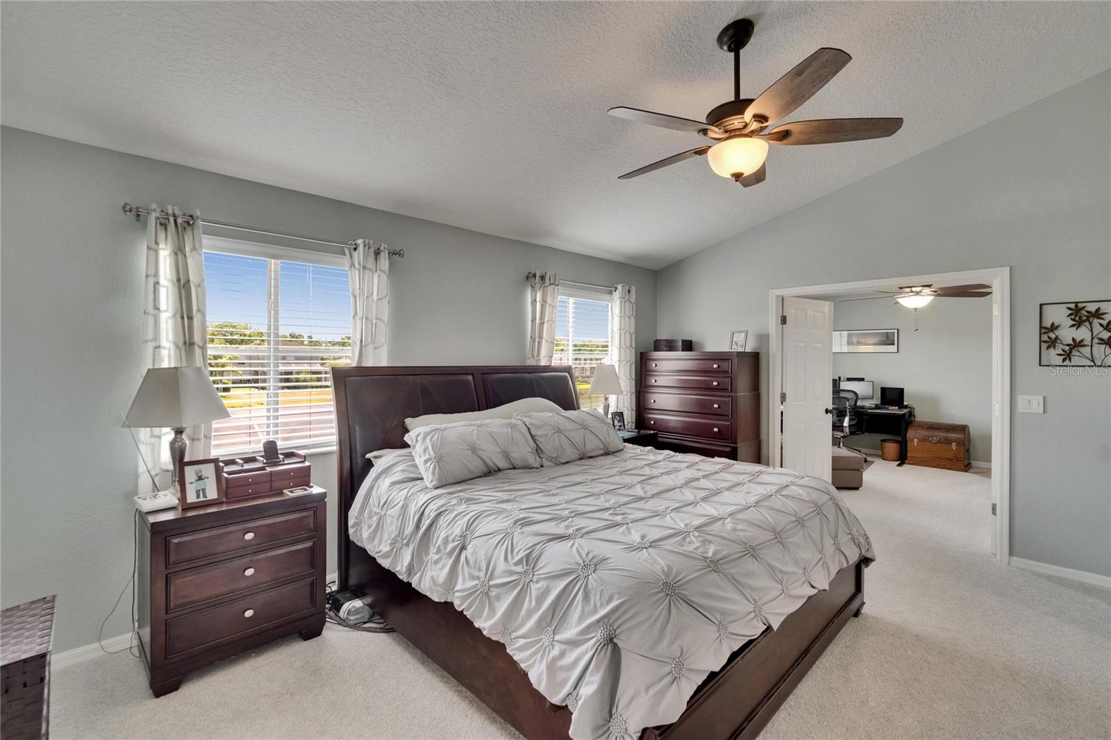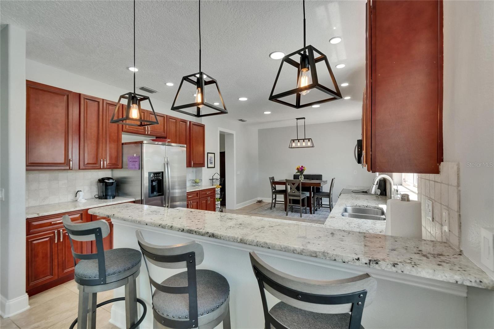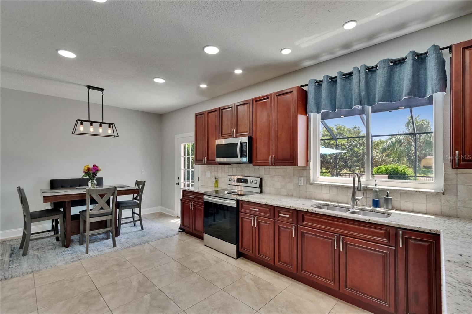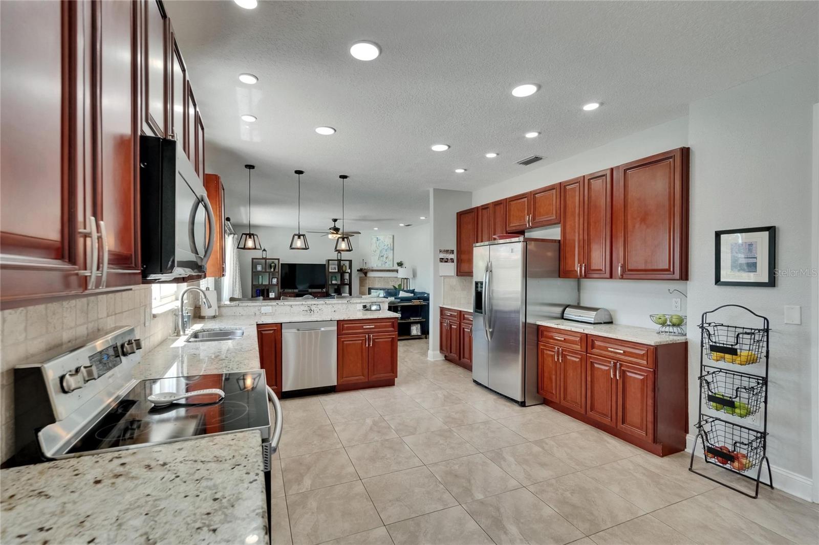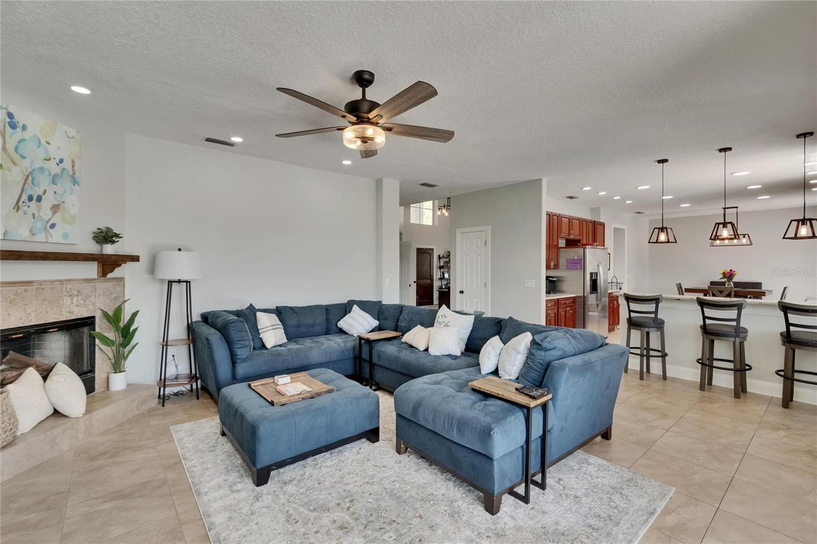 Absolutely gorgeous pool home overlooking a serene pond in the prestigious gated River Hills community. This exceptional property offers everything you could desire in a luxury residence. Upon entry, you'll be captivated by soaring two-story ceilings in both the living and dining areas. The gourmet kitchen features elegant 42" cabinets, recessed lighting, granite countertops, travertine backsplash, and stainless steel appliances, complemented by a breakfast bar with stylish pendant lighting. This open-concept space flows seamlessly into a comfortable family room with a wood-burning fireplace and picturesque views of the pool and pond beyond. A private first-floor bedroom with full bath access provides the perfect accommodations for guests or in-laws. The second floor showcases a luxurious master suite featuring a cozy sitting room with fireplace that could alternatively serve as an office or nursery. The master bathroom boasts a relaxing jetted garden tub, separate shower, and dual vanity with granite countertops. Three additional bedrooms complete the upper level: an en-suite with walk-in closet and private bath, a third bedroom currently functioning as an office with custom-built closet cabinetry, and a fourth bedroom also featuring a walk-in closet. All closets throughout the home include custom organization systems. The spacious three-car garage provides ample storage with built-in racks and premium coated flooring. Outdoor living is elevated with a stunning screened lanai and pool deck, where you can unwind while admiring views of your private yard and the tranquil pond. Perfect for entertaining and family gatherings, this home has been thoughtfully updated with a newer roof (2019), water heater (2025), gutters (2021), water filtration system (2021), garage doors (2016), air conditioning (2016), pool pump (2022), coated garage floor (2024), new carpet and freshly painted deck (2025). The River Hills community offers resort-style amenities including fitness center, basketball court, community pool and extensive walking trails. The River Hills Country Club offers residents membership access to the golf course, tennis courts, and pickleball facilities. Experience the pinnacle of luxurious Florida living – schedule your private showing today!
