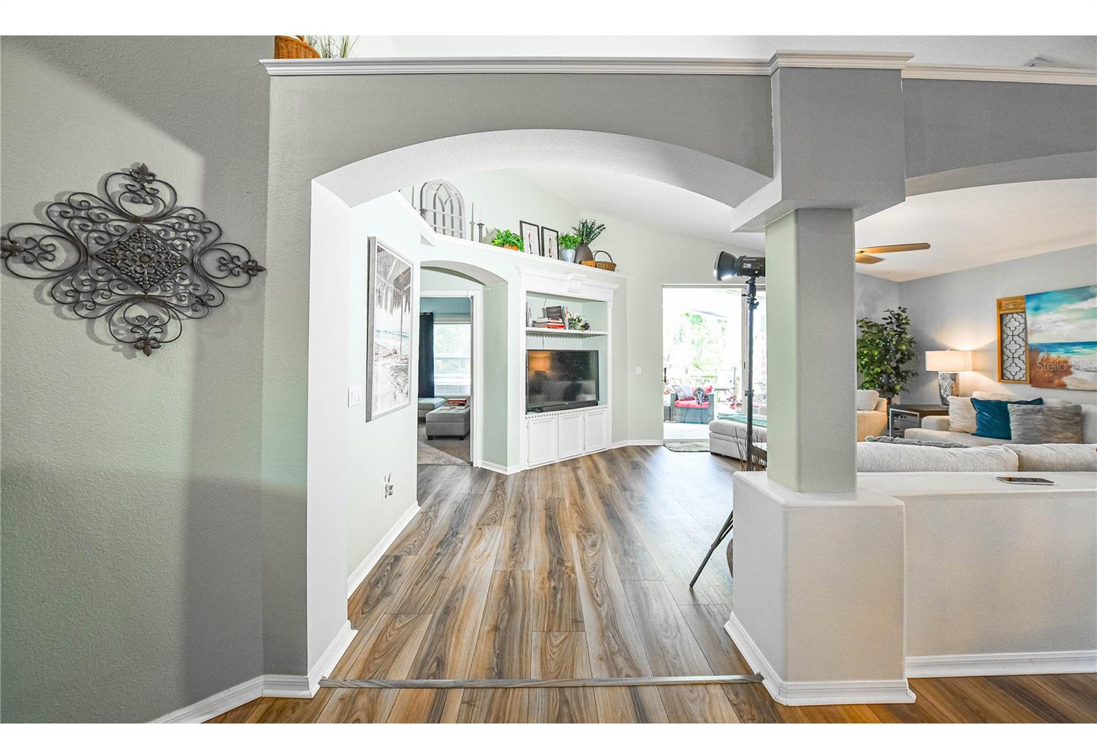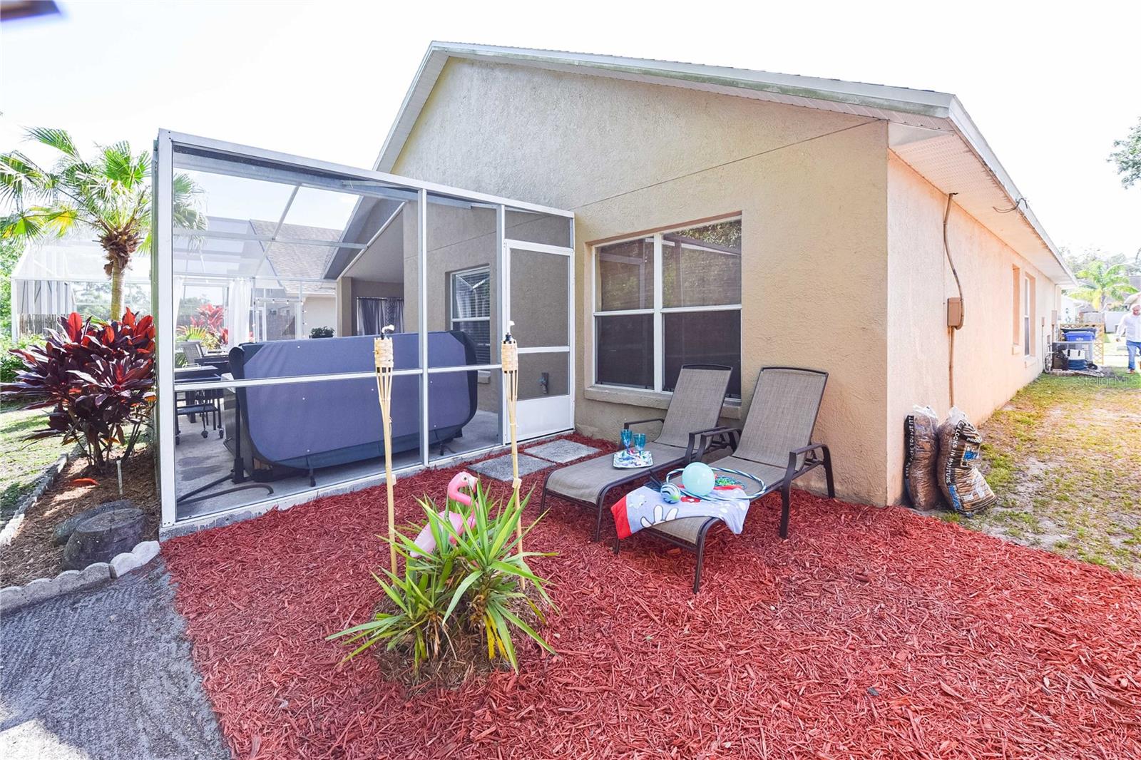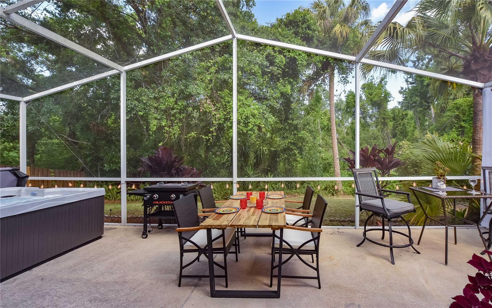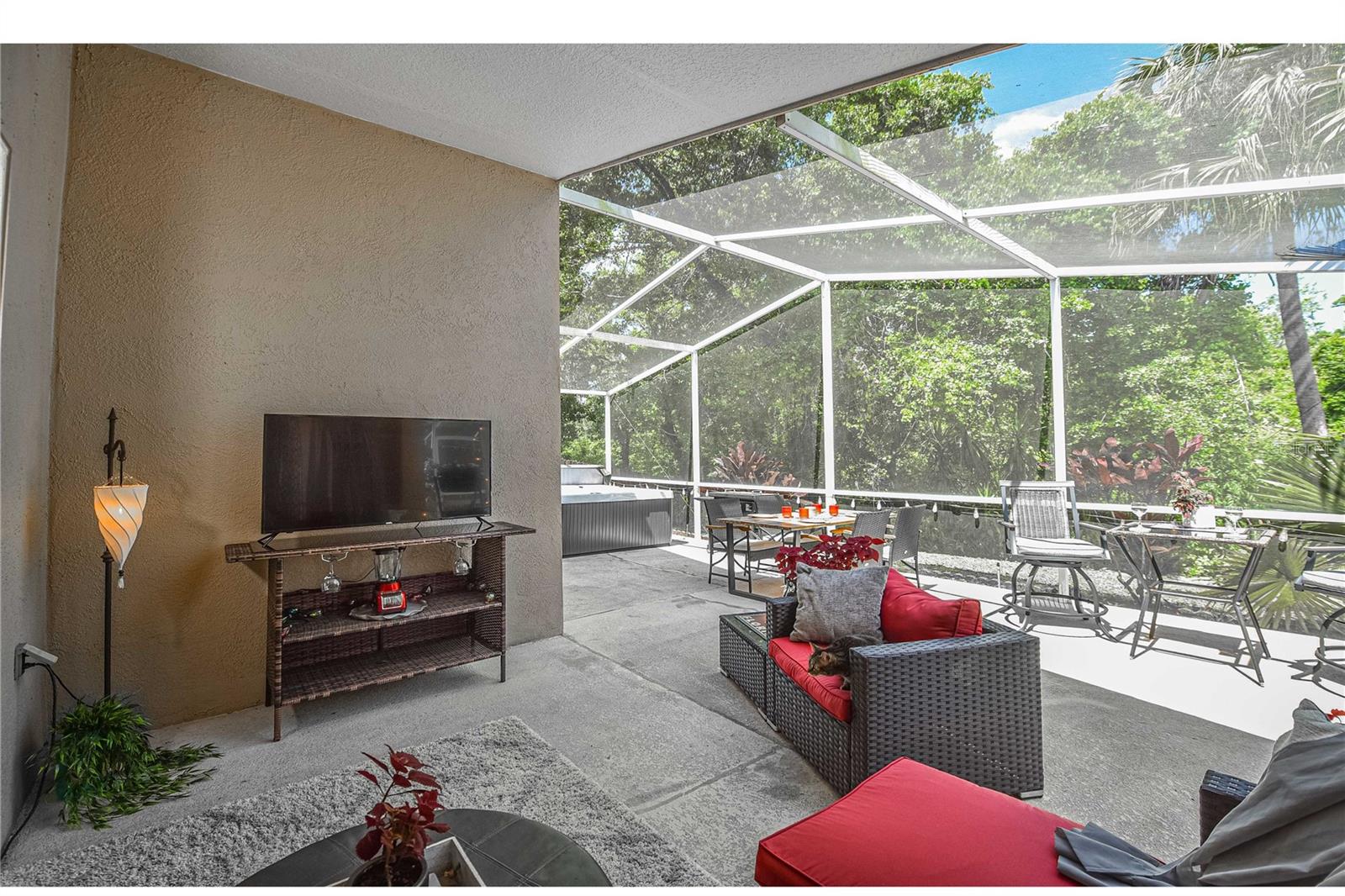 Nestled in a tranquil cul-de-sac within the sought-after Heritage Park of Bloomingdale Community, this newly updated 3-bedroom, 2-bathroom home with a large versatile vaulted office/4th bedroom overlooking conservation view. This home offers new and modern upgrades. Situated on a premium lot bordering conservation land, enjoy the serenity of nature with no current or future rear neighbors. Modern Upgrades: Brand new water heater in 2025, permitted roof was installed in 2021, and the air conditioner system installed in 2018 is still under warranty. Experience the elegance of high-end luxury vinyl plank flooring, complemented by upgraded carpet and plush padding in the bedrooms for added comfort. Freshly and professionally painted interiors that exude a clean and contemporary feel. The open-concept design boasts elevated ceilings, creating an airy and inviting atmosphere throughout the home. Generous Kitchen: The kitchen is equipped with a built-in microwave, smooth glass top range, dishwasher, twin stainless steel sinks, and ample cabinetry. Breakfast nook and breakfast bar perfect for families or entertaining. Large indoor Laundry Room off of the kitchen keeps you enjoying family time. Enjoy added privacy with a split floor plan that places the Master Suite and Office/4th Bedroom at the rear of the home, offering serene views of the peaceful conservation area. A spacious master bedroom suite features a large open floor space showered with Florida sunshine from two large windows. Oversized master bathroom offers a new water closet, garden tub, separate stand-alone shower, twin sinks and a get lost in the den sized walk in closet. The separate and equally generous Office/4th Bedroom can serve as a fourth bedroom, home office, or creative space, catering to your lifestyle needs. The homes' raised ceilings impress throughout, especially so in the cozy Office/4th Bedroom finished with wide wooden French doors. Outdoor Oasis: Step onto the expansive screened-in back patio, complete with a 2024 Dr. Wellness X-3 Spa, with 51 stainless steel jets, upgraded to include cooling or heating controls, waterfall, integrated programmable LED lights with multiple colors, Bluetooth audio system, and 6-month supply spa chemicals. Host guests in a spacious area designed for entertaining, featuring a large-screen TV, bar, pub table, six-person dining space, and a full sectional sofa with views of the yard, sunning “beach,” and lush tropical trees. Ample Storage: The oversized two-car garage comes with wall-attached shelving, providing plenty of storage solutions. Community Perks: Enjoy the low HOA fees with no lease or pet restrictions, access to top-rated local schools, and proximity to shopping, dining, Tampa's international airport and recreational facilities.