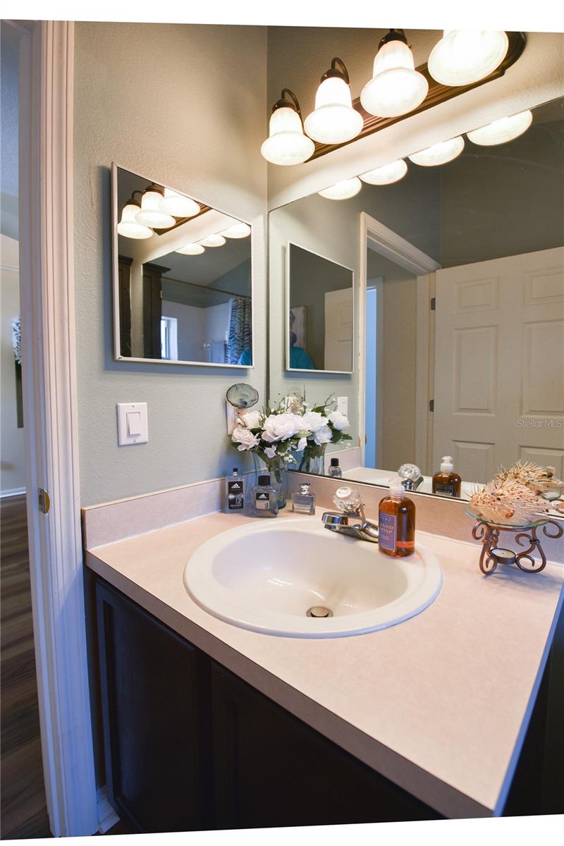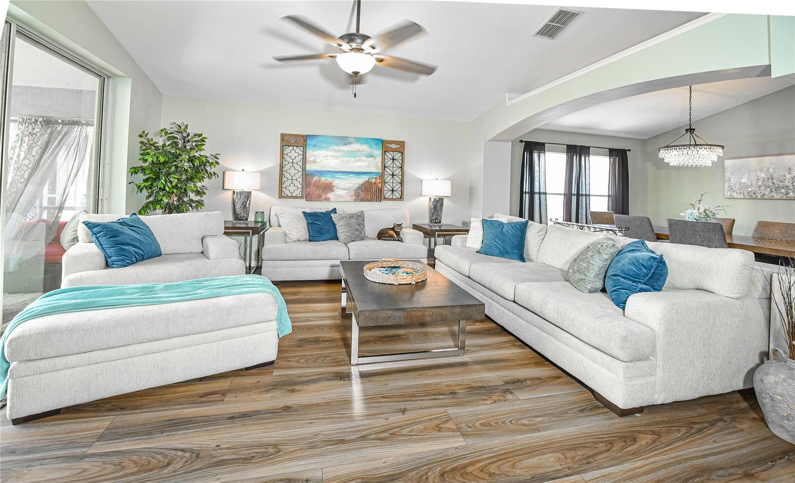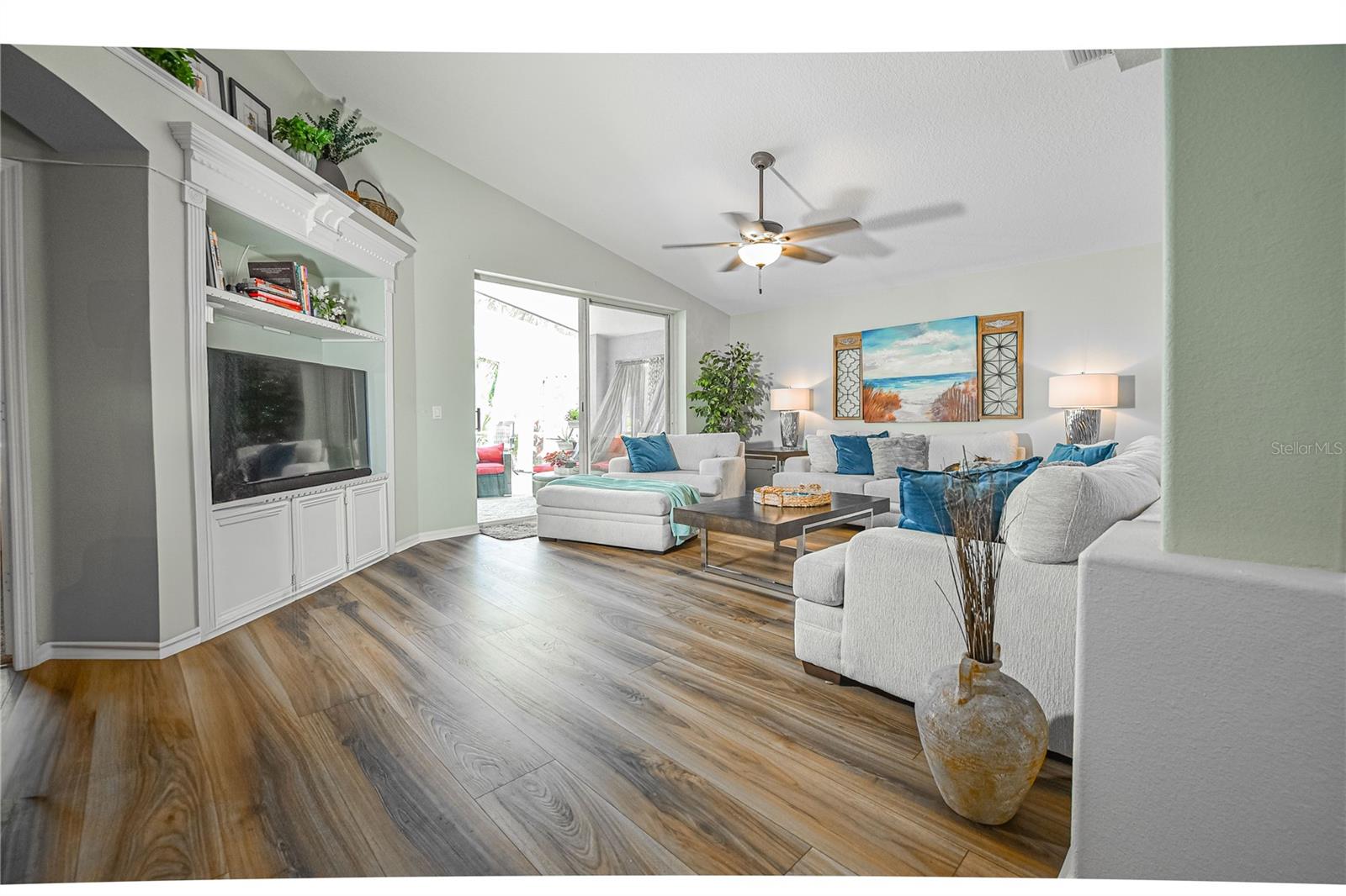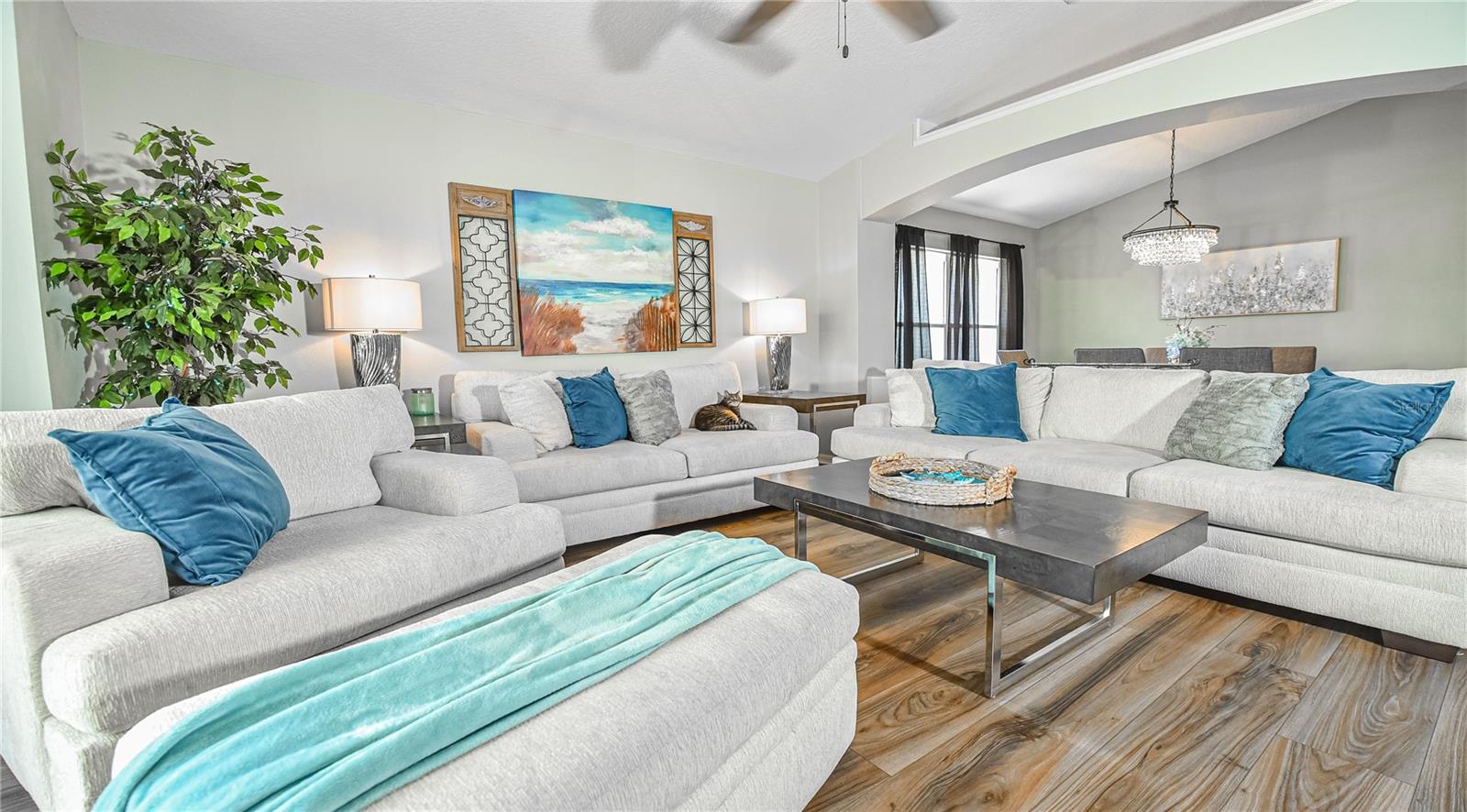 Nestled in a tranquil cul-de-sac within the sought-after Heritage Park of Bloomingdale Community, this newly updated 3-bedroom, 2-bathroom home with a large versatile vaulted office/4th bedroom overlooking conservation view. This home offers new and modern upgrades. Situated on a premium lot bordering conservation land, enjoy the serenity of nature with no current or future rear neighbors. Modern Upgrades: Brand new water heater in 2025, permitted roof was installed in 2021, and the air conditioner system installed in 2018 is still under warranty. Experience the elegance of high-end luxury vinyl plank flooring, complemented by upgraded carpet and plush padding in the bedrooms for added comfort. Freshly and professionally painted interiors that exude a clean and contemporary feel. The open-concept design boasts elevated ceilings, creating an airy and inviting atmosphere throughout the home. Generous Kitchen: The kitchen is equipped with a built-in microwave, smooth glass top range, dishwasher, twin stainless steel sinks, and ample cabinetry. Breakfast nook and breakfast bar perfect for families or entertaining. Large indoor Laundry Room off of the kitchen keeps you enjoying family time. Enjoy added privacy with a split floor plan that places the Master Suite and Office/4th Bedroom at the rear of the home, offering serene views of the peaceful conservation area. A spacious master bedroom suite features a large open floor space showered with Florida sunshine from two large windows. Oversized master bathroom offers a new water closet, garden tub, separate stand-alone shower, twin sinks and a get lost in the den sized walk in closet. The separate and equally generous Office/4th Bedroom can serve as a fourth bedroom, home office, or creative space, catering to your lifestyle needs. The homes' raised ceilings impress throughout, especially so in the cozy Office/4th Bedroom finished with wide wooden French doors. Outdoor Oasis: Step onto the expansive screened-in back patio, complete with a 2024 Dr. Wellness X-3 Spa, with 51 stainless steel jets, upgraded to include cooling or heating controls, waterfall, integrated programmable LED lights with multiple colors, Bluetooth audio system, and 6-month supply spa chemicals. Host guests in a spacious area designed for entertaining, featuring a large-screen TV, bar, pub table, six-person dining space, and a full sectional sofa with views of the yard, sunning “beach,” and lush tropical trees. Ample Storage: The oversized two-car garage comes with wall-attached shelving, providing plenty of storage solutions. Community Perks: Enjoy the low HOA fees with no lease or pet restrictions, access to top-rated local schools, and proximity to shopping, dining, Tampa's international airport and recreational facilities.