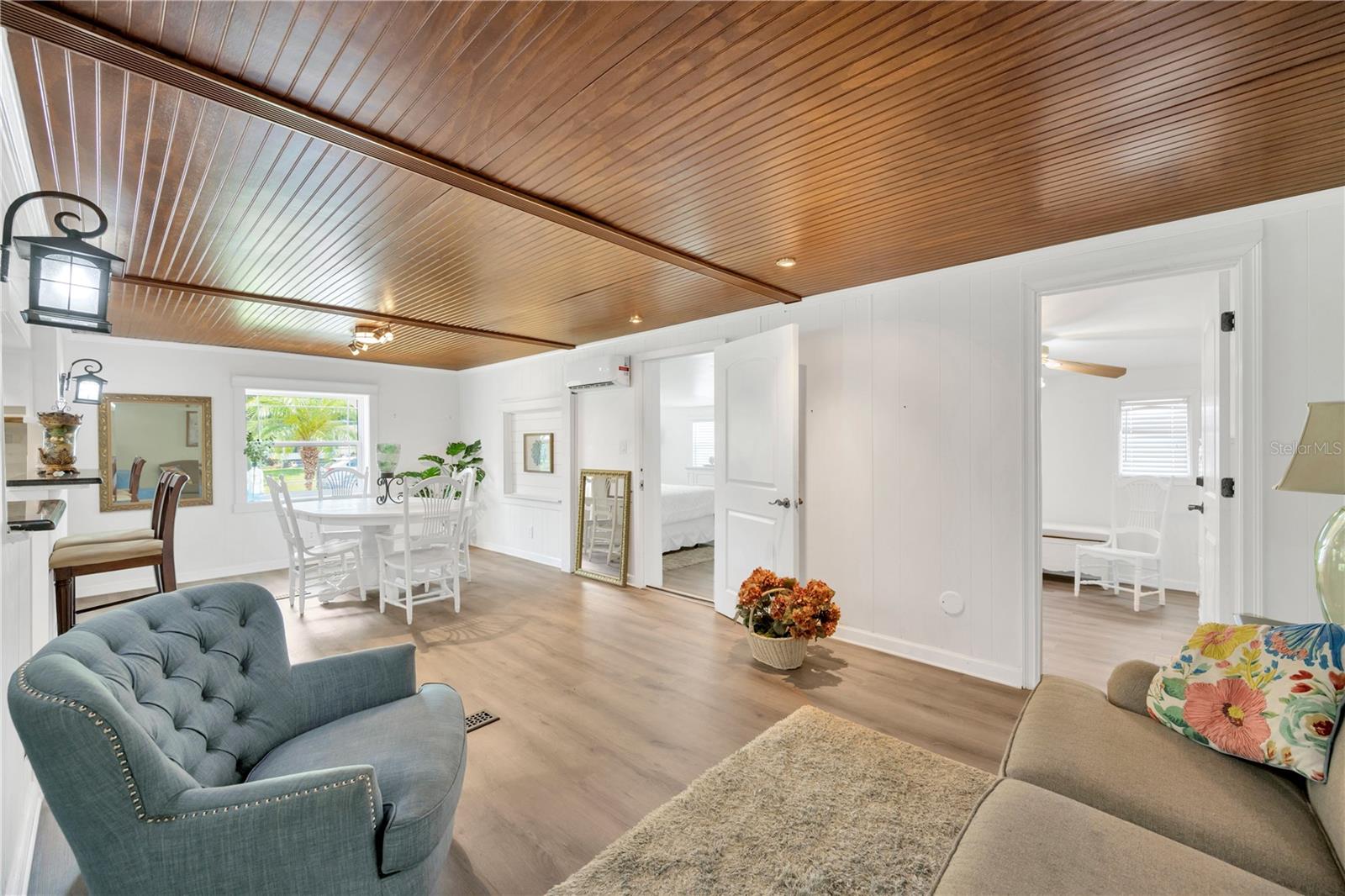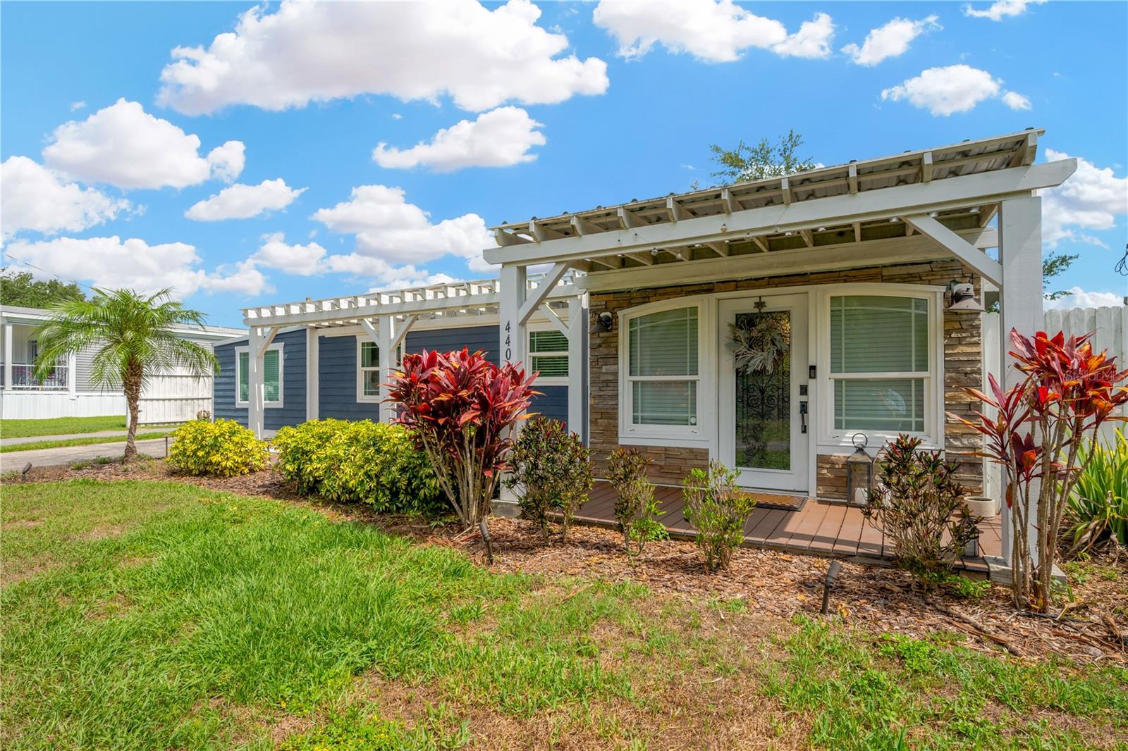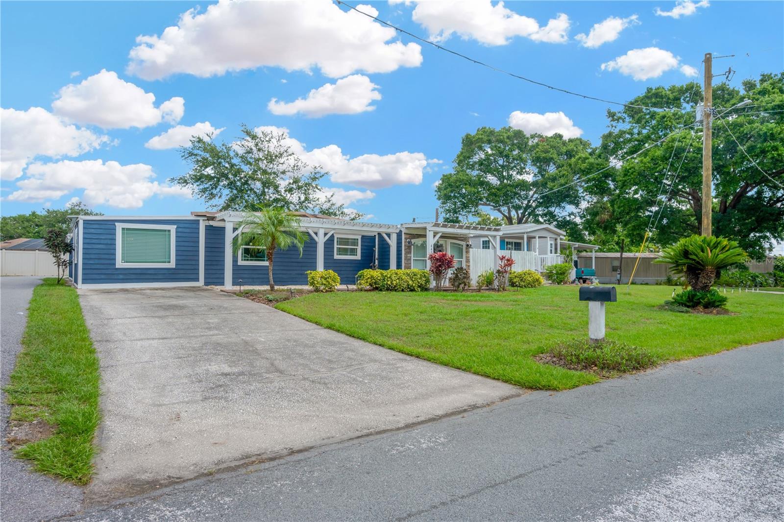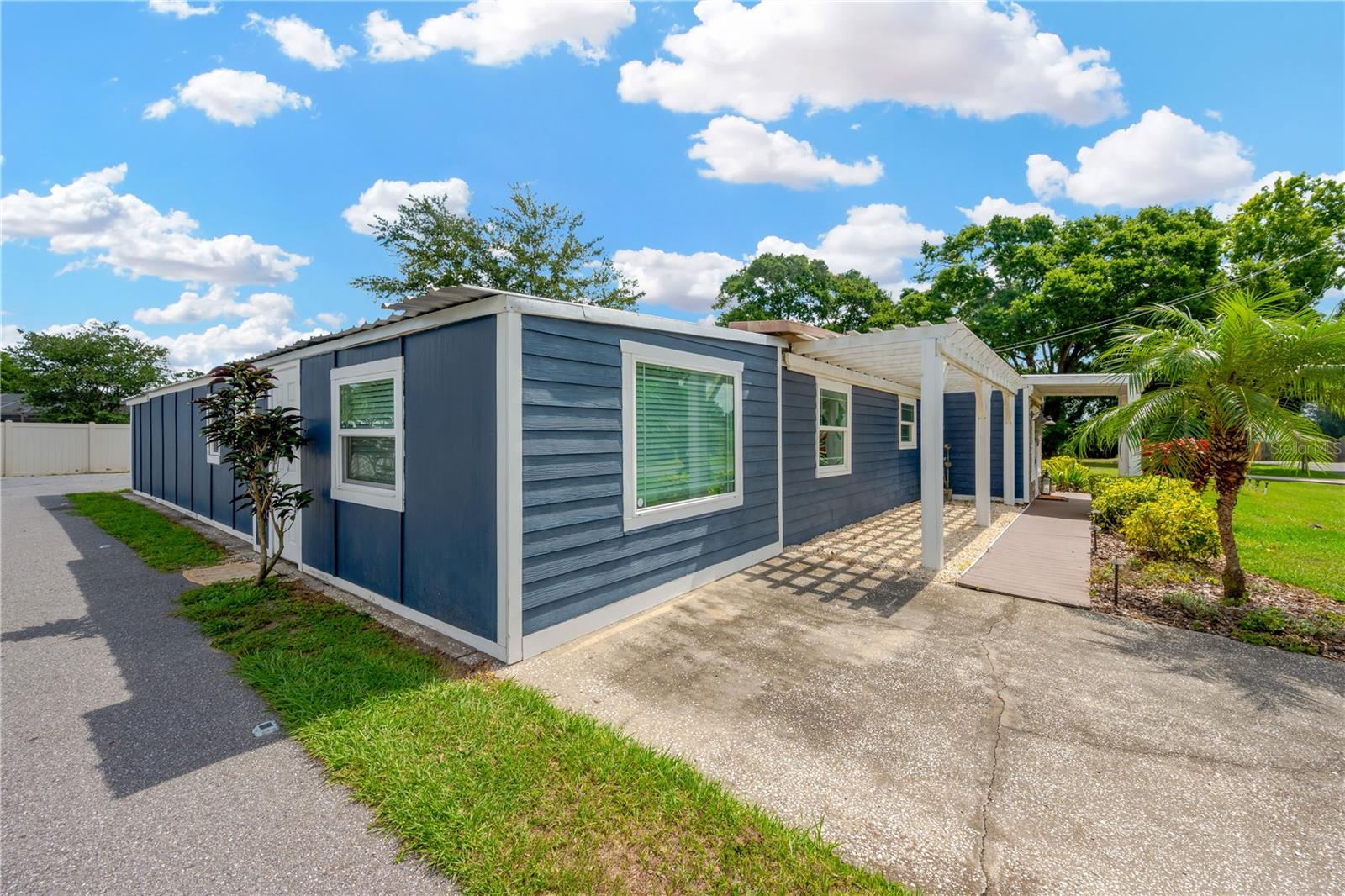 Tucked away on a quiet, dead-end drive off Durant Road lies a hidden gem —No Lot fees, No CDD Fees, No HOA fees, and city water. This peaceful enclave is meticulously maintained manufactured homes, each nestled on spacious, manicured lots. This particular home radiates French Country charm and must be seen to be fully appreciated. Florida-friendly landscaping and a durable composite deck pathway welcome you to the inviting front porch and leaded glass entry door. Step inside to a warm and welcoming 12' x 23' family room, featuring NuCore cork-backed waterproof flooring, a stylish light fixture, shiplap accent wall, and a convenient exterior door that opens to a serene side garden. The kitchen is a true highlight — generously sized and thoughtfully designed with GE Profile stainless steel appliances, durable pine countertops, solid wood white cabinetry and a stunning cast iron porcelain farmhouse sink. Two custom-built pantries and a central broom closet offer exceptional storage, while a granite breakfast bar provides extra seating and flows seamlessly into the spacious dining and living room. There is a stunning beadboard wood ceiling, crown molding and creamy white painted shiplap walls for added character throughout this home. The private primary suite is a retreat unto itself, complete with an impressive 12' x 14' walk-in closet, an en-suite bathroom, and private exterior access to the private backyard. The bathroom features a jacuzzi tub with hand shower, a generous vanity with ample storage, and a closet concealing a full-sized washer and dryer. A secondary bedroom (15' x 11') offers its own private exterior entrance — ideal for an adult child, roommate or even a home office. A flexible bonus room with a built-in closet is divided by elegant glass French doors, adding even more versatility to the floor plan. Exterior upgrades include durable Hardie board siding, 8" thick walls, and energy-efficient PGT EnergyVue vinyl windows with Low-E insulated glass (2019). The ductless mini-split AC/Heating system (2021) ensures year-round comfort, and the waterproof NuCore® flooring with hypoallergenic cork padding (installed in 2019) adds beauty, quiet, and durability throughout the home. The durable metal roof still has many years of life remaining, contributing to this home's truly low-maintenance appeal. Most of the furniture will be left there. NO FHA Financing allowed!