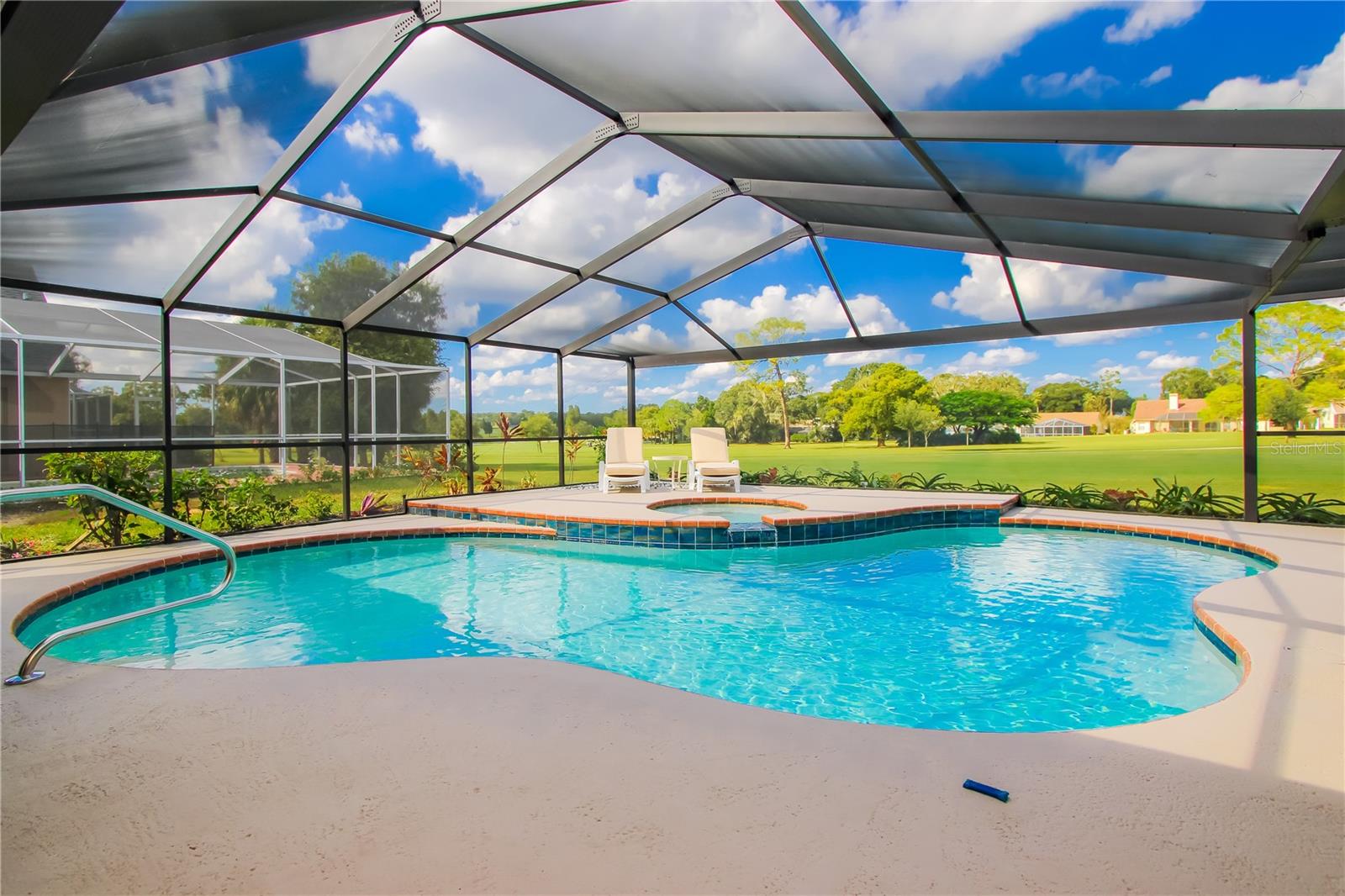 Discover this beautifully updated 4 bed/3 bath pool home with a three-way split plan, perched on the par-3 12th hole of Buckhorn Golf & Country Club. Step inside to soaring vaulted ceilings above a sunlit living room and adjacent dining area. The kitchen dazzles with new 42" white cabinets, pull-out drawers, black stainless appliances, upgraded granite, a pass-through to the lanai, and a breakfast bar for five beside a cozy nook and pantry. At the heart of the home, the vaulted family room features an electric fireplace wrapped in floor-to-ceiling designer marble brick and a built-in media cabinet. A sliding glass door opens to your private oasis: a fully screened lanai with breathtaking “picture window” golf views, resurfaced Pebble Tec pool, and freshly painted deck. The spacious primary suite flows into a spa-style bath with clawfoot tub, glass shower, dual sinks, granite vanity, and walk-in closet. Three additional bedrooms offer flexible sleeping or home office options, all with ceiling fans and closets. Two updated baths include glass shower doors, one with pool access. Roof replaced 2022; front crank double-pane windows 2022. Remaining windows and main slider upgraded 2023–2024. Interior/exterior painted 2023; pool pump replaced 2023; kitchen cabinets upgraded 2024. Professionally landscaped. Quiet Brandon location in A-rated school zone. Low HOA. Close to shops, dining, and major roads.. A very rare find. Call Barb for an appointment.