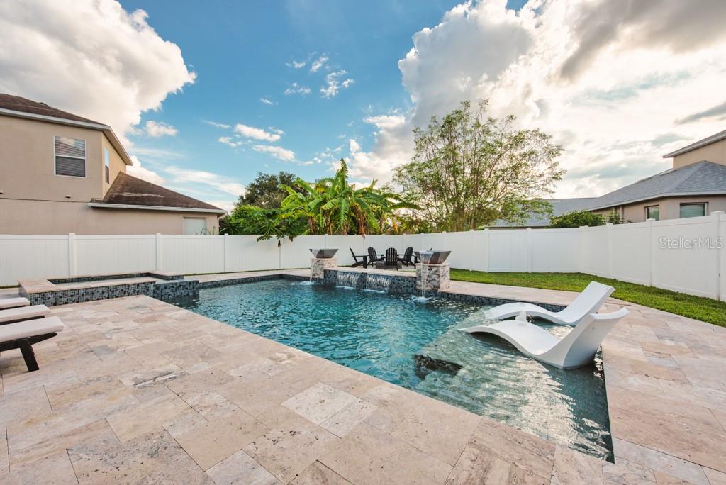 A backyard oasis, a beautifully updated interior, and a true sense of privacy come together in this move-in-ready 3-bedroom, 2.5-bath pool home with a 3-car garage. Set on a spacious fenced yard, the property showcases a brand-new custom pool surrounded by a stunning travertine deck, 6" travertine drains, an electric and propane heater, and a Pebble Sheen finish backed by a lifetime warranty—perfect for year-round Florida living. Step inside to warm hardwood floors, fresh exterior paint, and thoughtful upgrades throughout. The main level offers a dedicated office, a formal dining room, and a well-designed kitchen featuring granite countertops, a large island, tile backsplash, and a generous walk-in pantry. The first-floor laundry adds everyday convenience. Upstairs, the primary suite feels like a private retreat with double vanities, a walk-in shower, and a spacious walk-in closet. Two additional bedrooms and the updated full bath provide plenty of room for family or guests. Major improvements bring peace of mind, including a 2024 roof, a Culligan whole-home water system, new tankless water heater, and a newer HVAC system. And with no CDD fees, long-term affordability is built right in. Whether you’re hosting gatherings by the pool, working comfortably from home, or settling into a meticulously upgraded space, this home delivers style, function, and lasting value. ***FREE 1/0 Rate Buydown when using the seller's preferred lender!***