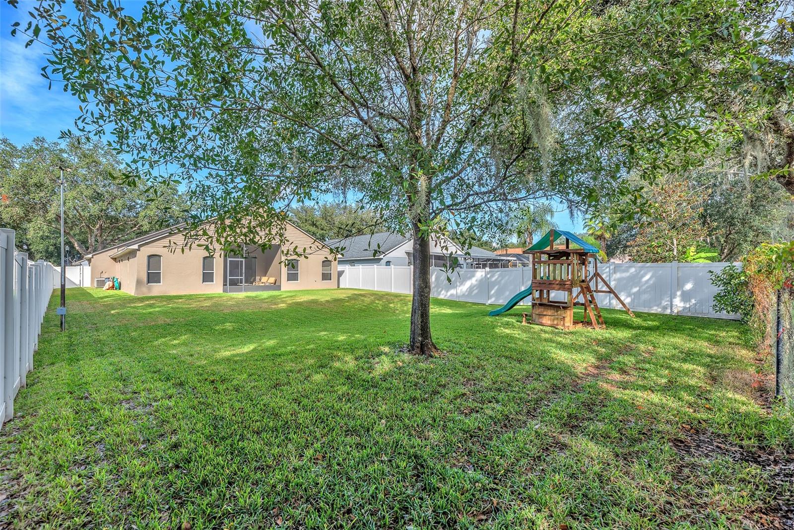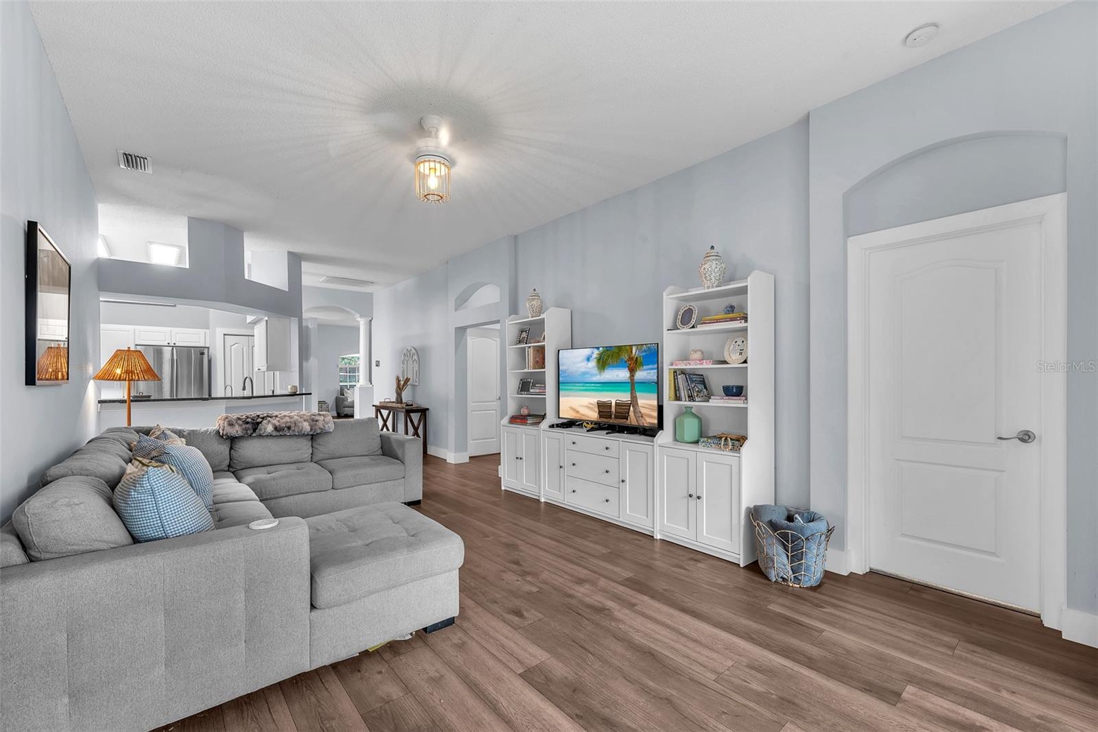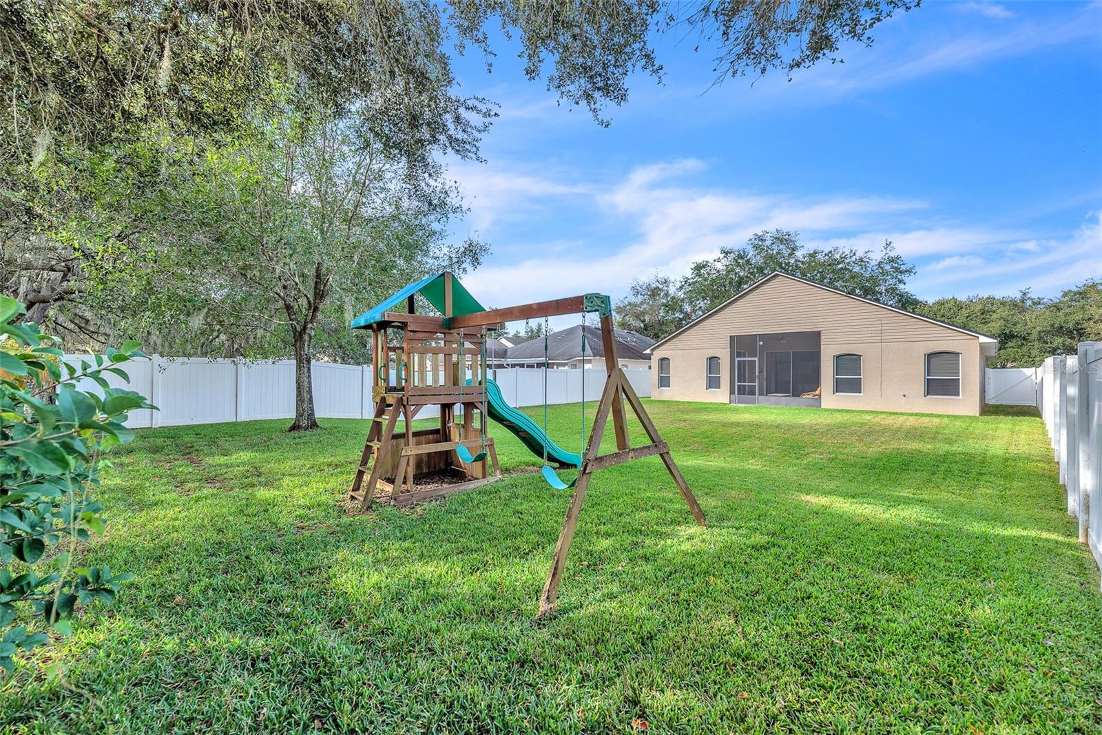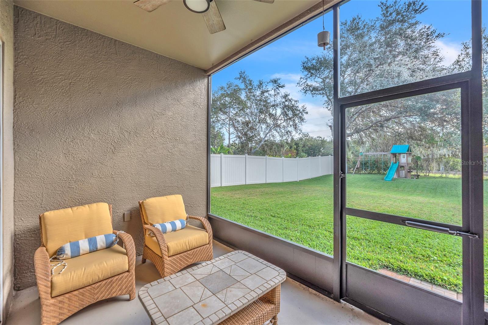 Welcome to your own private paradise in the heart of Twin Lakes. This beautifully maintained 4-bedroom, 2-bath home offers 2,082 square feet of comfortable living space and a spacious 2-car garage, perfect for golf-cart storage or weekend projects. Inside, the bright open-concept floorplan features tile flooring in the main living areas, vaulted ceilings, and a flowing layout designed for easy everyday living and effortless entertaining. The formal living room offers a cozy, classic touch with its vaulted ceiling, decorative archway, and lvp flooring. The sunny eat-in kitchen is the heart of the home, equipped with granite countertops, solid wood cabinetry, stainless steel appliances, a glass cooktop range, closet pantry, built-in planning desk, and a generous snack bar. A cheerful bay-window nook adds the perfect spot for morning coffee or a small desk setup. From both the kitchen and family room, large sliding glass doors provide peaceful views of the screened patio and spacious backyard, creating a relaxing retreat for outdoor lounging, cookouts, or gatherings. The primary suite is a true getaway with private patio access, vaulted ceilings, and a spa-inspired ensuite featuring a granite double-sink vanity, soaking tub, and frameless glass-enclosed shower. All secondary bedrooms offer vaulted ceilings and roomy closets, making them ideal for family, guests, or a home office. The laundry room includes custom cabinets for extra storage and organization. Located in the highly sought-after Twin Lakes community, residents enjoy top rated schools and fantastic amenities including a community pool, lakes, playground, basketball courts, and tennis courts. This home also offers unbeatable convenience to schools, shopping, great restaurants, I-75, and the Crosstown Expressway. Tampa International Airport and the Tampa Riverwalk are just 45 minutes away. Move-in ready, beautifully maintained, and perfectly positioned—this home truly has it all.