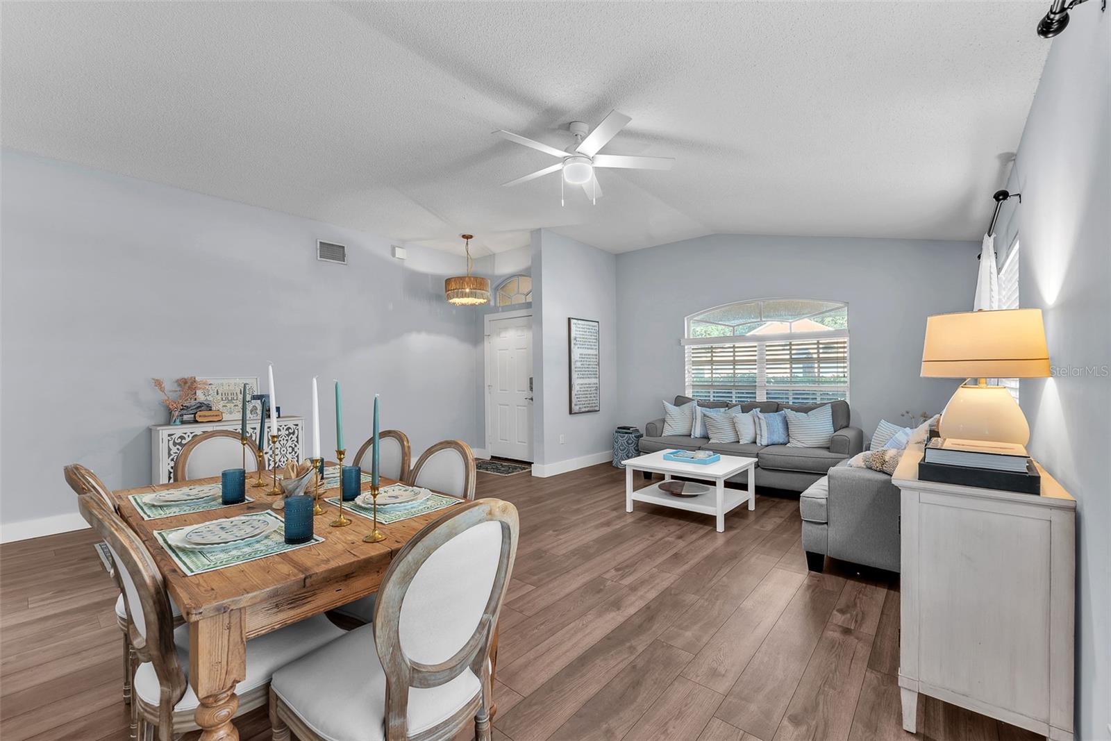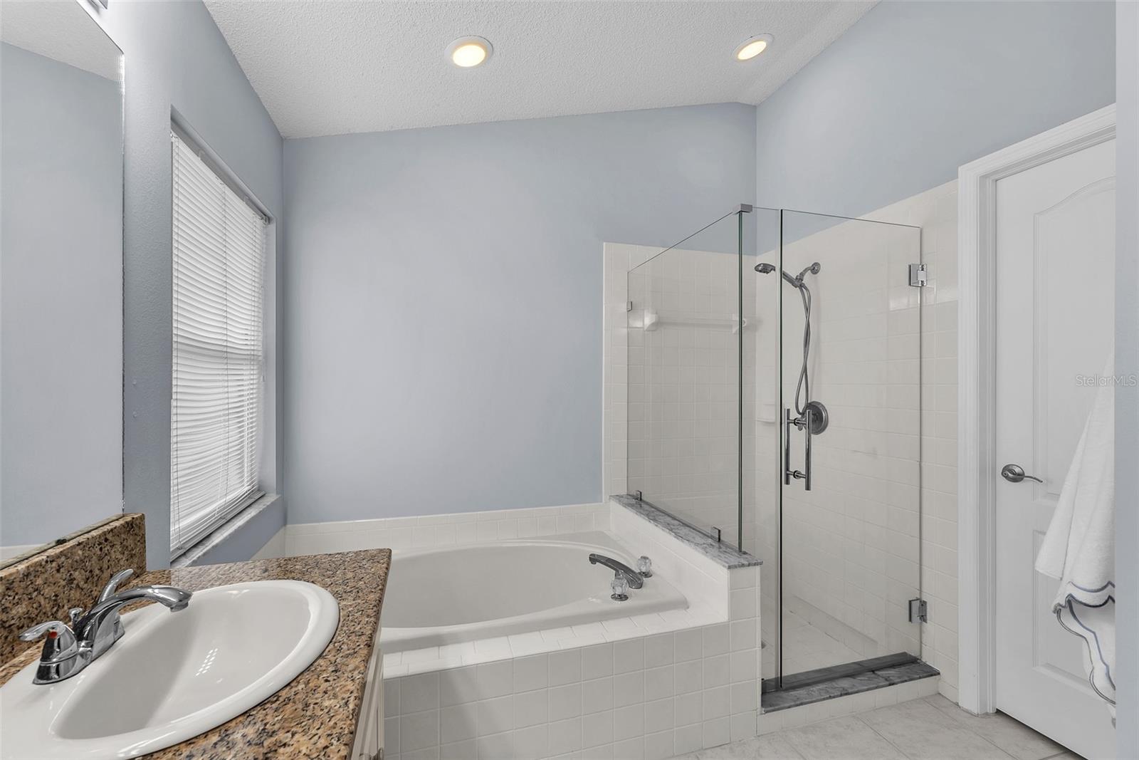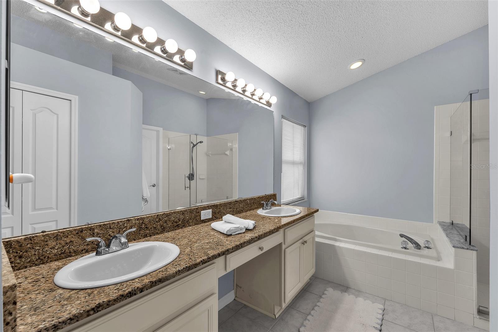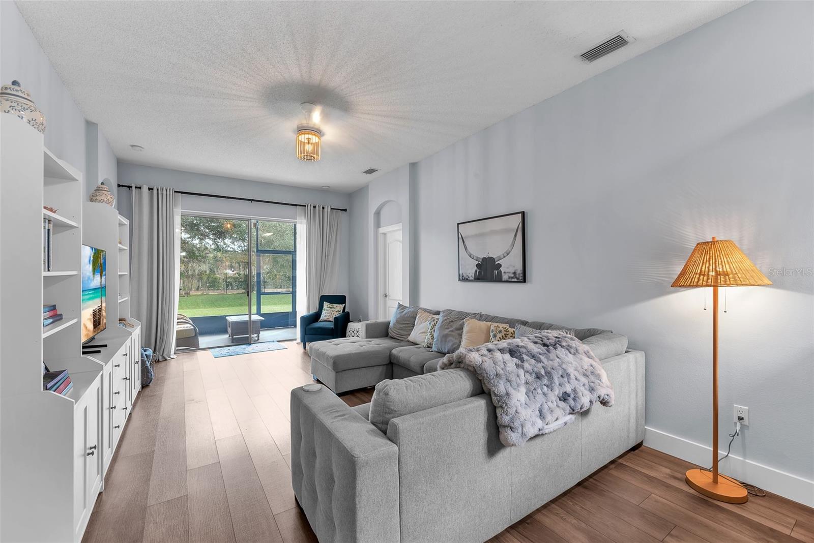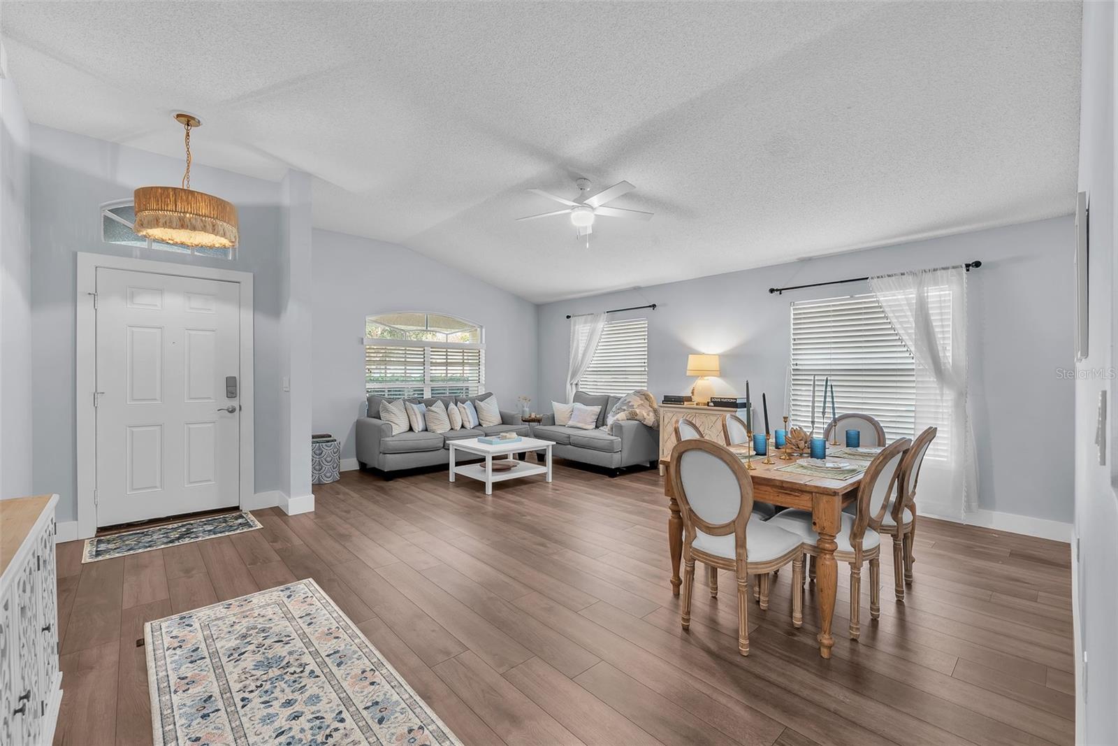 Welcome to your own private paradise in the heart of Twin Lakes. This beautifully maintained 4-bedroom, 2-bath home offers 2,082 square feet of comfortable living space and a spacious 2-car garage, perfect for golf-cart storage or weekend projects. Inside, the bright open-concept floorplan features tile flooring in the main living areas, vaulted ceilings, and a flowing layout designed for easy everyday living and effortless entertaining. The formal living room offers a cozy, classic touch with its vaulted ceiling, decorative archway, and lvp flooring. The sunny eat-in kitchen is the heart of the home, equipped with granite countertops, solid wood cabinetry, stainless steel appliances, a glass cooktop range, closet pantry, built-in planning desk, and a generous snack bar. A cheerful bay-window nook adds the perfect spot for morning coffee or a small desk setup. From both the kitchen and family room, large sliding glass doors provide peaceful views of the screened patio and spacious backyard, creating a relaxing retreat for outdoor lounging, cookouts, or gatherings. The primary suite is a true getaway with private patio access, vaulted ceilings, and a spa-inspired ensuite featuring a granite double-sink vanity, soaking tub, and frameless glass-enclosed shower. All secondary bedrooms offer vaulted ceilings and roomy closets, making them ideal for family, guests, or a home office. The laundry room includes custom cabinets for extra storage and organization. Located in the highly sought-after Twin Lakes community, residents enjoy top rated schools and fantastic amenities including a community pool, lakes, playground, basketball courts, and tennis courts. This home also offers unbeatable convenience to schools, shopping, great restaurants, I-75, and the Crosstown Expressway. Tampa International Airport and the Tampa Riverwalk are just 45 minutes away. Move-in ready, beautifully maintained, and perfectly positioned—this home truly has it all.