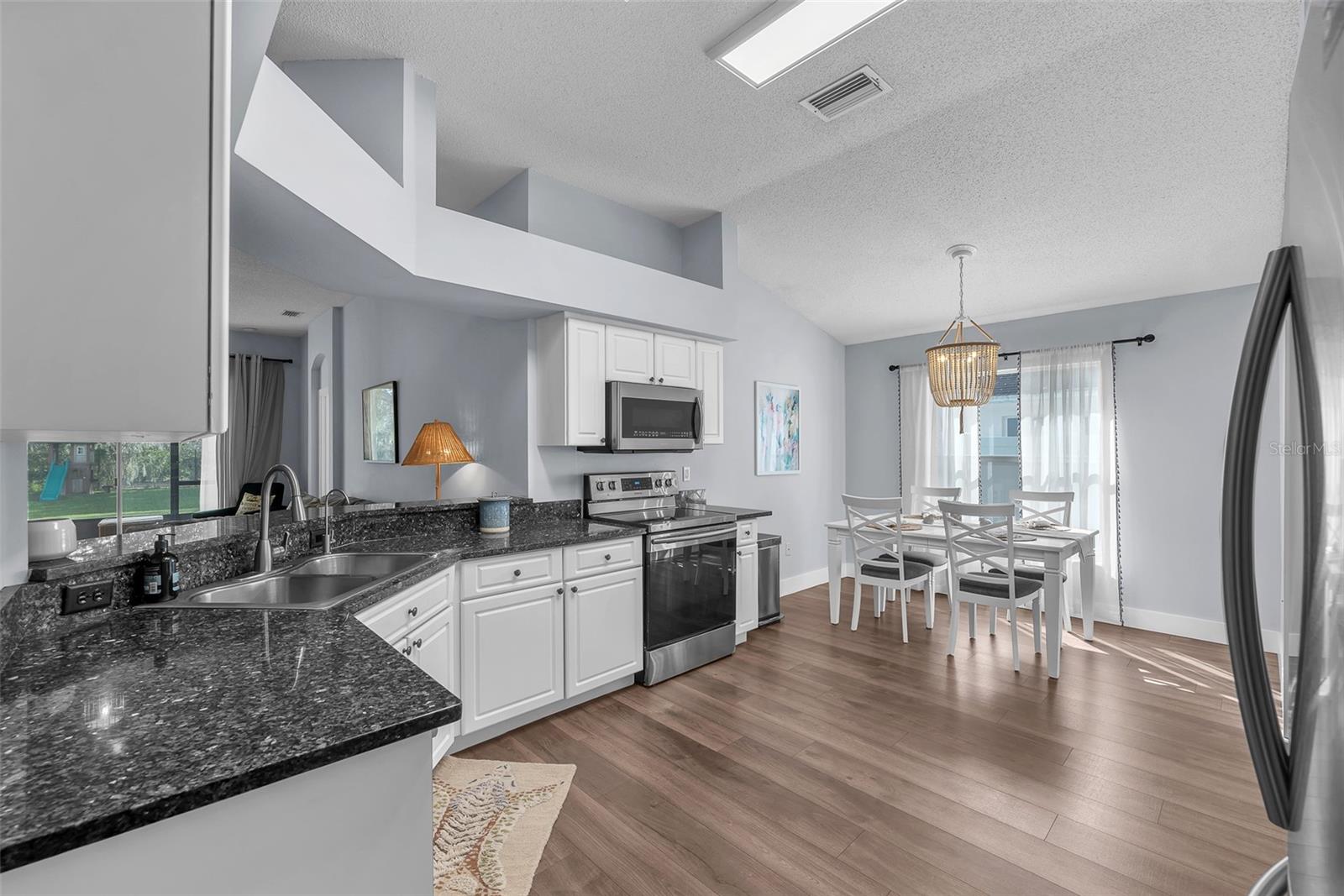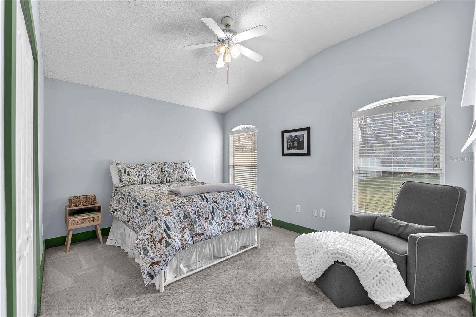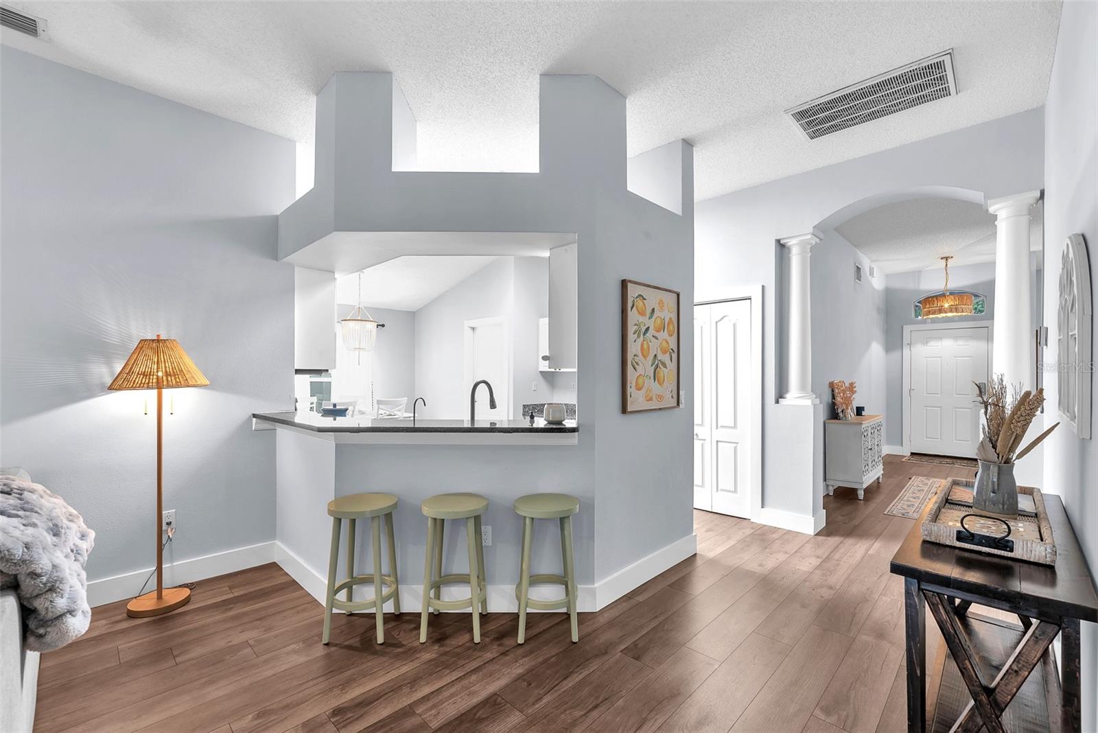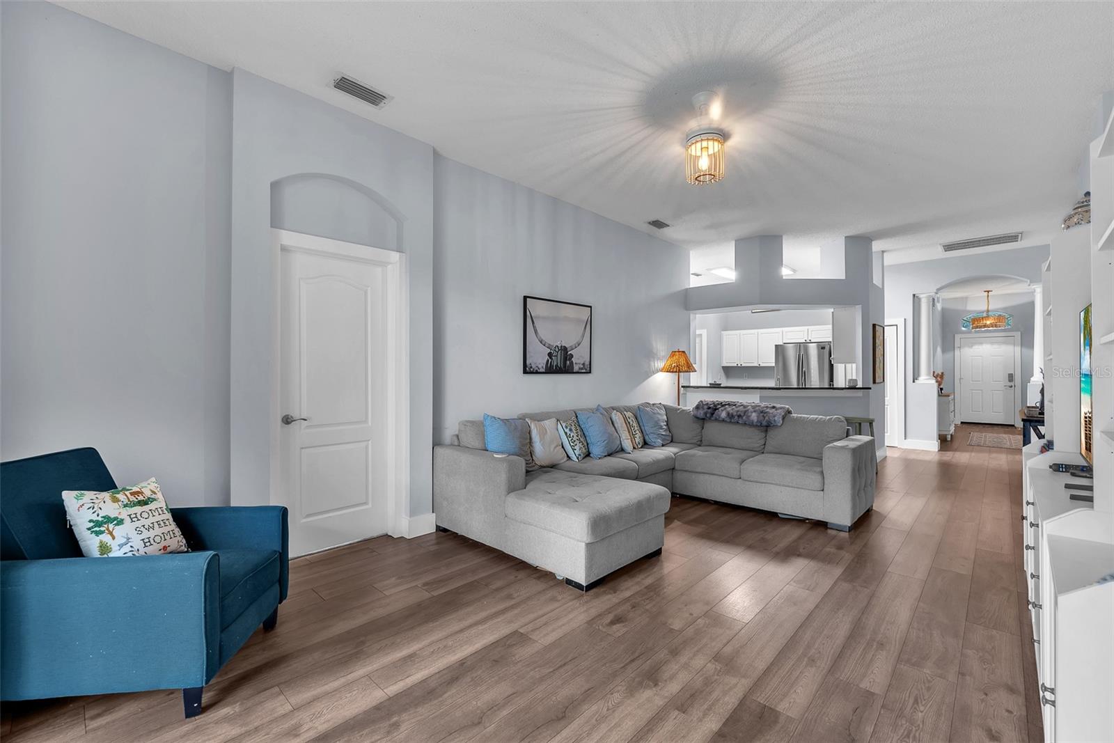 Welcome to your own private paradise in the heart of Twin Lakes. This beautifully maintained 4-bedroom, 2-bath home offers 2,082 square feet of comfortable living space and a spacious 2-car garage, perfect for golf-cart storage or weekend projects. Inside, the bright open-concept floorplan features tile flooring in the main living areas, vaulted ceilings, and a flowing layout designed for easy everyday living and effortless entertaining. The formal living room offers a cozy, classic touch with its vaulted ceiling, decorative archway, and lvp flooring. The sunny eat-in kitchen is the heart of the home, equipped with granite countertops, solid wood cabinetry, stainless steel appliances, a glass cooktop range, closet pantry, built-in planning desk, and a generous snack bar. A cheerful bay-window nook adds the perfect spot for morning coffee or a small desk setup. From both the kitchen and family room, large sliding glass doors provide peaceful views of the screened patio and spacious backyard, creating a relaxing retreat for outdoor lounging, cookouts, or gatherings. The primary suite is a true getaway with private patio access, vaulted ceilings, and a spa-inspired ensuite featuring a granite double-sink vanity, soaking tub, and frameless glass-enclosed shower. All secondary bedrooms offer vaulted ceilings and roomy closets, making them ideal for family, guests, or a home office. The laundry room includes custom cabinets for extra storage and organization. Located in the highly sought-after Twin Lakes community, residents enjoy top rated schools and fantastic amenities including a community pool, lakes, playground, basketball courts, and tennis courts. This home also offers unbeatable convenience to schools, shopping, great restaurants, I-75, and the Crosstown Expressway. Tampa International Airport and the Tampa Riverwalk are just 45 minutes away. Move-in ready, beautifully maintained, and perfectly positioned—this home truly has it all.