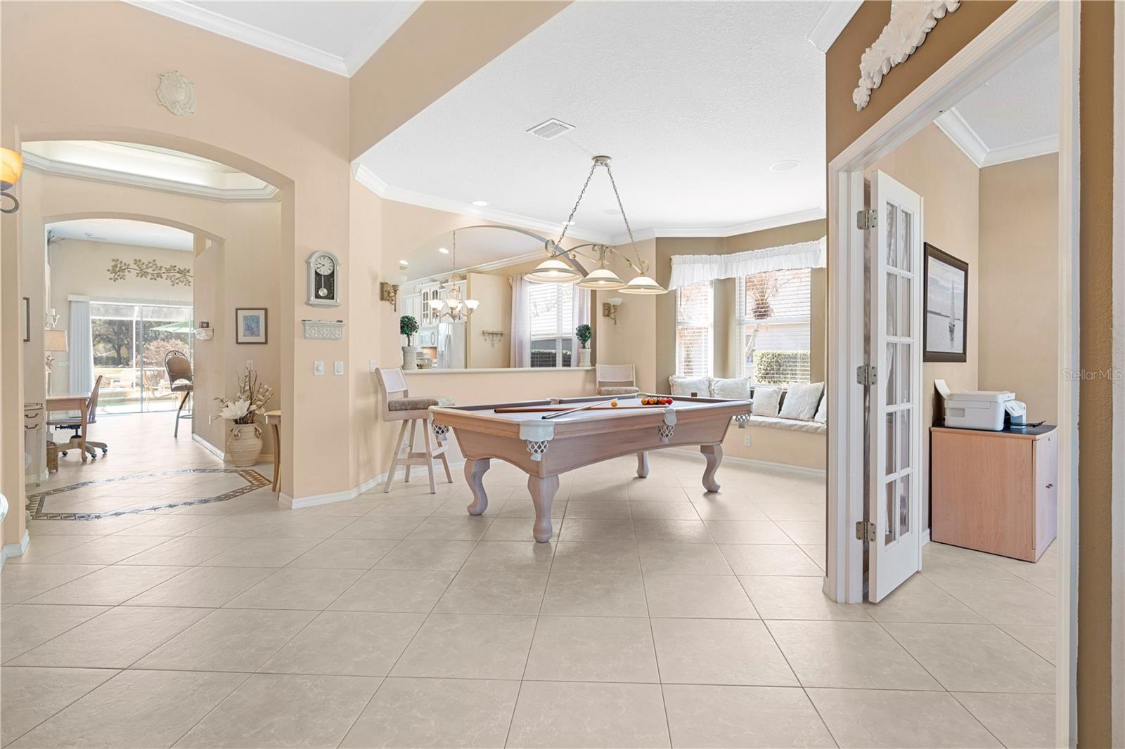 Located within the prestigious, gated community of River Hills Golf & Country Club, this premium lot, double beveled glass entrance doors, meticulously maintained 3-bedroom, den & 2-bath residence offers the perfect blend of privacy, comfort, and exceptional golf course living. Ideally situated with no rear neighbors, the home showcases sweeping views of lush fairways, pond, creating a serene and picturesque backdrop. Designed for both relaxation and entertaining, the screened-in pool and spa provide the ultimate Florida lifestyle experience—perfect for enjoying peaceful evenings or hosting guests year-round. Inside, the thoughtfully designed floor plan features high ceilings, fireplace, crown molding, an octagonal, multi tray ceiling with recessed lighting in hallway, spacious living areas enhanced by a surround sound system, creating an inviting atmosphere throughout. A dedicated den with glass French doors offers the ideal space for a home office, media room, or flexible living area to suit your needs. Dining room designed with a bench seat bay window overlooking a pond, with wall sconces for more architectural interest. An eat in kitchen & a dinette area flows seamlessly into the main living spaces, with an additional peninsula making everyday living and entertaining effortless. The private primary suite serves as a tranquil retreat, with two huge walk-in closets, tinted windows with silhouette shades, wall sconces, and glass French doors opening into the lanai. Two additional bedrooms provide comfortable accommodations with queen size Murphy beds for family or guests, all with California Closet style closets and central vacuuming throughout the home. A rare 2.5-car garage offers ample room for a golf cart, workshop, or additional storage. Additional highlights include a brand-new roof and the added convenience of being offered furnished—making this truly a move-in-ready opportunity. Enjoy the security, exclusivity, and elevated lifestyle that come with living in one of the area’s most sought-after golf course communities.