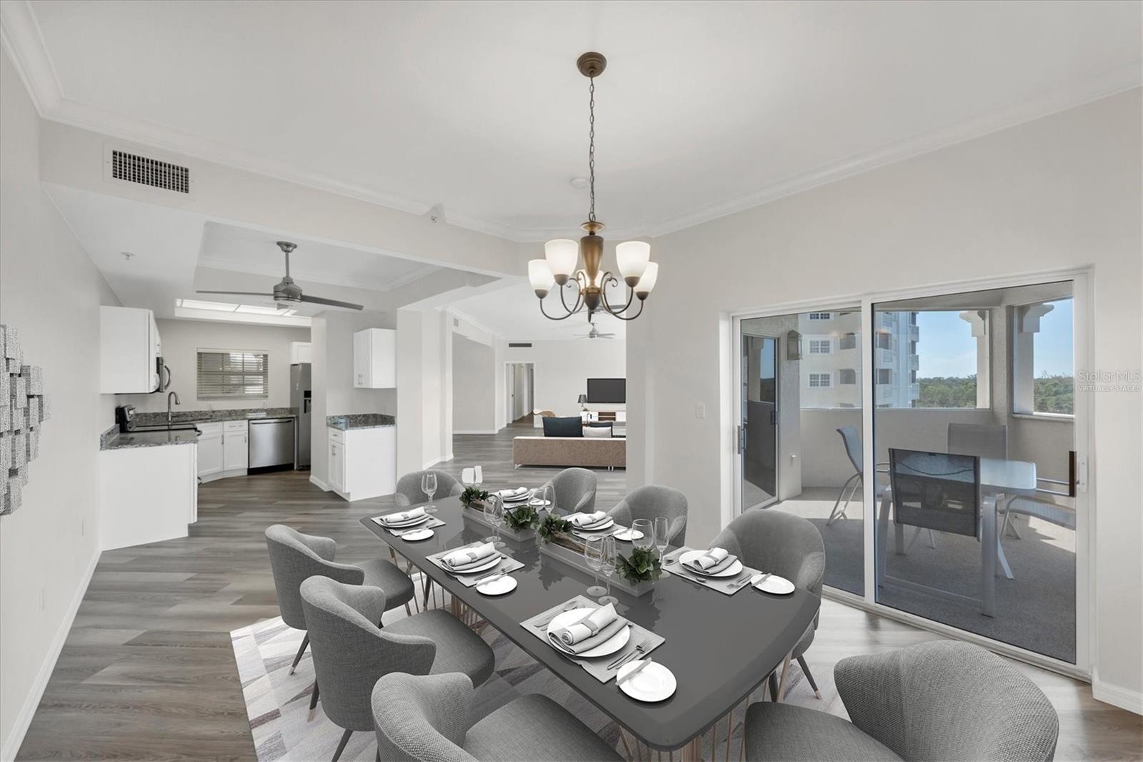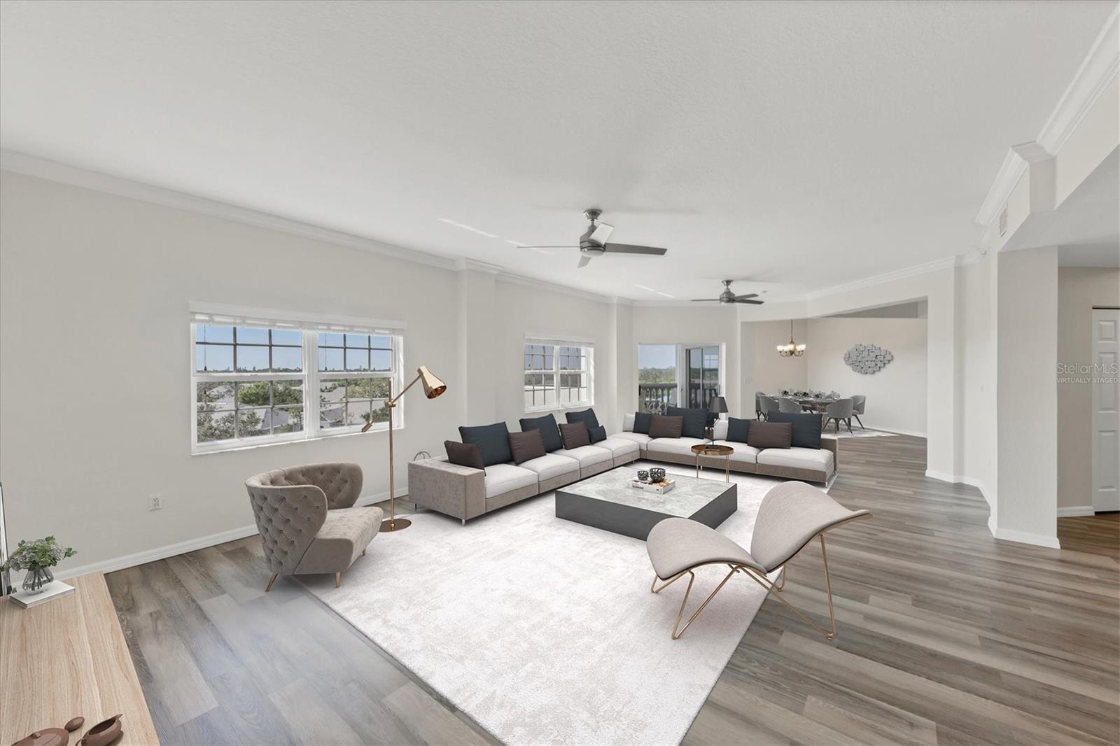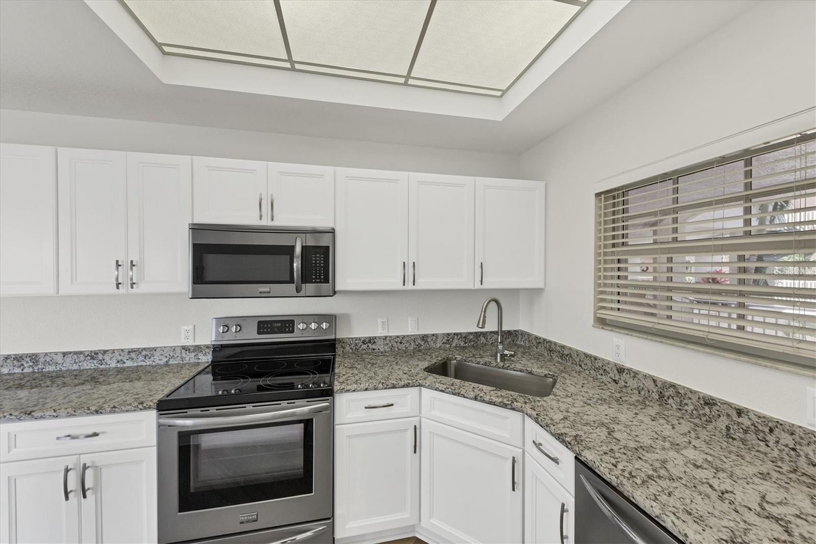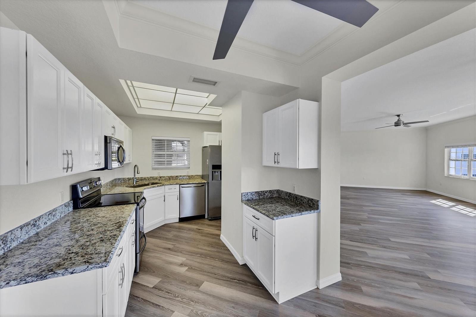 One or more photo(s) has been virtually staged. Price Improvement! Newly renovated! New kitchen with granite counters, new flooring, new paint, new ceiling fans. Spectacular sunsets are abundant at this lovely, spacious condominium at Whittier Manor at Jacaranda Trace, a premier 55-plus gated community in Venice. This unusually large 2,212-square-foot, three-bedroom, two-full-bath unit offers a spacious, open floor plan with amazing views and an abundance of natural light. As you enter the unit, you are wowed by the open space living room/dining room which not only offers breathtaking and unobstructed views of the surrounding area but also a multitude of possibilities for entertaining family and friends. Large sliders off the dining area lead to a screened outdoor balcony, perfect for enjoying the outdoors and those spectacular Florida sunsets. To the right of the entrance, you will find the kitchen with a large pantry for storage which leads to the dining area. A corridor separates the living area from the bedroom area and leads to the rest of the unit. Living areas are vinyl plank and tile flooring. Did we mention the fabulous laundry room with plenty of room to hang and fold laundry, or the ample storage room for the storage of your extra belongings and luggage? At the end of the corridor, you will find the spacious master bedroom with two immensely large walk-in closets; the en-suite bath has both a shower stall as well as a bathtub. An adjoining bedroom is bordered by six foot sliders which lead to a large, screened-in balcony. Imagine enjoying your morning coffee as you read the paper and do the crossword puzzle in total privacy. An additional guest bedroom – perfect for visiting family or out of town guests – completes the unit. Jacaranda Trace is a premier 55-plus senior community with plenty of amenities and activities. The monthly condominium fee covers basic cable, water and sewer, hot water, annual window washing, building maintenance and repairs, routine dryer vent cleaning, and a semi-annual AC check and filter replacement. Great location in Venice near restaurants, shopping, services, parks, the renowned Audubon Rookery, the Jacaranda Library, golf courses, marinas and the spectacular Gulf beaches of Venice, Manasota and Englewood. Live your best life, starting today!
