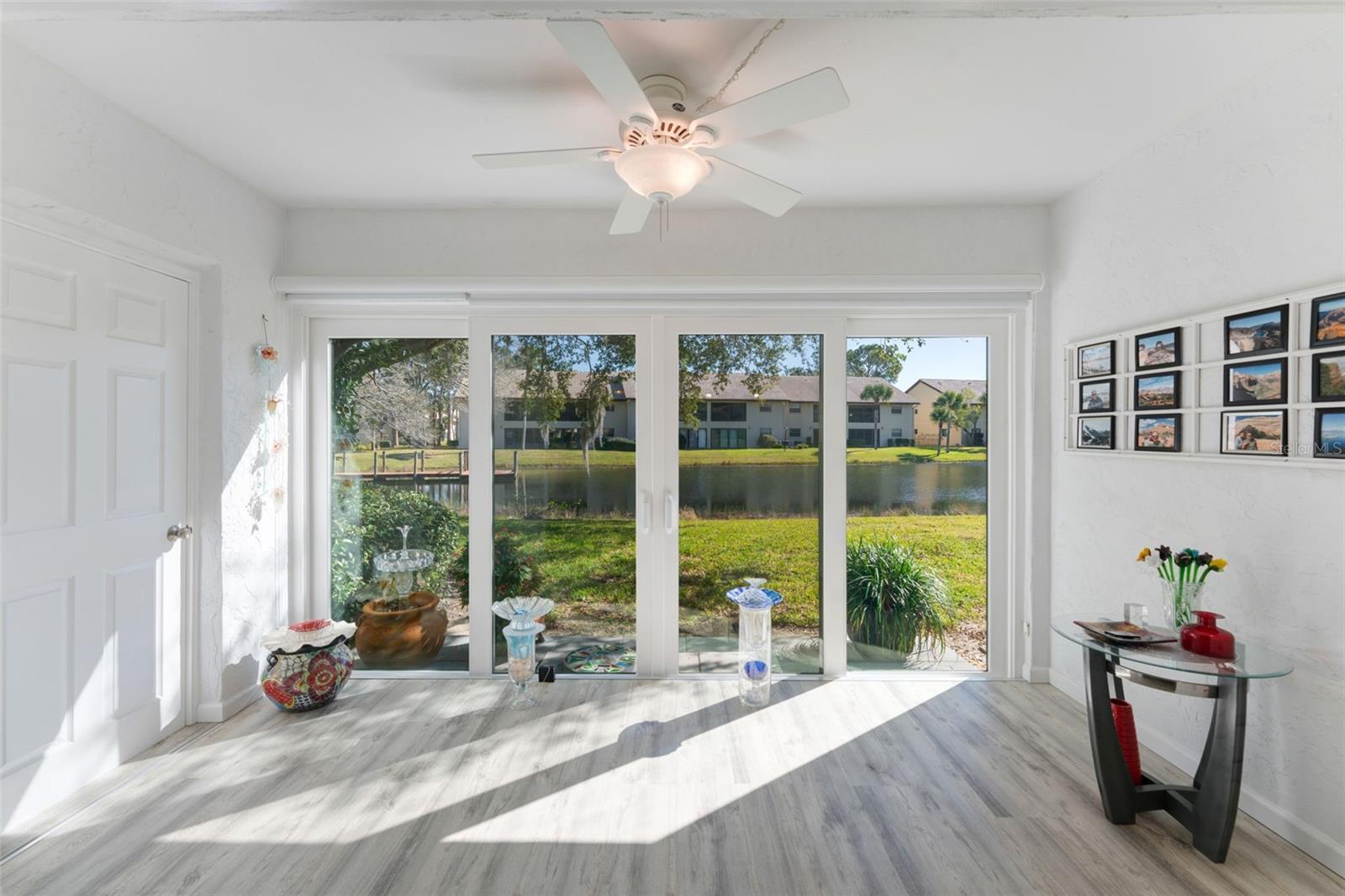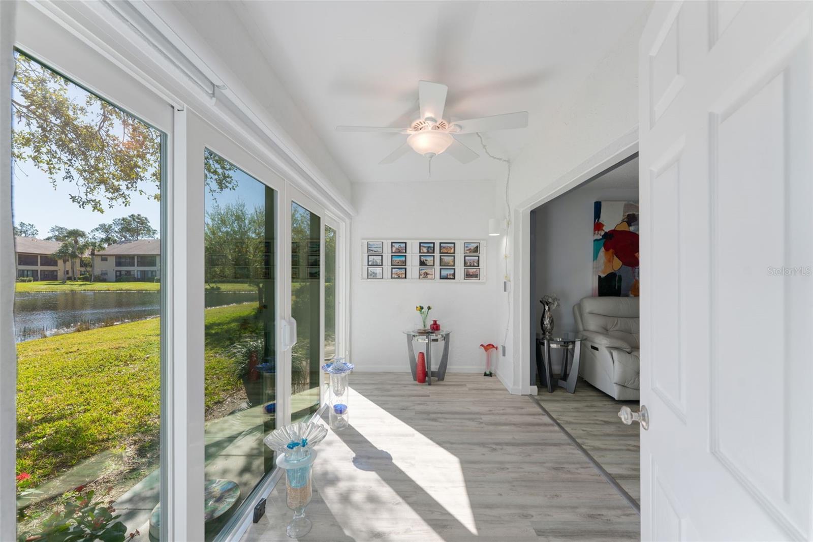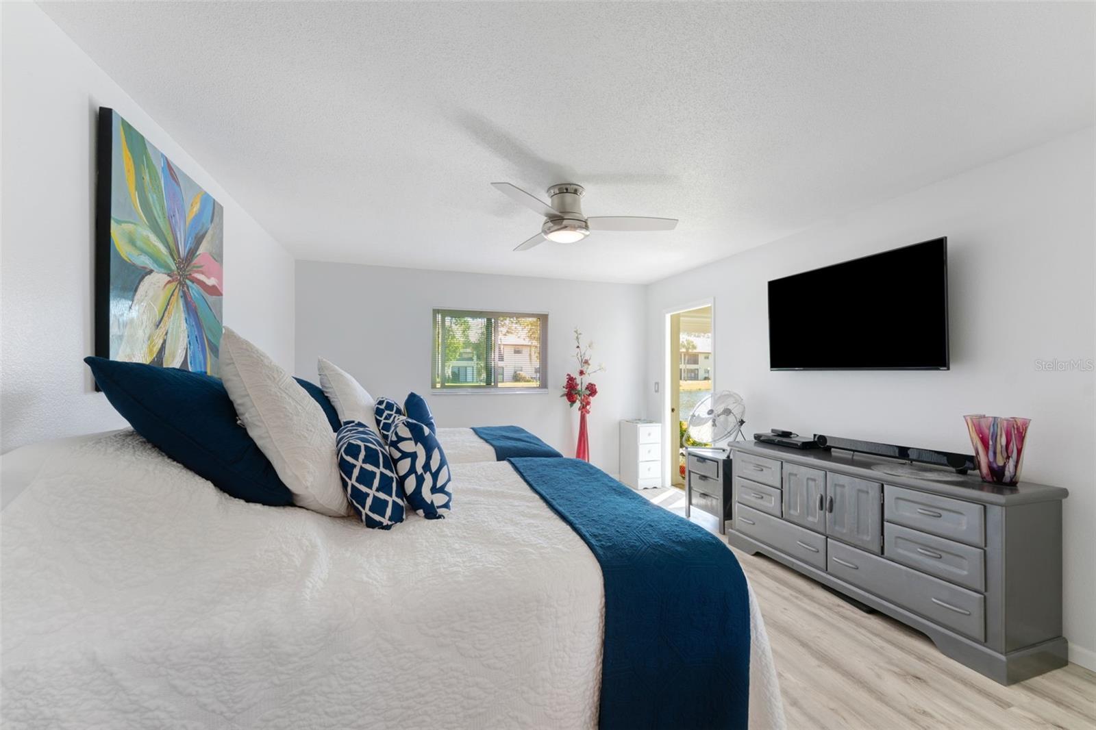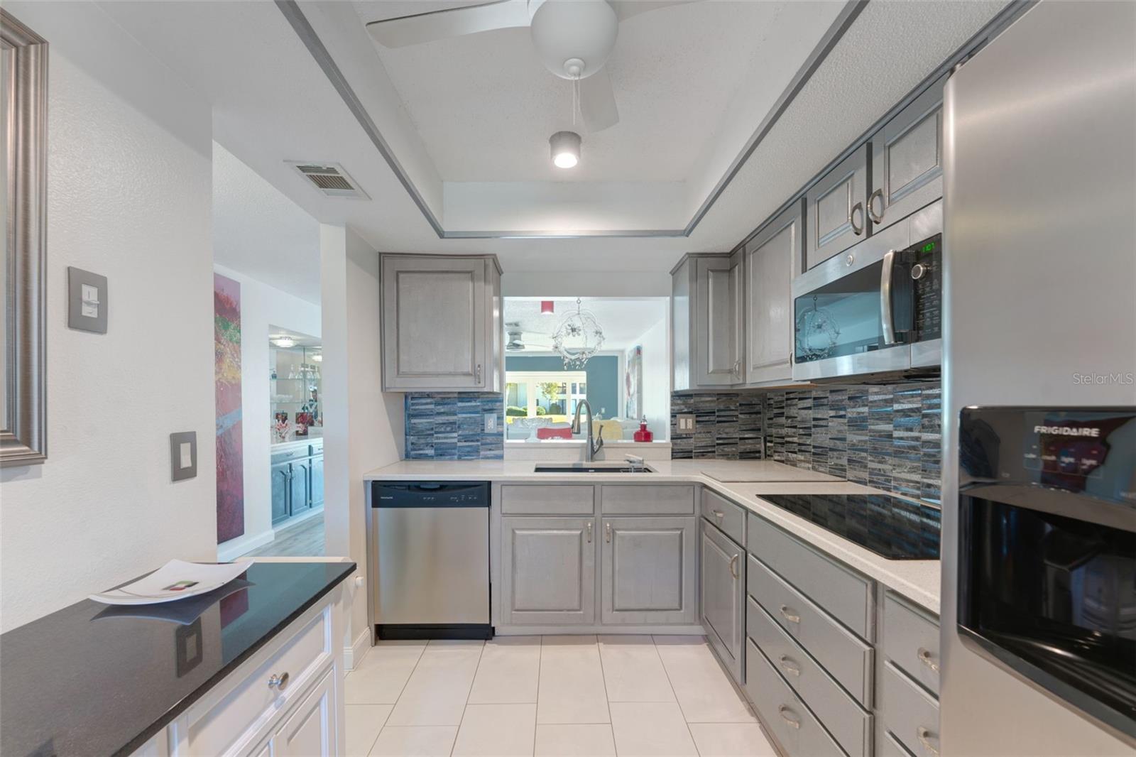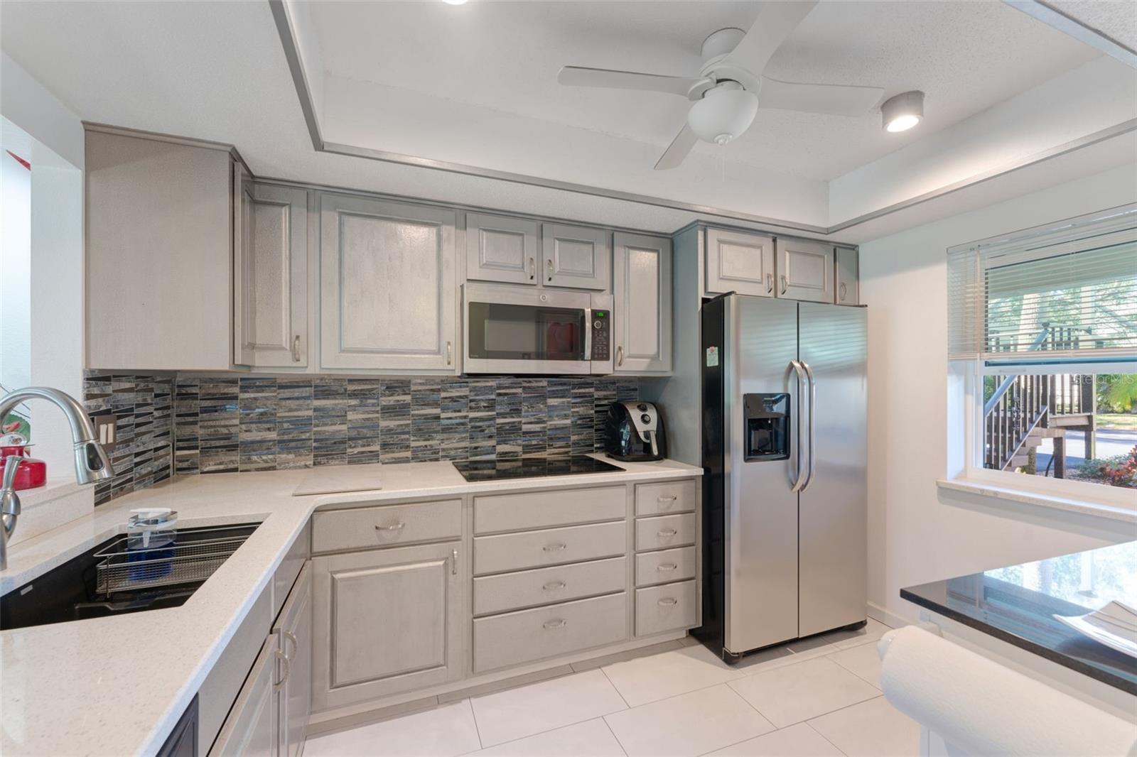 NO HURRICANE DAMAGE OR FLOODING! Welcome to the exquisite charm of Mission Lakes! Discover the allure of a beautifully renovated ground-floor unit nestled within a peaceful community. Revel in the captivating views of the serene pond and relish the convenience of three heated pools at your doorstep. Experience unparalleled peace of mind with HURRICANE-IMPACT WINDOWS and SLIDERS, fortifying your sanctuary against the elements while maintaining a tranquil atmosphere. Step into the culinary realm of the renovated kitchen, a true chef's paradise. It features custom-built cabinetry that seamlessly blends style and functionality, elegant quartz countertops, a chic backsplash, and stainless steel appliances. This includes a state-of-the-art convection microwave oven and an electric cooktop, setting the stage for culinary excellence. Embrace the harmony of new ceramic tiles in the kitchen and laminate flooring throughout, creating an aesthetic of seamless elegance. The primary bedroom is a haven of tranquility, offering direct lanai access, a capacious walk-in closet, and an en-suite bath adorned with a modern vanity and a recently updated walk-in shower. This home doesn’t just promise comfort but also practicality, featuring an in-unit washer and dryer and covered parking for 1 vehicle plus a second parking spot. Its prime location near the Island of Venice means you are just moments away from exquisite local shopping, diverse dining options, and pristine beaches. Engage with the vibrant community through local festivals and activities. The quarterly fees ensure hassle-free living, covering essentials such as cable TV, water, trash, and recycling services. This condo in Mission Lakes is more than a home; it’s a lifestyle choice, offering an impeccable blend of elegance, convenience, and community spirit.
