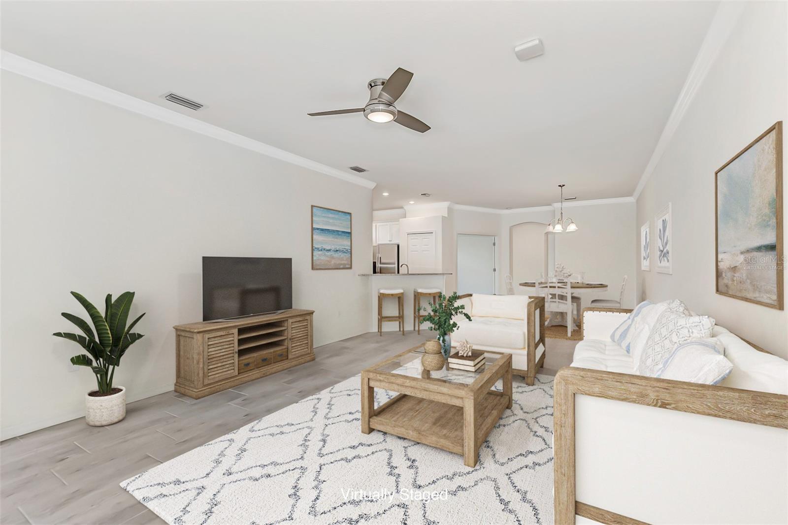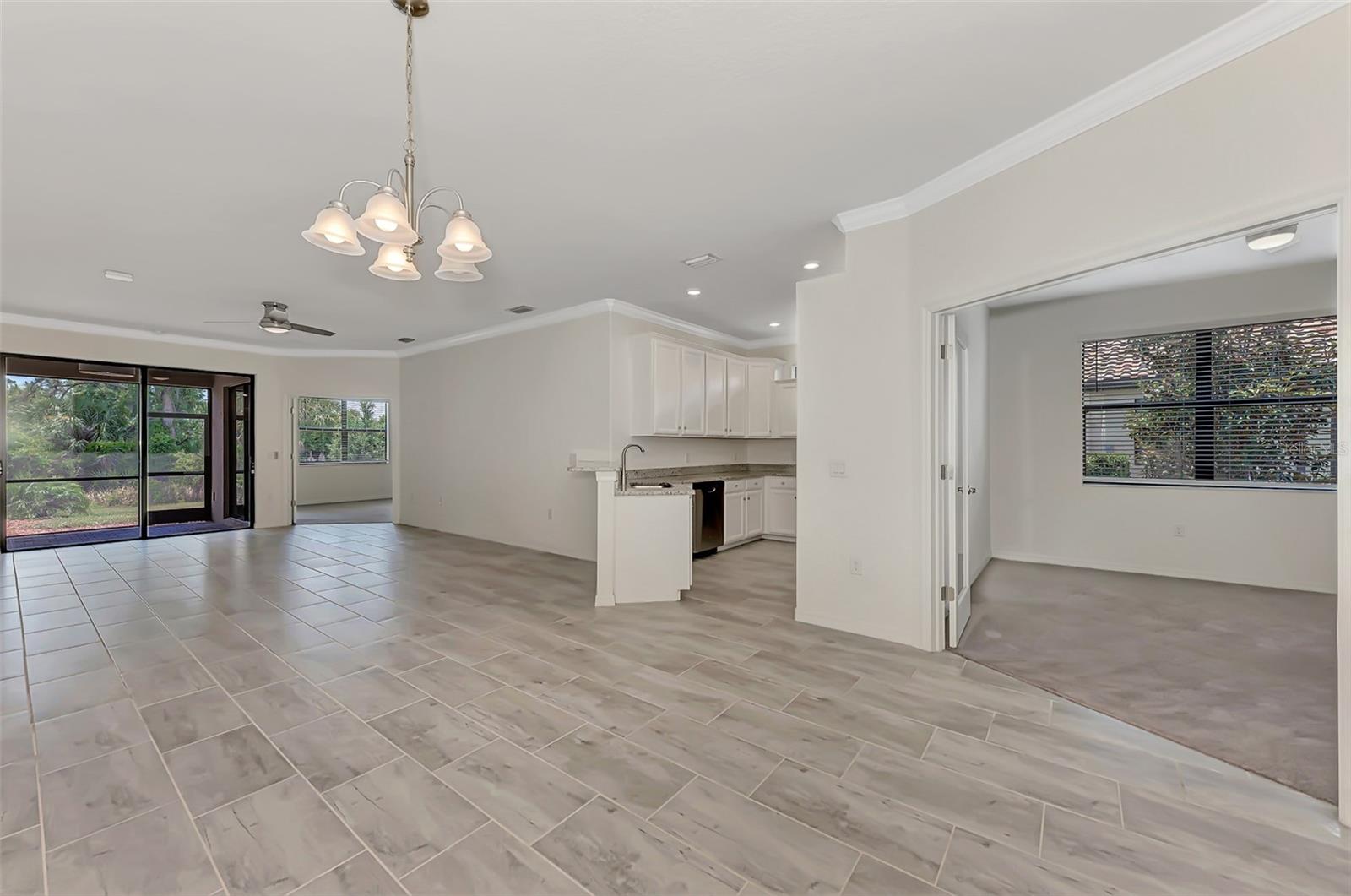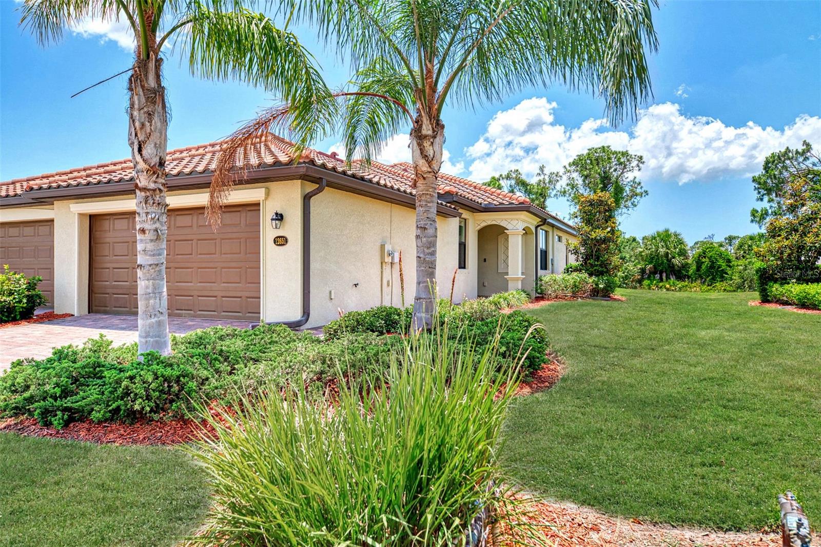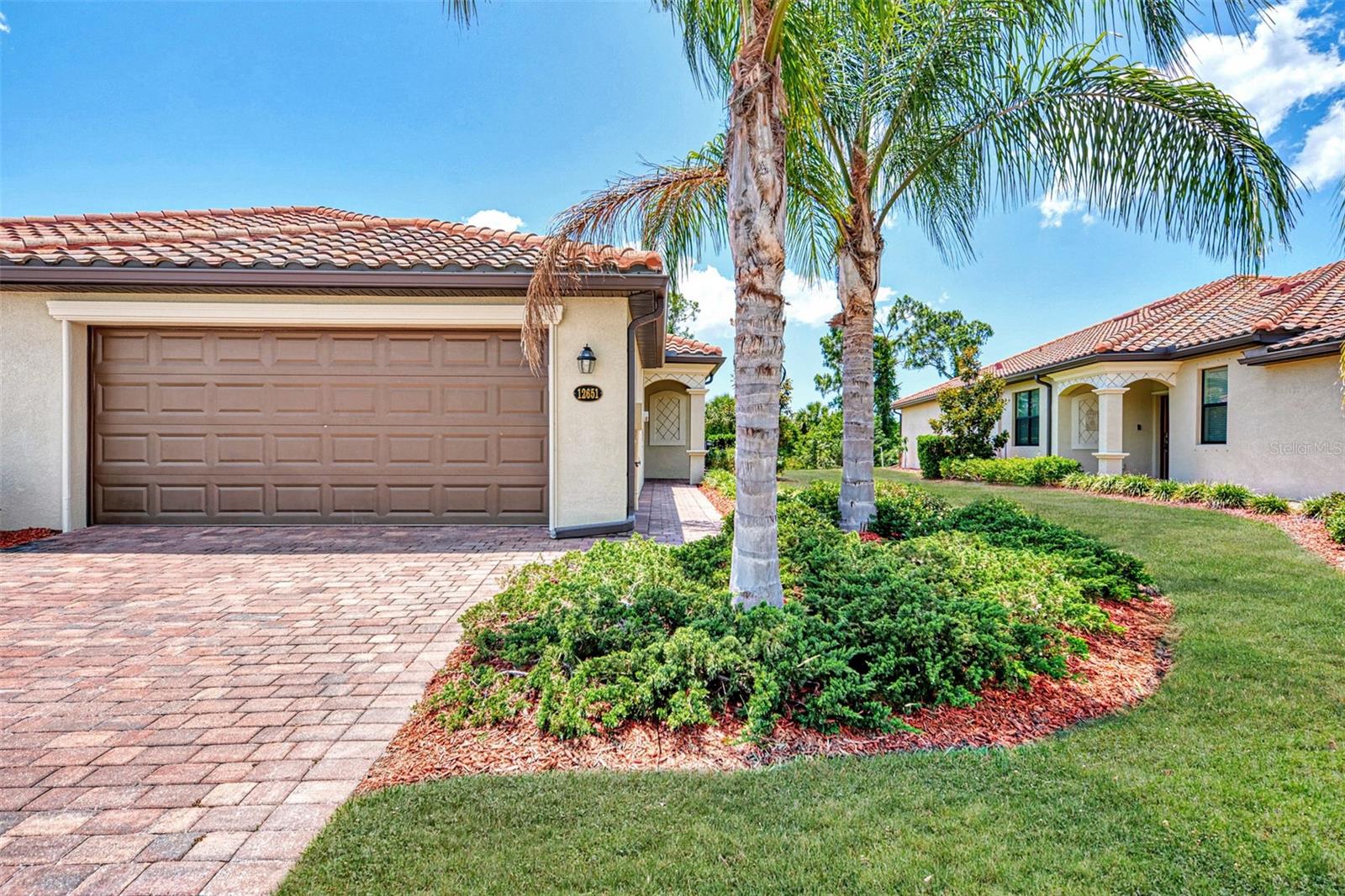 One or more photo(s) has been virtually staged. MOTIVATED SELLER! AND, it includes a golf cart! Located in the super-active Gran Paradiso neighborhood within the master-planned community of Wellen Park in area of Venice, Florida. This villa offers exceptional value, complete with a complimentary golf cart. The Orchid model is the more spacious and popular of the two available floor plans in the twin villas, boasting 1650 square feet of living space. This layout features two bedrooms and a den, with the guest bedroom ideally positioned for privacy on the opposite side of the foyer, adjacent to the hall bath. This arrangement allows guests to enjoy early morning strolls on the beach or through the neighborhood without disturbing anyone. French doors connect the master bedroom to the main living area, enhancing the open and inviting feel of the home. The villa's interior is designed with modern aesthetics in mind, featuring white cabinetry, grey plank tile flooring, stainless steel appliances, and elegant crown molding, making it a ready-to-move-in gem. The west and northwest facing orientation of the villa invites natural light, maintaining a bright and airy atmosphere throughout the day, while the rear of the property offers serene views of a private wooded area...there's even room for a pool! Situated conveniently close to downtown Wellen Park, Gulf beaches, and the new Costco, the villa is only 1.5 miles from the iconic Gran Paradiso clubhouse, accessible by a short ride in the included golf cart. Enjoy nearby attractions such as Braves Spring training games or evening concerts and events in Downtown Wellen. This villa not only provides a perfect modern canvas for your new home but also promises a lifestyle of convenience and luxury.