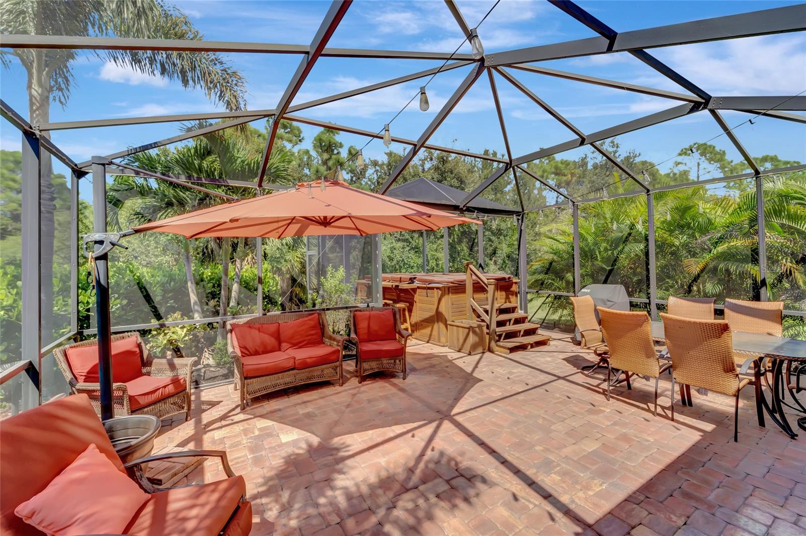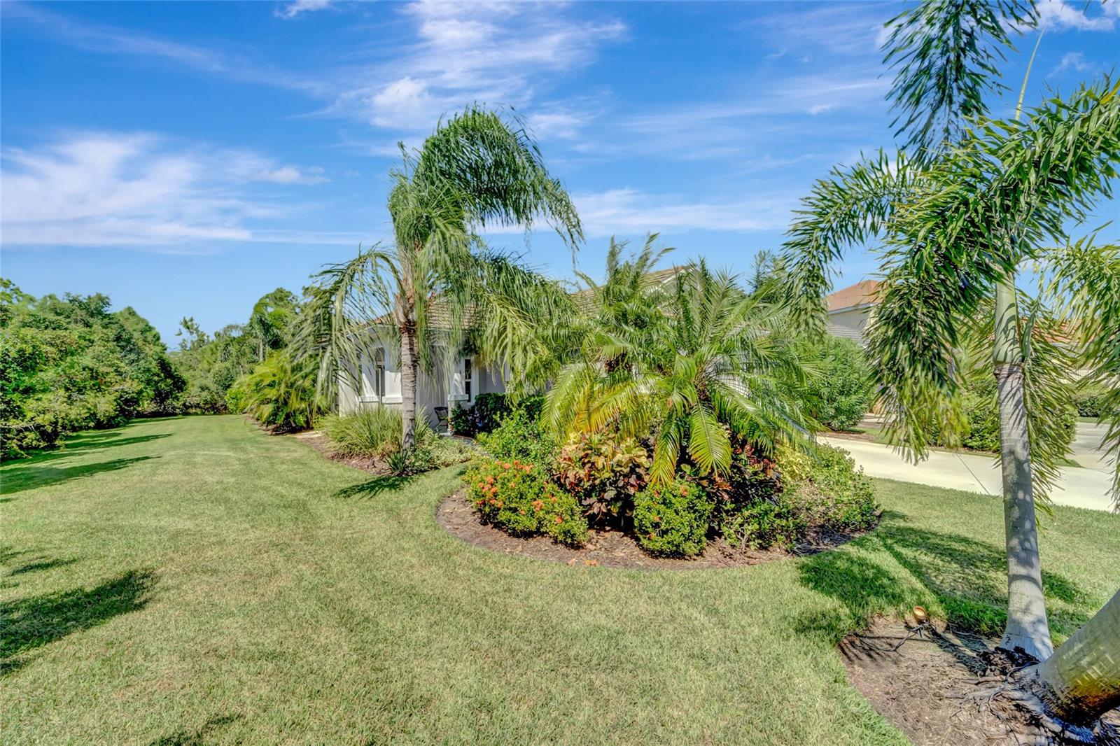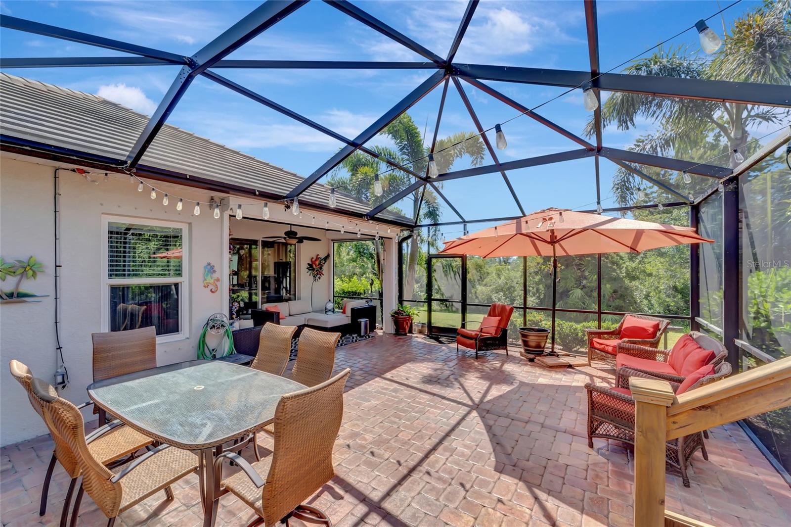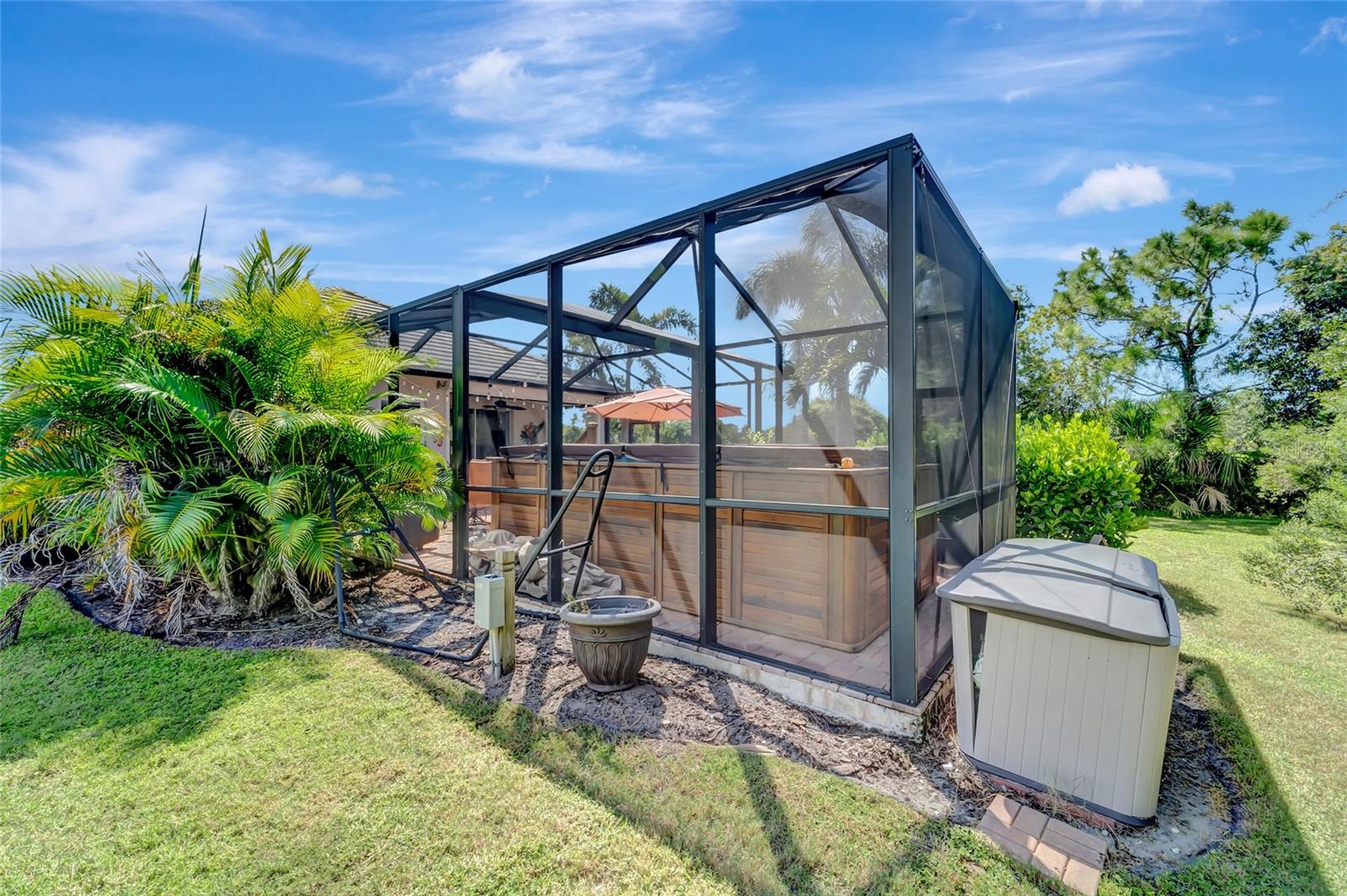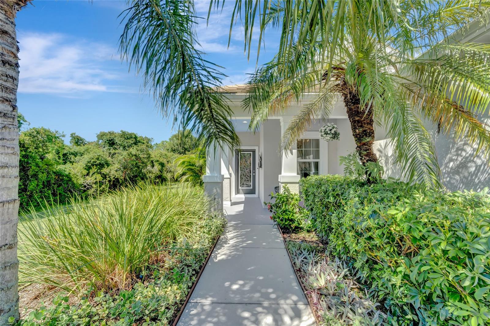Best buy in Wellen Park! Escape to your private sanctuary in this charming 3-bedroom, 2-bath cottage-style home, ideally situated at the end of a peaceful cul-de-sac. Enjoy ultimate privacy with lush greenery and no neighbors beside or behind the home. Inside, you'll find thoughtful upgrades throughout, including a stunning leaded glass front door, sleek laminate flooring, and hurricane-resistant windows in most areas. The dining room exudes elegance with its decorative wainscoting, while the living room showcases a recessed ceiling with crown molding for added charm. The kitchen is perfect for Florida low-maintenance living with quick access to your outdoor living space, featuring cottage-style cabinets, Corian countertops, a granite composite sink, wainscoting on the ceiling, a gas stove, and a beautifully updated backsplash. The spacious two-car garage, once an art studio, now includes its own air conditioning while maintaining its functionality. The crowning jewel of this property is the expansive screened-in backyard oasis, perfect for relaxing or entertaining. Enjoy the large heated swim spa, surrounded by ample space for guests and pets to unwind. Don’t miss out on this unique opportunity—schedule your showing today! Located in the exceptional Grand Palm community in Venice, Florida, residents enjoy resort-style living with countless amenities. Just 20 minutes from downtown Venice and the beaches, Grand Palm features a state-of-the-art fitness center, a resort-style pool with a water slide, and fitness pools for laps or water aerobics. Outdoor enthusiasts will love the miles of walking and biking trails, Lookout Point Island, and dedicated dog parks. Sports lovers can take advantage of basketball, tennis, bocce ball, pickleball, volleyball, and more. Live your dream lifestyle at Grand Palm! (*Note: The crystal chandelier in the dining room is not included with the house.)