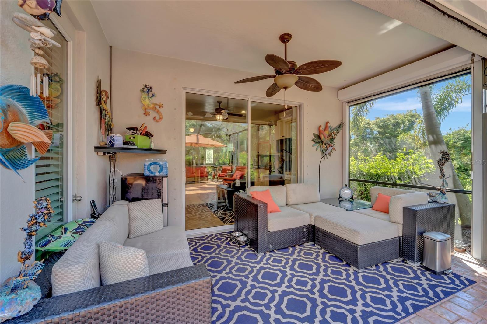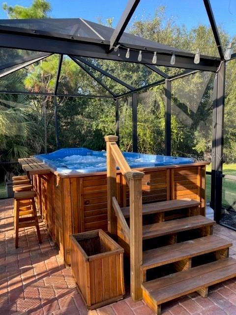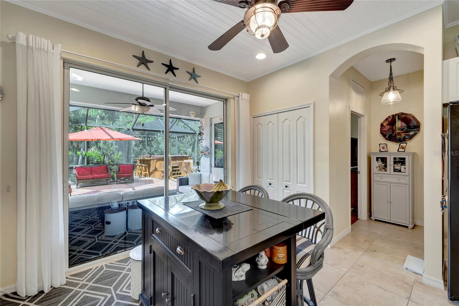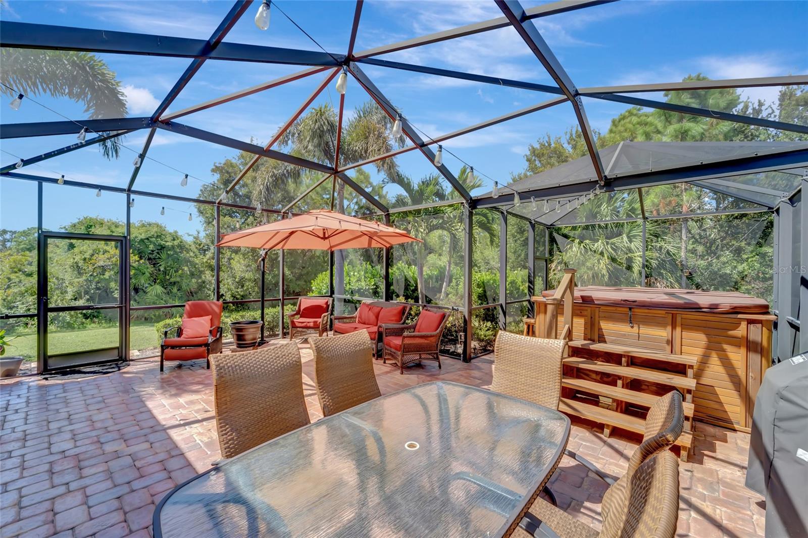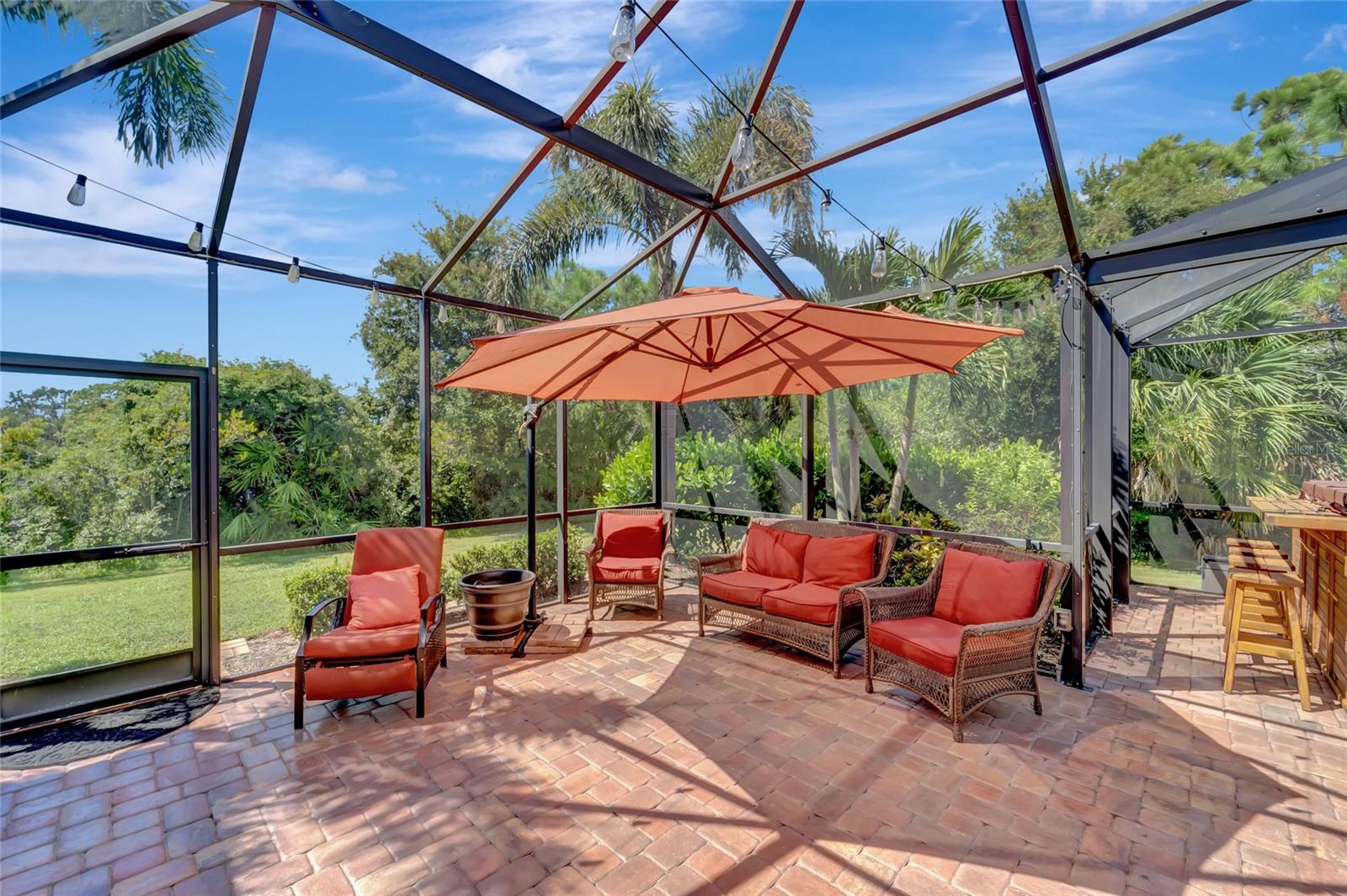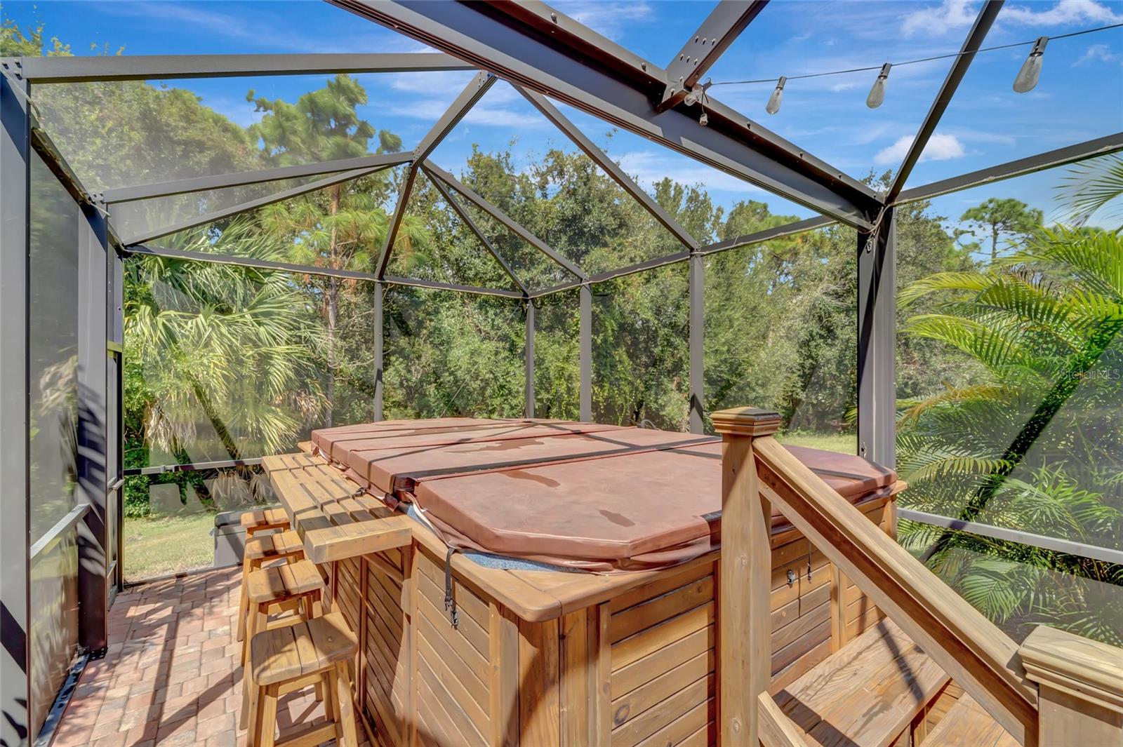 Best buy in Wellen Park! Escape to your private sanctuary in this charming 3-bedroom, 2-bath cottage-style home, ideally situated at the end of a peaceful cul-de-sac. Enjoy ultimate privacy with lush greenery and no neighbors beside or behind the home. Inside, you'll find thoughtful upgrades throughout, including a stunning leaded glass front door, sleek laminate flooring, and hurricane-resistant windows in most areas. The dining room exudes elegance with its decorative wainscoting, while the living room showcases a recessed ceiling with crown molding for added charm. The kitchen is perfect for Florida low-maintenance living with quick access to your outdoor living space, featuring cottage-style cabinets, Corian countertops, a granite composite sink, wainscoting on the ceiling, a gas stove, and a beautifully updated backsplash. The spacious two-car garage, once an art studio, now includes its own air conditioning while maintaining its functionality. The crowning jewel of this property is the expansive screened-in backyard oasis, perfect for relaxing or entertaining. Enjoy the large heated swim spa, surrounded by ample space for guests and pets to unwind. Don’t miss out on this unique opportunity—schedule your showing today! Located in the exceptional Grand Palm community in Venice, Florida, residents enjoy resort-style living with countless amenities. Just 20 minutes from downtown Venice and the beaches, Grand Palm features a state-of-the-art fitness center, a resort-style pool with a water slide, and fitness pools for laps or water aerobics. Outdoor enthusiasts will love the miles of walking and biking trails, Lookout Point Island, and dedicated dog parks. Sports lovers can take advantage of basketball, tennis, bocce ball, pickleball, volleyball, and more. Live your dream lifestyle at Grand Palm! (*Note: The crystal chandelier in the dining room is not included with the house.)