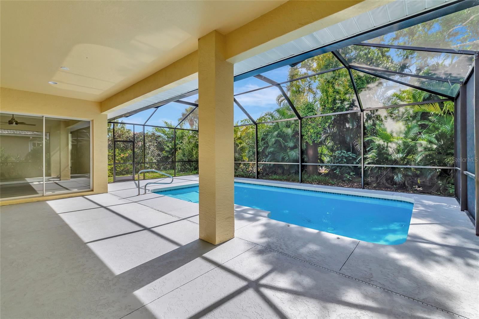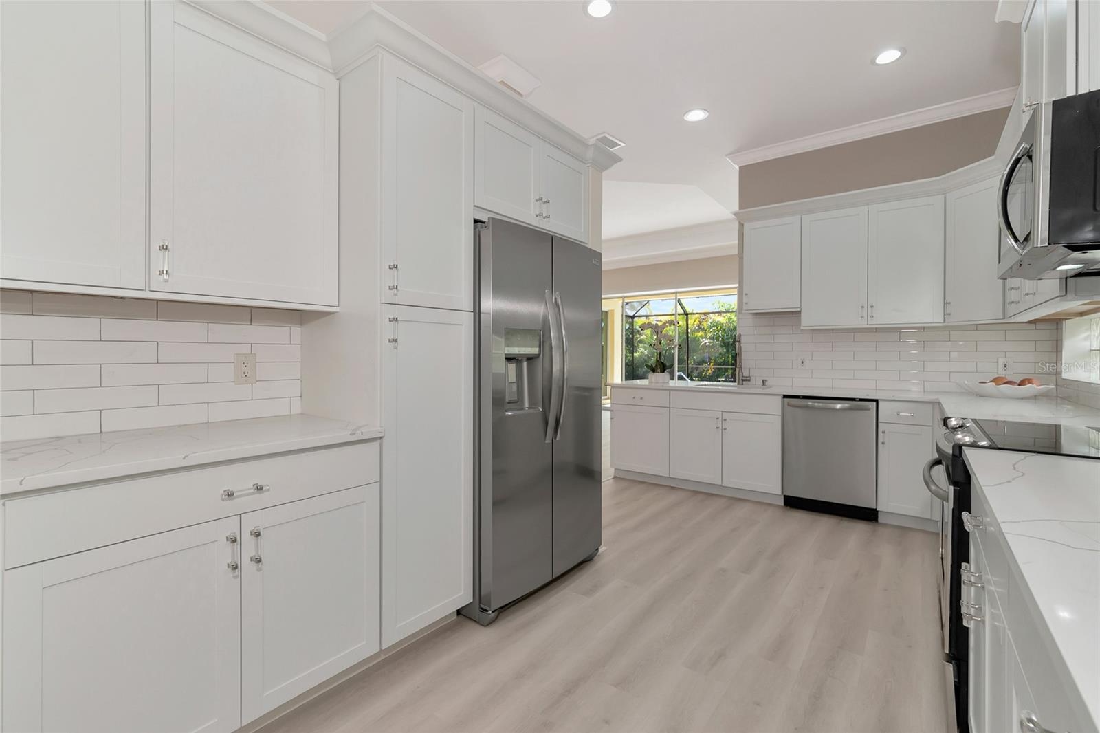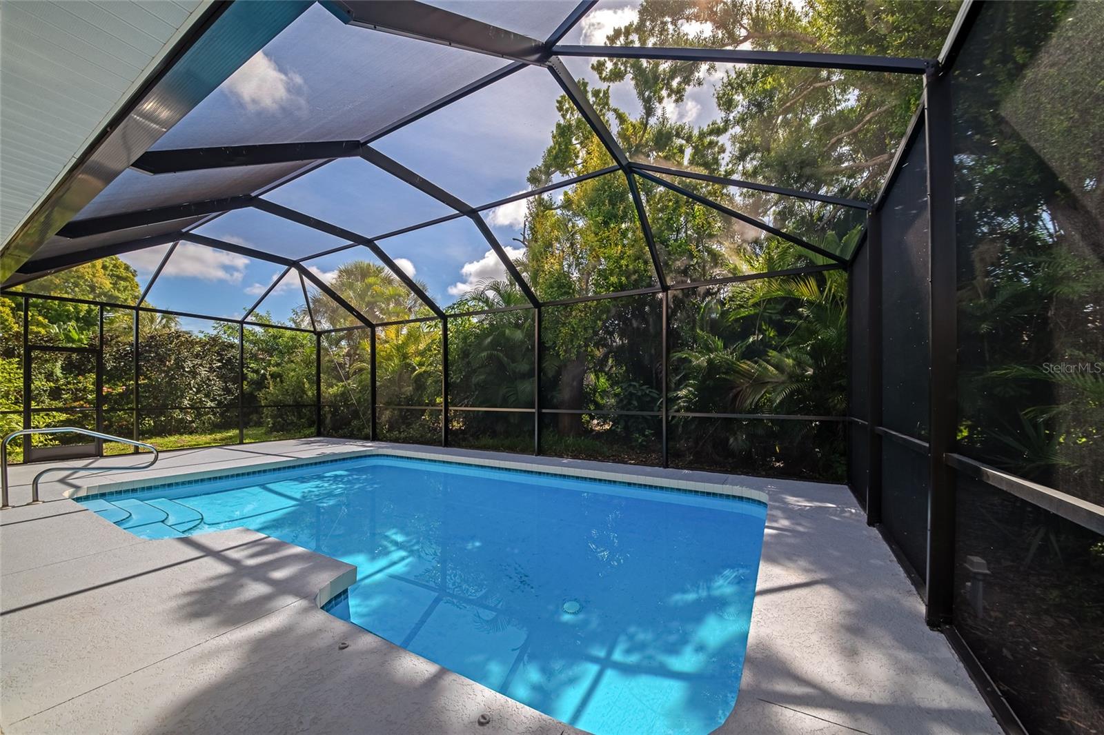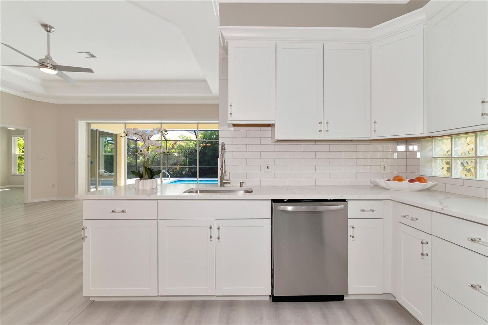 One or more photo(s) has been virtually staged. Welcome to this beautifully renovated 3-bedroom 2-bathroom POOL HOME located in the sought-after community of Lake of the Woods of Jacaranda in Venice, FL All the work has been done for new owners. This community is conveniently located near Venice's beautiful Gulf beaches and charming downtown shops, theater and performing arts center. You will easily make new friends at the community center playing tennis or pickleball or just enjoying a swim in a large pool. Very low HOA. This home welcomes you with large open living room/ dining room space that can be arrange to your taste and needs, high tray ceilings and 4 sets of sliding glass pocket doors that opens out to the BRAND-NEW pool cage with newly painted HEATED pool and large covered patio, where you can relax and unwind. The Lanai is surrounded by lush greenery that gives total privacy, the pool deck offers plenty of space for lounging and entertaining, making it the perfect place to host friends and family. There is a bonus room on the lanai, perfect for storing your outdoor furniture and pool toys. The split plan features two private oversize bedrooms with dedicated bath. The master bedroom overlooks the pool and has an attached master bath complete with tub, walk-in shower, double vanities, plus large walk-in closet. Eat in kitchen was just equipped with lots of Shaker style cabinets and beautiful Quartz countertops. The home has been re-piped for your piece of mind and has a new electric panel. The Lakes of Jacaranda boasts of a community pool, clubhouse, pickleball and tennis courts. There are numerous lakes, walking and biking paths for your outdoor enjoyment. Come experience and enjoy the total lifestyle that this wonderful home and premier community offers. No CDD, NOT in a FLOOD ZONE Roof in great condition.