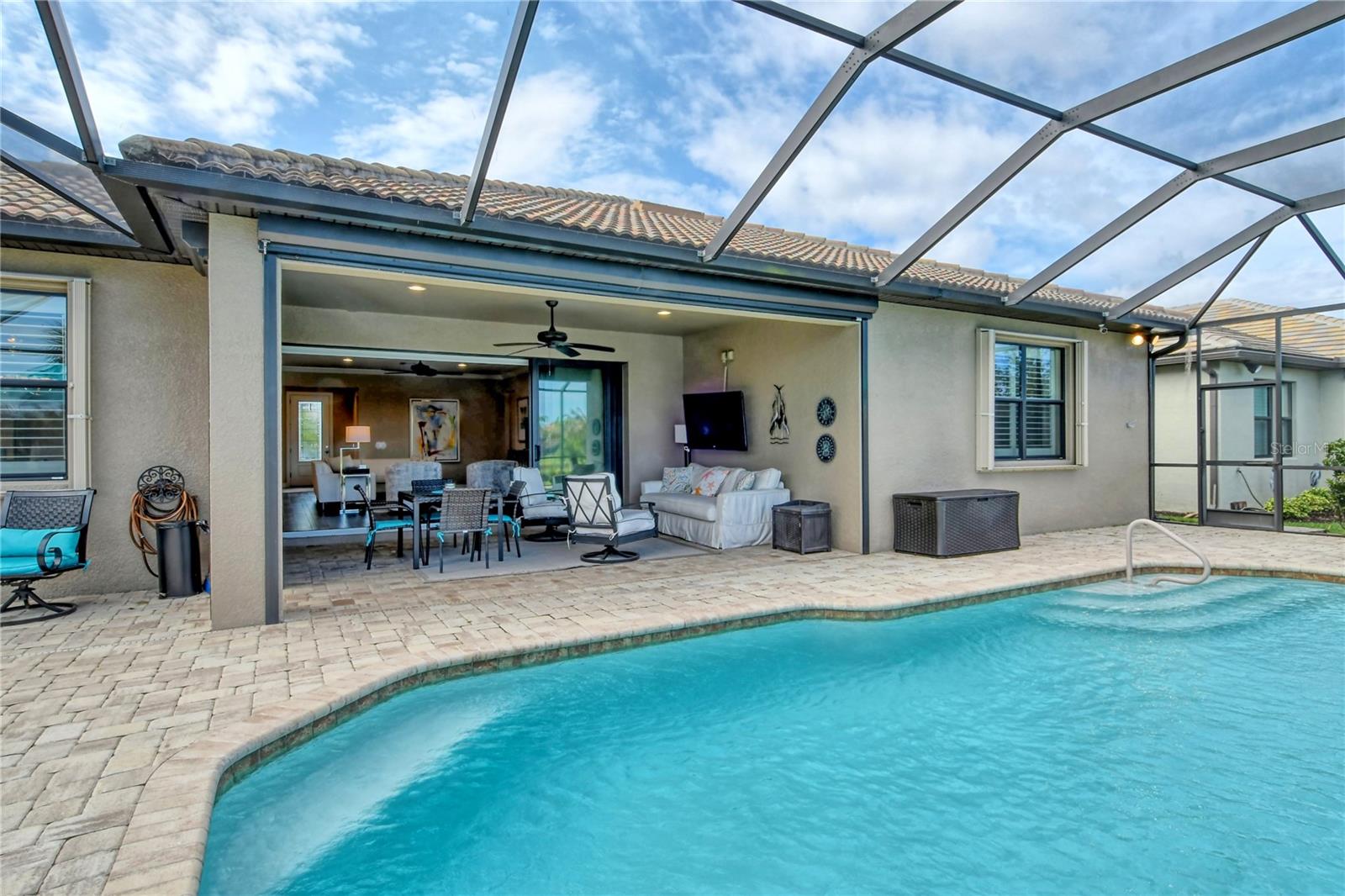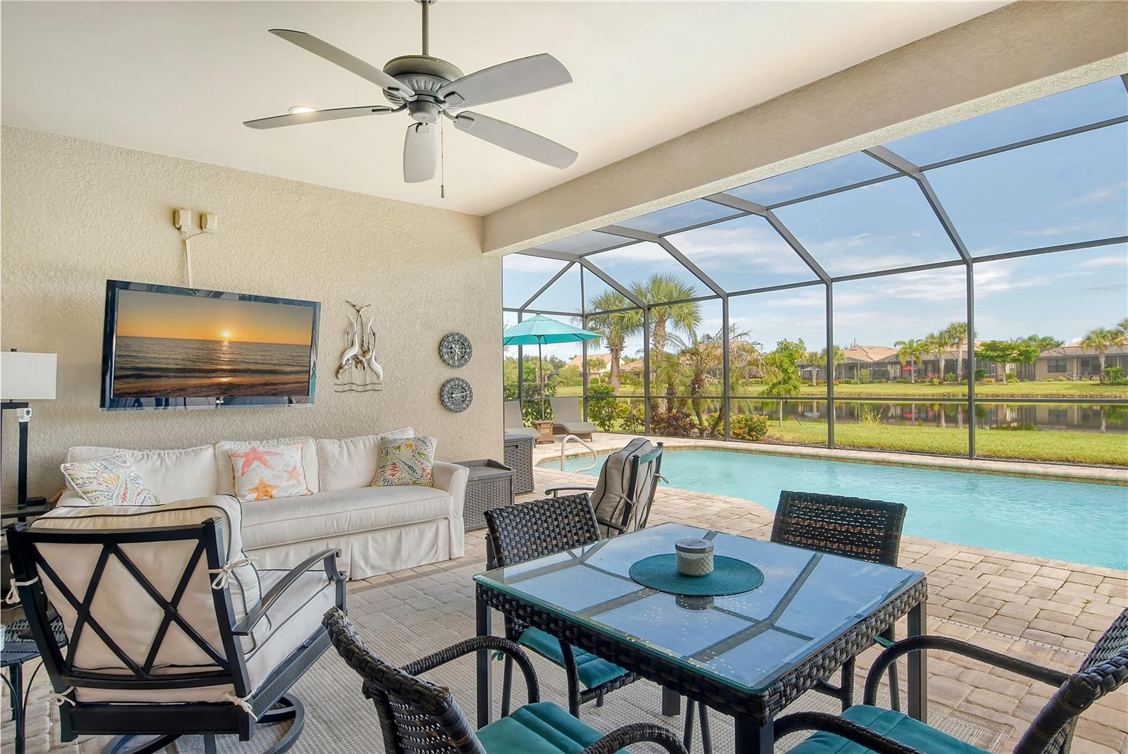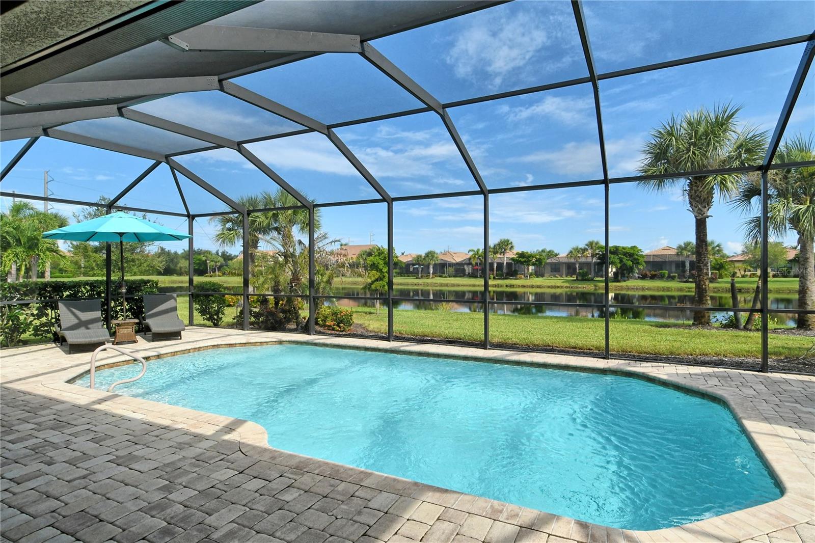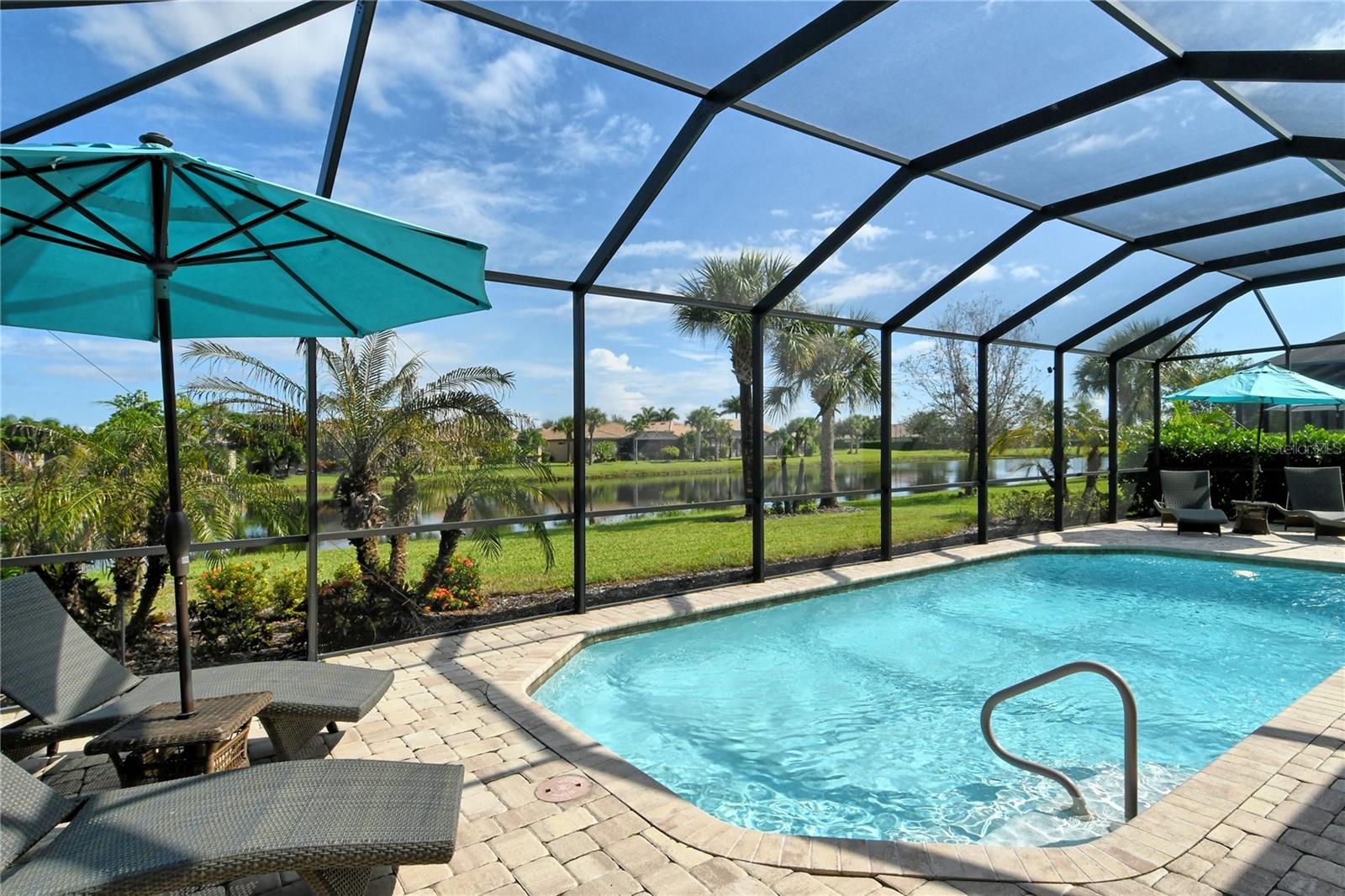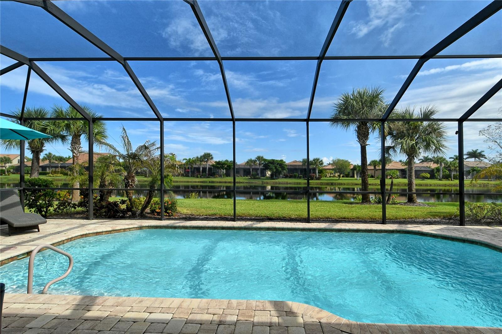Nestled in the heart of Venice, Florida, this exquisite residence beckons those with a penchant for refined living. A harmonious blend of sophistication and comfort awaits within this three-bedroom, three-bathroom haven, where every detail has been meticulously crafted to elevate your lifestyle. Step into a world of open elegance, where the floor plan flows seamlessly, inviting both intimate gatherings and grand soirées. The kitchen is a culinary artist's dream with lustrous quartz countertops, upgraded cabinetry, and Stainless-steel appliances. The subway tile backsplash adds a touch of timeless charm. Pendant lights cast a warm glow, complemented by strategically placed illumination throughout, ensuring your culinary masterpieces are always in the spotlight. Additional bonuses include a whole-home water filtration system, complete with reverse osmosis, providing crystal-clear refreshment at every tap. Hardwood floors grace the living areas and bedrooms with rich tones a testament to quality underfoot. The pièce de résistance? A zero-corner pocket door that slides away, blurring the lines between indoor refinement and outdoor splendor. The primary bedroom suite is a sanctuary unto itself, with beautiful water views featuring a generous sized bathroom with dual sinks, granite counters, and a walk-in shower adorned with listello accents and a sitting bench - perfect for post-soak contemplation. Two additional bedrooms, each with private bath access, offer similar high-end finishes, strategically positioned for optimal privacy. Outside, a private, heated saltwater pool beckons, its shimmering surface reflecting the beauty of the water views beyond. Mature tropical landscaping creates a lush oasis, while hurricane shutters stand guard, ready to protect your paradise. The lanai is spacious and protected with a motorized retractable screen rated for the most tropical winds. With a three-car garage and pavered driveway, this residence isn't just a home; it's a statement of discerning taste and uncompromising quality.