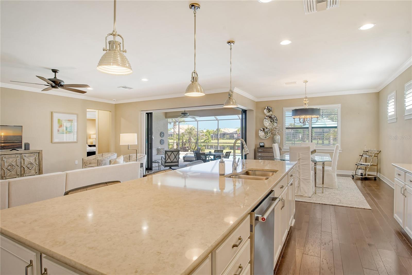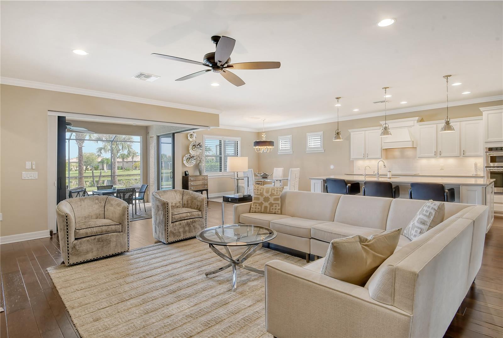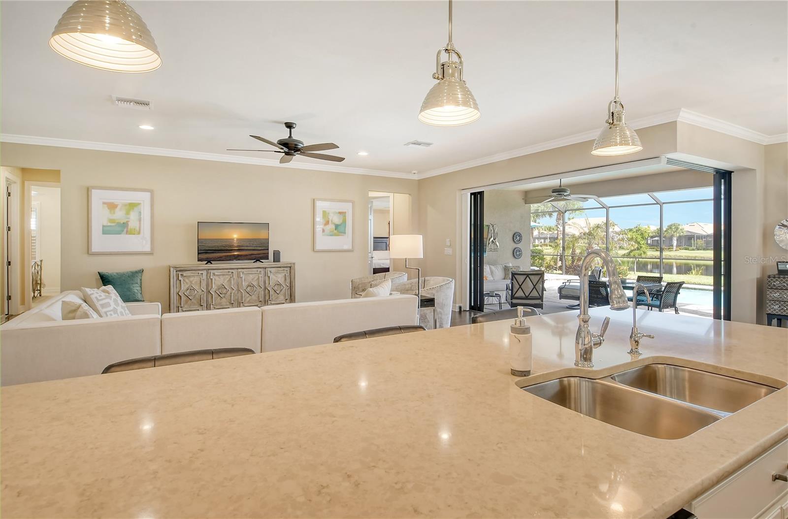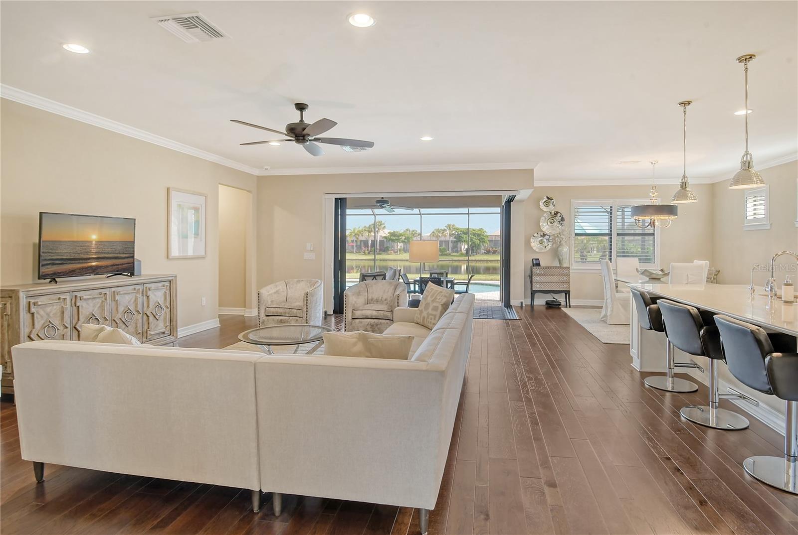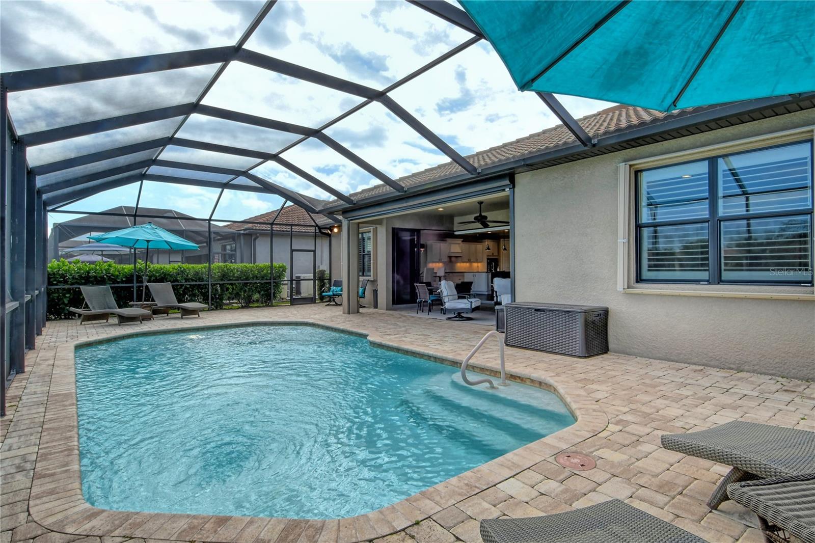 Nestled in the heart of Venice, Florida, this exquisite residence beckons those with a penchant for refined living. A harmonious blend of sophistication and comfort awaits within this three-bedroom, three-bathroom haven, where every detail has been meticulously crafted to elevate your lifestyle. Step into a world of open elegance, where the floor plan flows seamlessly, inviting both intimate gatherings and grand soirées. The kitchen is a culinary artist's dream with lustrous quartz countertops, upgraded cabinetry, and Stainless-steel appliances. The subway tile backsplash adds a touch of timeless charm. Pendant lights cast a warm glow, complemented by strategically placed illumination throughout, ensuring your culinary masterpieces are always in the spotlight. Additional bonuses include a whole-home water filtration system, complete with reverse osmosis, providing crystal-clear refreshment at every tap. Hardwood floors grace the living areas and bedrooms with rich tones a testament to quality underfoot. The pièce de résistance? A zero-corner pocket door that slides away, blurring the lines between indoor refinement and outdoor splendor. The primary bedroom suite is a sanctuary unto itself, with beautiful water views featuring a generous sized bathroom with dual sinks, granite counters, and a walk-in shower adorned with listello accents and a sitting bench - perfect for post-soak contemplation. Two additional bedrooms, each with private bath access, offer similar high-end finishes, strategically positioned for optimal privacy. Outside, a private, heated saltwater pool beckons, its shimmering surface reflecting the beauty of the water views beyond. Mature tropical landscaping creates a lush oasis, while hurricane shutters stand guard, ready to protect your paradise. The lanai is spacious and protected with a motorized retractable screen rated for the most tropical winds. With a three-car garage and pavered driveway, this residence isn't just a home; it's a statement of discerning taste and uncompromising quality.
