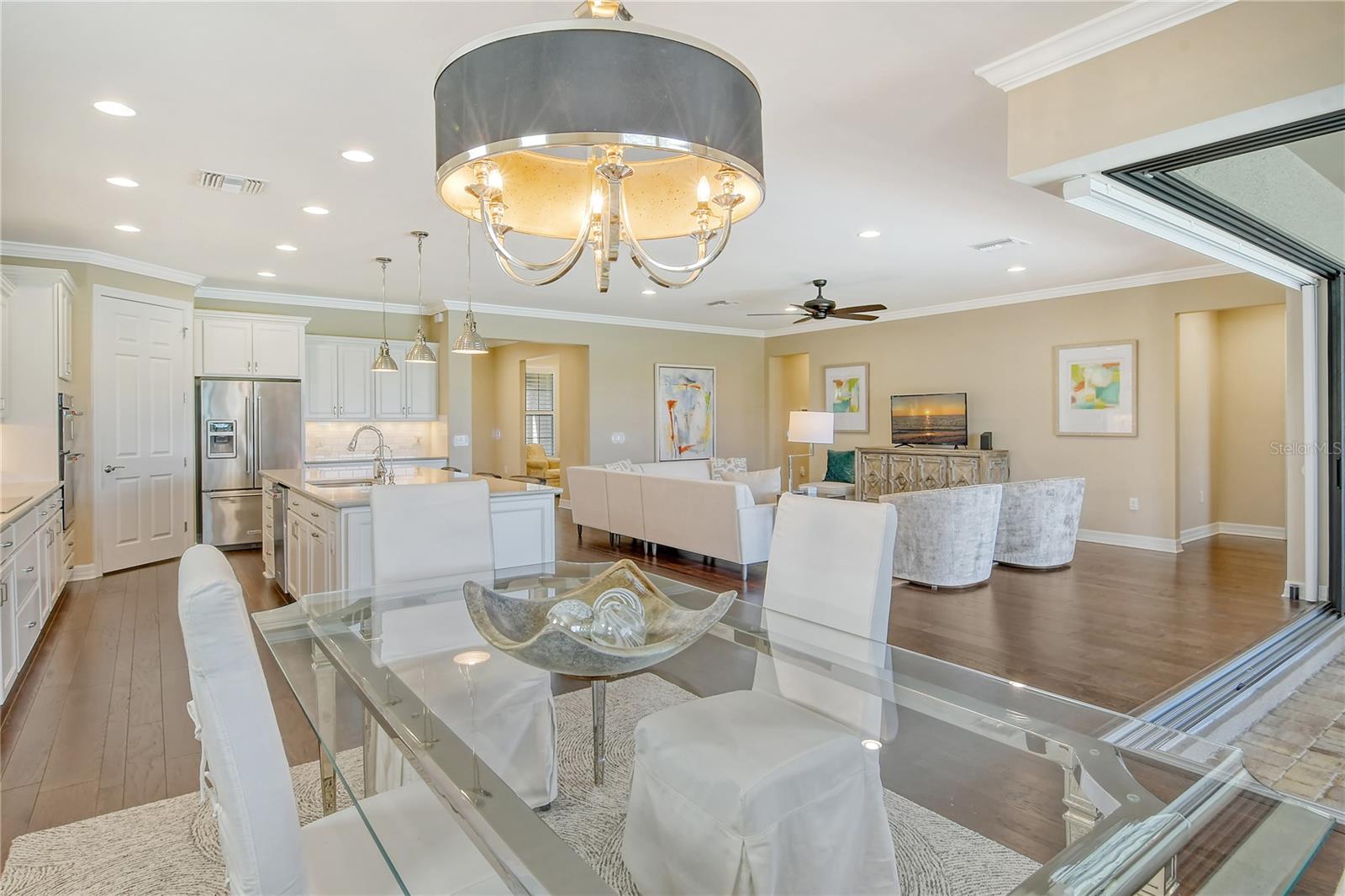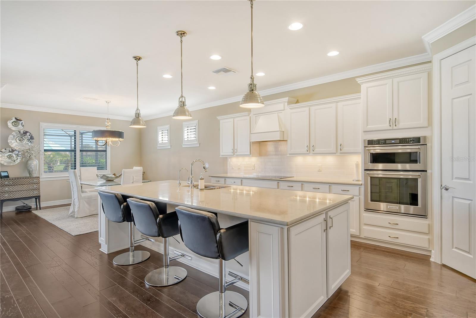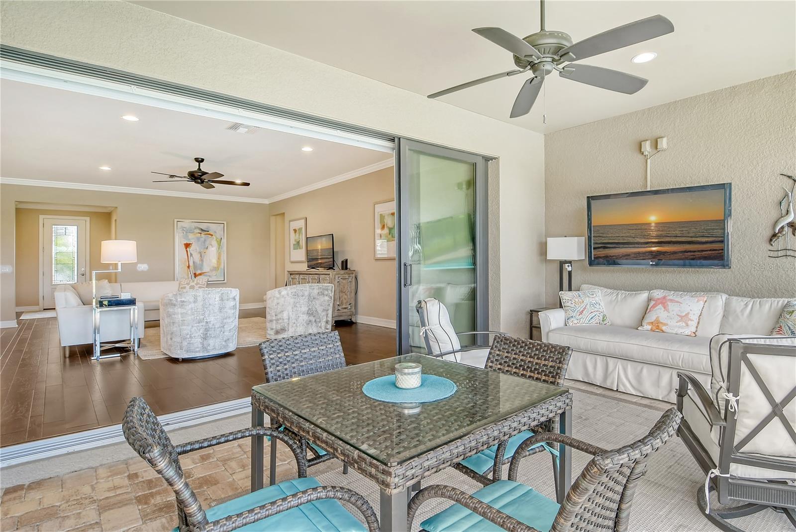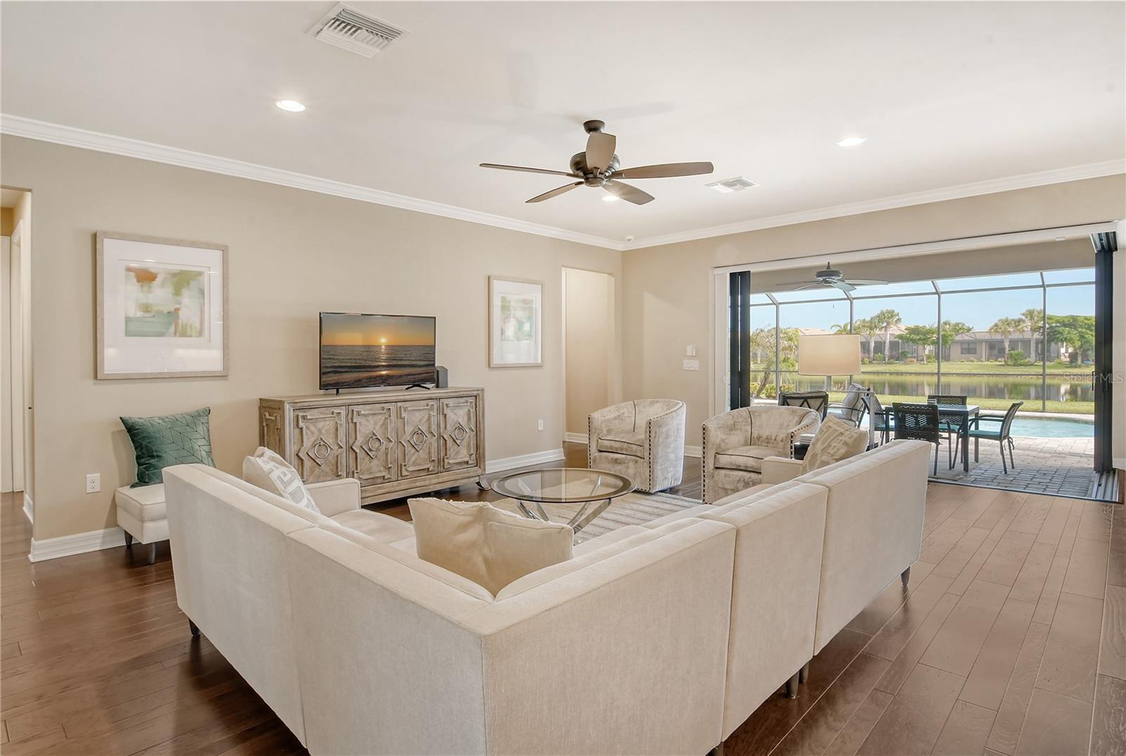 Nestled in the heart of Venice, Florida, this exquisite residence beckons those with a penchant for refined living. A harmonious blend of sophistication and comfort awaits within this three-bedroom, three-bathroom haven, where every detail has been meticulously crafted to elevate your lifestyle. Step into a world of open elegance, where the floor plan flows seamlessly, inviting both intimate gatherings and grand soirées. The kitchen is a culinary artist's dream with lustrous quartz countertops, upgraded cabinetry, and Stainless-steel appliances. The subway tile backsplash adds a touch of timeless charm. Pendant lights cast a warm glow, complemented by strategically placed illumination throughout, ensuring your culinary masterpieces are always in the spotlight. Additional bonuses include a whole-home water filtration system, complete with reverse osmosis, providing crystal-clear refreshment at every tap. Hardwood floors grace the living areas and bedrooms with rich tones a testament to quality underfoot. The pièce de résistance? A zero-corner pocket door that slides away, blurring the lines between indoor refinement and outdoor splendor. The primary bedroom suite is a sanctuary unto itself, with beautiful water views featuring a generous sized bathroom with dual sinks, granite counters, and a walk-in shower adorned with listello accents and a sitting bench - perfect for post-soak contemplation. Two additional bedrooms, each with private bath access, offer similar high-end finishes, strategically positioned for optimal privacy. Outside, a private, heated saltwater pool beckons, its shimmering surface reflecting the beauty of the water views beyond. Mature tropical landscaping creates a lush oasis, while hurricane shutters stand guard, ready to protect your paradise. The lanai is spacious and protected with a motorized retractable screen rated for the most tropical winds. With a three-car garage and pavered driveway, this residence isn't just a home; it's a statement of discerning taste and uncompromising quality.